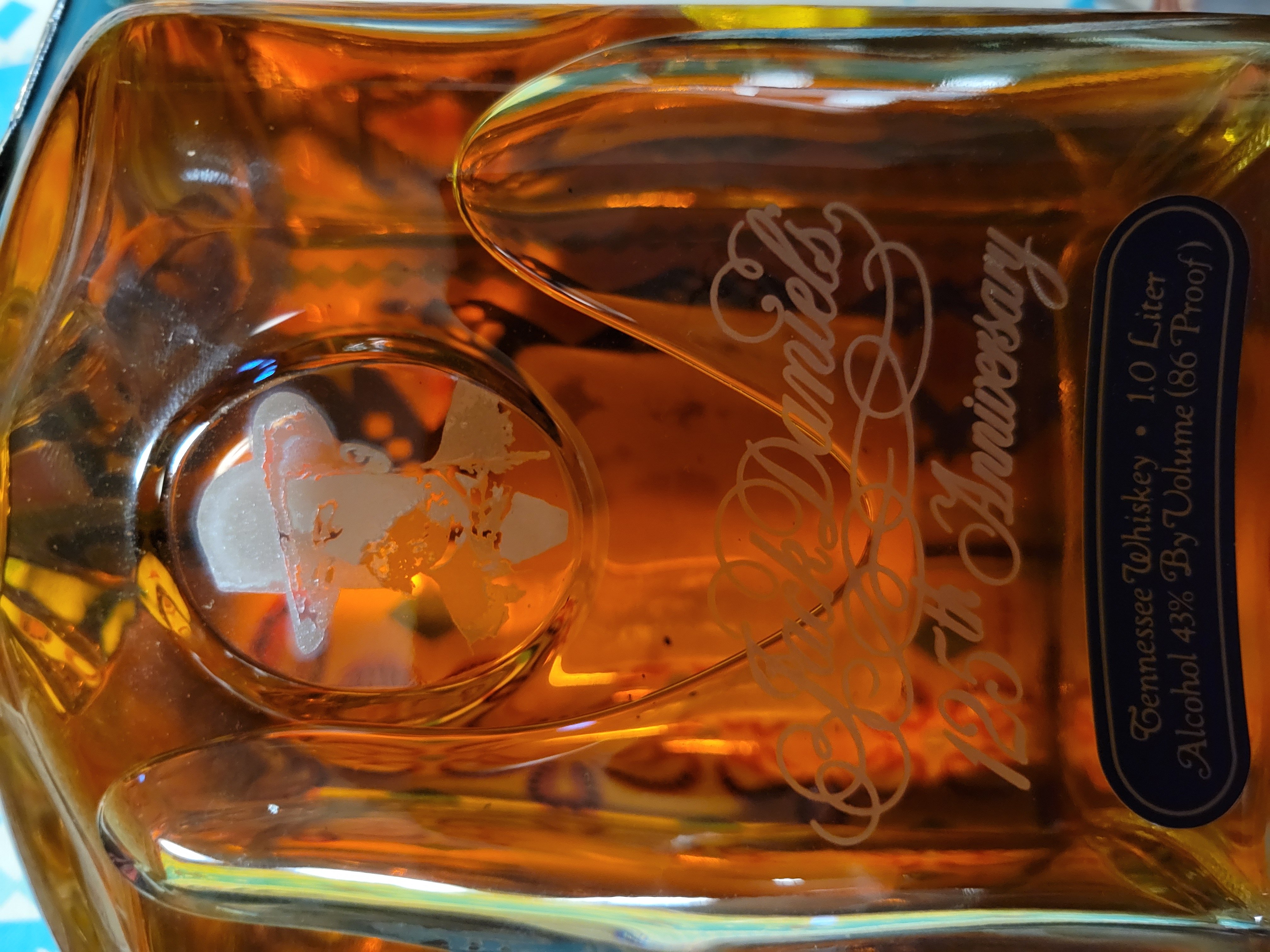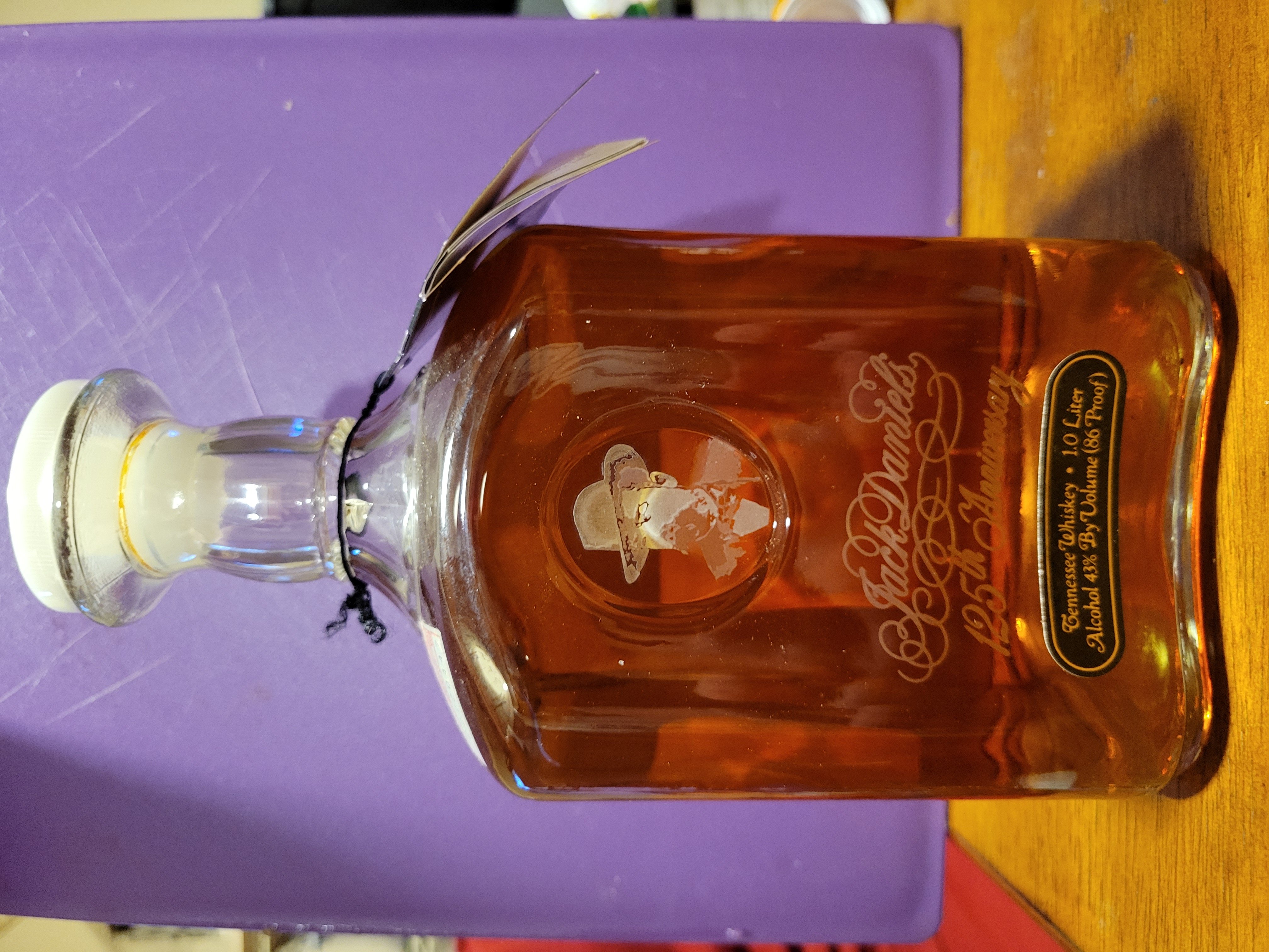 - Jack Daniel's 125th anniversary Label in good condition around the neck 1 liter White cap