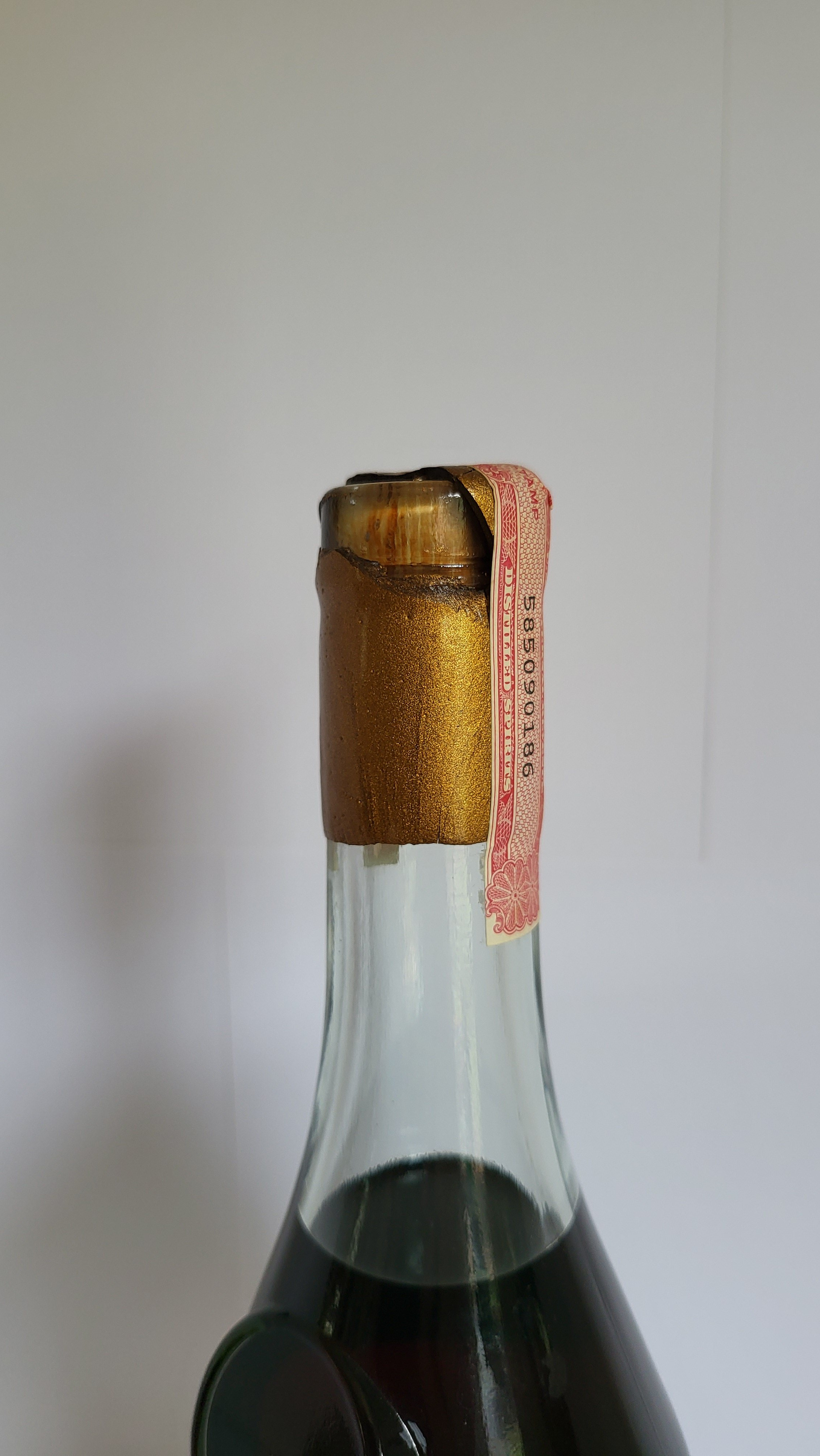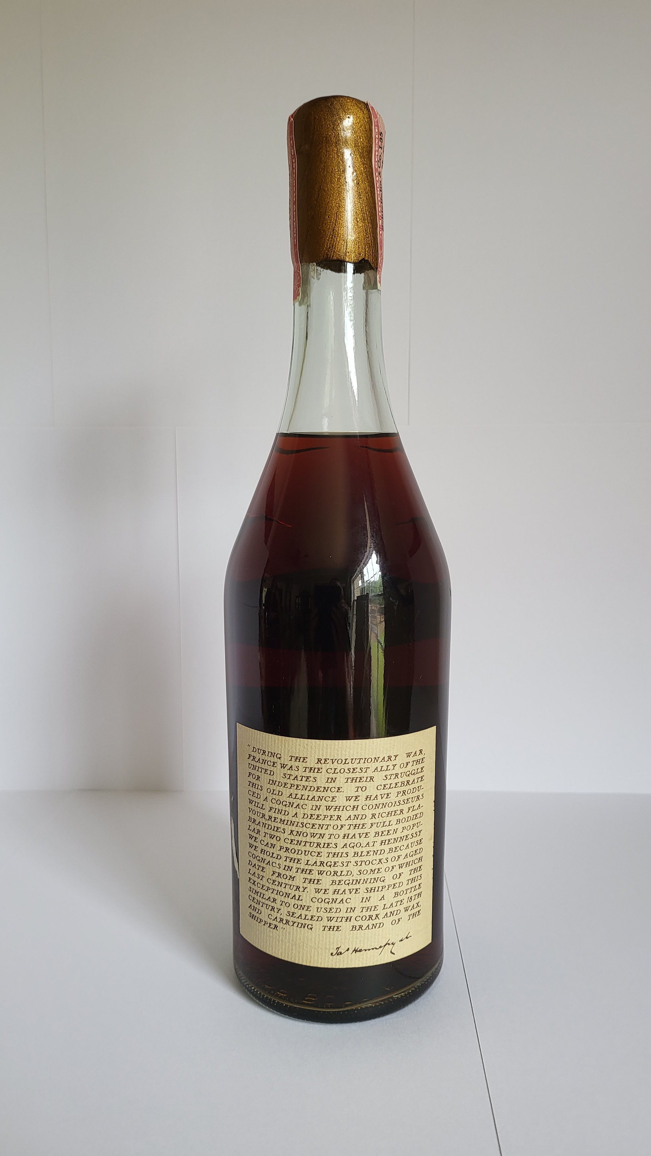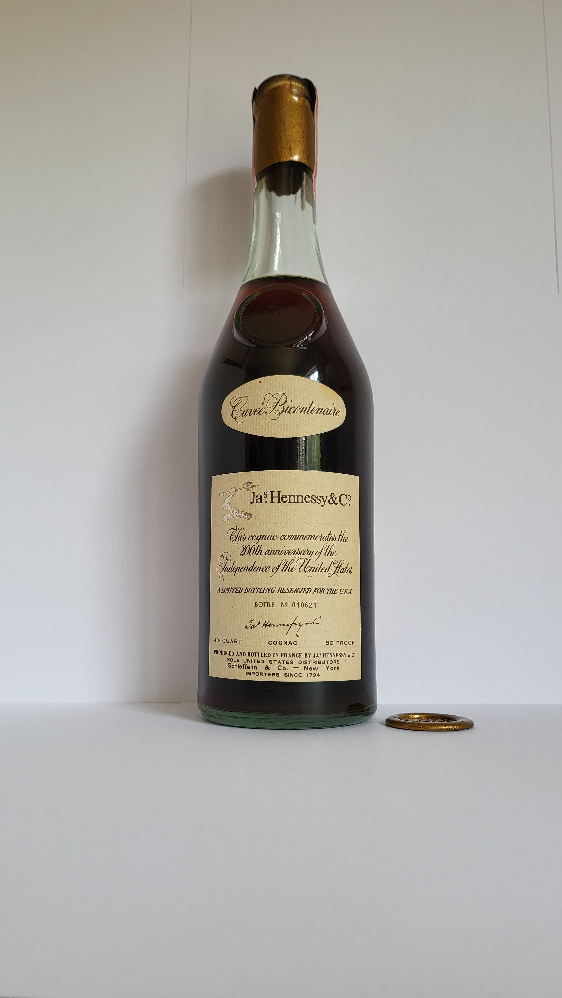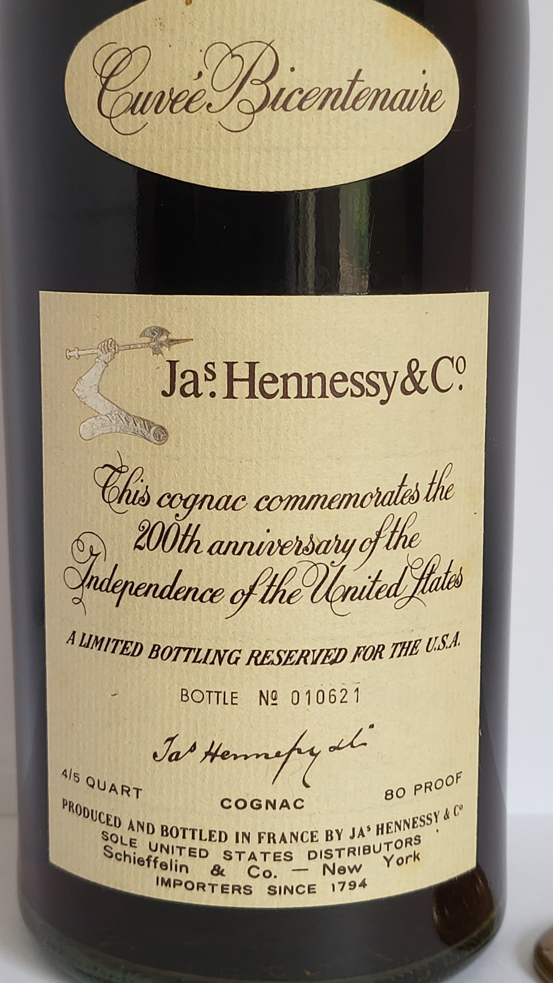 - 1) Text on label: Front label: Cuvée Bicentenaire Jas Hennessy & Cº. This cognac commemorates the 200th anniversary of the Independence of the United States A LIMITED BOTTLING RESERVED FOR THE U.S.A. BOTTLE No 010621 Jas' Hennessy &c. 4/5 QUART COGNAC 80 PROOF PRODUCED AND BOTTLED IN FRANCE BY JAS HENNESSY & Cº SOLE UNITED STATES DISTRIBUTORS Schieffelin & Co. — NEW YORK IMPORTERS SINCE 1794 Front, oval label: Cuvee Bicentenaire Front, main label: Jas.Hennessy & Co. This cognac commemorates the 200th anniversary of the Independence of the United States A LIMITED BOTTLING RESERVED FOR THE U.S.A. BOTTLE No 010621 Jas. Hennessy & L. 4/5 QUART 80 PROOF COGNAC PRODUCED AND BOTTLED IN FRANCE BY JAS HENNESSY & C° SOLE UNITED STATES DISTRIBUTORS Schieffelin & Co. – New York IMPORTERS SINCE 1794 Back label: DURING THE REVOLUTIONARY WAR ...DISTILLATES IN THEIR SEPARATE ...RICH GOLDEN COLOR AND MELLOW ...WILL CONTINUE TO DO HONOR TO ITS NAME ...IN CELEBRATION OF THE BICENTENNIAL ...HAVE RESERVED FOR THE AMERICAN PEOPLE ...HOLDING THIS OLD BOTTLE THE PRIVILEGE OF ...WHICH HAS RECENTLY REACHED ITS 200th ...FAR FROM THE BEGINNING OF ITS ...TO BE PASSED ON FROM GENERATION ...A SYMBOL OF COOPERATION, THE LIFE ...PARTAKING OF THE WARMING OF THIS ...THE BRAND OF [unreadable signature] 2) Visual elements: Graphics include a circular embossed glass seal on the shoulder featuring the Hennessy arm-and-axe logo. A smaller version of this logo is printed on the main label. There is also a red wax seal applied to the shoulder. Font styles include a decorative script for "Cuvée Bicentenaire," a block serif font for "Jas Hennessy & Co," and a mix of script and sans-serif fonts for the remaining text. Bottle form: The bottle is a standard cognac shape with rounded, sloping shoulders and a long neck. The closure is a cork stopper covered by a gold foil capsule. A red paper strip, possibly a tax band, is present over the capsule. The glass is clear/light green at the neck and appears to be dark green for the body. CRITICAL: Label and Bottle Condition Assessment Label condition: The labels are in very good condition, showing some age-related yellowing. The smaller oval label has a minor dark spot. The main label is clean with no visible tears, peeling, or significant stains. Capsule/Seal condition: The gold foil capsule is fully intact, with minor age-related wrinkling but no tears or signs of corrosion. The seal appears firm and original. Tax stamp/band: A red paper tax band is present over the capsule. It appears intact and unbroken, though slightly faded. Cork/Stopper condition: The cork is not visible, but there are no signs of leakage or staining around the neck or capsule. The seal appears sound. Glass bottle condition: The glass is clean and clear, with no visible scratches, chips, or cracks. No significant sediment is visible. Overall condition summary: Overall condition: Very Good. The bottle presents very well for its age. The most notable issues are minor, age-appropriate yellowing of the labels and a small spot on the oval label. Emblem: A graphic of an arm holding an axe (Bras Armé) appears on the mid-upper front label. Strip label: A red and white strip label with serial number "585090186" and "DISTILLED SPIRITS" text is wrapped over the cork and upper neck. It features a central emblem resembling an eagle. Capsule: A gold-colored foil capsule covers the cork and extends down the neck beneath the strip label. Front Labels: The main front label is rectangular and beige/cream. An oval-shaped label is attached to its left. Back Label: A rectangular, plain off-white/cream back label with dense text. Font Styles: The main brand name ("Jas.Hennessy & Co.") and "Cuvee Bicentenaire" on the front label use an elegant serif font. The commemorative text is in a prominent cursive/script font. Other informational text (proof, quart, bottling details) is in various sizes of clear serif fonts. Signatures are in cursive. The back label uses a simple serif font. 3) Fill level estimate: well above shoulder into neck: great
