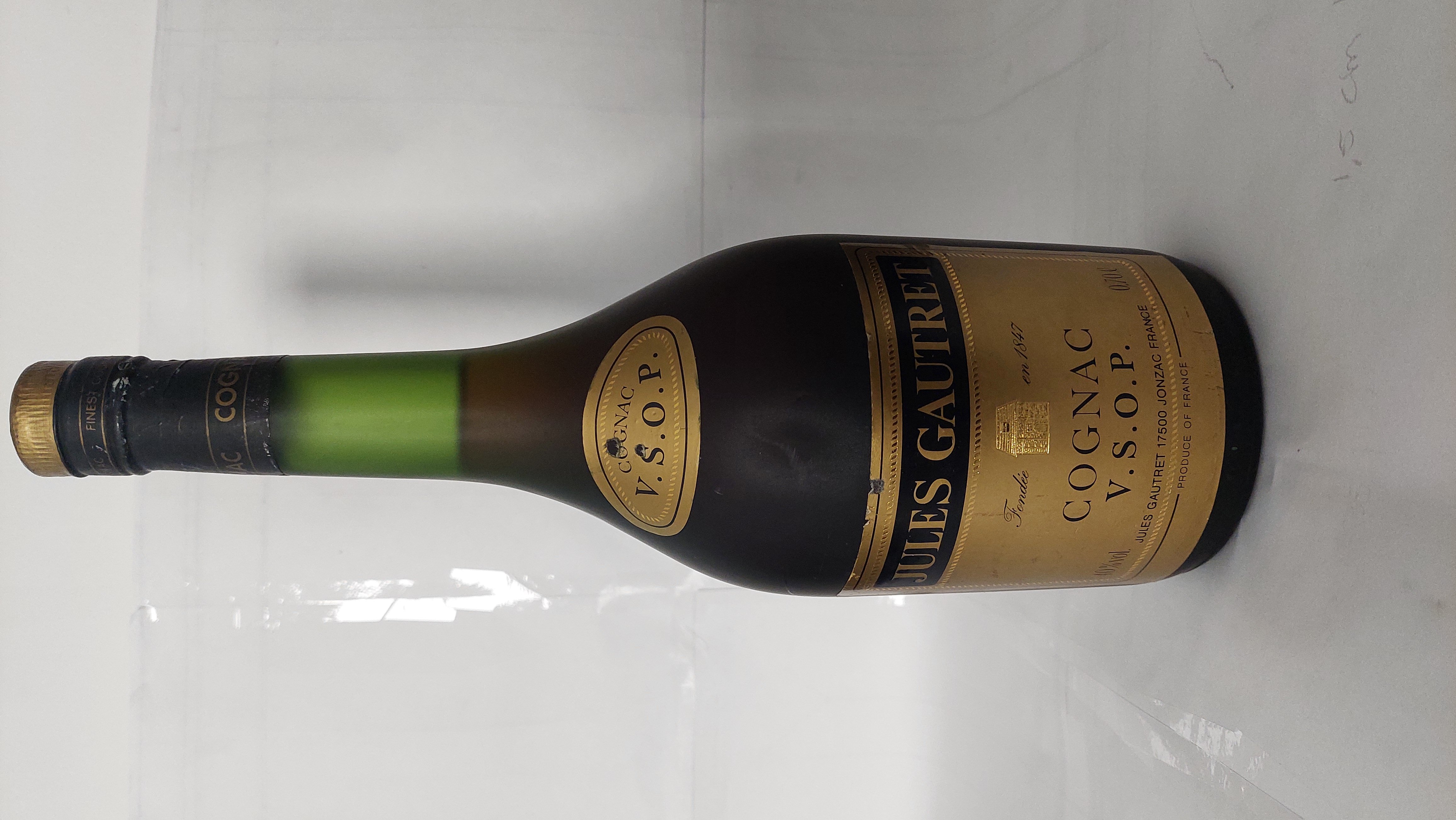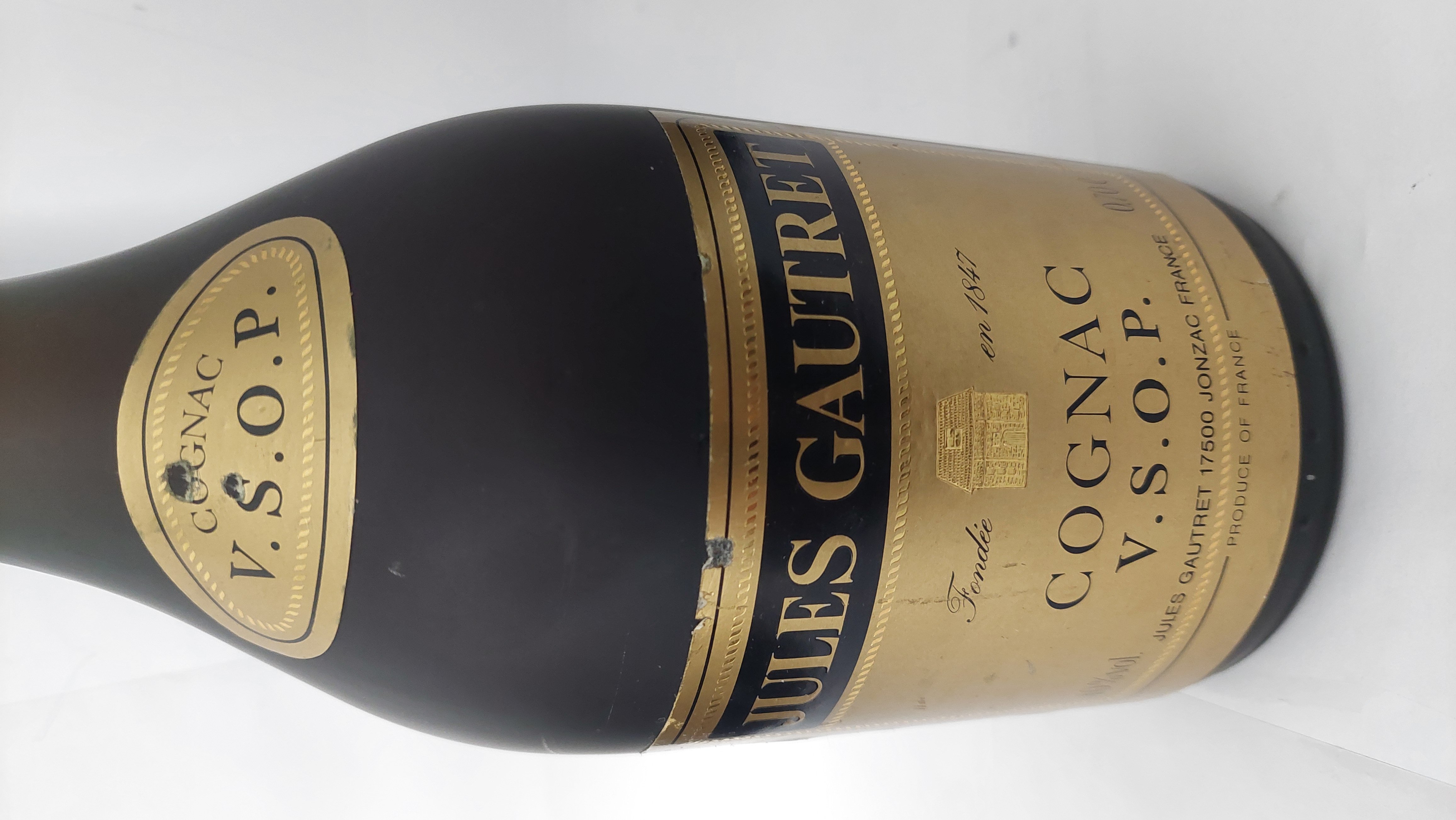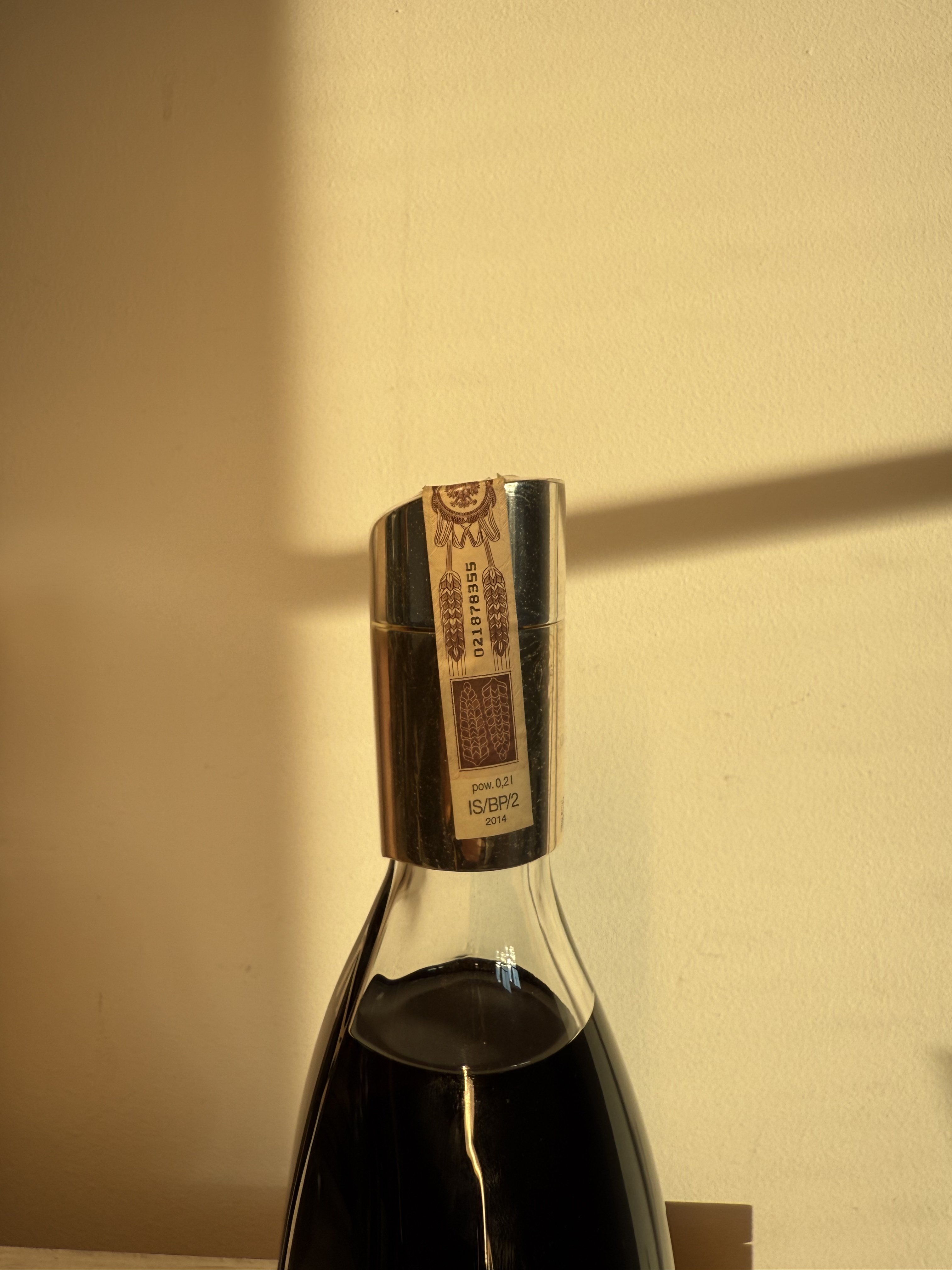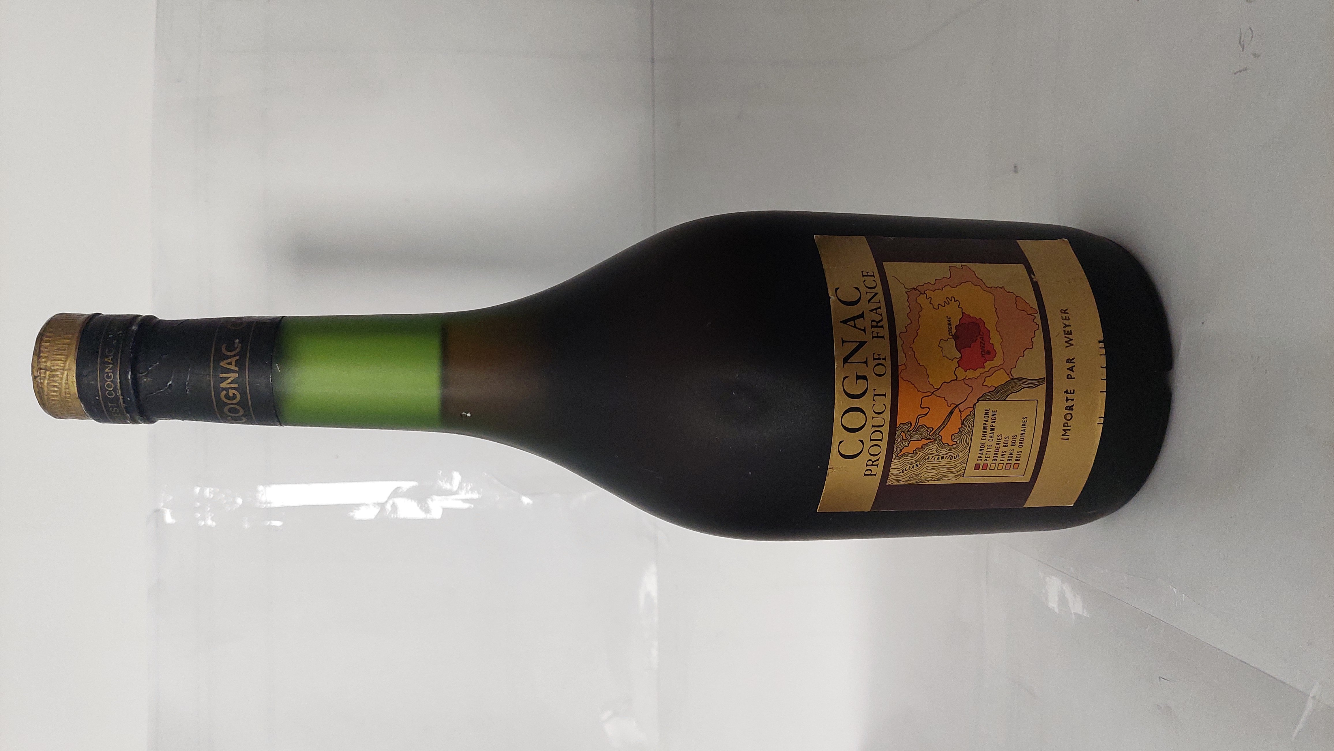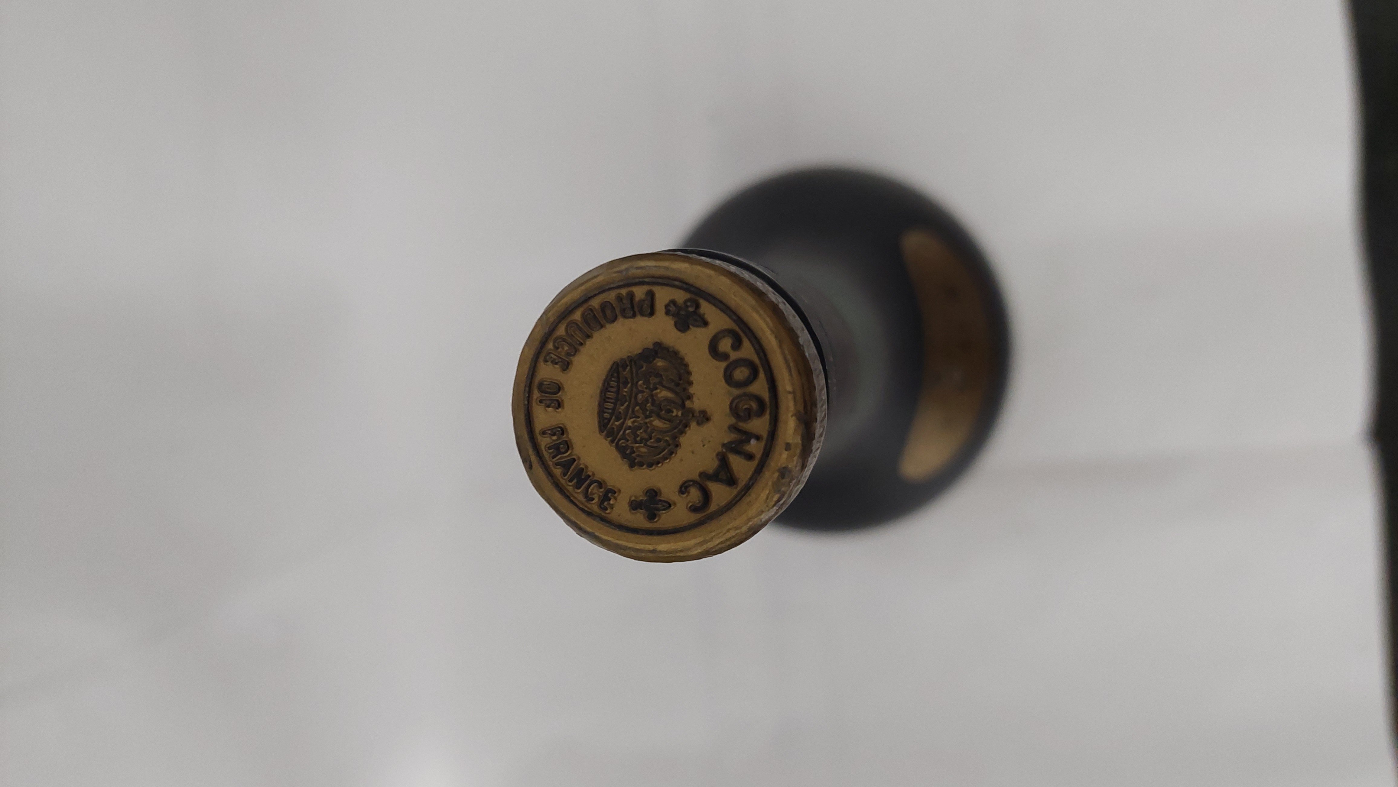 - 1) Text on label: Front label: Cuvée Bicentenaire Jas Hennessy & Cº. This cognac commemorates the 200th anniversary of the Independence of the United States A LIMITED BOTTLING RESERVED FOR THE U.S.A. BOTTLE No 010621 Jas' Hennessy &c. 4/5 QUART COGNAC 80 PROOF PRODUCED AND BOTTLED IN FRANCE BY JAS HENNESSY & Cº SOLE UNITED STATES DISTRIBUTORS Schieffelin & Co. — NEW YORK IMPORTERS SINCE 1794 Front, oval label: Cuvee Bicentenaire Front, main label: Jas.Hennessy & Co. This cognac commemorates the 200th anniversary of the Independence of the United States A LIMITED BOTTLING RESERVED FOR THE U.S.A. BOTTLE No 010621 Jas. Hennessy & L. 4/5 QUART 80 PROOF COGNAC PRODUCED AND BOTTLED IN FRANCE BY JAS HENNESSY & C° SOLE UNITED STATES DISTRIBUTORS Schieffelin & Co. – New York IMPORTERS SINCE 1794 Back label: DURING THE REVOLUTIONARY WAR ...DISTILLATES IN THEIR SEPARATE ...RICH GOLDEN COLOR AND MELLOW ...WILL CONTINUE TO DO HONOR TO ITS NAME ...IN CELEBRATION OF THE BICENTENNIAL ...HAVE RESERVED FOR THE AMERICAN PEOPLE ...HOLDING THIS OLD BOTTLE THE PRIVILEGE OF ...WHICH HAS RECENTLY REACHED ITS 200th ...FAR FROM THE BEGINNING OF ITS ...TO BE PASSED ON FROM GENERATION ...A SYMBOL OF COOPERATION, THE LIFE ...PARTAKING OF THE WARMING OF THIS ...THE BRAND OF [unreadable signature] 2) Visual elements: Graphics include a circular embossed glass seal on the shoulder featuring the Hennessy arm-and-axe logo. A smaller version of this logo is printed on the main label. There is also a red wax seal applied to the shoulder. Font styles include a decorative script for "Cuvée Bicentenaire," a block serif font for "Jas Hennessy & Co," and a mix of script and sans-serif fonts for the remaining text. Bottle form: The bottle is a standard cognac shape with rounded, sloping shoulders and a long neck. The closure is a cork stopper covered by a gold foil capsule. A red paper strip, possibly a tax band, is present over the capsule. The glass is clear/light green at the neck and appears to be dark green for the body. CRITICAL: Label and Bottle Condition Assessment Label condition: The labels are in very good condition, showing some age-related yellowing. The smaller oval label has a minor dark spot. The main label is clean with no visible tears, peeling, or significant stains. Capsule/Seal condition: The gold foil capsule is fully intact, with minor age-related wrinkling but no tears or signs of corrosion. The seal appears firm and original. Tax stamp/band: A red paper tax band is present over the capsule. It appears intact and unbroken, though slightly faded. Cork/Stopper condition: The cork is not visible, but there are no signs of leakage or staining around the neck or capsule. The seal appears sound. Glass bottle condition: The glass is clean and clear, with no visible scratches, chips, or cracks. No significant sediment is visible. Overall condition summary: Overall condition: Very Good. The bottle presents very well for its age. The most notable issues are minor, age-appropriate yellowing of the labels and a small spot on the oval label. Emblem: A graphic of an arm holding an axe (Bras Armé) appears on the mid-upper front label. Strip label: A red and white strip label with serial number "585090186" and "DISTILLED SPIRITS" text is wrapped over the cork and upper neck. It features a central emblem resembling an eagle. Capsule: A gold-colored foil capsule covers the cork and extends down the neck beneath the strip label. Front Labels: The main front label is rectangular and beige/cream. An oval-shaped label is attached to its left. Back Label: A rectangular, plain off-white/cream back label with dense text. Font Styles: The main brand name ("Jas.Hennessy & Co.") and "Cuvee Bicentenaire" on the front label use an elegant serif font. The commemorative text is in a prominent cursive/script font. Other informational text (proof, quart, bottling details) is in various sizes of clear serif fonts. Signatures are in cursive. The back label uses a simple serif font. 3) Fill level estimate: well above shoulder into neck: great