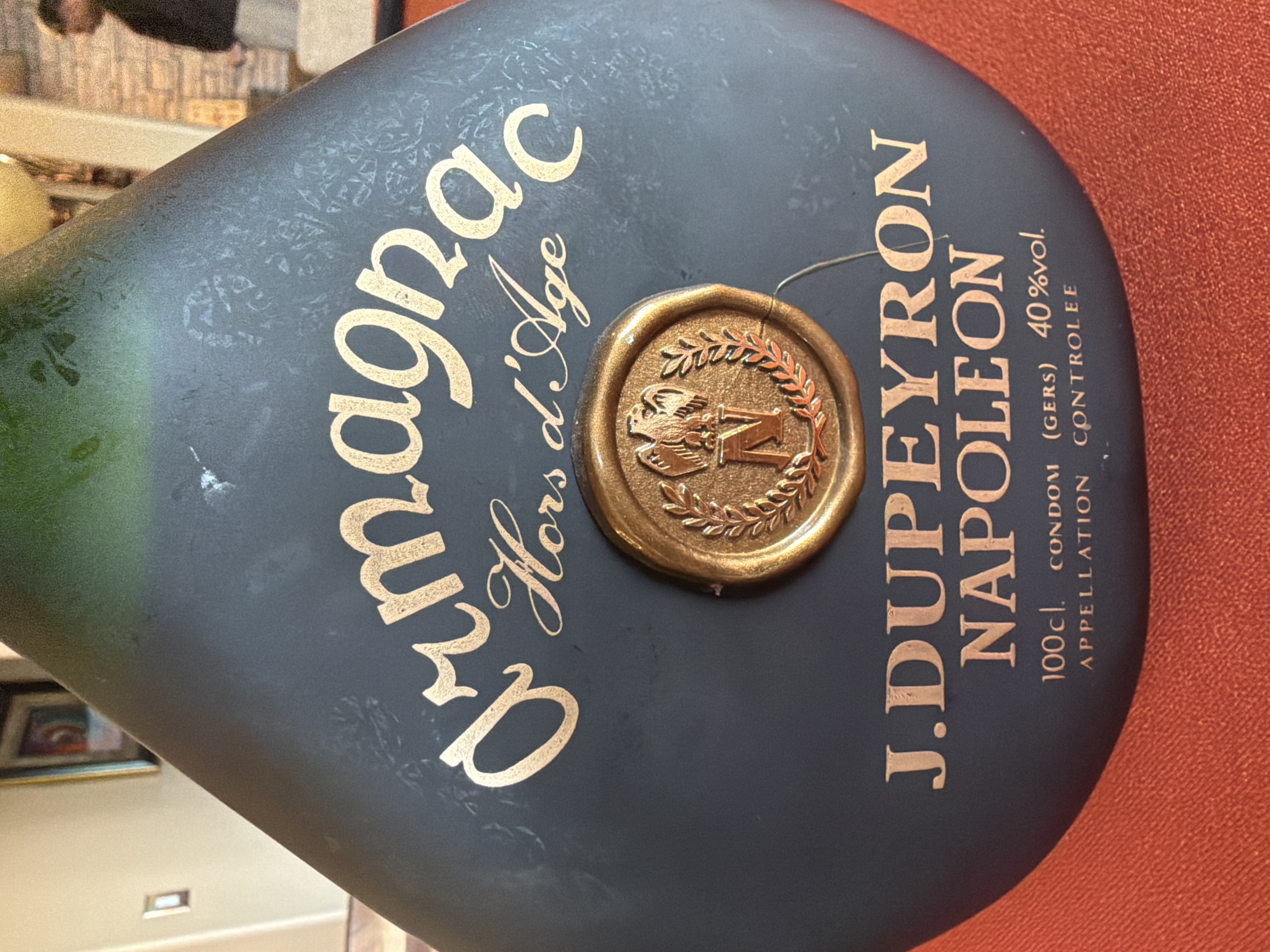 - 1) Text on label: Armagnac Hors d'Age J.DUPEYRON NAPOLEON 100cl. CONDOM (GERS) 40%VOL. APPELLATION CONTROLÉE (On top of capsule) BYST-DUPEYRON ARMAGNAC FRANCE 2) Visual elements: The bottle has a distinctive flattened, flask-like shape with a matte dark finish on the body, transitioning to a transparent green glass neck. A gold-colored capsule/foil covers the neck and cork, with a braided pattern on the very top of the capsule. A prominent circular gold imitation wax seal is affixed to the mid-label, featuring a central stylized "N" crowned with a laurel wreath and what appears to be an eagle motif below. The "Armagnac Hors d'Age" text is rendered in an elegant cursive/script font. "J.DUPEYRON" and "NAPOLEON" are in a bold, uppercase serif font (with the "N" in "NAPOLEON" notably larger). The smaller text lines below "NAPOLEON" and the text on the capsule top are in an uppercase sans-serif font. 3) Fill level estimate: below shoulder: not that good Reason: No liquid is visible in the transparent green neck section, indicating the level is within the opaque body.