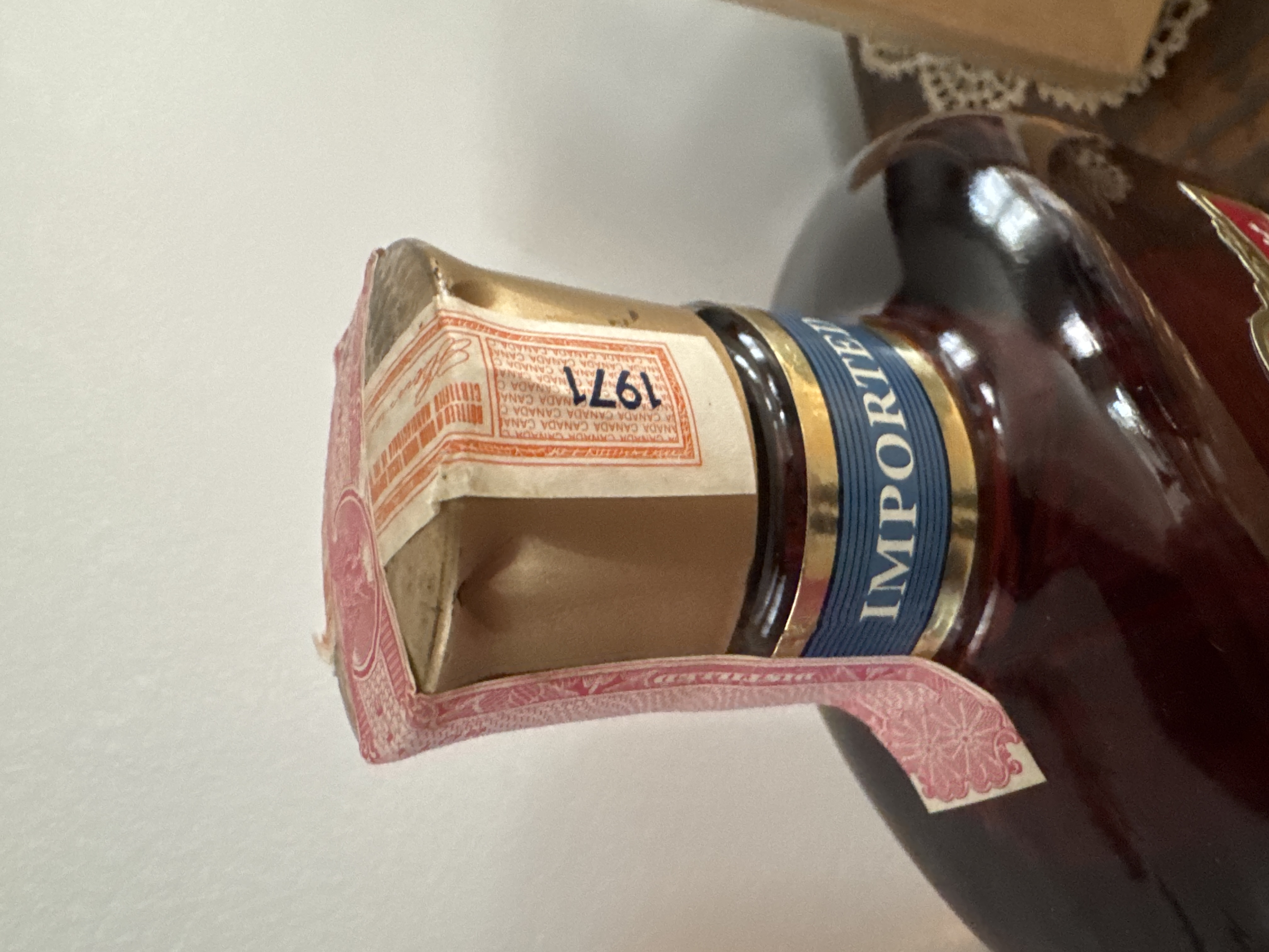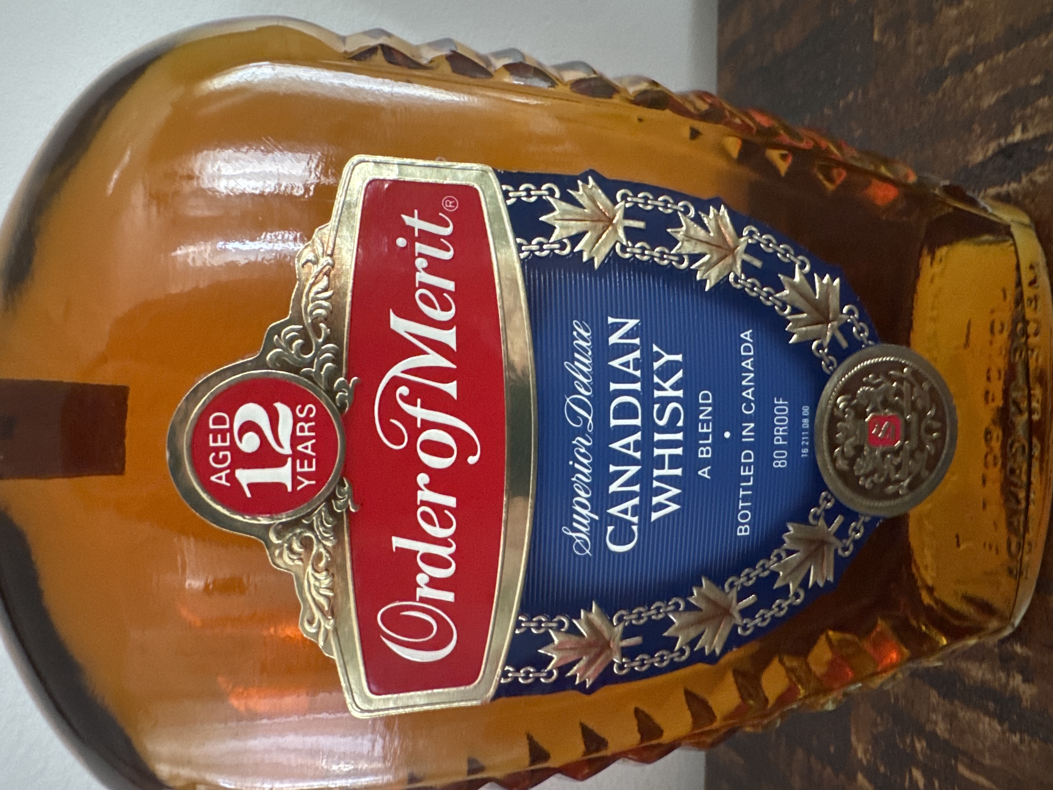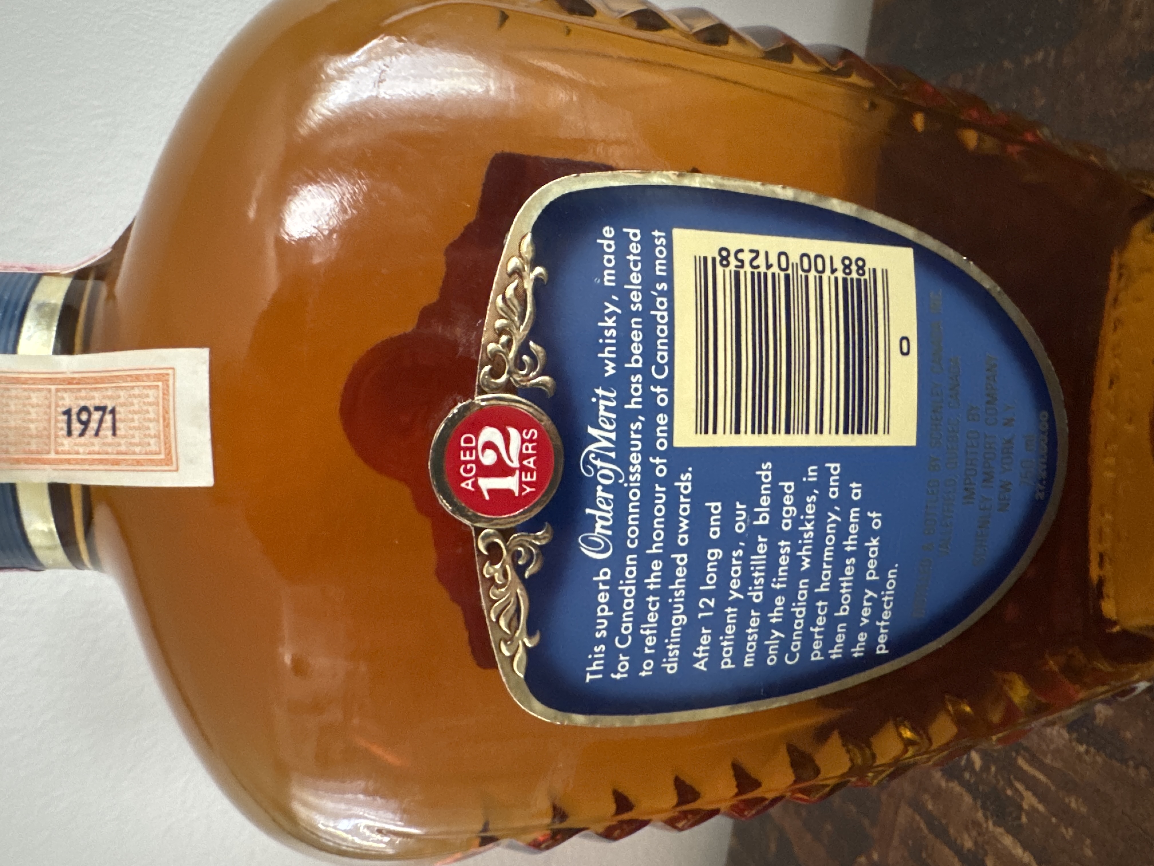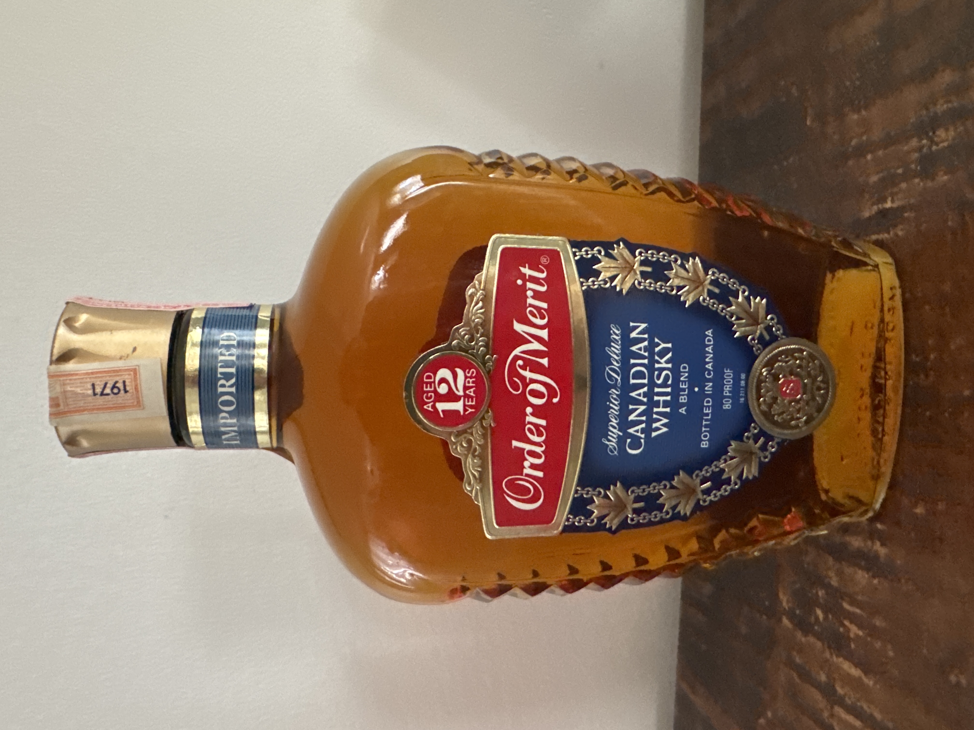 - 1) Text on label: Front Label (red oval): Order of Merit Front Label (red circular emblem): AGED 12 YEARS Front Label (blue shield): Superior Deluxe CANADIAN WHISKY A BLEND BOTTLED IN CANADA 80 PROOF 16 2/3 FL.OZ LIQ. Neck Label (blue strip): IMPORTED Tax Strip (side of capsule, orange/white): EXCISE CANADA ACCISE B2557779 1971 (Repeated small text: A CANADA CANADA) Tax Strip (top of capsule, red/white): STAMP N.Y. U.S. INTERNAL REVENUE Back Label (left text block): This superb Order of Merit whisky, made for Canadian connoisseurs, has been selected to reflect the honour of one of Canada's most distinguished awards. After 12 long and patient years, our master distiller blends only the finest aged Canadian whiskies, in perfect harmony, and then bottles them at their very peak of perfection. Back Label (right text block, partially visible): PRODUCED & BOTTLED BY SEAGRAMS LTD., LASALLE, QUEBEC, CANADA. IMPORTED BY IMPERIAL IMPORT COMPANY NEW YORK, N.Y. 10019 CONTENTS 750 ML Back Label (barcode numbers): 0 88100 01258 0 2) Visual elements: Bottle: Amber-colored glass, wide, somewhat flattened body with prominent ridged/faceted texture on the sides. Front Label: Features a central blue shield-shaped label bordered by a gold chain design with golden maple leaf emblems. Above this is a red oval with "Order of Merit" in white cursive. A circular red emblem on the upper left of the main label, outlined in gold, states "AGED 12 YEARS". A small gold medallion with a red center (possibly an 'M' or insignia) is at the bottom center of the blue shield. Neck Label: A blue strip encircling the neck with "IMPORTED" in white block letters, bordered by thin gold lines. Capsule: Gold-colored foil covers the cork/cap. Tax Bands: An orange and white excise stamp band encircles the neck/capsule, featuring "EXCISE CANADA ACCISE" and the year "1971". A red and white stamp band runs over the top of the capsule, featuring "STAMP N.Y.", "U.S. INTERNAL REVENUE", and an intricate eagle graphic. Font Styles: Cursive/script for "Order of Merit"; serif for most descriptive text (e.g., "Superior Deluxe", "WHISKY", back label text); sans-serif for "CANADIAN", "AGED", "IMPORTED", and numerical figures; and distinct block-like sans-serif for "EXCISE CANADA ACCISE" and "STAMP N.Y.". 3) Fill level estimate: well above shoulder into neck: great