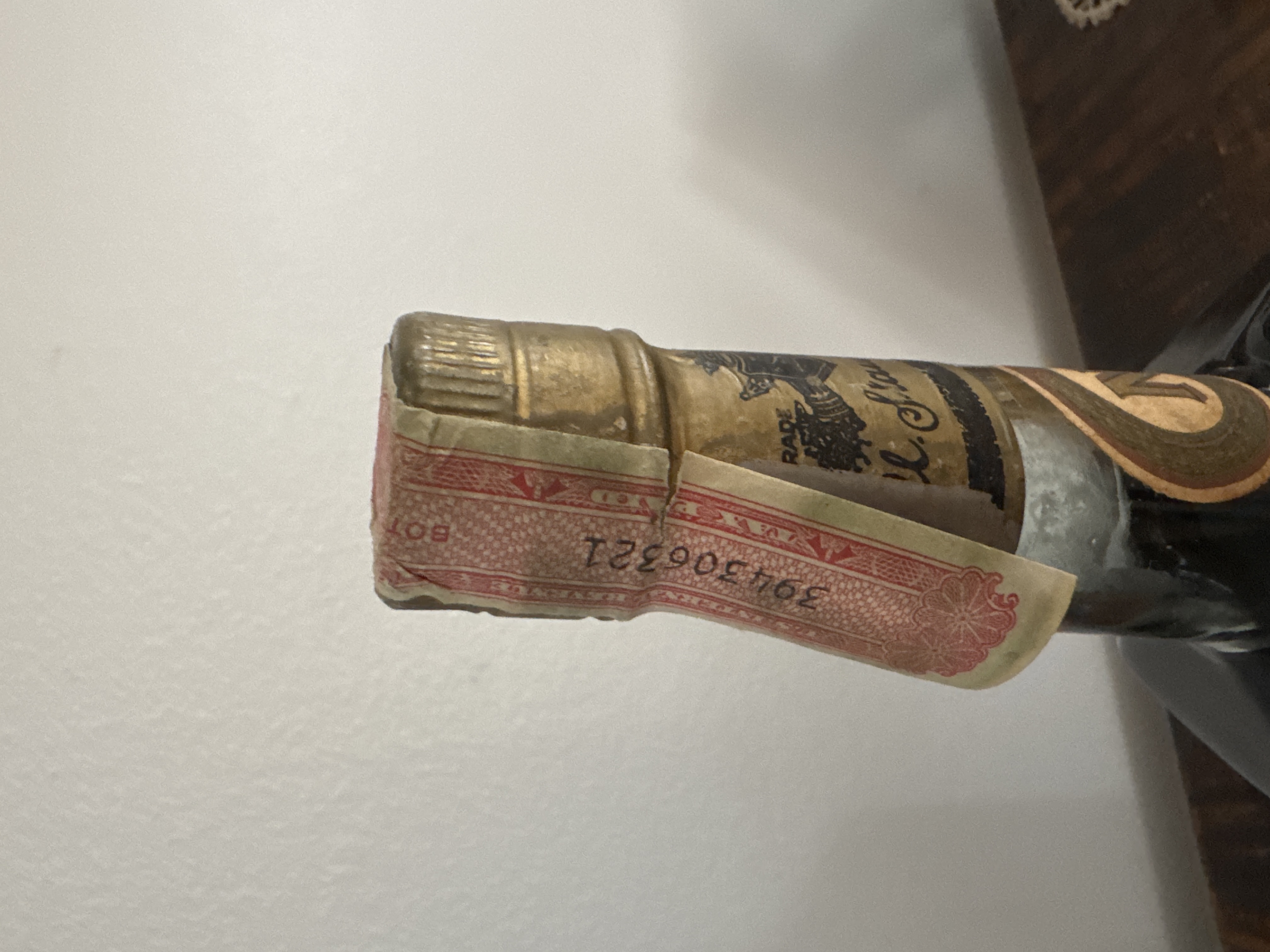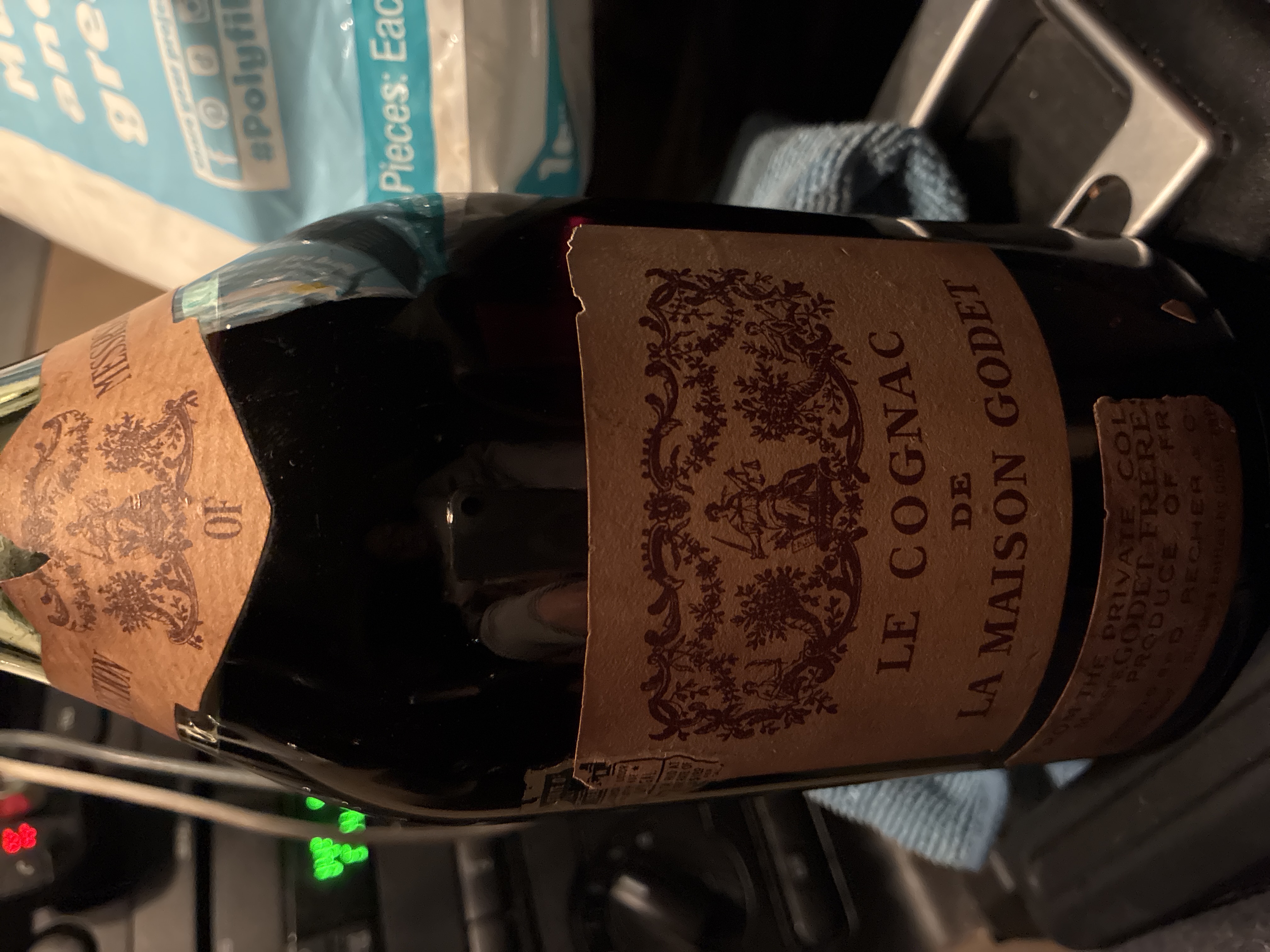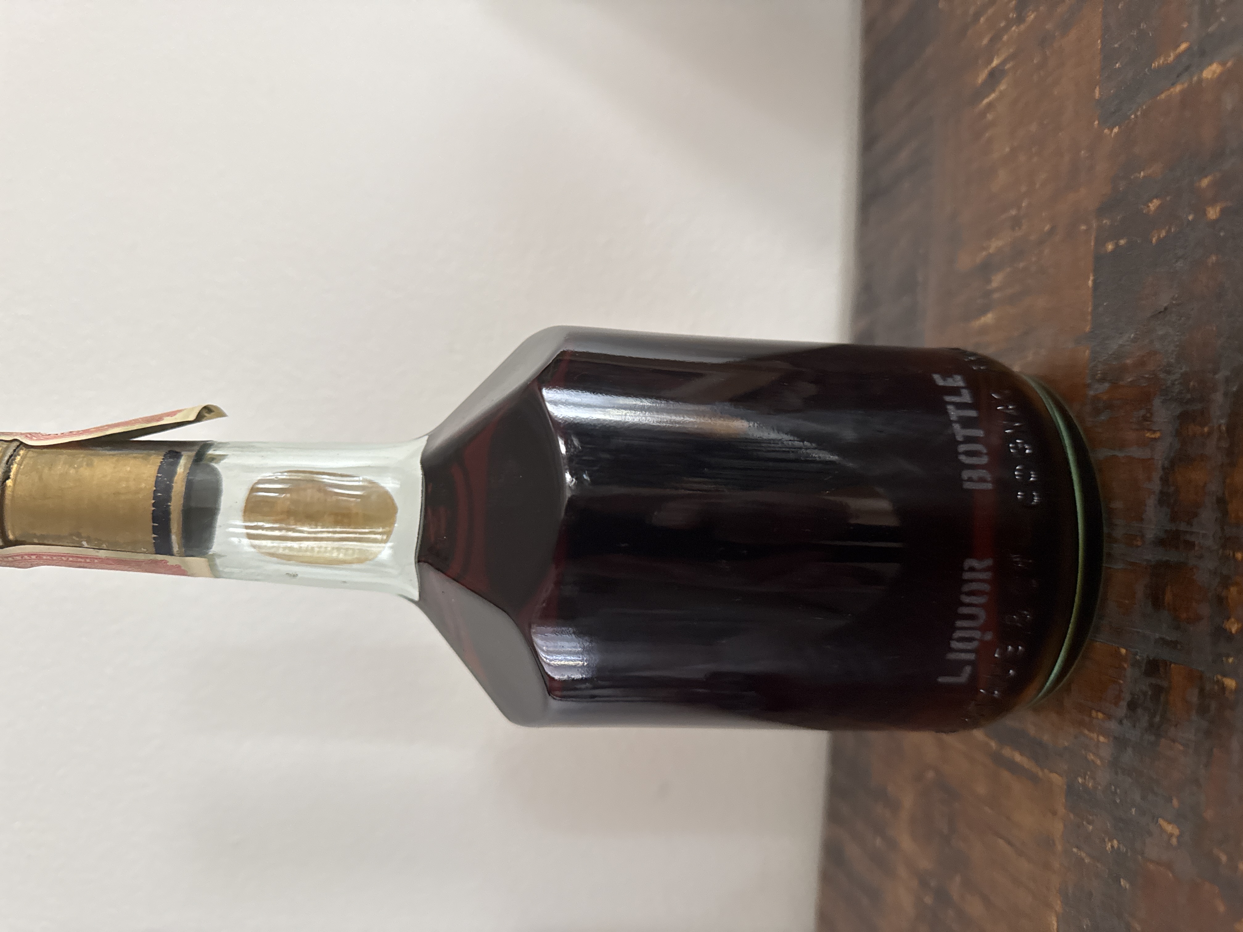 - 1) Text on label: Main Front Label: LE COGNAC DE LA MAISON GODET APPELL. VIGN. APT VOL. COGNAC PRODUCE OF FRANCE 70 PROOF GODET FRERES, COGNAC REG. NO. H. 44 Left Neck Label: FROM THE PRIVATE CELLAR Right Neck Label: MESSI OF Right Back Label: Private Reserve GODET 1852 Neck Band (red strip): 13-17 State Tax Strip (lower left front): STATE OF KENTUCKY ALCOHOLIC BEVERAGE TAX PAID AT THE RATE OF $1.00 PER GAL. NO. 1 2) Visual elements: Main Front Label: Features a decorative border of vines and leaves, surrounding a central vignette depicting a figure (possibly a man with a farming tool) amidst trees. The main text ("LE COGNAC", "LA MAISON GODET") is in a decorative serif font, while smaller text uses a standard serif. Neck Labels (left & right): Simple brown paper labels with text in a basic serif font. Back Labels (left & right): Simple brown paper labels with text in a basic serif font. Capsule: Silver/grey metallic foil, crimped around the bottleneck. Top of Capsule: A circular red paper seal with a very faint, indistinct emblem (possibly a stylized initial or crest). Neck Band: A red paper strip encircling the neck, featuring the numbers "13-17" in black. State Tax Strip (lower left front): A white paper strip with blue sans-serif block text and what appears to be a state seal or emblem, though blurry. 3) Fill level estimate: well above shoulder into neck: great Reason: Liquid level is high in the bottleneck, with no significant air gap visible.