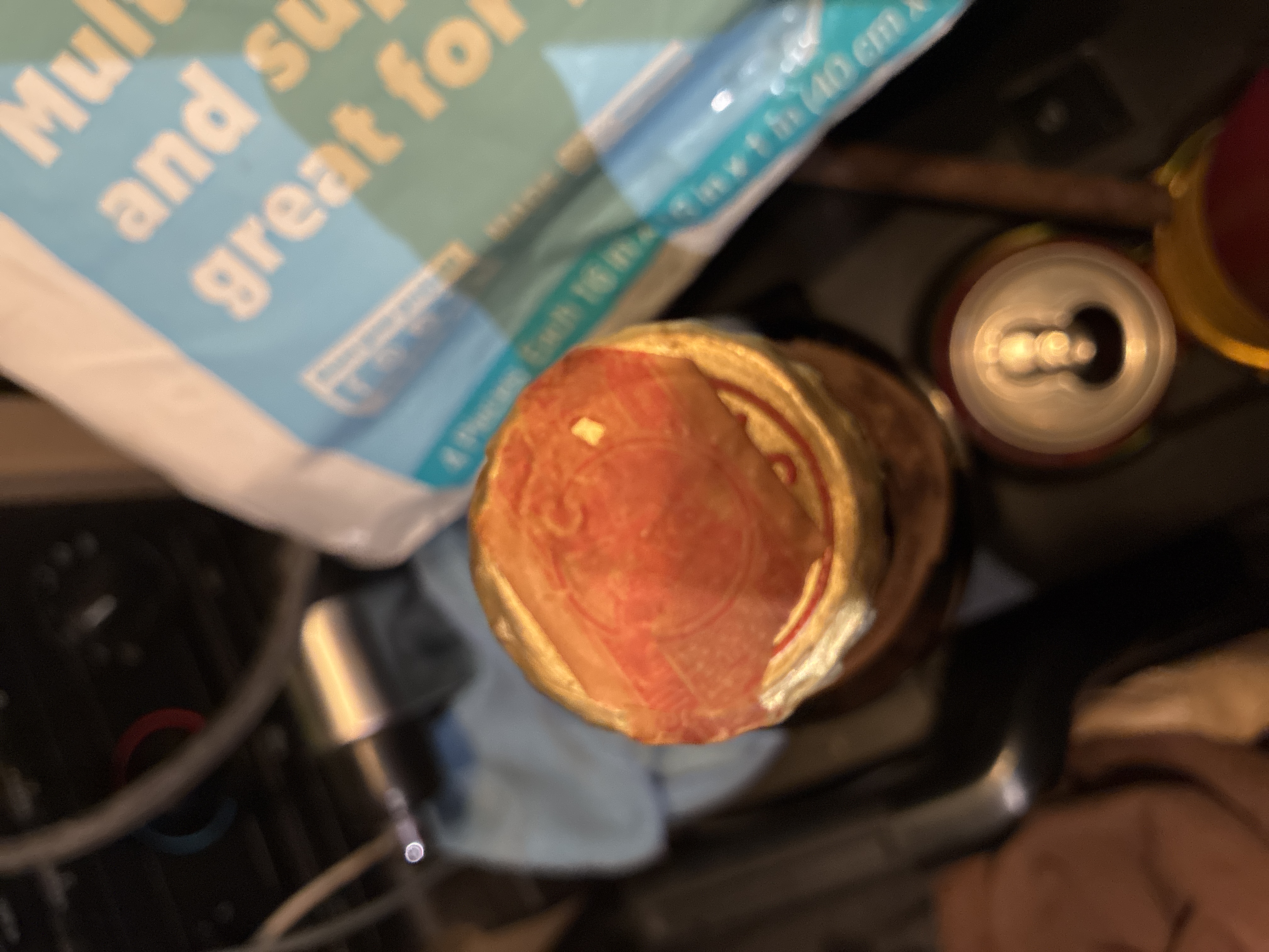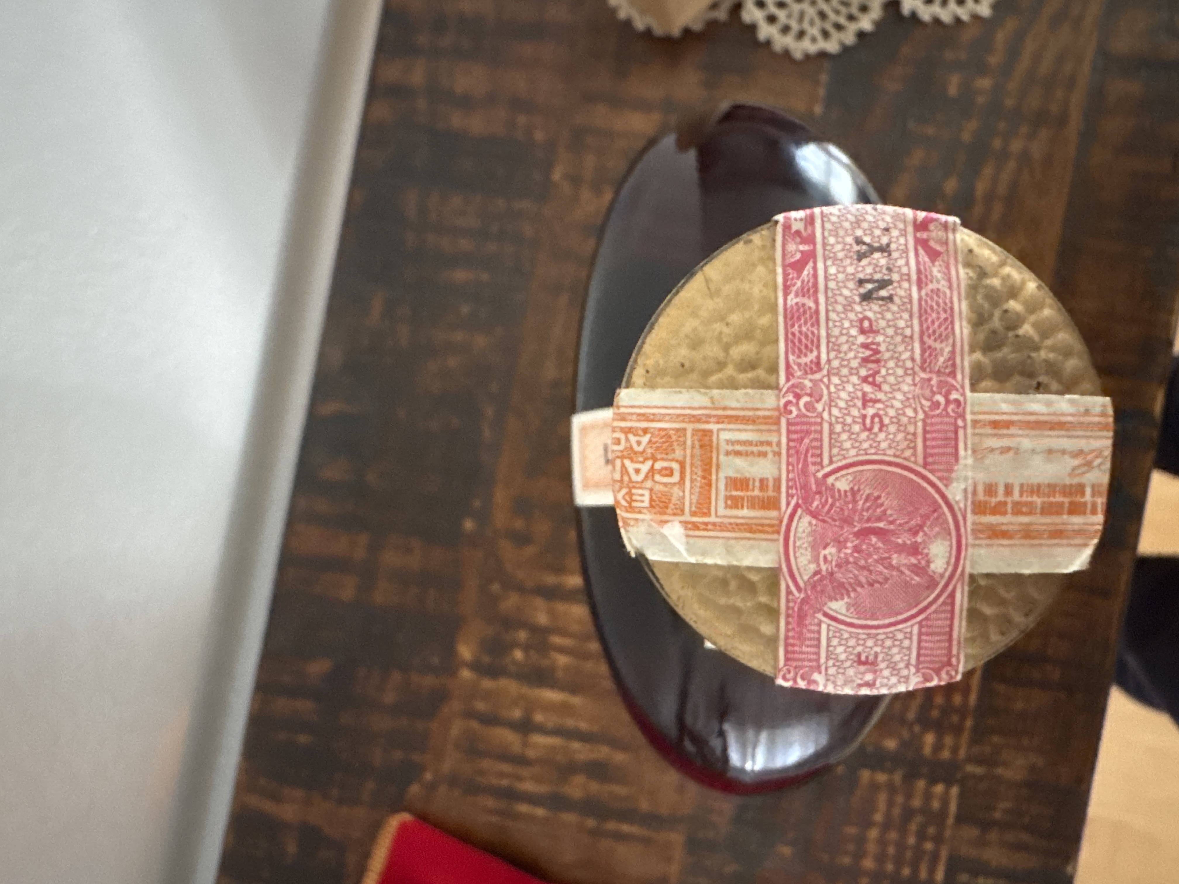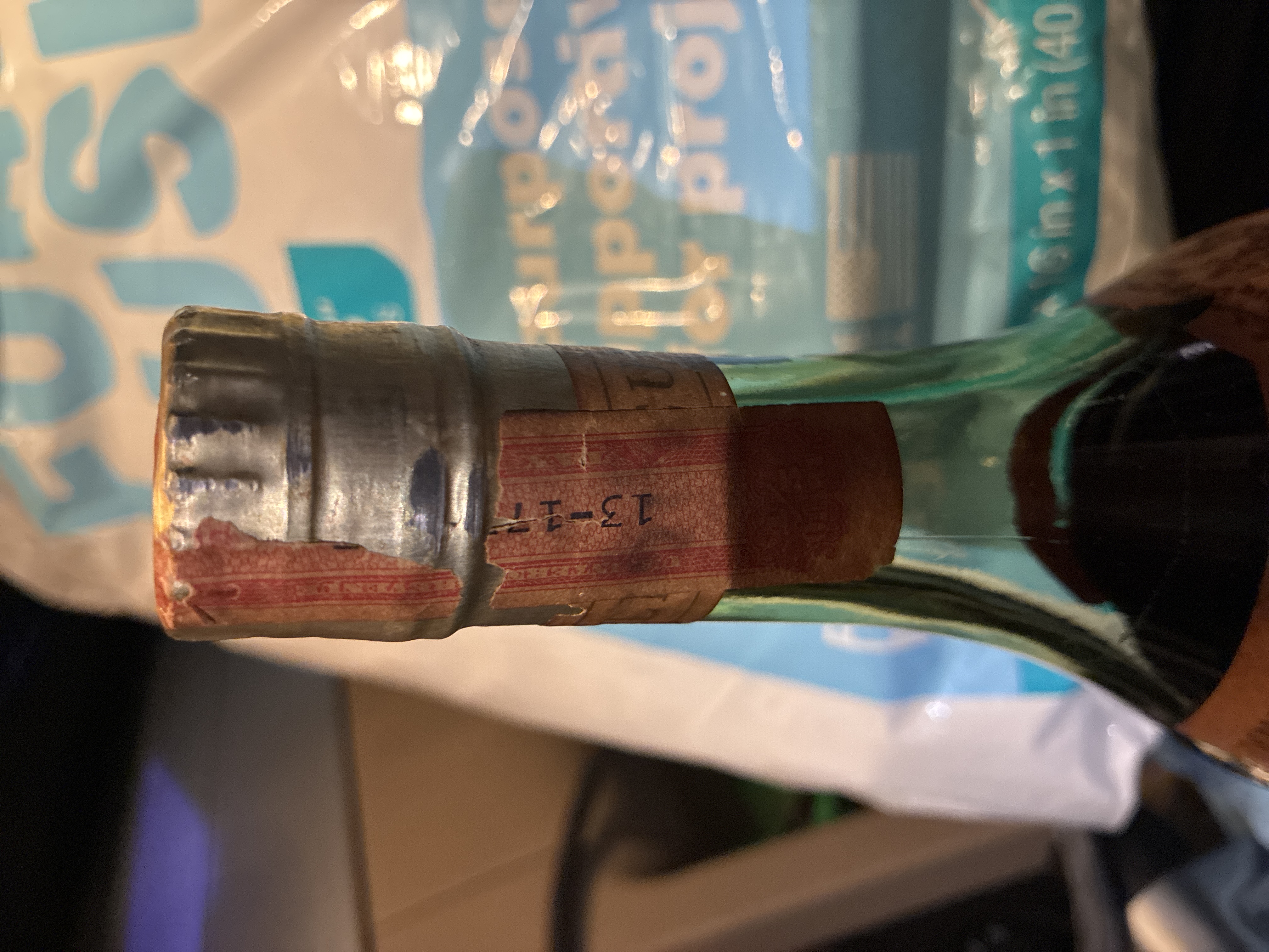 - 1) Text on label: Main Front Label: LE COGNAC DE LA MAISON GODET APPELL. VIGN. APT VOL. COGNAC PRODUCE OF FRANCE 70 PROOF GODET FRERES, COGNAC REG. NO. H. 44 Left Neck Label: FROM THE PRIVATE CELLAR Right Neck Label: MESSI OF Right Back Label: Private Reserve GODET 1852 Neck Band (red strip): 13-17 State Tax Strip (lower left front): STATE OF KENTUCKY ALCOHOLIC BEVERAGE TAX PAID AT THE RATE OF $1.00 PER GAL. NO. 1 2) Visual elements: Main Front Label: Features a decorative border of vines and leaves, surrounding a central vignette depicting a figure (possibly a man with a farming tool) amidst trees. The main text ("LE COGNAC", "LA MAISON GODET") is in a decorative serif font, while smaller text uses a standard serif. Neck Labels (left & right): Simple brown paper labels with text in a basic serif font. Back Labels (left & right): Simple brown paper labels with text in a basic serif font. Capsule: Silver/grey metallic foil, crimped around the bottleneck. Top of Capsule: A circular red paper seal with a very faint, indistinct emblem (possibly a stylized initial or crest). Neck Band: A red paper strip encircling the neck, featuring the numbers "13-17" in black. State Tax Strip (lower left front): A white paper strip with blue sans-serif block text and what appears to be a state seal or emblem, though blurry. 3) Fill level estimate: well above shoulder into neck: great Reason: Liquid level is high in the bottleneck, with no significant air gap visible.