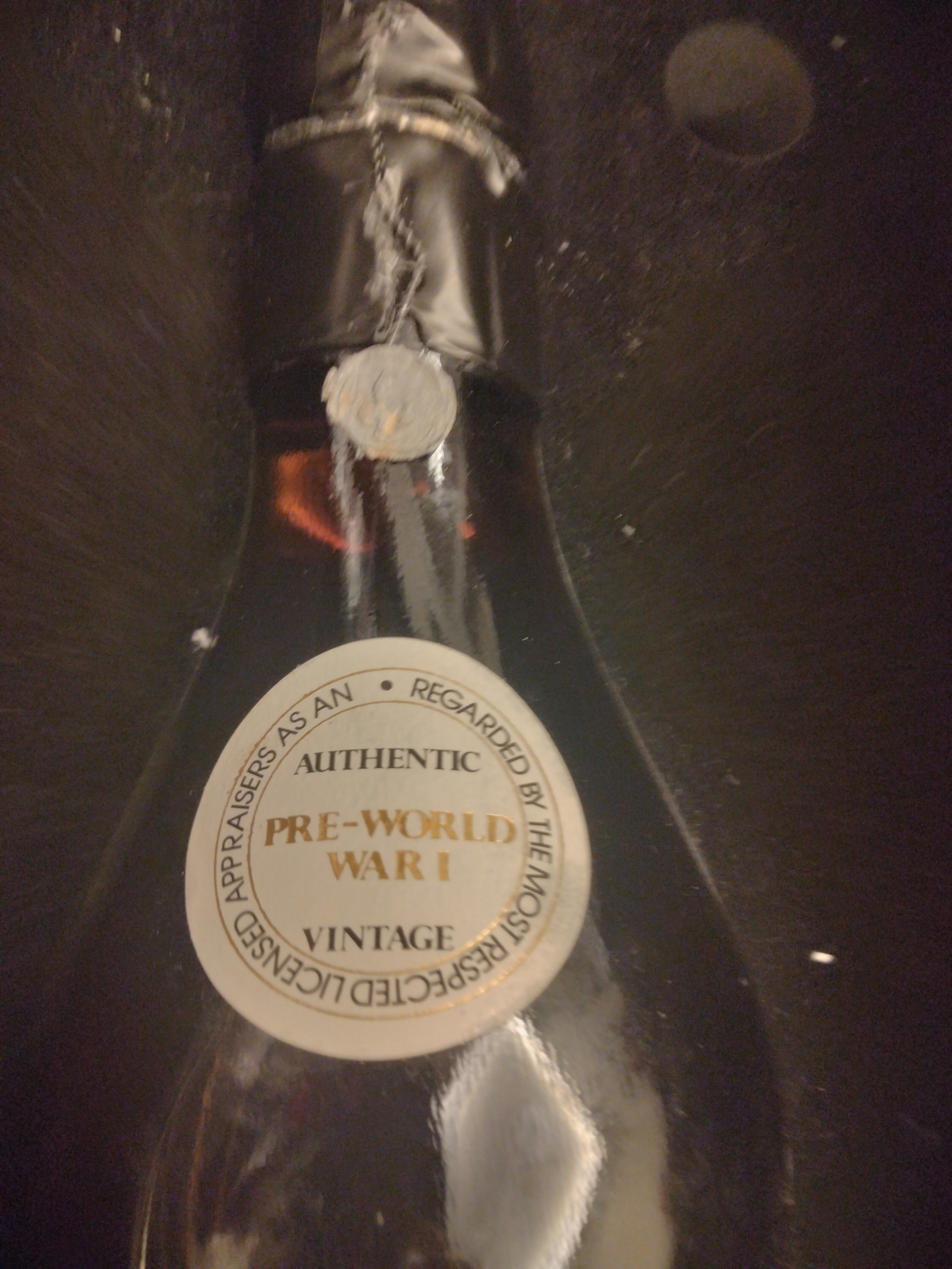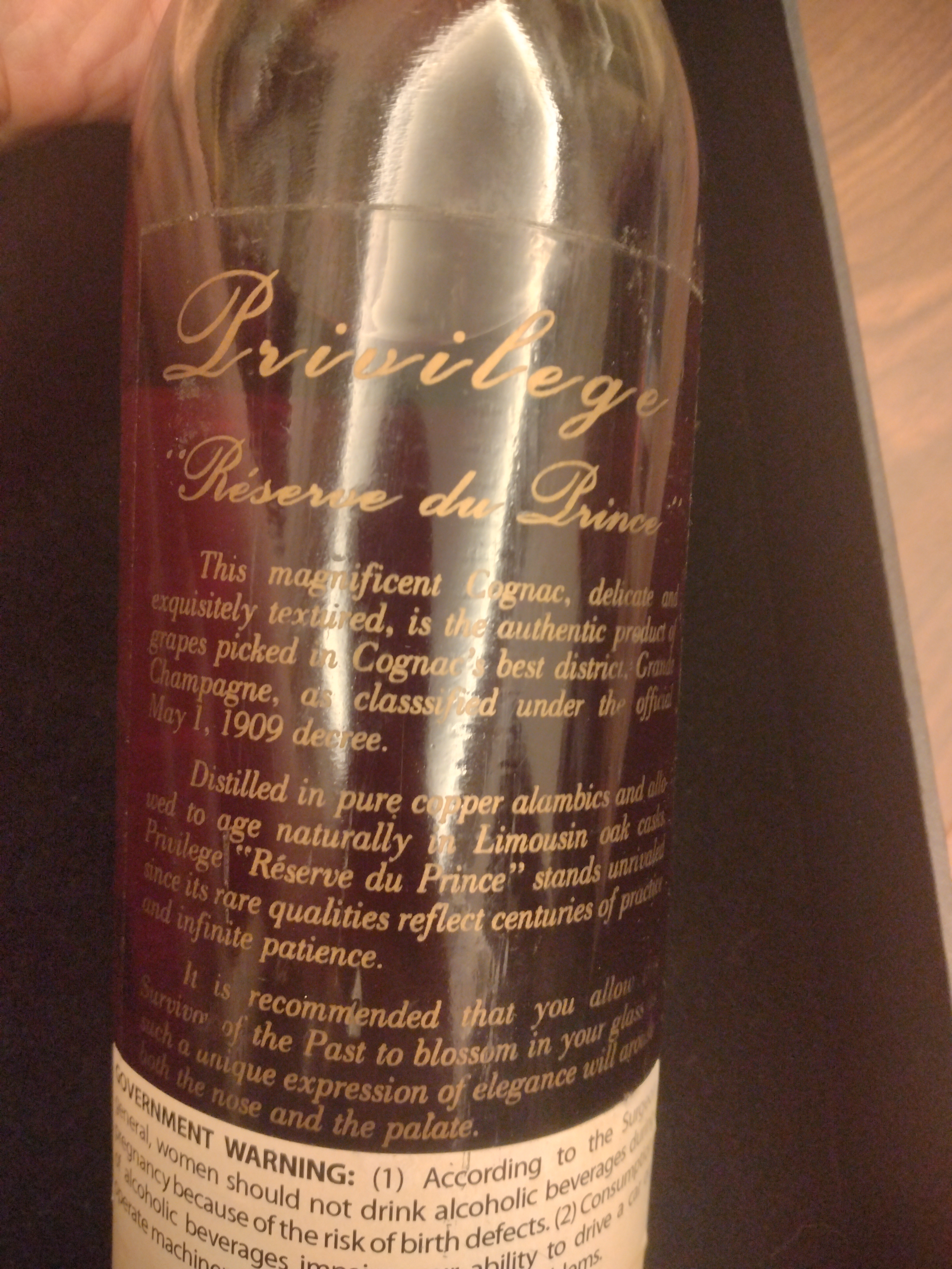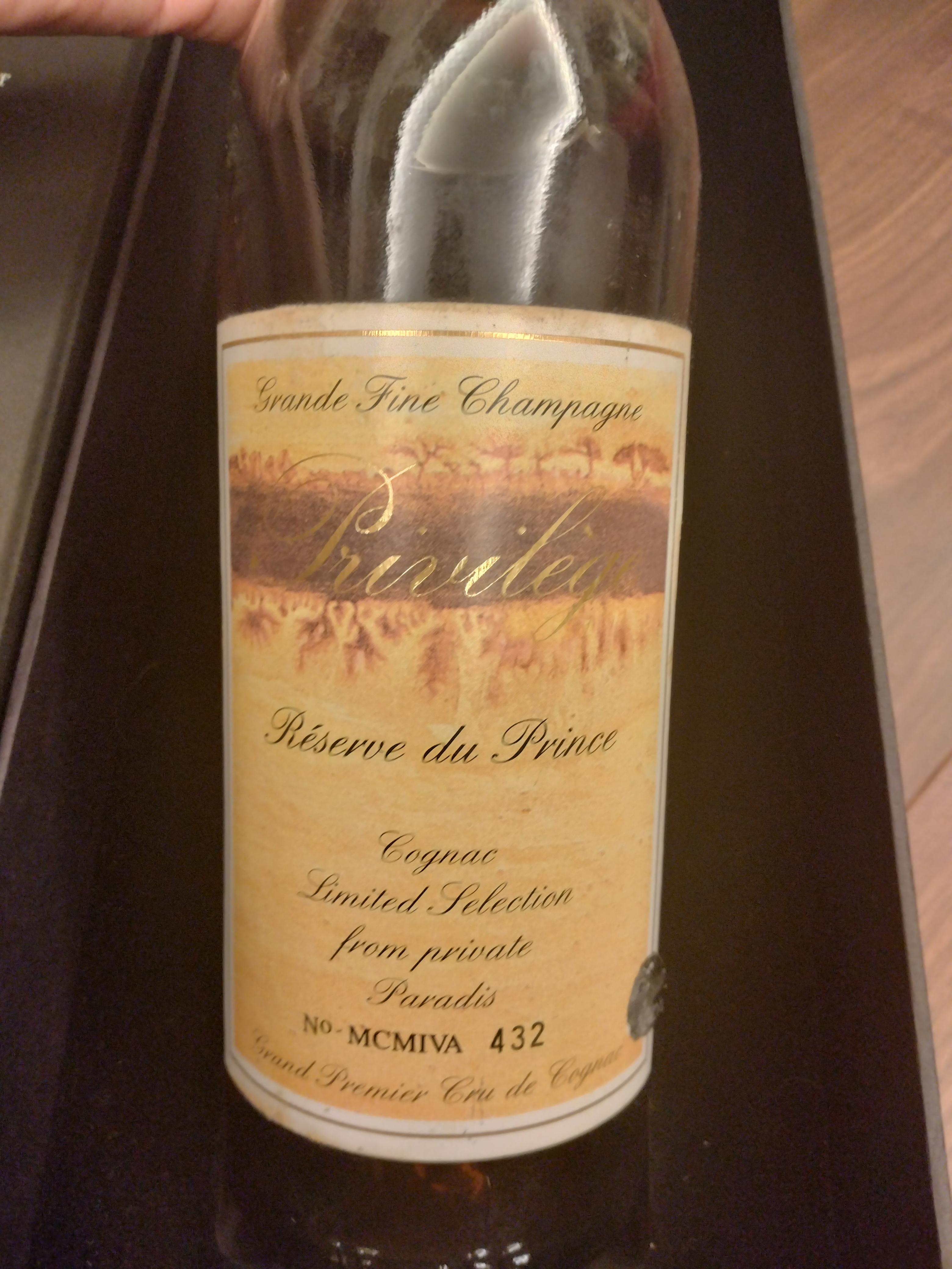- 1) Text on label: Front Label: Grande Fine Champagne Privilege Réserve du Prince Cognac Limited Selection from private Paradis NO- MCMIVA 432 Grand Premier Cru de Cognac Back Label: Privilege Réserve du Prince This magnificent Cognac, delicate and exquisitely textured, is the authentic product of grapes picked in Cognac's best district, Grande Champagne, as classified under the official May 1, 1909 decree. Distilled in pure copper alambics and allo- wed to age naturally in Limousin oak casks, Privilege "Réserve du Prince" stands unrivaled since its rare qualities reflect centuries of practice and infinite patience. It is recommended that you allow this Survivor of the Past to blossom in your glass such a unique expression of elegance will arouse both the nose and the palate. GOVERNMENT WARNING: (1) According to the Sur- general, women should not drink alcoholic beverages during pregnancy because of the risk of birth defects. (2) Consumption of alcoholic beverages impairs your ability to drive a car or operate machinery, and may cause health problems. Neck Label/Sticker: REGARDED BY THE MOST RESPECTED LICENSED APPRAISERS AS AN AUTHENTIC PRE-WORLD WAR I VINTAGE 2) Visual elements: Front Label: An abstract landscape or pattern in brown/gold tones forms a band across the upper label, with the word "Privilege" in a prominent gold decorative script overlaying it. The main label is light beige/cream with subtle vertical texture, framed by a thin gold line. Font styles include elegant cursive/script for descriptive terms, a decorative script for "Privilege", classic serif for "Cognac" and "MCMIVA", and sans-serif for "NO-" and the numbers. Back Label: The "Privilege" name is in a decorative script, and "Réserve du Prince" in elegant cursive. The descriptive text is in a classic serif font, while the "GOVERNMENT WARNING" is in bold sans-serif, followed by regular sans-serif text. Neck/Capsule: A dark-colored capsule covers the cork and upper neck, sealed with two circular, silver-toned medallions – one on the top and one on the side. A round, white sticker on the mid-neck features text in a sans-serif font, with "PRE-WORLD WAR I" highlighted in bold. Box: A large, ornate monogram-like graphic incorporates the "PRIVILEGE" name in decorative script, topped with a crown, and flanked by stylized foliage/scrollwork. A heraldic-like element with a cross/X pattern is present. Text on the box uses a decorative script for "PRIVILEGE" and "Le Cognac d'un Siècle", and a clean sans-serif for other text. 3) Fill level estimate: well above shoulder into neck: great Reason: The liquid is high in the bottle's neck, just below the capsule.