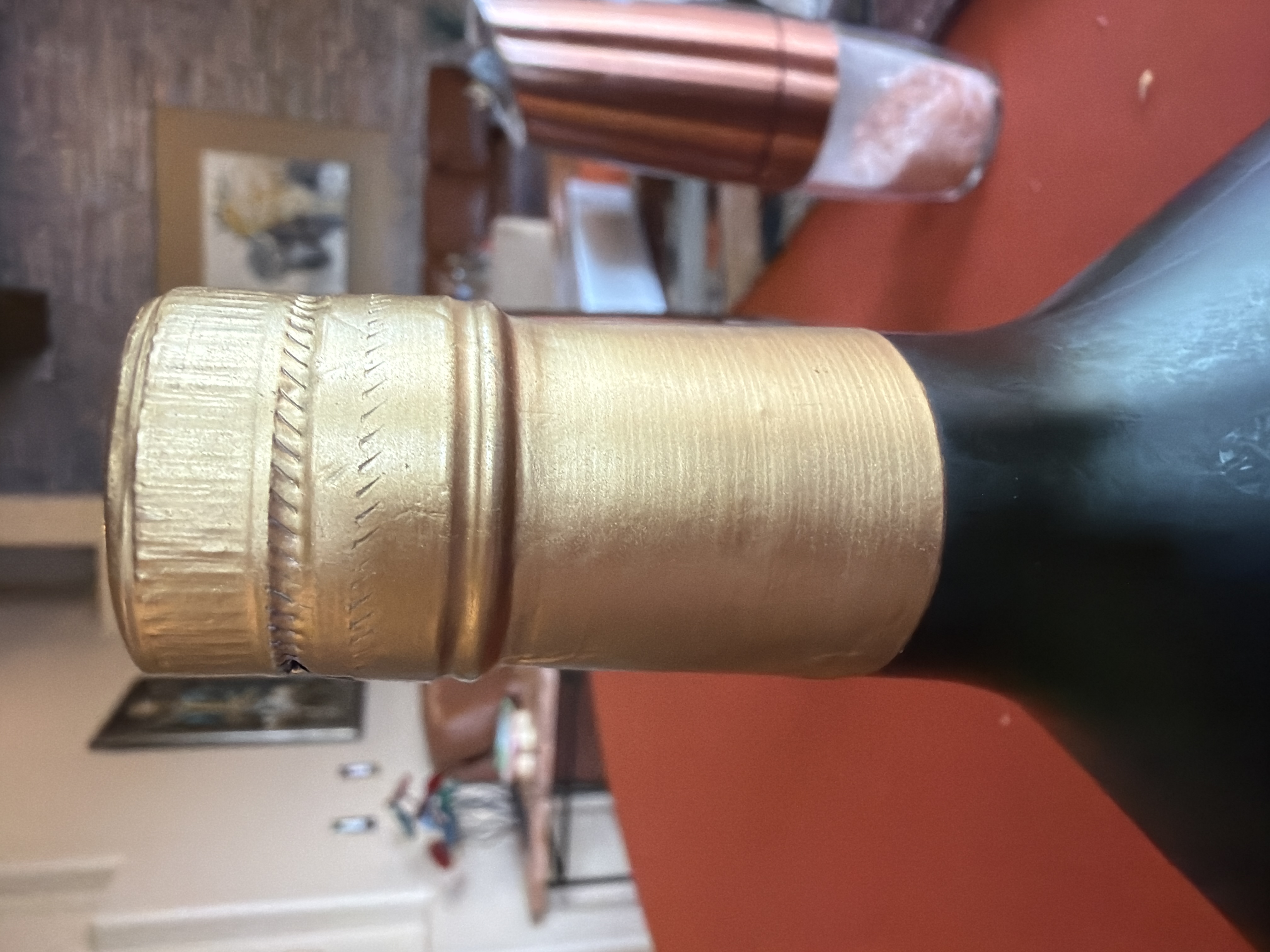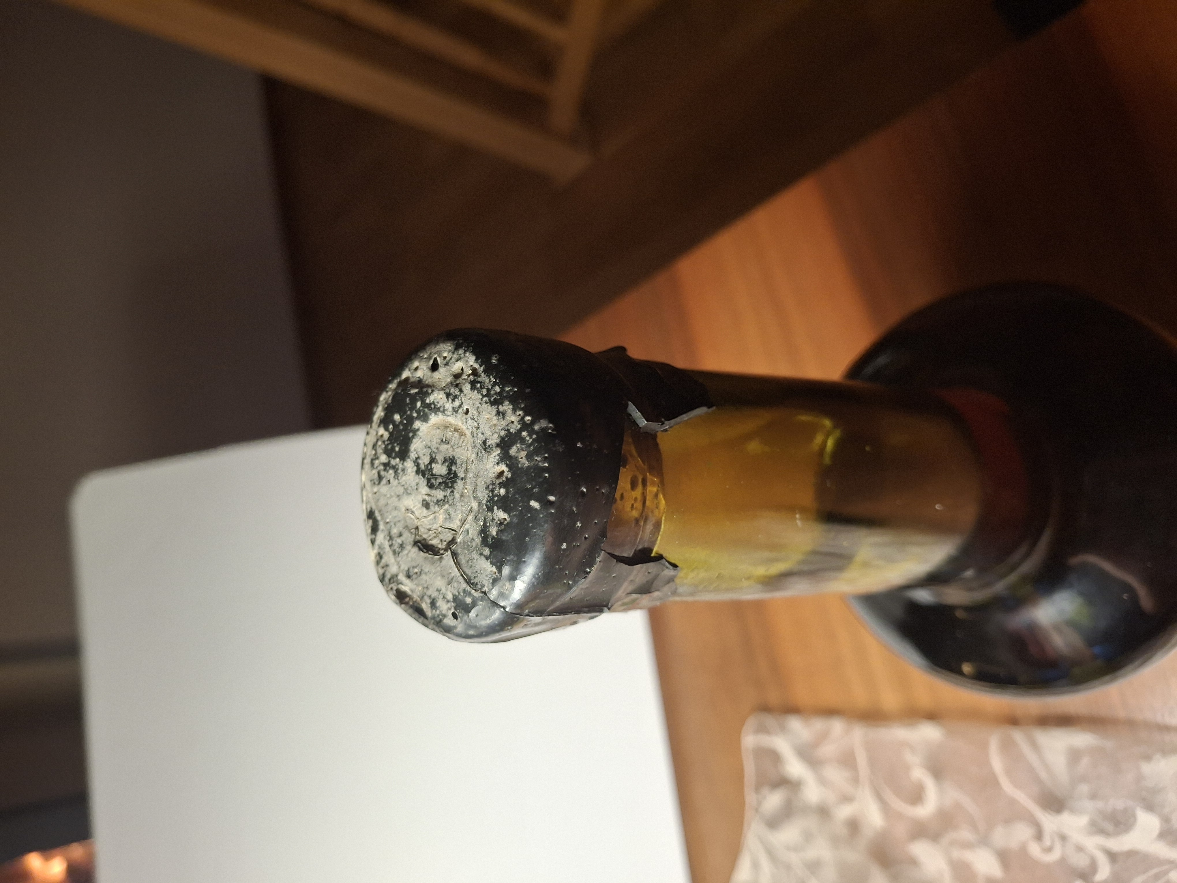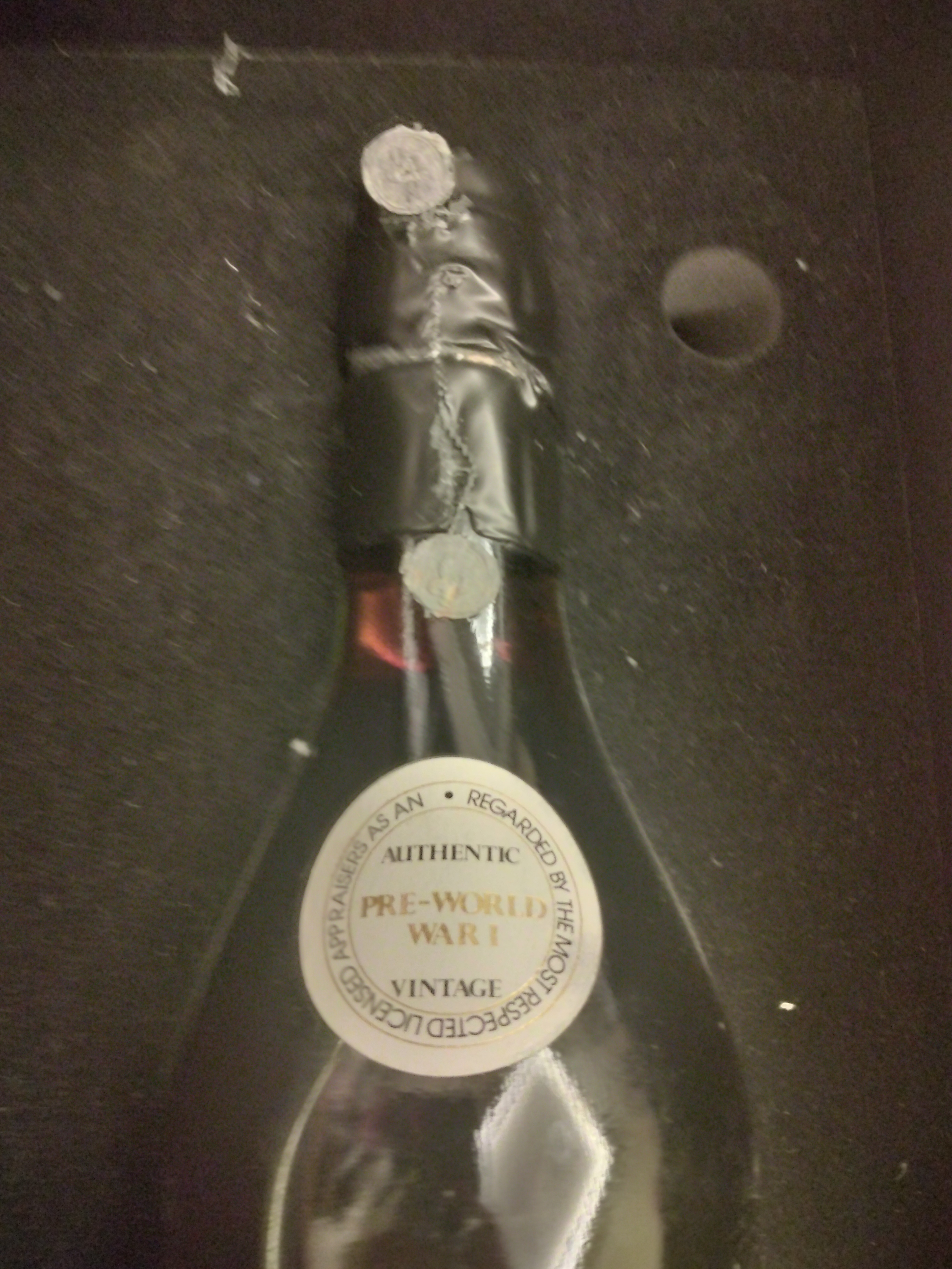 - 1) Text on label: Front Label: Grande Fine Champagne Privilege Réserve du Prince Cognac Limited Selection from private Paradis NO- MCMIVA 432 Grand Premier Cru de Cognac Back Label: Privilege Réserve du Prince This magnificent Cognac, delicate and exquisitely textured, is the authentic product of grapes picked in Cognac's best district, Grande Champagne, as classified under the official May 1, 1909 decree. Distilled in pure copper alambics and allo- wed to age naturally in Limousin oak casks, Privilege "Réserve du Prince" stands unrivaled since its rare qualities reflect centuries of practice and infinite patience. It is recommended that you allow this Survivor of the Past to blossom in your glass such a unique expression of elegance will arouse both the nose and the palate. GOVERNMENT WARNING: (1) According to the Sur- general, women should not drink alcoholic beverages during pregnancy because of the risk of birth defects. (2) Consumption of alcoholic beverages impairs your ability to drive a car or operate machinery, and may cause health problems. Neck Label/Sticker: REGARDED BY THE MOST RESPECTED LICENSED APPRAISERS AS AN AUTHENTIC PRE-WORLD WAR I VINTAGE 2) Visual elements: Front Label: An abstract landscape or pattern in brown/gold tones forms a band across the upper label, with the word "Privilege" in a prominent gold decorative script overlaying it. The main label is light beige/cream with subtle vertical texture, framed by a thin gold line. Font styles include elegant cursive/script for descriptive terms, a decorative script for "Privilege", classic serif for "Cognac" and "MCMIVA", and sans-serif for "NO-" and the numbers. Back Label: The "Privilege" name is in a decorative script, and "Réserve du Prince" in elegant cursive. The descriptive text is in a classic serif font, while the "GOVERNMENT WARNING" is in bold sans-serif, followed by regular sans-serif text. Neck/Capsule: A dark-colored capsule covers the cork and upper neck, sealed with two circular, silver-toned medallions – one on the top and one on the side. A round, white sticker on the mid-neck features text in a sans-serif font, with "PRE-WORLD WAR I" highlighted in bold. Box: A large, ornate monogram-like graphic incorporates the "PRIVILEGE" name in decorative script, topped with a crown, and flanked by stylized foliage/scrollwork. A heraldic-like element with a cross/X pattern is present. Text on the box uses a decorative script for "PRIVILEGE" and "Le Cognac d'un Siècle", and a clean sans-serif for other text. 3) Fill level estimate: well above shoulder into neck: great Reason: The liquid is high in the bottle's neck, just below the capsule.