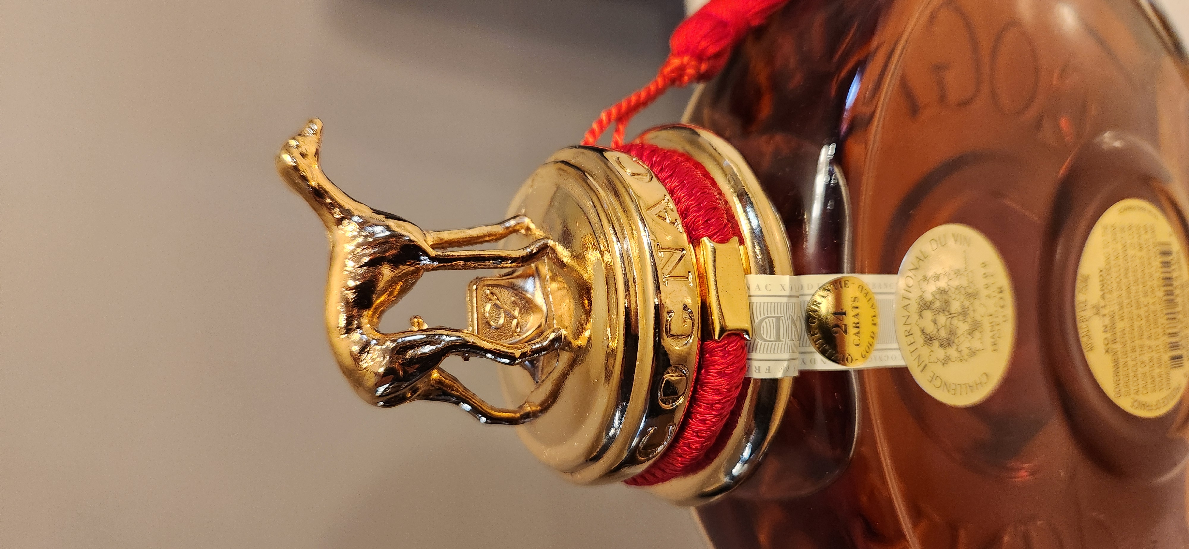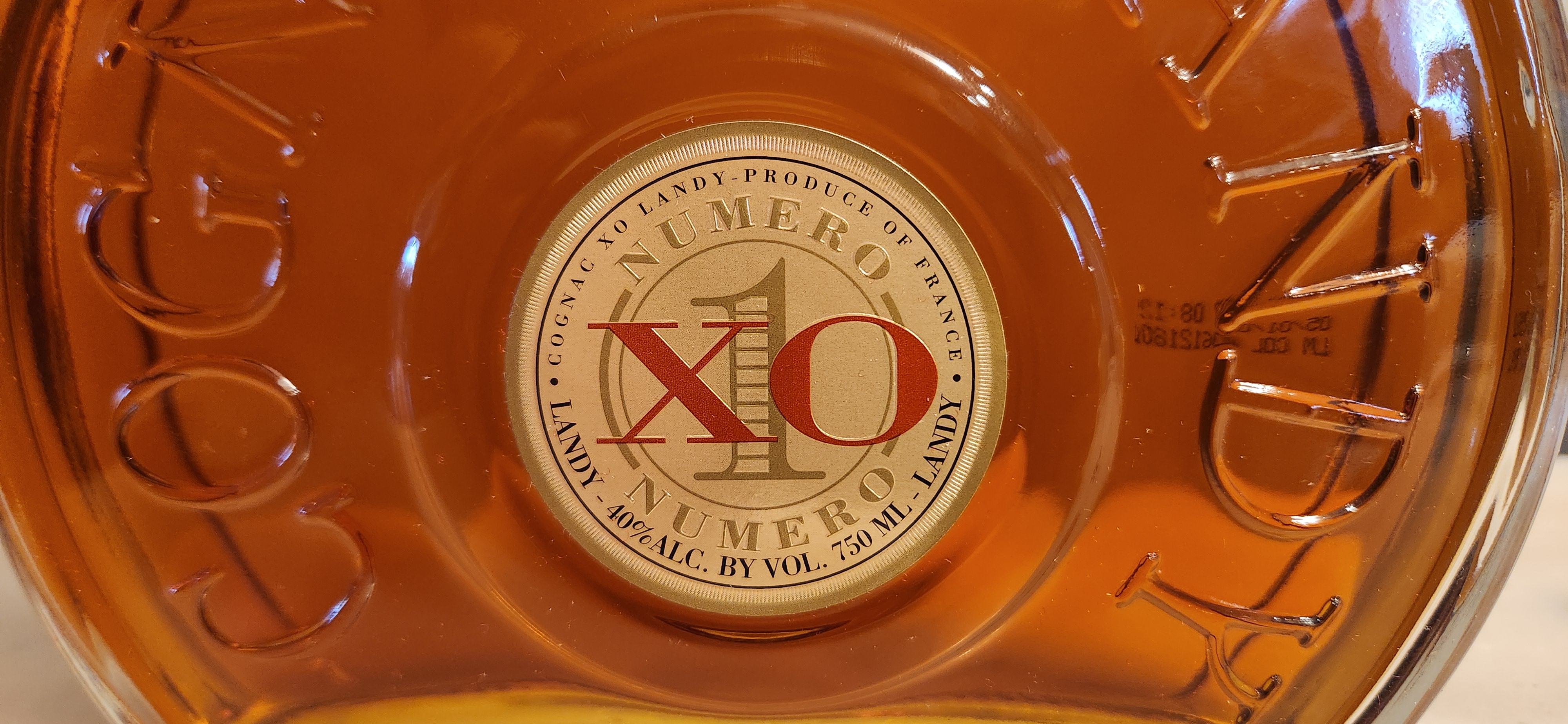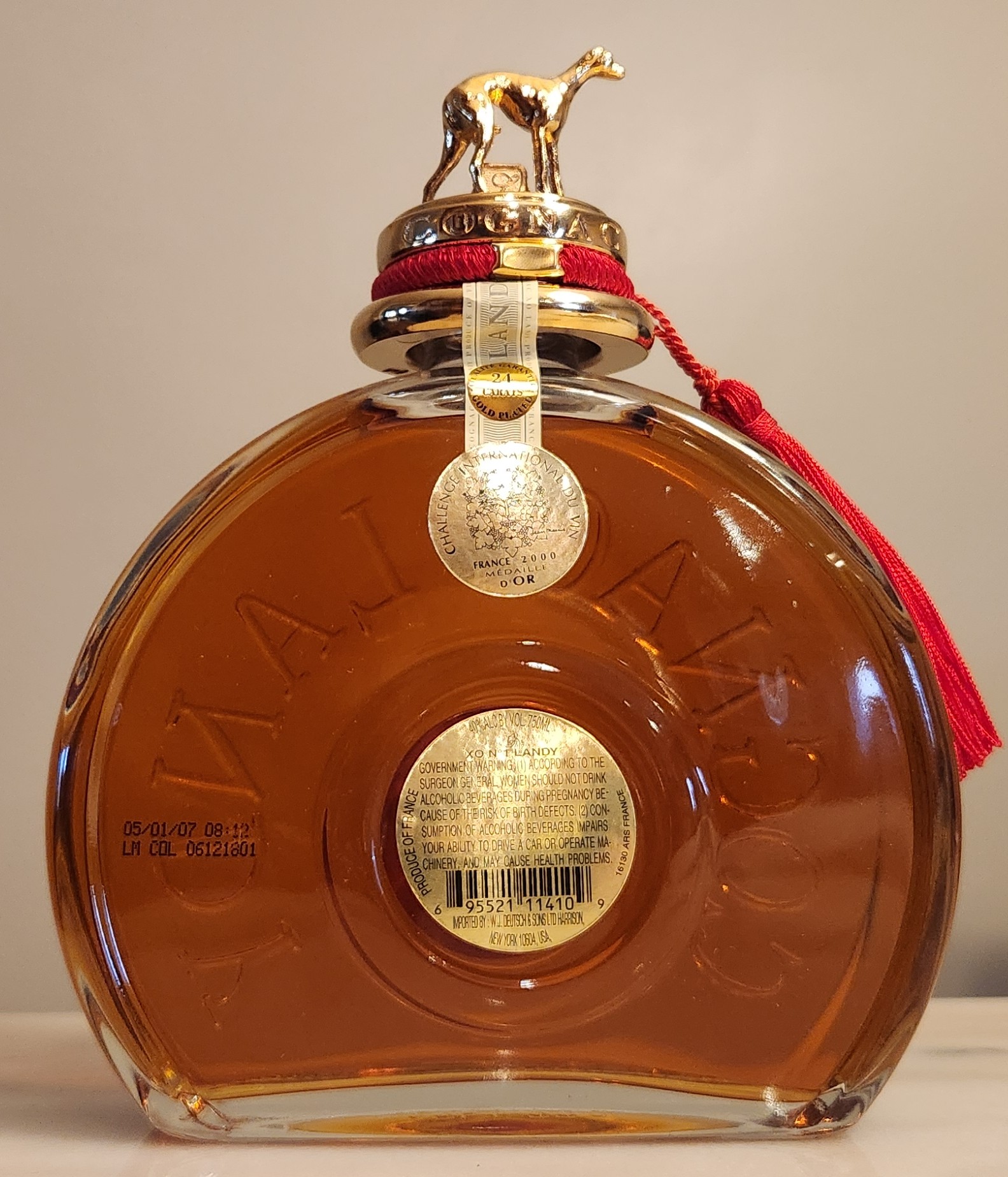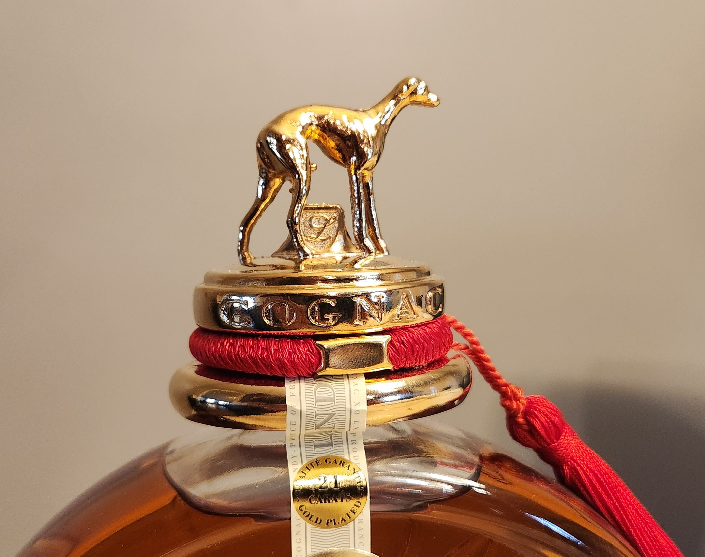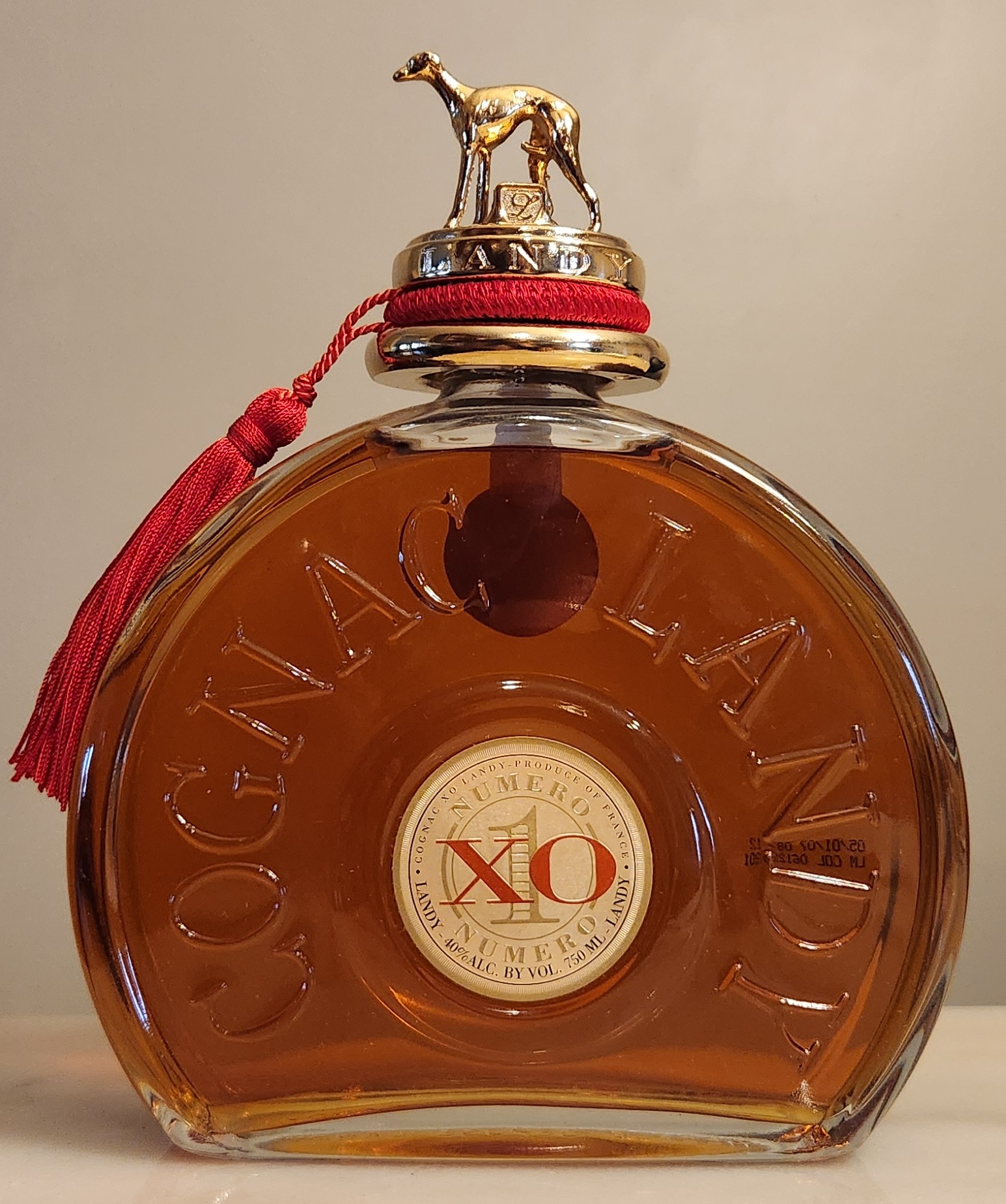 - 1) Text on label: Bottle - Front Circular Label: COGNAC XO LANDY-PRODUCE OF FRANCE NUMERO X O Nº1 LANDY - 40% ALC. BY VOL. 750 ML. LANDY Bottle - Embossed on Glass (Front): COGNAC LANDY Bottle - Neck Strip Label (Gold): APPELLATION D'ORIGINE CONTROLÉE CHALLENGE INTERNATIONAL DU VIN FRANCE 2000 MÉDAILLE D'OR LA GARANTIE OR 24 CARATS GOLD PLATED COGNAC XO LANDY PRODUCE OF FRANCE (repeating small text) 210 16150 ARS FRANCE Bottle - Stopper (Embossed): COGNAC LANDY Bottle - Back Label: LANDY COGNAC XO LANDY PRODUCE OF FRANCE GOVERNMENT WARNING: (1) ACCORDING TO THE SURGEON GENERAL, WOMEN SHOULD NOT DRINK ALCOHOLIC BEVERAGES DURING PREGNANCY BECAUSE OF THE RISK OF BIRTH DEFECTS. (2) CONSUMPTION OF ALCOHOLIC BEVERAGES IMPAIRS YOUR ABILITY TO DRIVE A CAR OR OPERATE MA- CHINERY, AND MAY CAUSE HEALTH PROBLEMS. PRODUCE OF FRANCE 6 95521 11410 9 IMPORTED BY M.H. BOTTLING & DISTRIBUTING CO., HARRISON, NEW YORK 10528, U.S.A. Bottle - Back Sticker: 05/01/07 08:12 LM COL 06121301 Box - Front: COGNAC LANDY (above greyhound logo) LANDY COGNAC X O Nº1 PRODUCT OF FRANCE - 16150 ARS FRANCE Box - Bottom: TOUS PAYS ALL COUNTRIES 70 cl 40% Vol. Domestic market U.S.A.: 750 ml - 40 % alc./vol. ETUIS COGNAC GROUPE HJM TRG PACKAGING 3 460410 506603 6 9552111410 9 24-06 2) Visual elements: Stopper: A gold-colored sculpture of a greyhound dog stands atop the golden stopper. The stopper itself features "COGNAC LANDY" embossed around its edge (block serif font). Neck/Capsule: A prominent red braided cord/tassel is tied around the neck below the stopper. A narrow, gold foil strip label wraps around the neck, displaying a gold medal graphic and text mentioning "24 CARATS GOLD PLATED". Front Mid Label: A circular cream/gold label is centered on the bottle, featuring a large, bold red "XO" and a smaller red "Nº1" beneath "NUMERO". The text on the outer ring is sans-serif. Bottle Embossing: The words "COGNAC LANDY" are deeply embossed into the glass on the front of the bottle, surrounding the central circular label, in a strong serif font. Back Label: A standard rectangular white label with black text and a barcode. Box Front: Features a gold silhouette of a greyhound logo on a crest at the top. Large, decorative gold serif "XO" with a red decorative "Nº1". The background is a textured, metallic golden-brown. Box Bottom: Contains small corporate logos for "ETUIS COGNAC GROUPE HJM" and "TRG PACKAGING". Font Styles: The main brand name "LANDY" (on bottle and box) uses an elegant serif font (similar to Trajan). "COGNAC" often appears in a block serif. The large "XO" is a bold, decorative serif. "NUMERO" and most smaller informational texts are in a clear sans-serif. 3) Fill level estimate: well above shoulder into neck: great