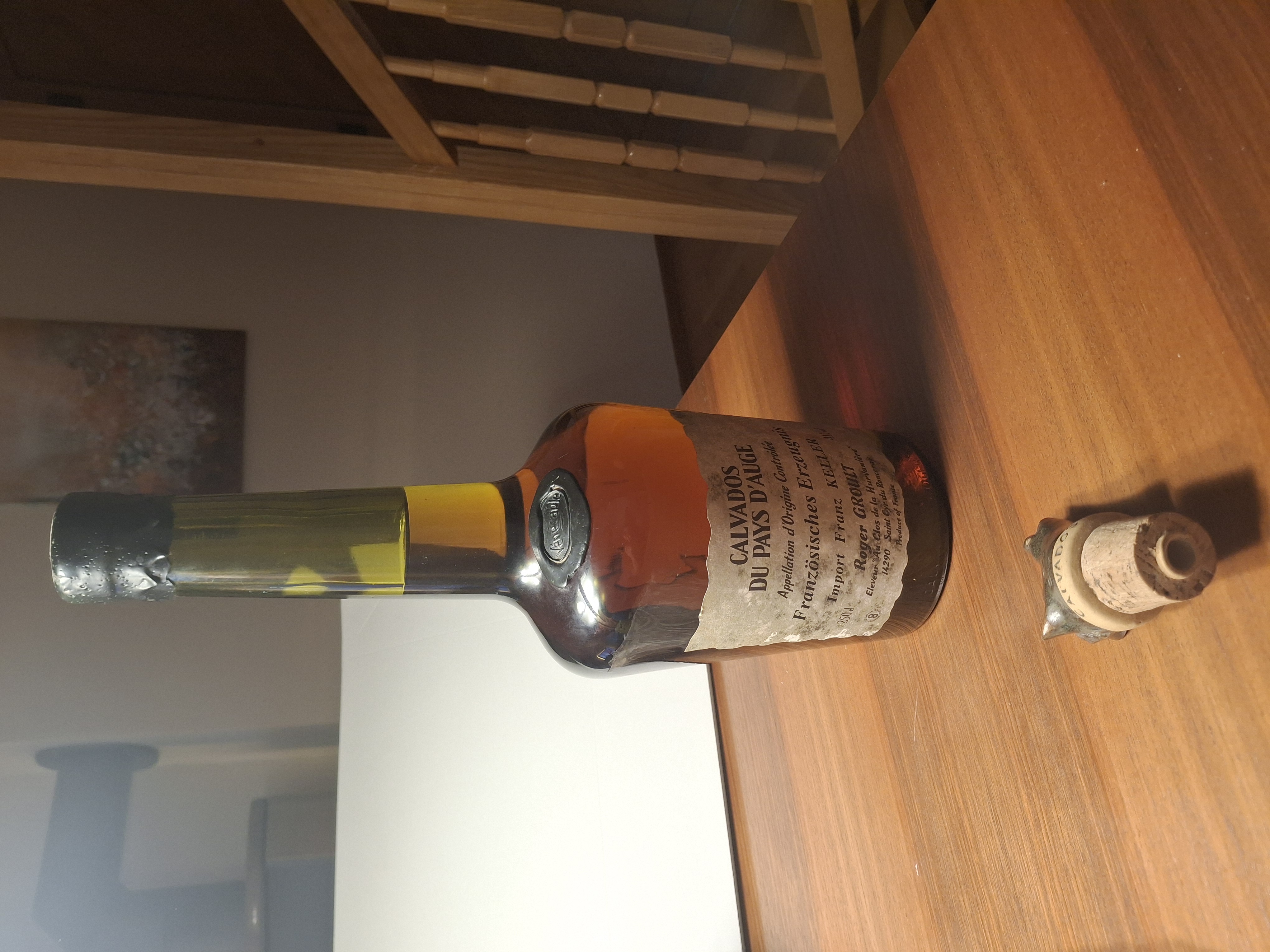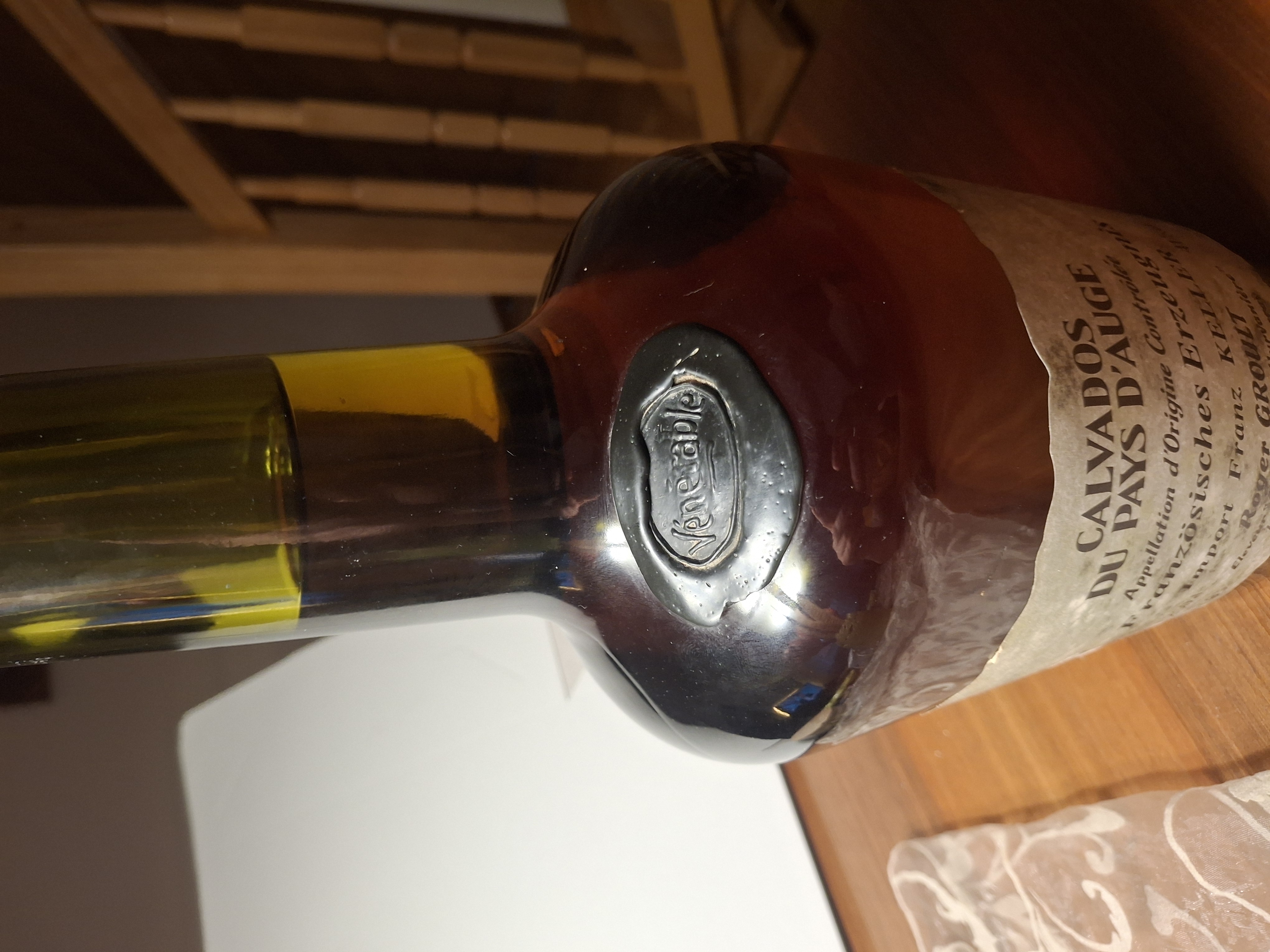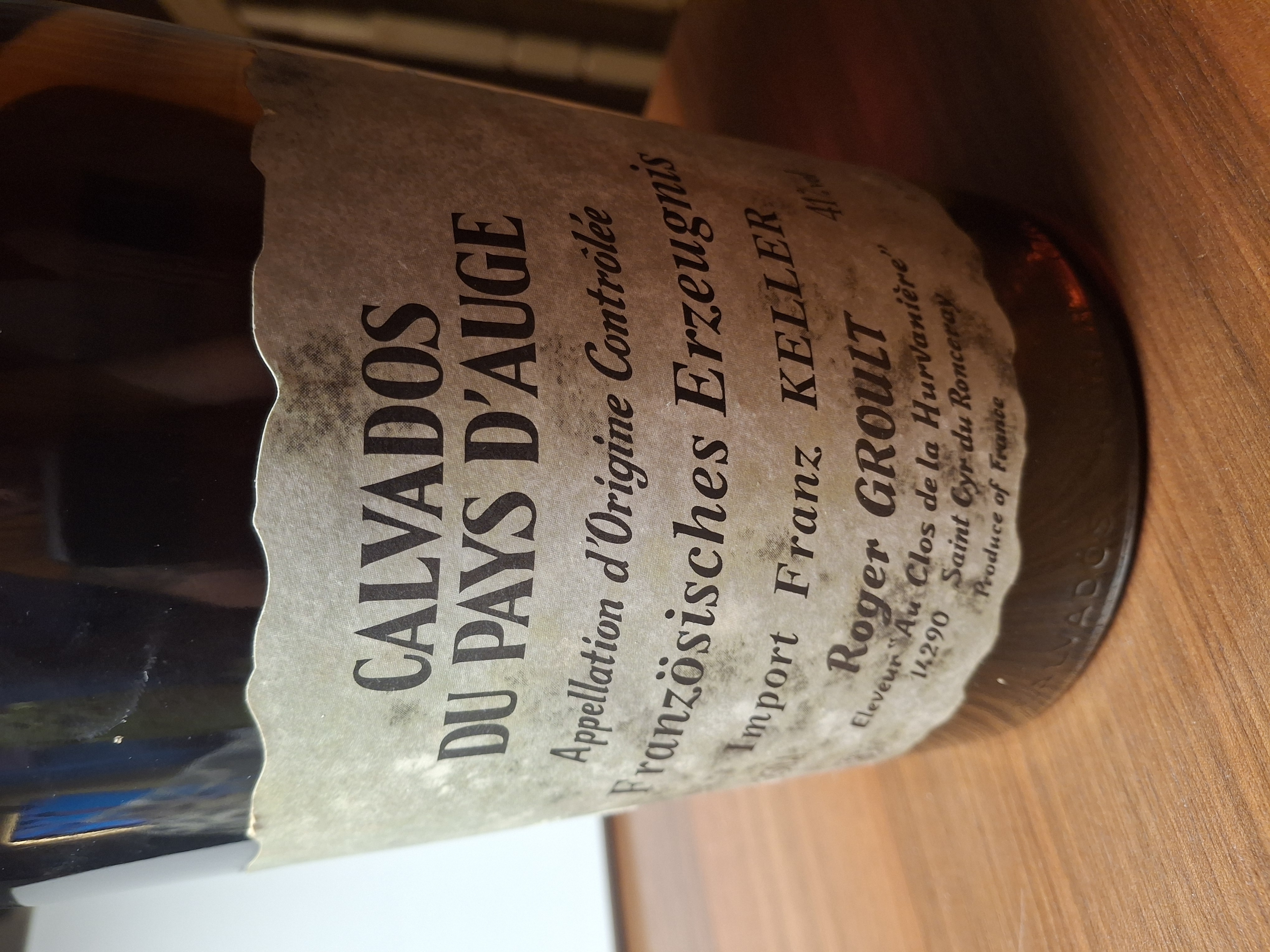 - 1) Text on label: CALVADOS DU PAYS D'AUGE Appellation d'Origine Contrôlée Französisches Erzeugnis Import Franz KELLER Roger GROULT Éleveur "Au Clos de la Hurvanière" 14290 Saint Cyr-du-Roncera Produit de France 41% vol L.1.4.2.92 2) Visual elements: Neck/Capsule: A dark (likely black) capsule covers the top of the cork, showing signs of age and possibly mold/dust. A yellow strip label is present around the upper neck below the capsule. Shoulder: A black wax seal or embossed stamp is present on the bottle's shoulder, featuring the word "Veritable" in a cursive/script font. Mid label: The main label is light-colored with irregular, aged edges. Font styles: "CALVADOS DU PAYS D'AUGE" is in a large, bold serif font. Other main text on the label (e.g., "Appellation d'Origine Contrôlée", names) uses smaller serif fonts. Volume and lot number use a simple sans-serif or block font. The wax seal displays a cursive/script font. 3) Fill level estimate: well above shoulder into neck: great