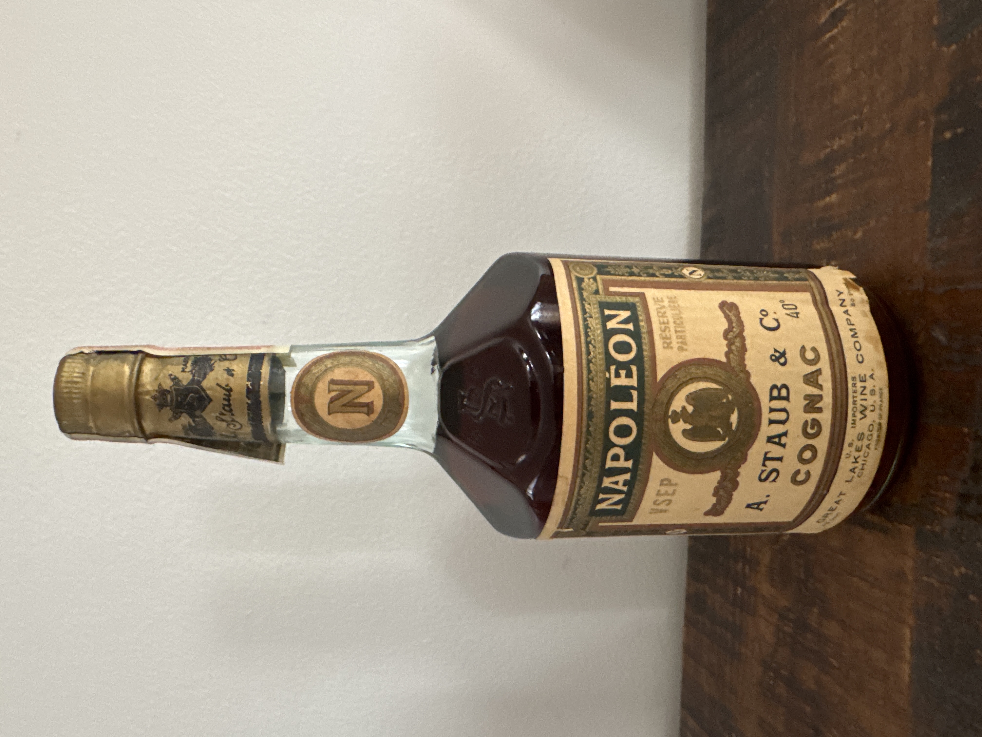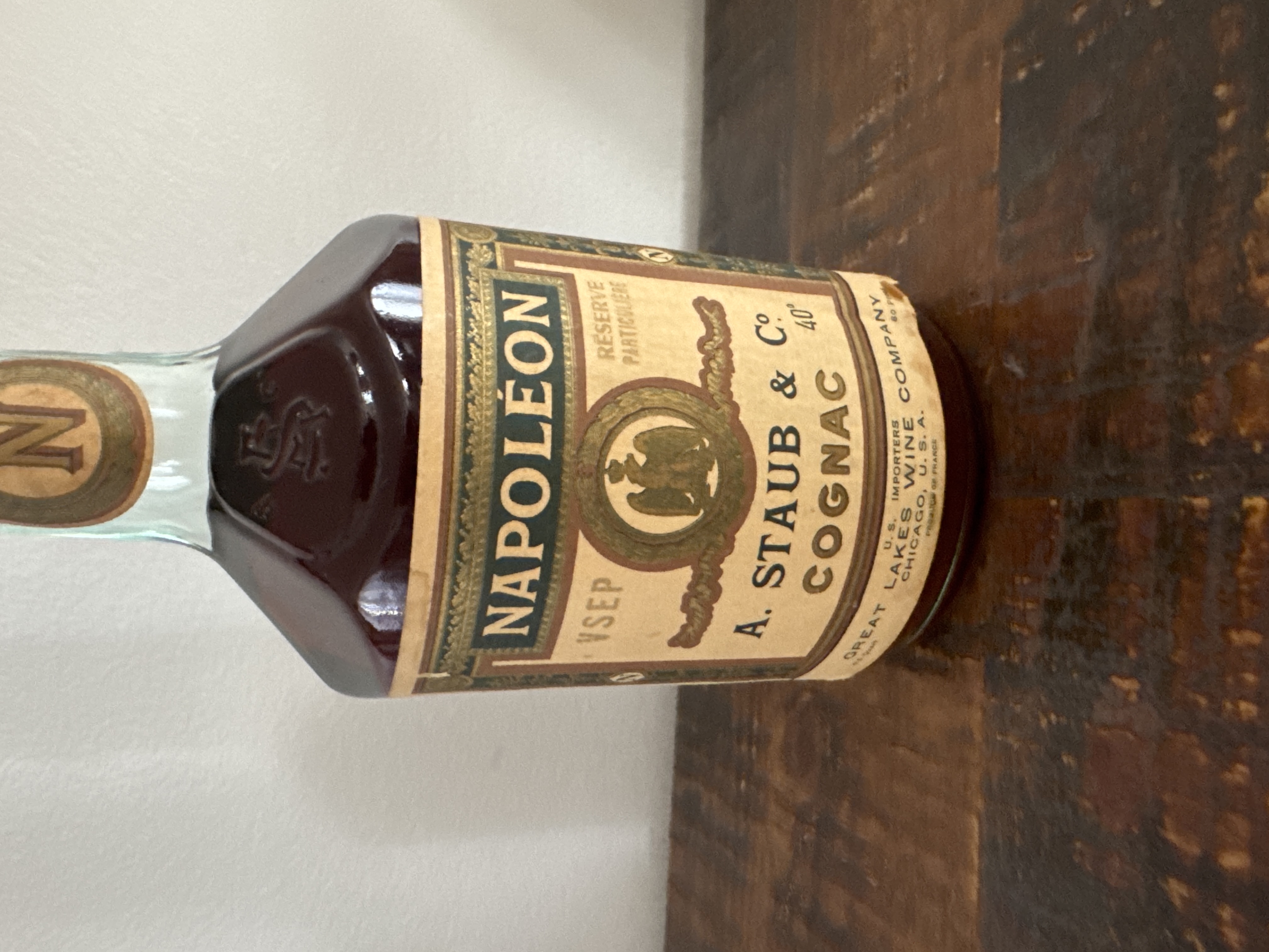 - 1) Text on label: Main Front Label: NAPOLEON RÉSERVE PARTICULIÈRE V.S.E.P. 40º A. STAUB & Co COGNAC U. S. IMPORTERS GREAT LAKES WINE COMPANY CHICAGO, ILL. MADE IN FRANCE Neck Label (circular): N Neck Band Label: A. STAUB & Co. COGNAC TRADE MARK Red Tax Strip (partially legible): BOTTLE 394306321 (repeating patterns/text too obscured to read fully) Embossed on Glass (side/back): LIQUOR BOTTLE 394 (faint) 2) Visual elements: Upper label: A prominent "N" monogram in a gold-edged circular frame appears on the neck label. Neck/capsule: A gold-colored, ribbed foil capsule covers the cork. A decorative neck band label featuring a figure on horseback (likely Napoleon) wraps around the capsule. A red and white patterned tax strip is partially visible over the capsule and neck. Mid label: A large, stylized eagle emblem with spread wings is centered above "A. STAUB & Co COGNAC". Bottle body: The bottle features a distinctive faceted or octagonal shape. Font styles: "NAPOLEON" is in a bold, block sans-serif. "RÉSERVE PARTICULIÈRE" and smaller texts are in sans-serif. "A. STAUB & Co COGNAC" uses a classic serif font. The "N" monogram on the neck label is a decorative sans-serif. Embossed text on the glass is block sans-serif. 3) Fill level estimate: well above shoulder into neck: great