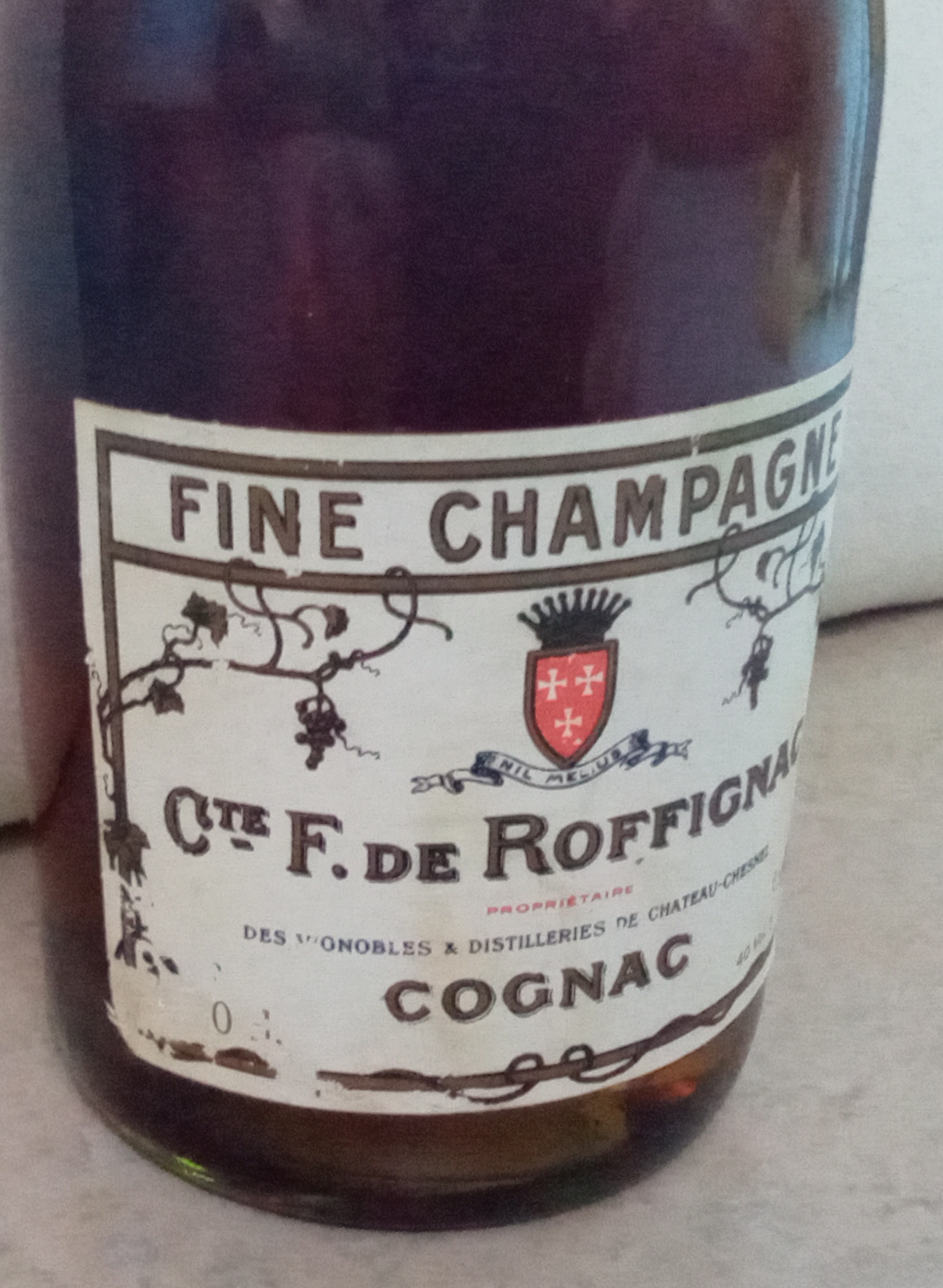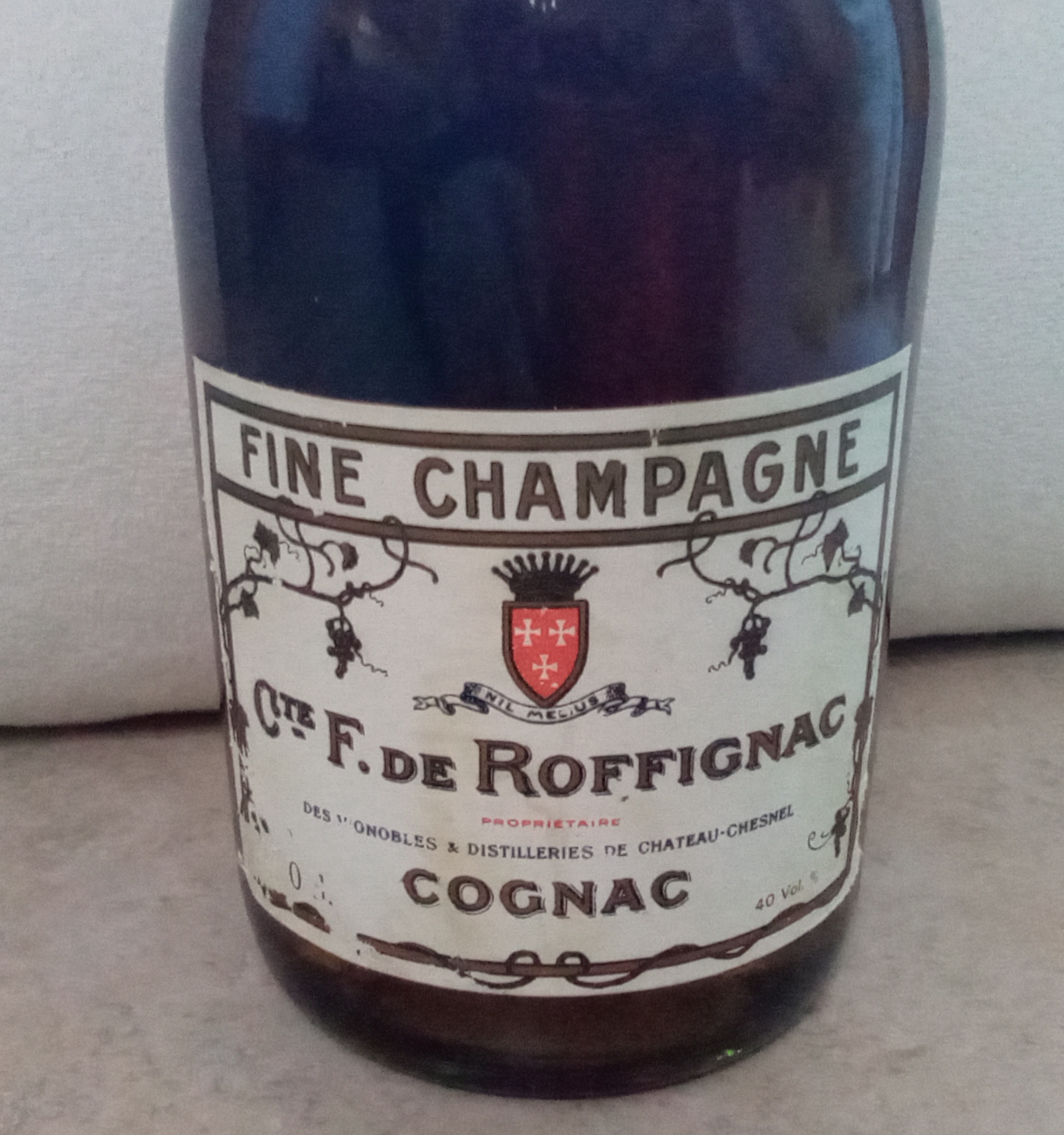 - 1) Text on label: FINE CHAMPAGNE CTE F. DE ROFFIGNAC PROPRIÉTAIRE DES VIGNOBLES & DISTILLERIES DE CHATEAU-CHESNEL COGNAC 0. 40 Vol. % (On capsule top): COGNAC ROFFIGNAC 2) Visual elements: Neck capsule: A dark blue band featuring a repeating pattern of a crowned shield with three crosses/fleur-de-lis, framed by laurel wreaths. Bottle cap: A circular black cap with a central crowned shield emblem (identical to the one on the neck capsule). The words "COGNAC" and "ROFFIGNAC" are curved around this emblem in a cream/gold color. Main label: An off-white label with an ornate border featuring vine branches, leaves, and grapes, forming a decorative frame. In the center, there is a prominent crowned shield emblem (similar to others) with three crosses and a banner below it reading "NIL MELIUS". Font style(s): "FINE CHAMPAGNE" and "COGNAC" (on main label): Bold serif, all caps. "CTE F. DE ROFFIGNAC": Large, decorative serif. "PROPRIÉTAIRE" and "DES VIGNOBLES & DISTILLERIES DE CHATEAU-CHESNEL": Small sans-serif. "NIL MELIUS": Small sans-serif on a banner. "COGNAC" and "ROFFIGNAC" (on cap): Bold sans-serif. 3) Fill level estimate: well above shoulder into neck: great