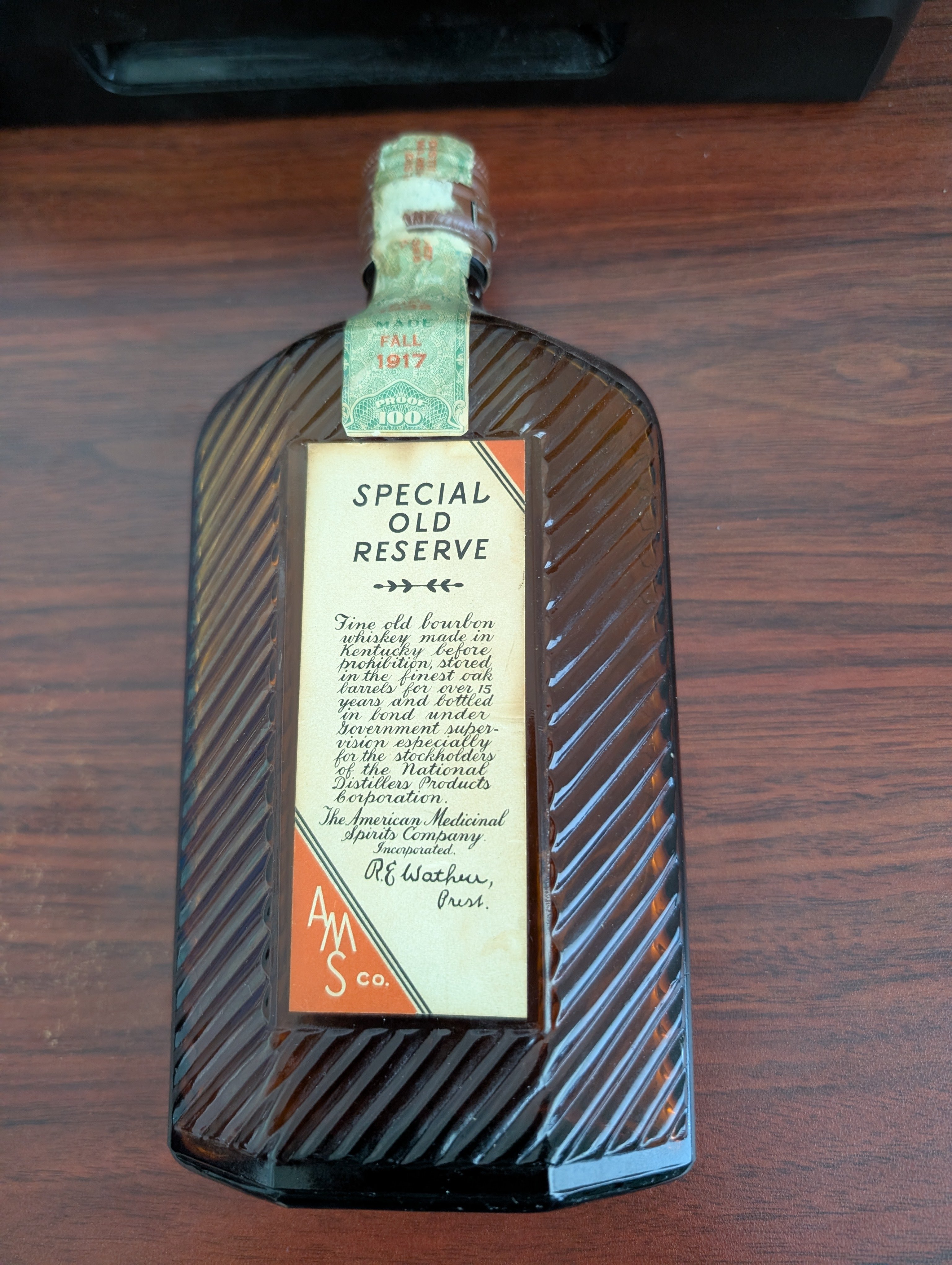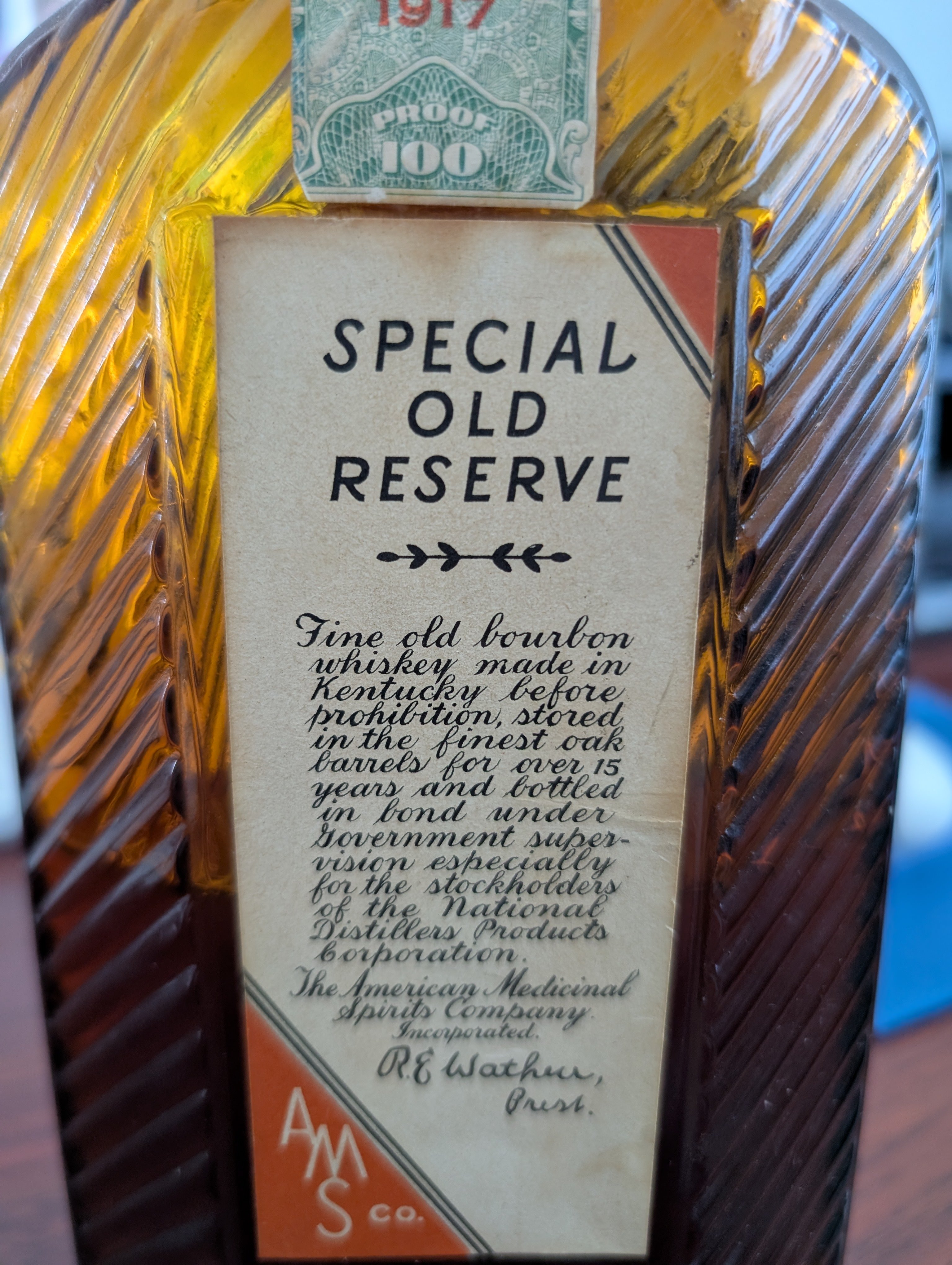 - Special Old Reserve Fine old bourbon whiskey made in Kentucky before prohibition and stored in the finest oak barrels for over 15 years and bottled in bond under Government supervision especially for the stockholders of the National Distillers Products corporation. The American Medicinal Spirits Company Incorporated RE Wathers, Pres.
