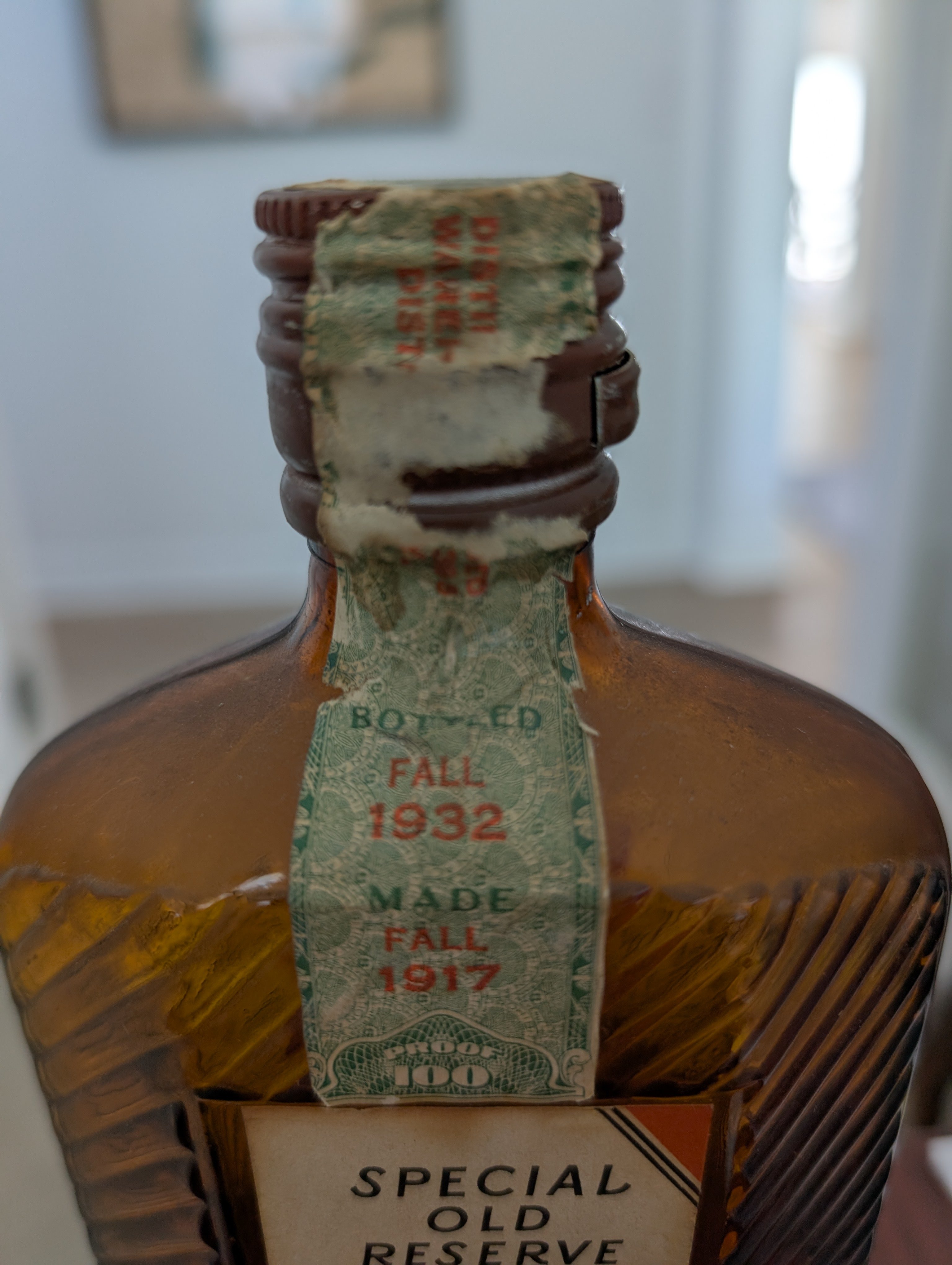 - This bottle of Old Special Reserve was my grandparents, the label states it was made before prohibition in 1917 and bottled in 1932. My grandparents consumed part of it. Because of its age, the screw on lid and sealed itself. I have not opened it.