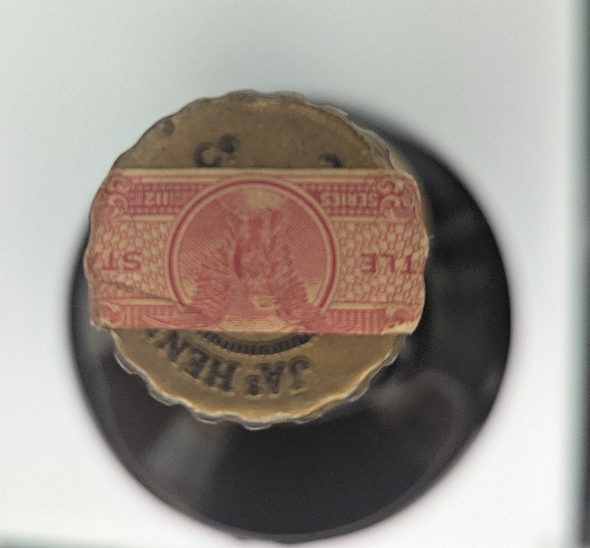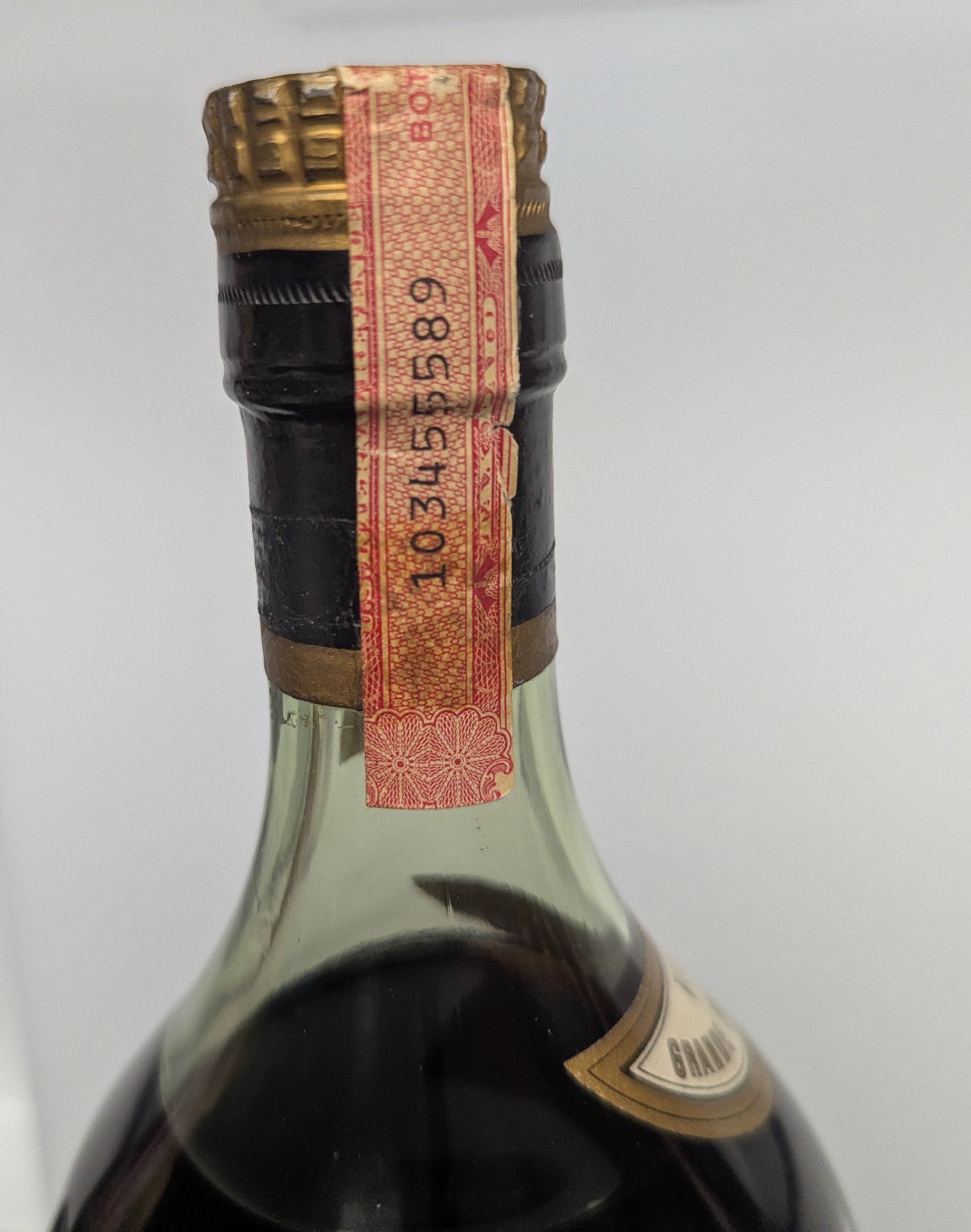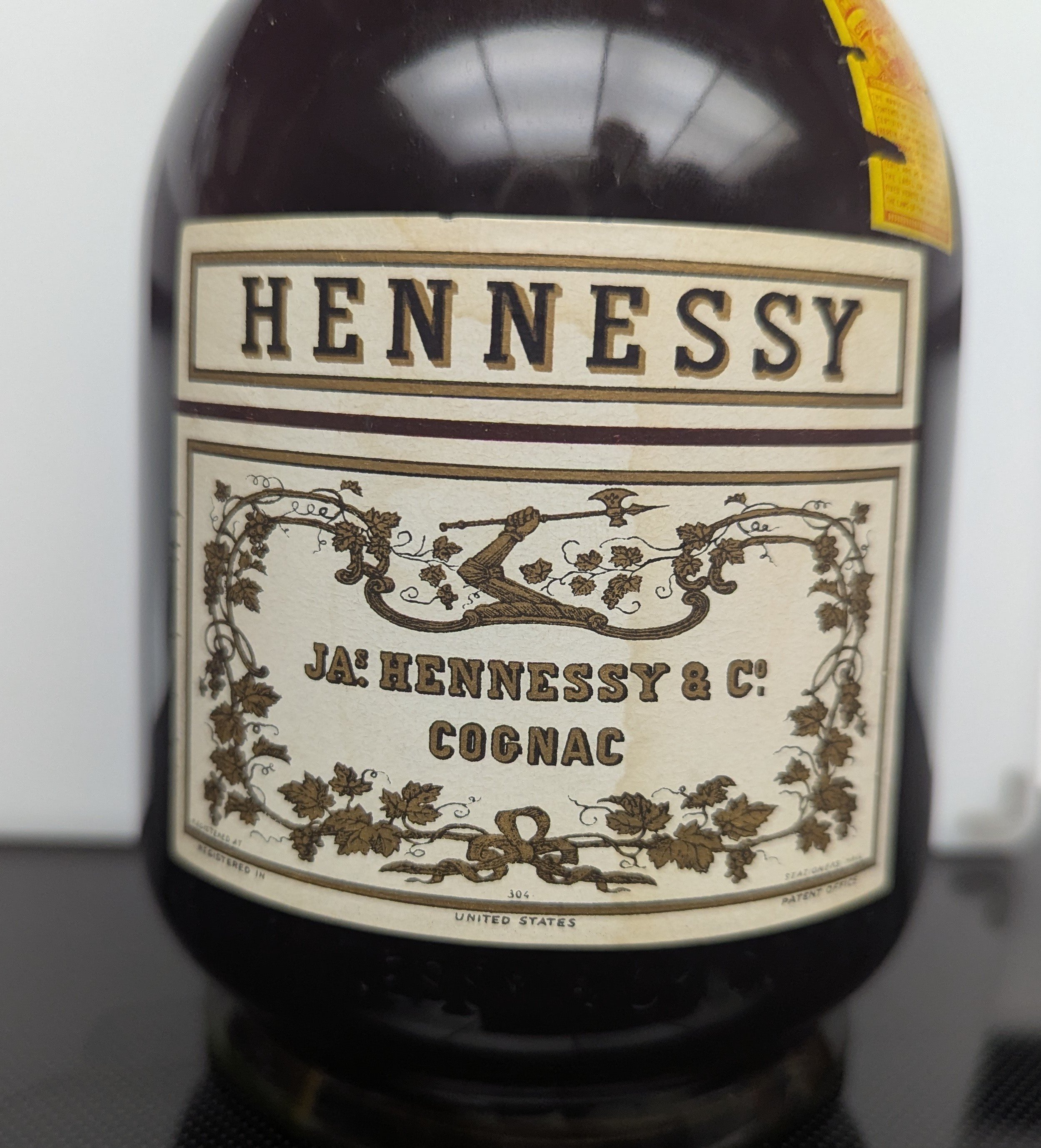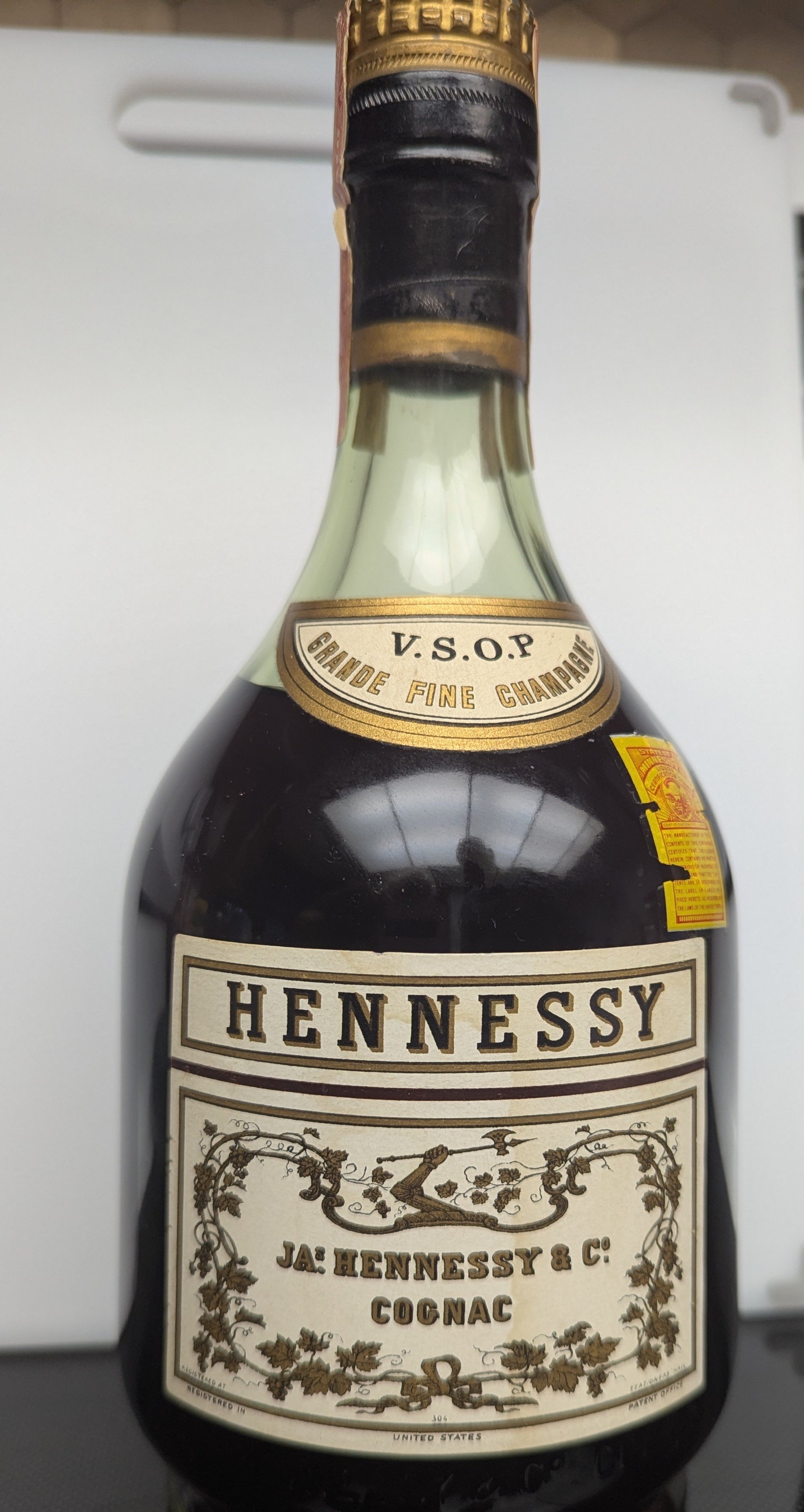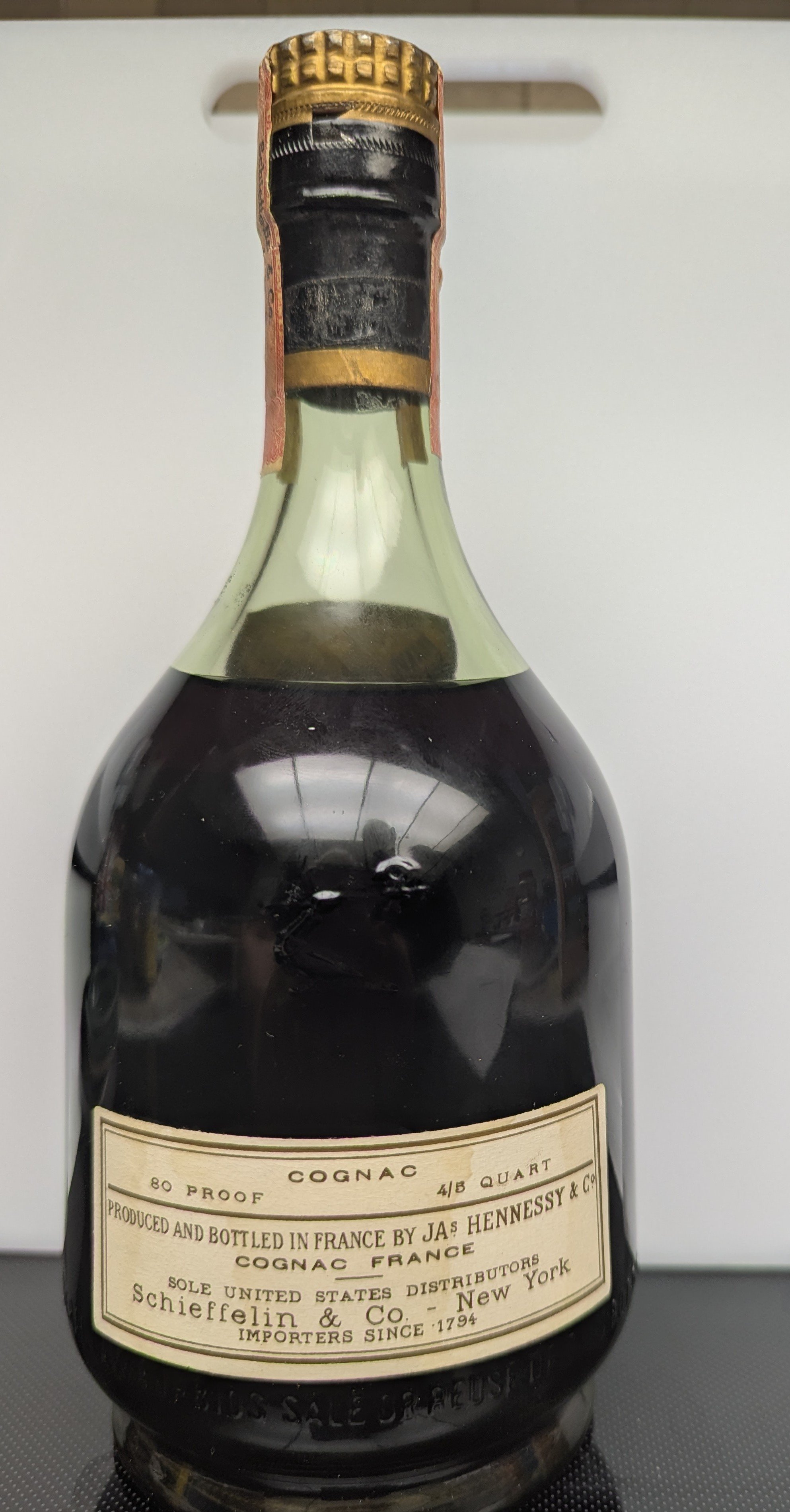 - FRONT OF THE BOTTLE: v.s.o.p. grande fine champagne Hennessy JA. HENNESSY & C! (i think it is an & symbol) COGNAC also on the front of the bottle has a Yellow Stamp with Red printing saying - State of Minnesota liquor certification stamp also very tinny printing: registered at 304 stat/onfas hall or mall (hard for my eyes to fully see) Registered in UNITED STATES PATENT OFFICE BACK OF THE BOTTLE: COGNAC 80 PROOF 45 QUART PRODUCED AND BOTTLE IN FRANCE BY JA (looks like an S with a period underneath it) HENNESSY & C (looks like an O with a period underneath it) COGNAC FRANCE SOLE UNITED STATES DISTRIBUTORS Schieffelin & Co. - New York Importers since 1794 The bottle appears to be a light green color