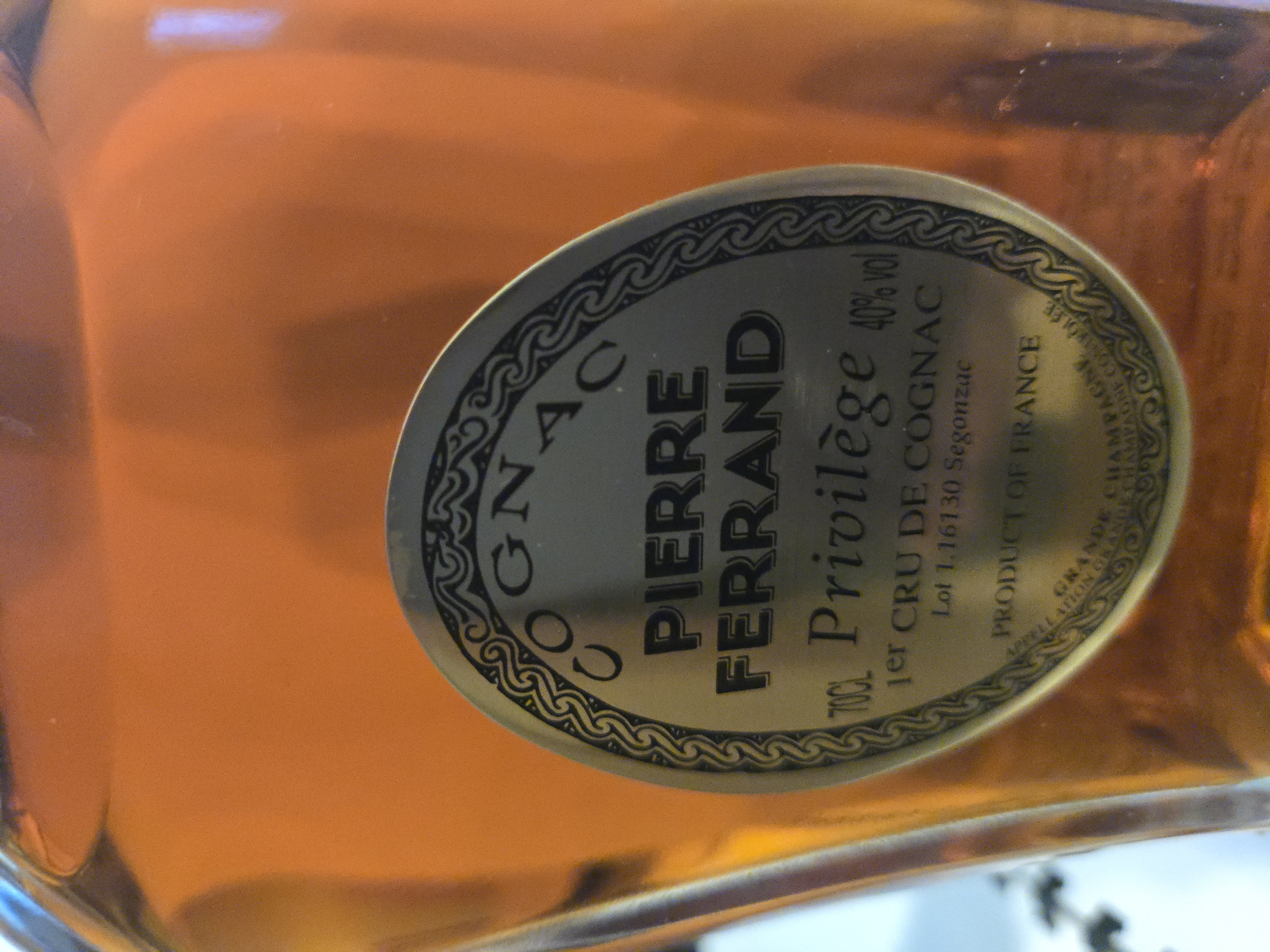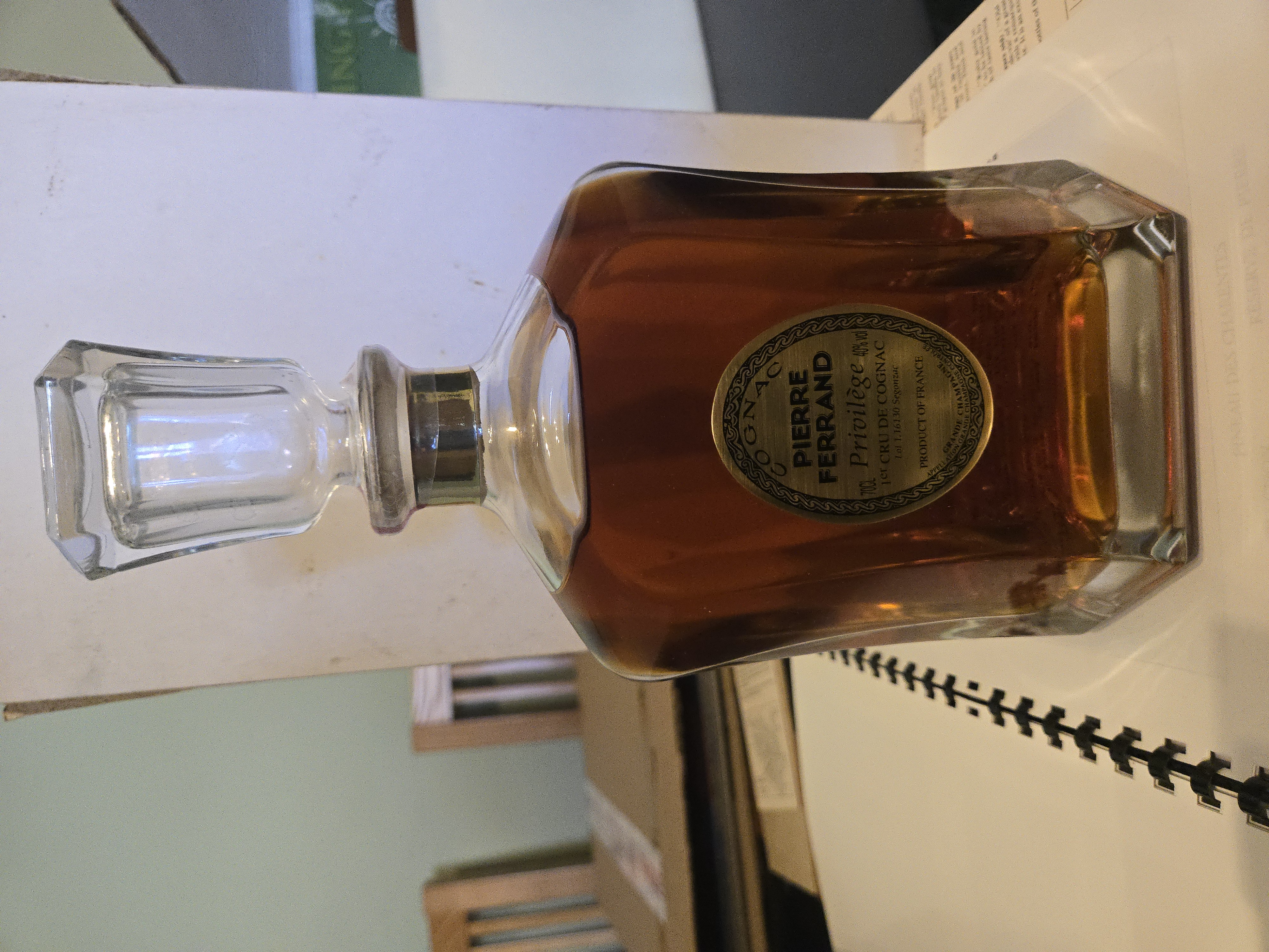- 1) Text on label: COGNAC PIERRE FERRAND 70CL Privilège 40% Vol 1er CRU DE COGNAC Lot 1-16130 Segonzac PRODUCT OF FRANCE APPELLATION GRANDE CHAMPAGNE CONTRÔLÉE 2) Visual elements: The main label (mid label) is oval-shaped with a metallic gold/bronze appearance and features an ornate, possibly vine-like or chain-link border. The decanter is clear glass with a faceted, octagonal base and a broad, curved shoulder, topped with a distinctive faceted glass stopper. A gold-colored band wraps around the neck just below the stopper, and a red-striped security seal is partially visible at the base of the stopper (near the neck). The presentation box (visible in IMG_20240409_163717.jpg) is dark blue with the same label design embossed in gold on its lid, and a crumpled blue satin lining inside. Font styles include: a curved sans-serif/block style for "COGNAC" and "APPELLATION GRANDE CHAMPAGNE CONTRÔLÉE"; bold serif for "PIERRE FERRAND"; a decorative script/cursive for "Privilège"; and various sans-serif styles for other text like "70CL", "40% Vol", "1er CRU DE COGNAC", "Lot 1-16130 Segonzac", and "PRODUCT OF FRANCE". 3) Fill level estimate: well above shoulder into neck: great