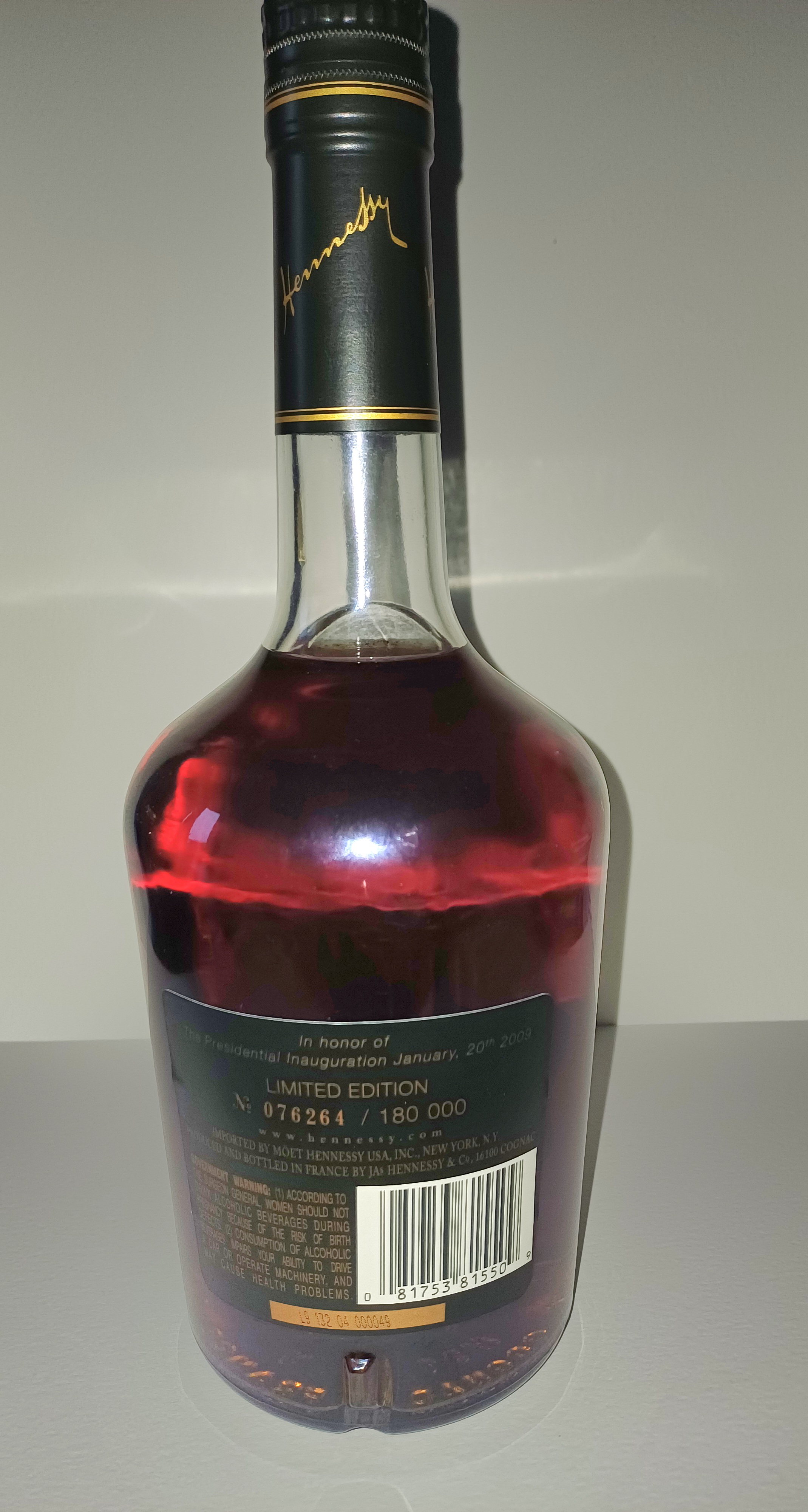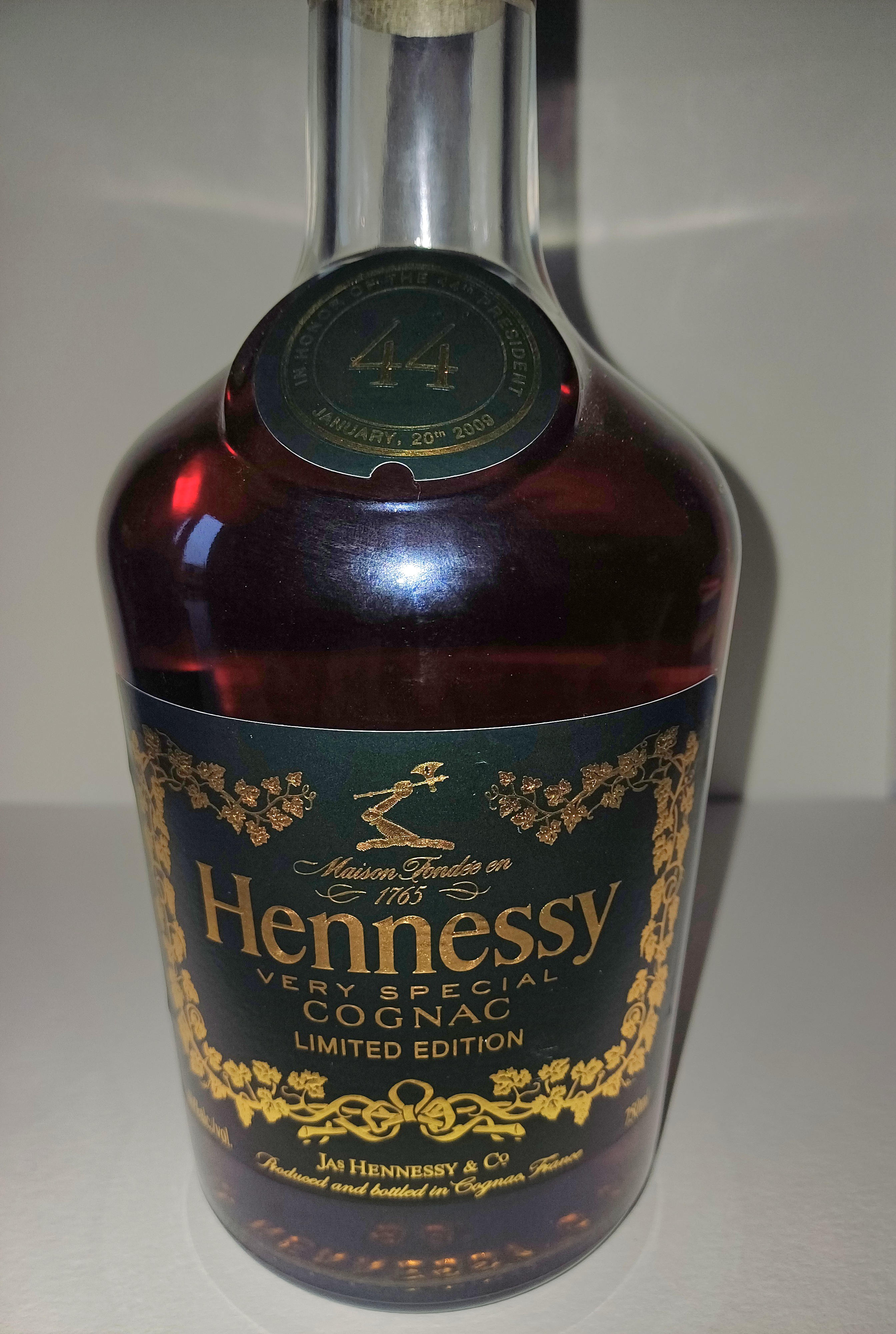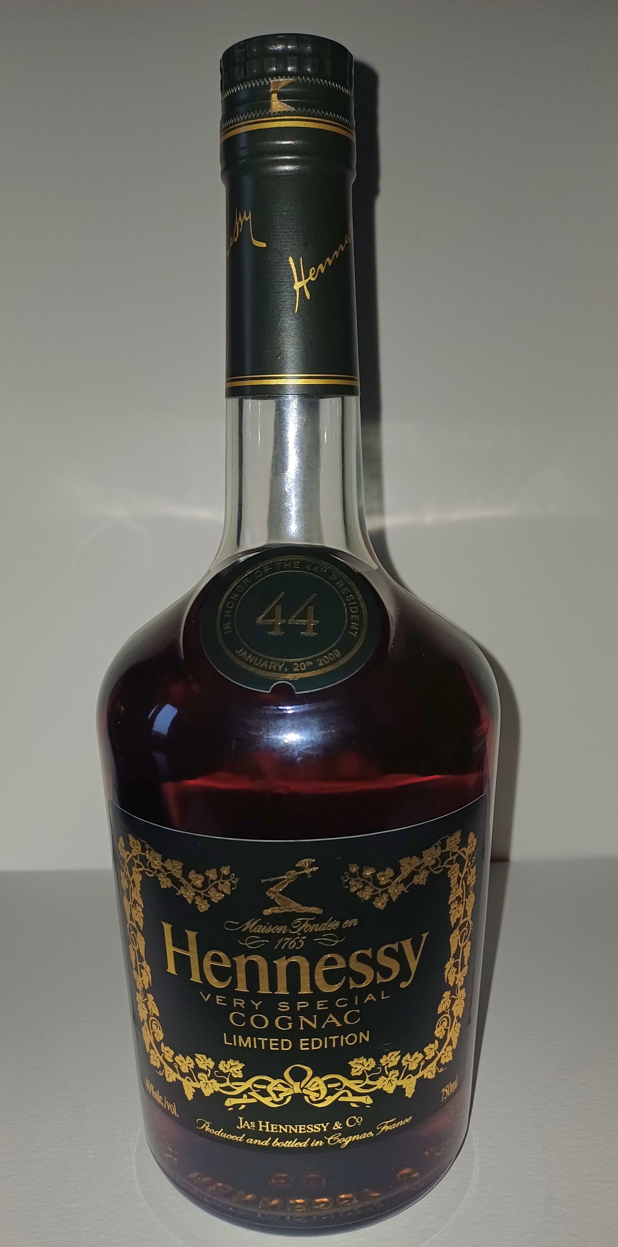 - 1) Text on label: Front Label (Main): Maison Fondée en 1765 Hennessy VERY SPECIAL COGNAC LIMITED EDITION Jas Hennessy & Co Produced and bottled in Cognac, France Front Neck Label (Medallion): IN HONOR OF THE 44th PRESIDENT JANUARY, 20th 2009 Back Label: In honor of The Presidential Inauguration January, 20th 2009 LIMITED EDITION Nº 076264 / 180 000 750ML PRODUCED AND BOTTLED IN FRANCE BY JAS HENNESSY & Cº 16100 COGNAC. IMPORTED BY MOËT HENNESSY USA, INC., NEW YORK, N.Y. WARNING: (GOVERNMENT WARNING) (1) ACCORDING TO THE SURGEON GENERAL, WOMEN SHOULD NOT DRINK ALCOHOLIC BEVERAGES DURING PREGNANCY BECAUSE OF THE RISK OF BIRTH DEFECTS. (2) CONSUMPTION OF ALCOHOLIC BEVERAGES IMPAIRS YOUR ABILITY TO DRIVE A CAR OR OPERATE MACHINERY, AND MAY CAUSE HEALTH PROBLEMS. ALC. 40% VOL. L9 02 04 03 JX48 2) Visual elements: Cork/Capsule: Dark green capsule with a gold cursive "Hennessy" script and a thin gold line below it, wrapping around the neck. Cap (Top): Dark green cap with gold text "Hennessy" (serif) arched above a central emblem of a fist holding an axe, with "COGNAC" (block) arched below. Upper Label (Medallion): A circular dark green medallion on the upper shoulder features large gold block numbers "44" in the center, encircled by gold serif text. Mid Label (Main Front Label): The label is dark green with a prominent gold ornate serif "Hennessy" logo. Above this, a gold emblem depicts a left arm holding an axe. The label is framed by intricate gold scrollwork/vine patterns. Other text is in a mix of serif and sans-serif fonts. Back Label: Features a standard black barcode on a white background. Text is primarily sans-serif. 3) Fill level estimate: above shoulder: good