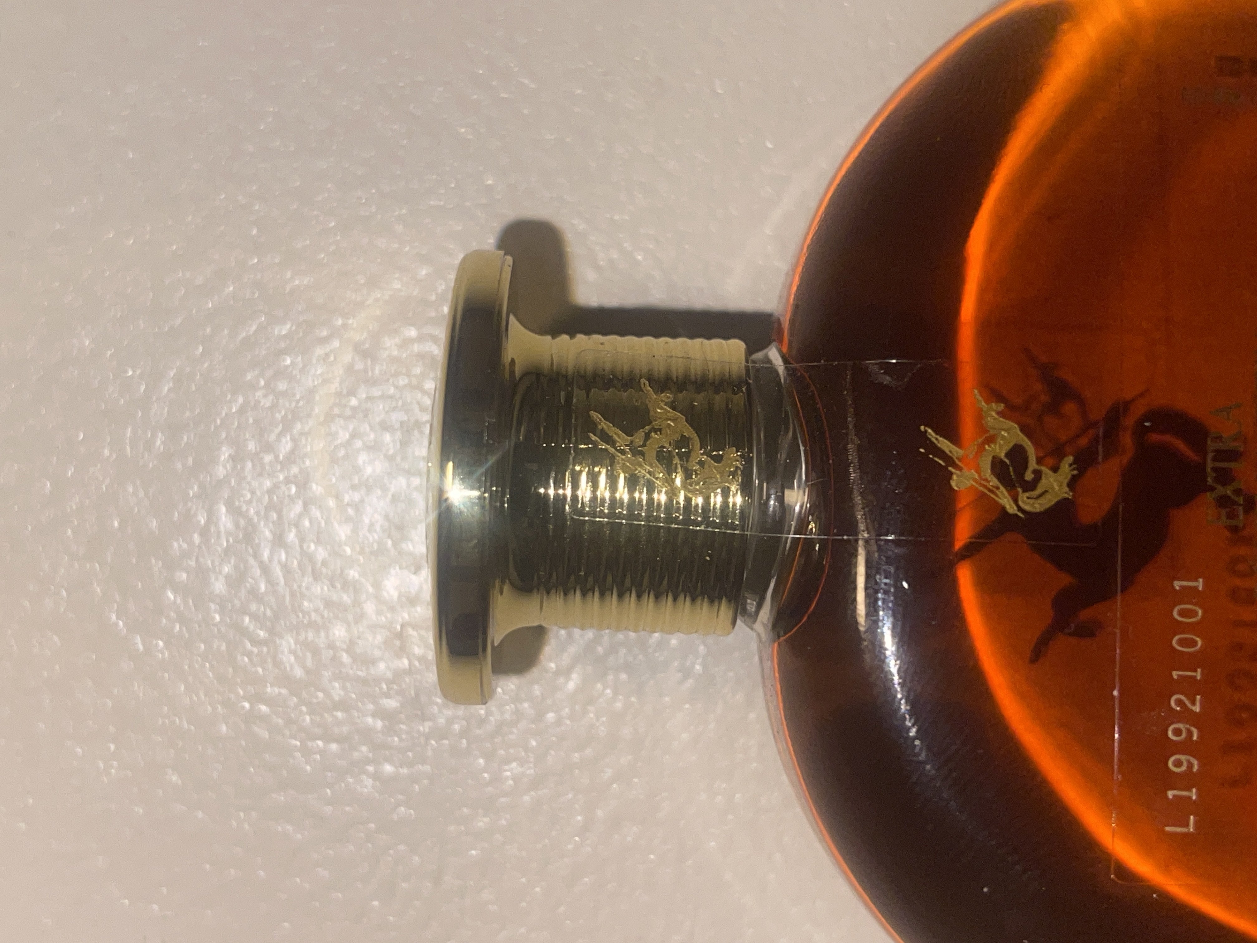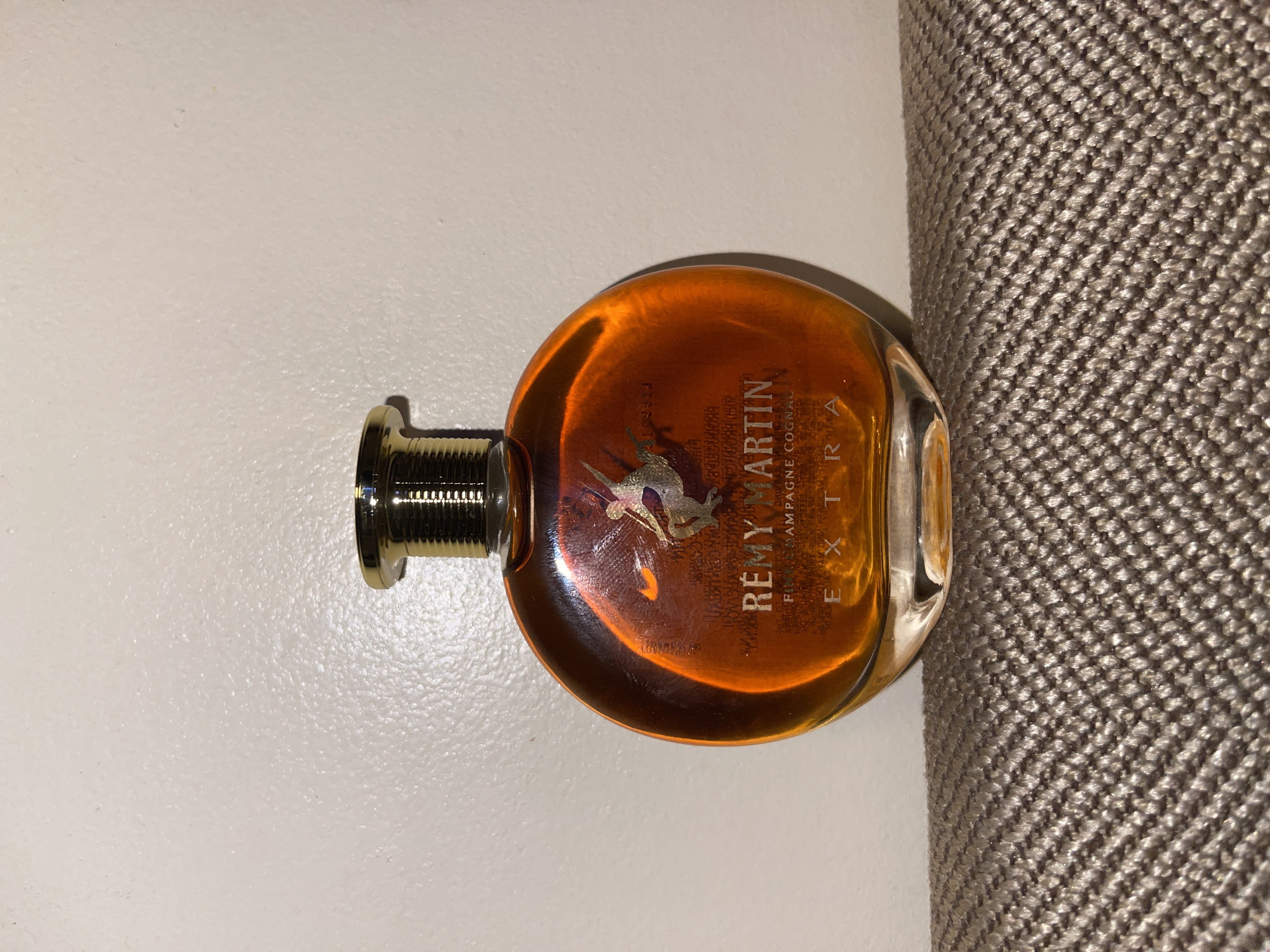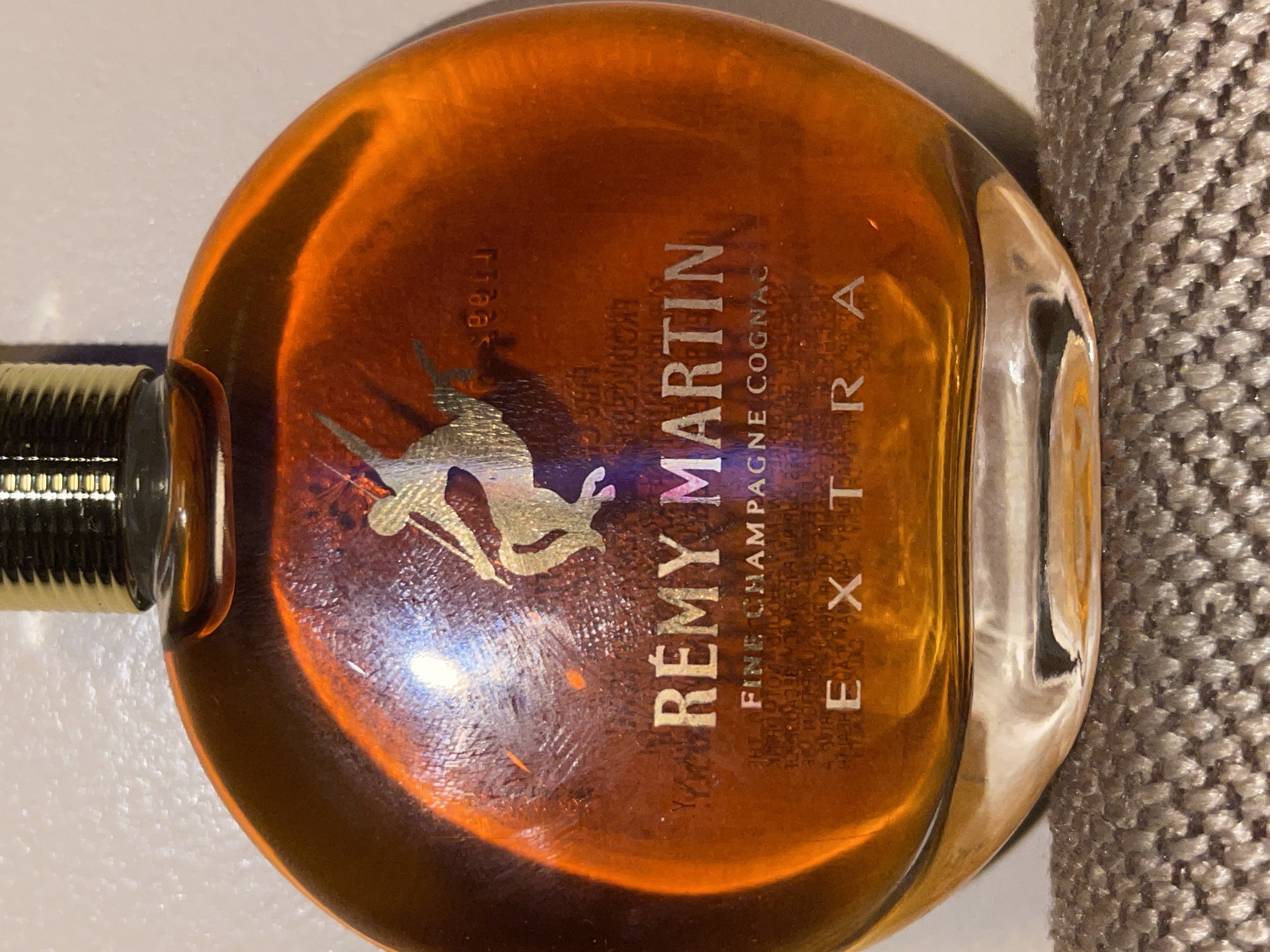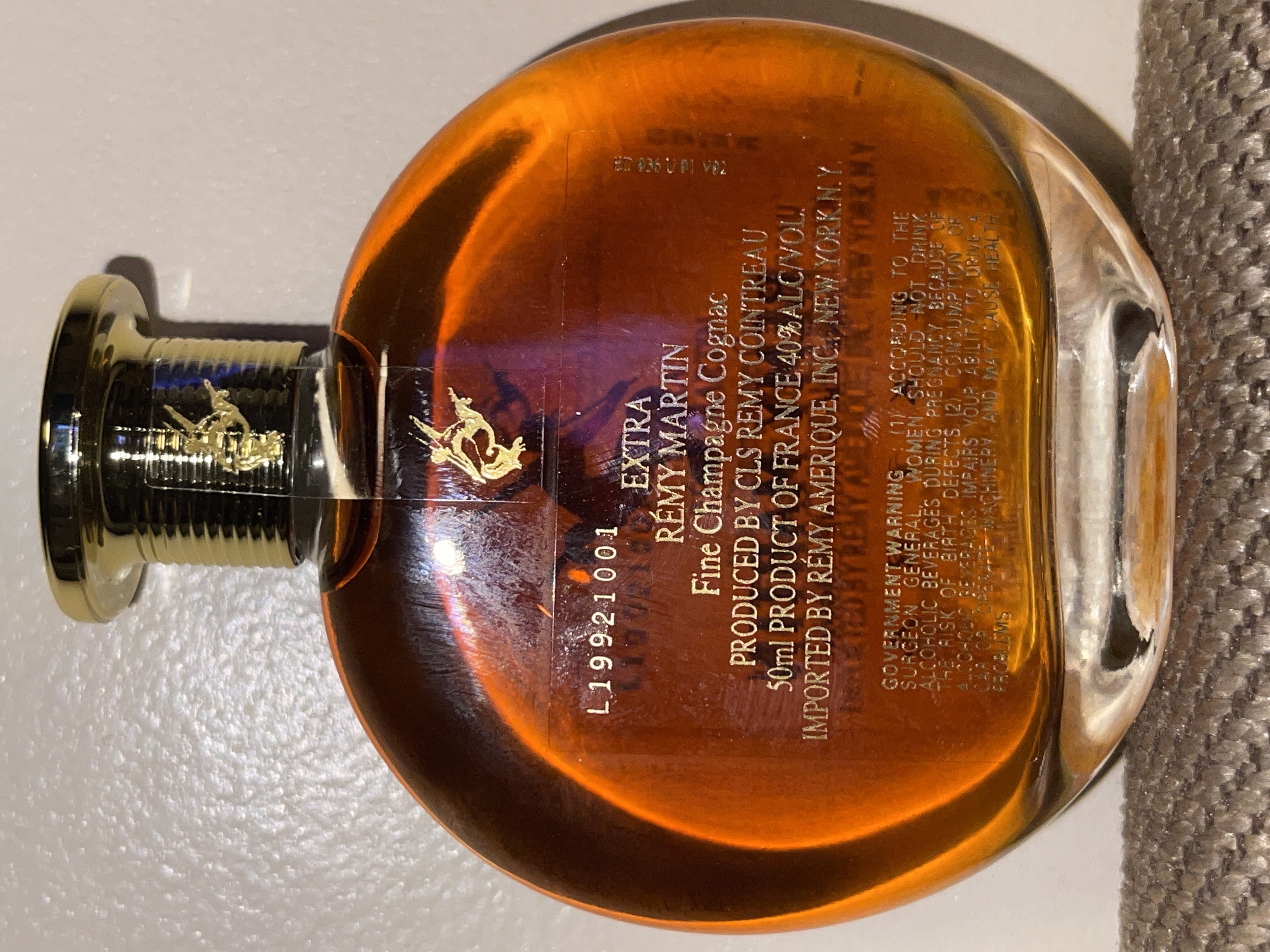 - 1) Text on label: Bottle Front (integrated into glass): RÉMY MARTIN FINE CHAMPAGNE COGNAC E X T R A Bottle Back (label sticker): L19921001 E X T R A RÉMY MARTIN Fine Champagne Cognac PRODUCED BY CLS REMY COINTREAU 50ml PRODUCT OF FRANCE 40% ALC/VOL. IMPORTED BY RÉMY AMERIQUE, INC. NEW YORK N.Y. GOVERNMENT WARNING: (1) ACCORDING TO THE SURGEON GENERAL, WOMEN SHOULD NOT DRINK ALCOHOLIC BEVERAGES DURING PREGNANCY BECAUSE OF THE RISK OF BIRTH DEFECTS. (2) CONSUMPTION OF ALCOHOLIC BEVERAGES IMPAIRS YOUR ABILITY TO DRIVE A CAR OR OPERATE MACHINERY, AND MAY CAUSE HEALTH PROBLEMS. Bottle Cap (top, embossed): COGNAC (partially visible, within circular text) Box Front: RÉMY MARTIN FINE CHAMPAGNE COGNAC E X T R A THE 2 MOST PRESTIGIOUS RM FINE CHAMPAGNE COGNAC C.A.O.S. 2) Visual elements: Bottle - Mid label (front, integrated into glass): A golden centaur (sagittarius aiming bow backwards) with wings. Bottle - Neck (foil/cap): A smaller golden centaur. Bottle - Top of cap (embossed): A centaur within a circular border containing partially visible text. Bottle - Font styles: The main brand name "RÉMY MARTIN" is in a stylized serif font. "FINE CHAMPAGNE COGNAC" and "E X T R A" use a sans-serif, all-caps font (with spaced letters for "EXTRA"). The back label employs a smaller, standard sans-serif font. Box - Front panel: Features a metallic silver rectangular panel in the center with a golden centaur logo. Below this, a circular red and gold emblem contains "RM" and "FINE CHAMPAGNE COGNAC". The box itself is a matte orange-brown with a debossed border. Box - Font styles: Consistent with the bottle's front label: stylized serif for "RÉMY MARTIN", sans-serif for "FINE CHAMPAGNE COGNAC" and "E X T R A". Smaller sans-serif for "THE MOST PRESTIGIOUS". 3) Fill level estimate: well above shoulder into neck: great