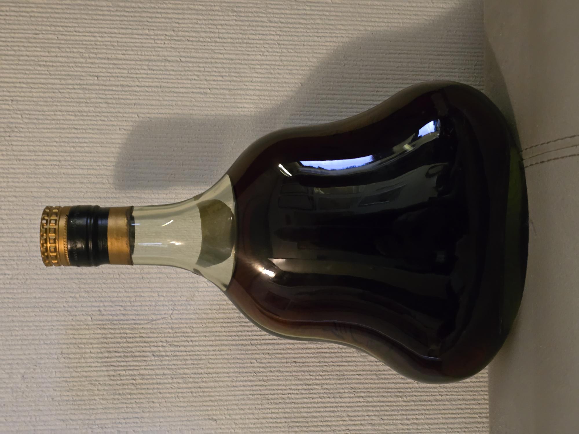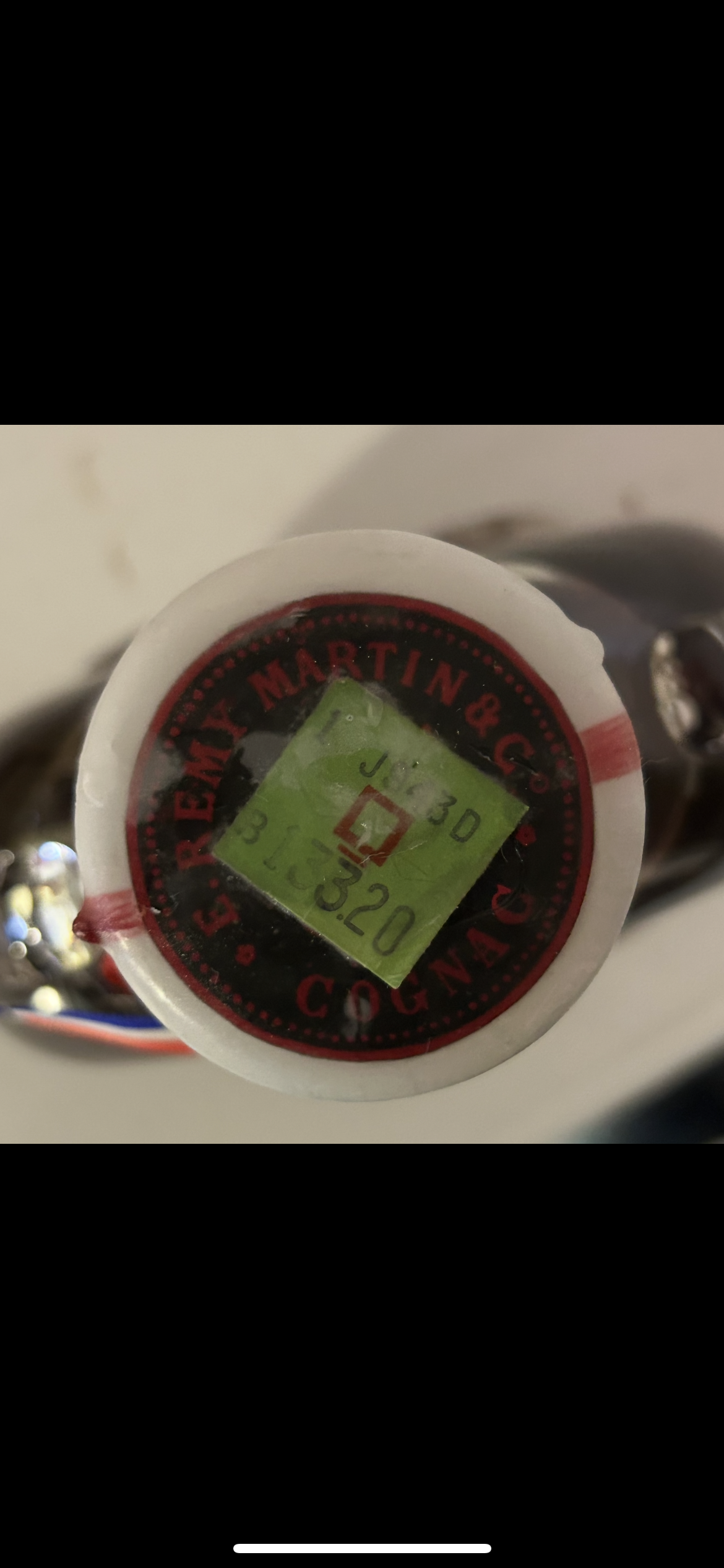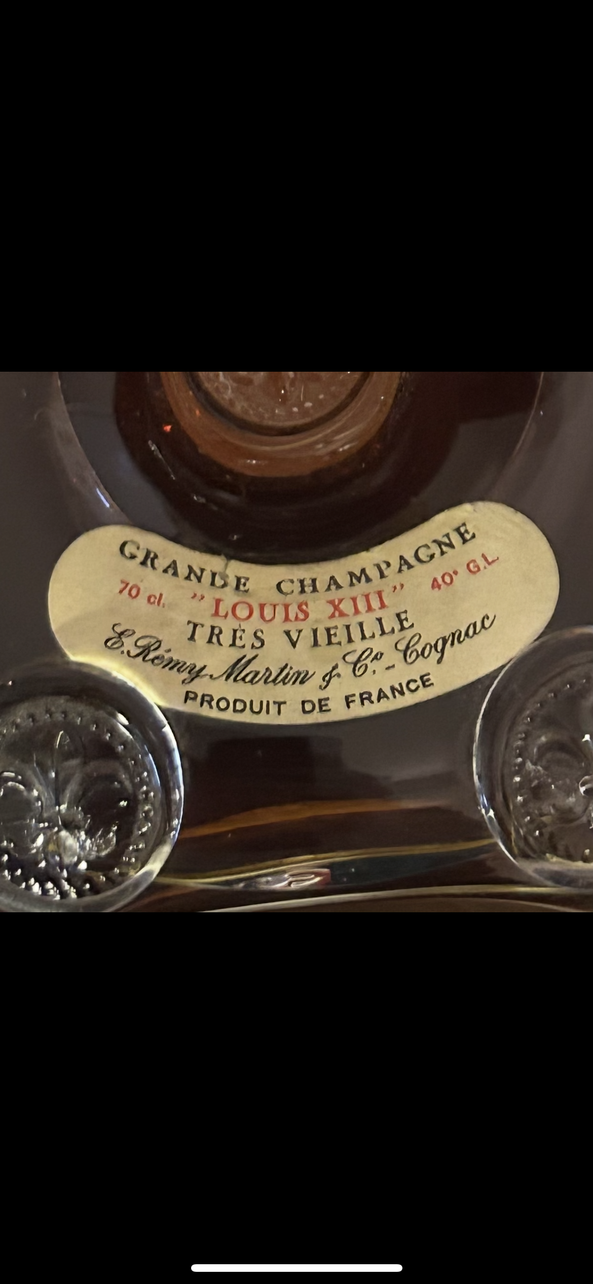 - 1) Text on label: Mid-label (on the bottle): GRANDE CHAMPAGNE 70 cl. ”LOUIS XIII” 40º G.L. TRES VIEILLE E. Remy Martin & Cº - Cognac PRODUIT DE FRANCE On neck capsule: Remy Martin Cognac On top of cork/capsule: REMY MARTIN & Cº COGNAC (Green sticker with numbers): 1 J23D 313.320 On the box: REMY MARTIN COGNAC 2) Visual elements: Bottle: A clear, ornate crystal decanter with a distinctive fluted or "spiked" exterior. Several of the glass "spikes" on the mid-body feature an embossed fleur-de-lis motif. A central circular depression on the mid-label area shows an embossed pattern, possibly a sunburst. Neck/Capsule: The neck is sealed with a white, ceramic-like capsule adorned with red line details. A ribbon in the colors of the French flag (red, white, blue) is tied around the base of the capsule. "Remy Martin Cognac" is handwritten in a cursive/script font on the capsule. Upper label (top of cork): A circular label/seal encircles the cork, bearing "REMY MARTIN & Cº COGNAC" in a bold sans-serif or block-serif font. A rectangular green sticker with numbers and a small logo is centrally placed on this seal. Mid label: An off-white, elongated oval-shaped label with pointed ends. The text "GRANDE CHAMPAGNE," "70 cl. 40º G.L.," "TRES VIEILLE," and "PRODUIT DE FRANCE" are in various serif fonts. " ”LOUIS XIII” " is prominently displayed in a bold serif font, and "E. Remy Martin & Cº - Cognac" is written in an elegant cursive/script font. Small glass bottle: A miniature version of the main decanter, made of clear glass with similar ornate embossed designs (fleur-de-lis) on its base. Box: A gold-colored, textured box featuring the Remy Martin centaur logo (a centaur holding a spear) printed in the center, with "REMY MARTIN" above and "COGNAC" below, all in a sans-serif font. 3) Fill level estimate: well above shoulder into neck: great