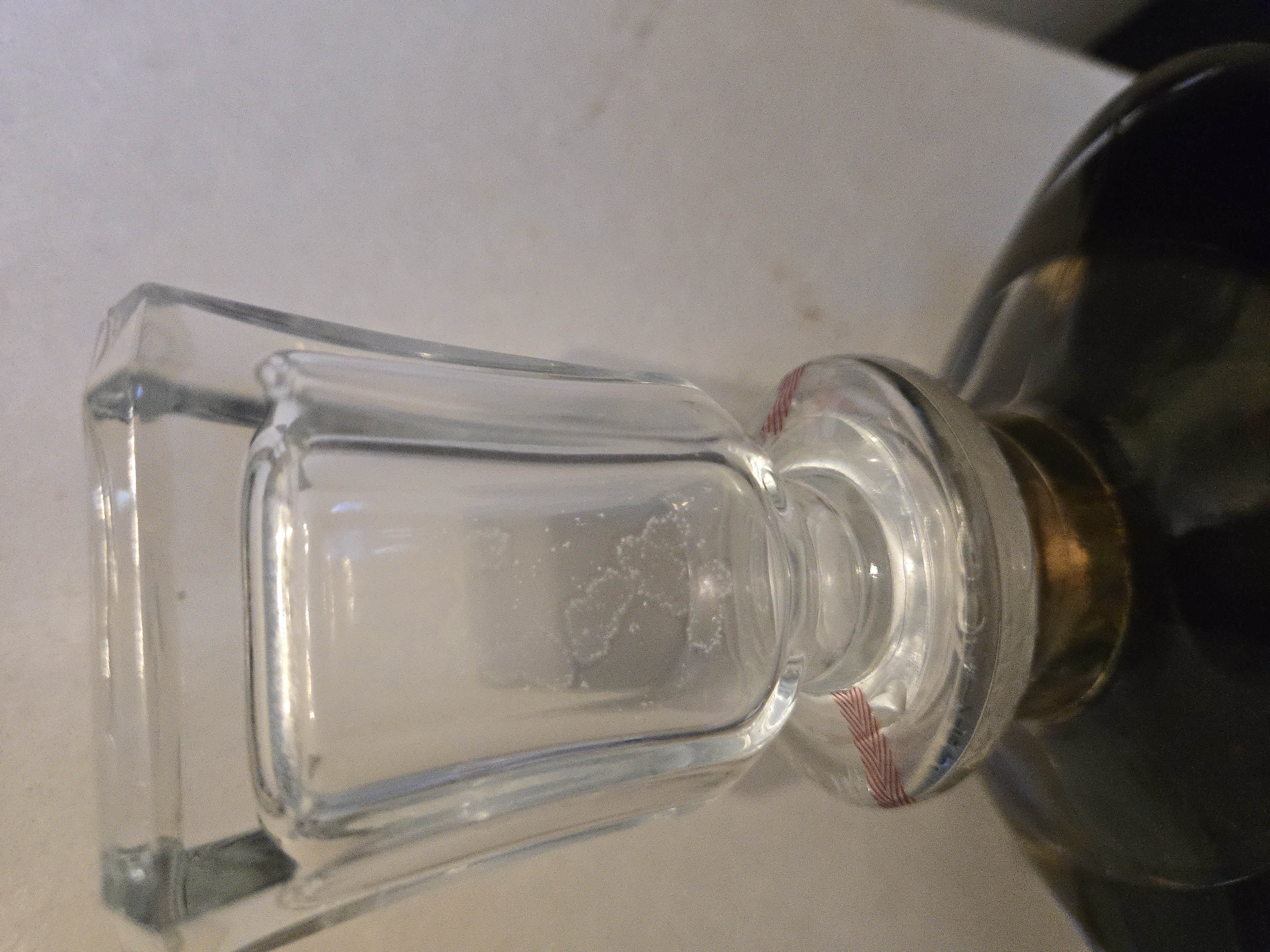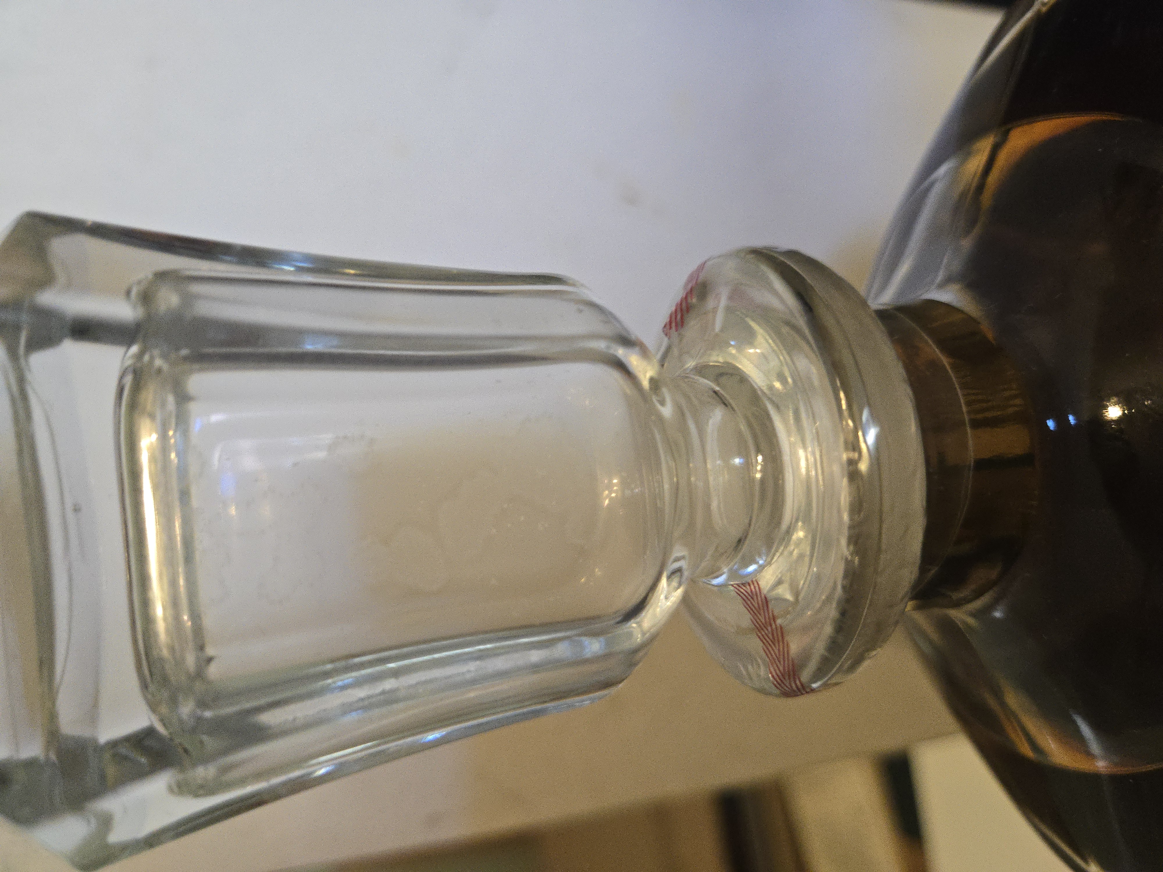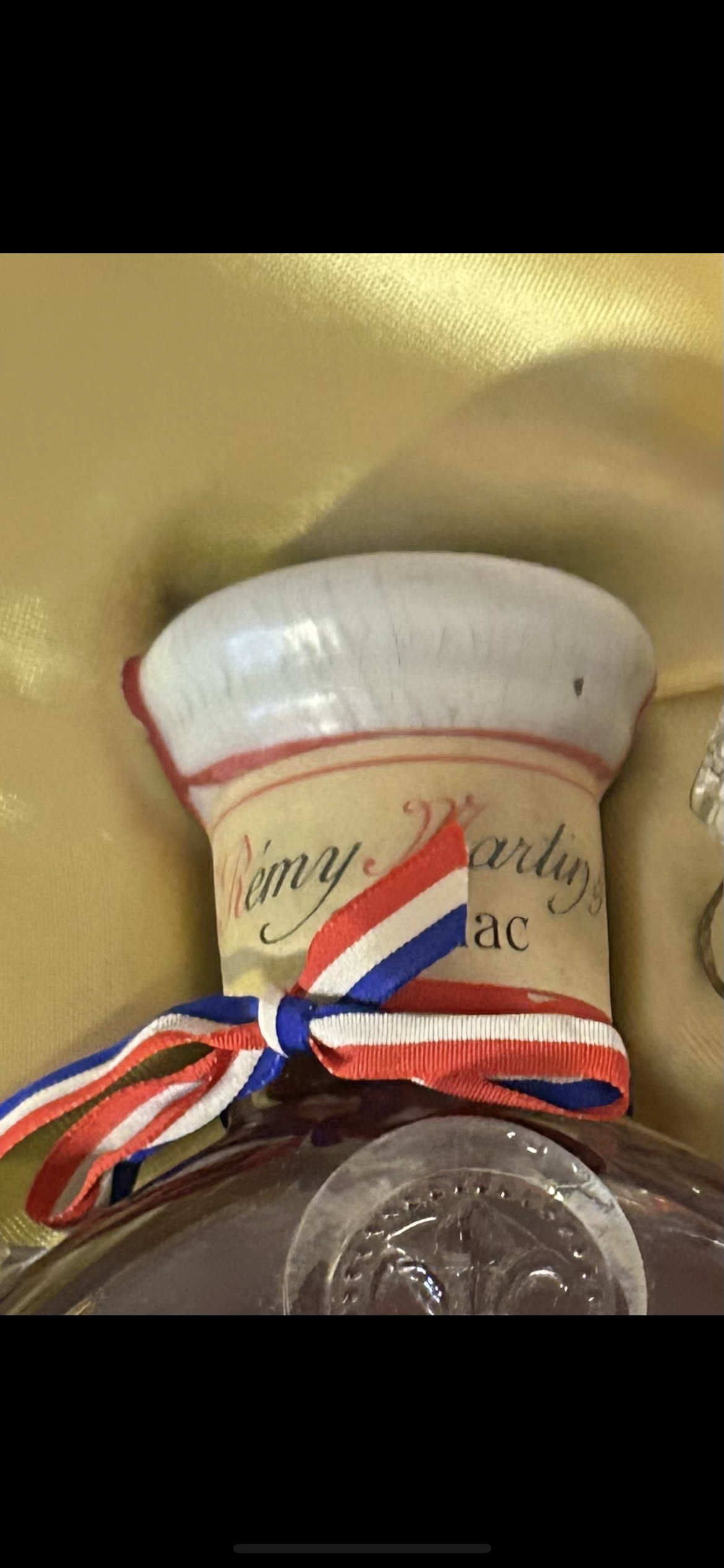- 1) Text on label: Mid-label (on the bottle): GRANDE CHAMPAGNE 70 cl. ”LOUIS XIII” 40º G.L. TRES VIEILLE E. Remy Martin & Cº - Cognac PRODUIT DE FRANCE On neck capsule: Remy Martin Cognac On top of cork/capsule: REMY MARTIN & Cº COGNAC (Green sticker with numbers): 1 J23D 313.320 On the box: REMY MARTIN COGNAC 2) Visual elements: Bottle: A clear, ornate crystal decanter with a distinctive fluted or "spiked" exterior. Several of the glass "spikes" on the mid-body feature an embossed fleur-de-lis motif. A central circular depression on the mid-label area shows an embossed pattern, possibly a sunburst. Neck/Capsule: The neck is sealed with a white, ceramic-like capsule adorned with red line details. A ribbon in the colors of the French flag (red, white, blue) is tied around the base of the capsule. "Remy Martin Cognac" is handwritten in a cursive/script font on the capsule. Upper label (top of cork): A circular label/seal encircles the cork, bearing "REMY MARTIN & Cº COGNAC" in a bold sans-serif or block-serif font. A rectangular green sticker with numbers and a small logo is centrally placed on this seal. Mid label: An off-white, elongated oval-shaped label with pointed ends. The text "GRANDE CHAMPAGNE," "70 cl. 40º G.L.," "TRES VIEILLE," and "PRODUIT DE FRANCE" are in various serif fonts. " ”LOUIS XIII” " is prominently displayed in a bold serif font, and "E. Remy Martin & Cº - Cognac" is written in an elegant cursive/script font. Small glass bottle: A miniature version of the main decanter, made of clear glass with similar ornate embossed designs (fleur-de-lis) on its base. Box: A gold-colored, textured box featuring the Remy Martin centaur logo (a centaur holding a spear) printed in the center, with "REMY MARTIN" above and "COGNAC" below, all in a sans-serif font. 3) Fill level estimate: well above shoulder into neck: great