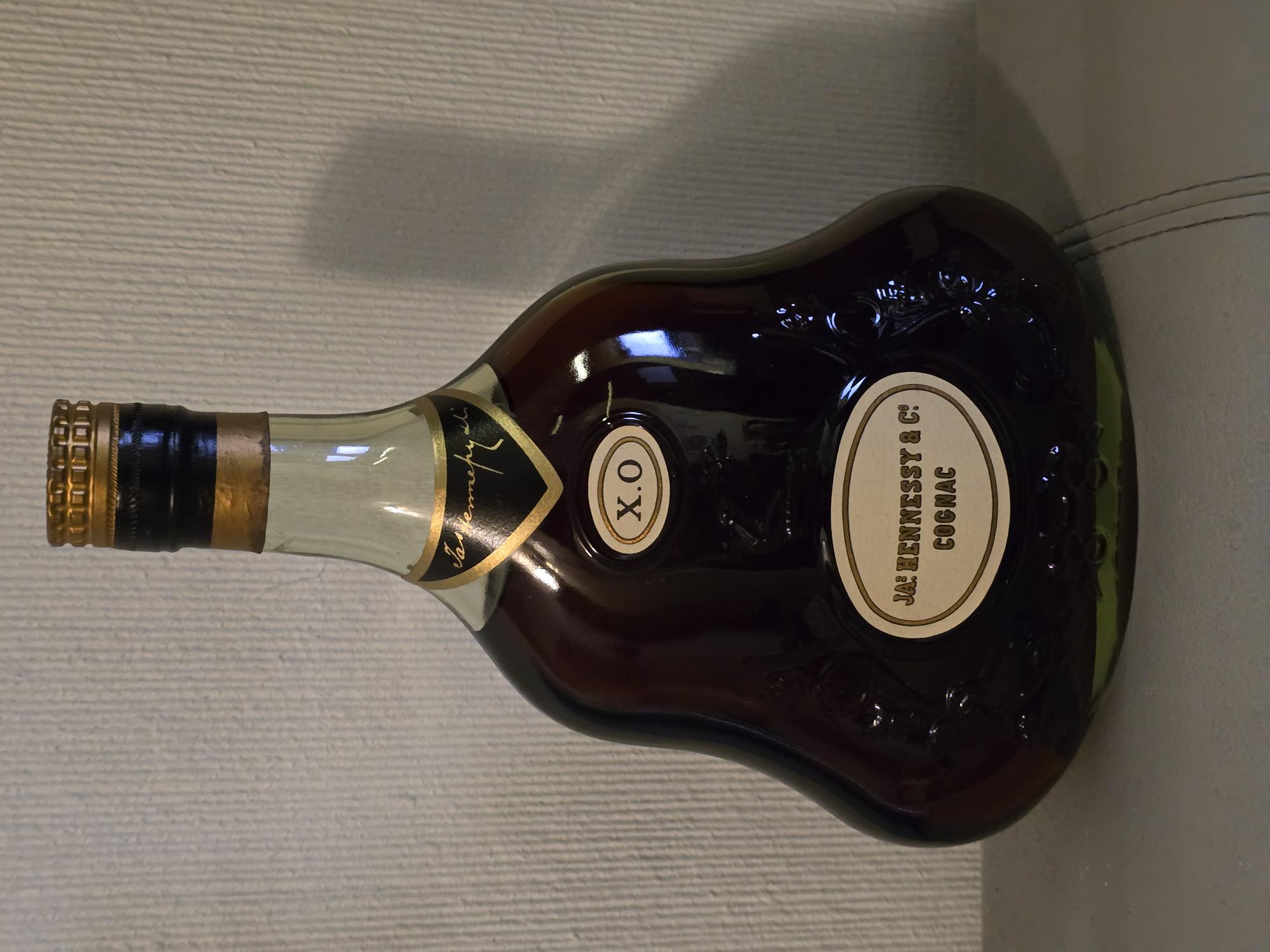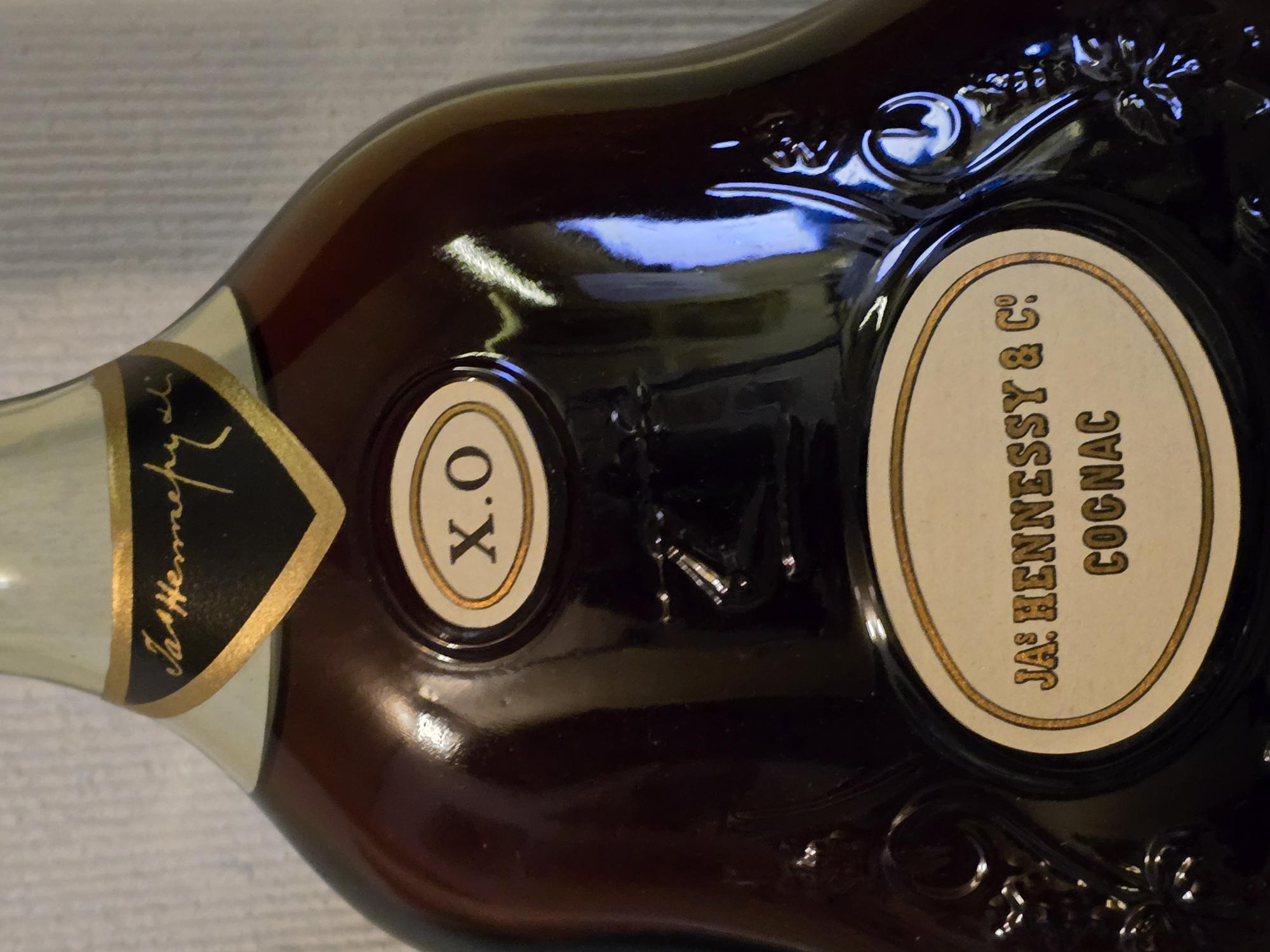 - 1) Text on label: From the bottle: On the upper, triangular label: Jas Hennessy & Co On the mid, oval label: X.O On the lower, oval label: JAs HENNESSY & Cº COGNAC On the top of the cap: JAS HENNESSY & Cº COGNAC From the box: Below the portrait: RICHARD HENNESSY 1724-1800 Main text at bottom: COGNAC HENNESSY X.O. 2) Visual elements: Bottle shape: Distinctive wide, bulbous, decanter-style bottle. Neck/Cap: A gold ridged screw-cap features an embossed bird emblem (often called "bras armé") surrounded by "JAS HENNESSY & Cº" and "COGNAC" in a block/sans-serif font. Below the cap, there is a black foil capsule over a gold band, followed by another gold band on the neck. Upper label (mid neck): A black, shield-shaped label with a gold border displays "Jas Hennessy & Co" in a cursive/script font. Mid label (upper body): A small oval, white label with a gold border, shows "X.O" in a serif font. Lower label (mid body): A larger oval, white label with a gold border, features "JAs HENNESSY & Cº" (serif font, "HENNESSY" in block caps) and "COGNAC" (serif, block caps). Embossing: Ornate scrollwork patterns are embossed into the glass on the bottle's body, flanking the lower label and extending towards the shoulders. A stylized "7" is also subtly embossed above the lower label. Box (front): Features a portrait of Richard Hennessy (1724-1800) in profile, wearing a red coat and tricorn hat, against a textured background. Below the portrait, "COGNAC HENNESSY X.O." is written in a serif font, and "RICHARD HENNESSY 1724-1800" in a sans-serif font. 3) Fill level estimate: well above shoulder into neck: great Reason: Liquid reaches high into the neck, with only a small visible air gap.