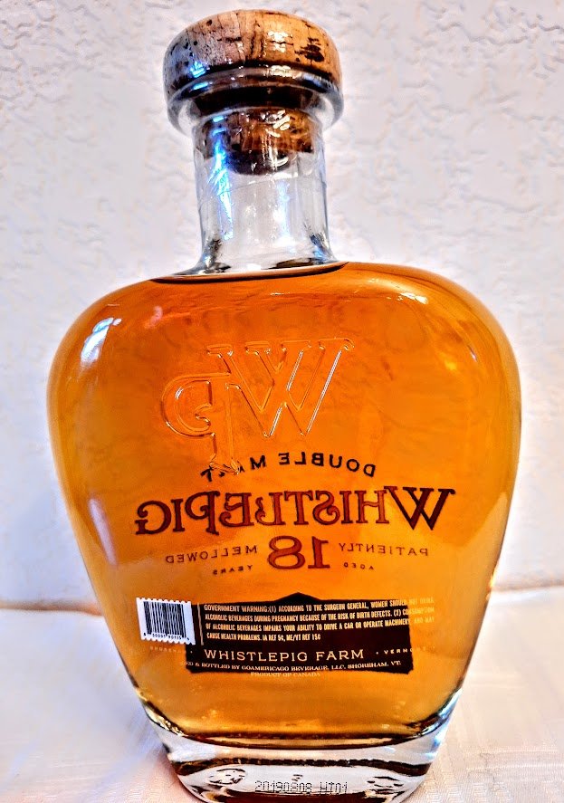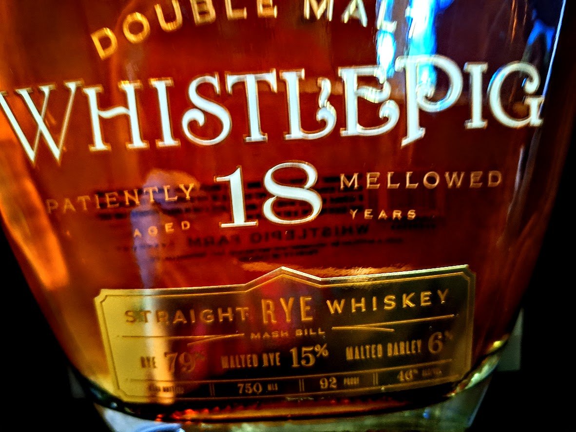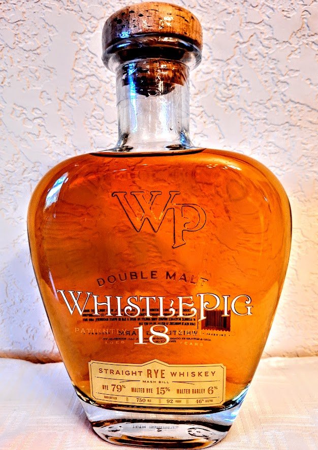 - DOUBLE MALT, WHISTLEPIG, PATIENTLY AGED 18 MELLOWED YEARS, STRAIGHT RYE WHISKEY Mash bill 79% RYE 15% MALTED RYE 6% MALTED BARLEY HAND BOTTLED 750 MLS 92 PROOF 46% ALC/VOL