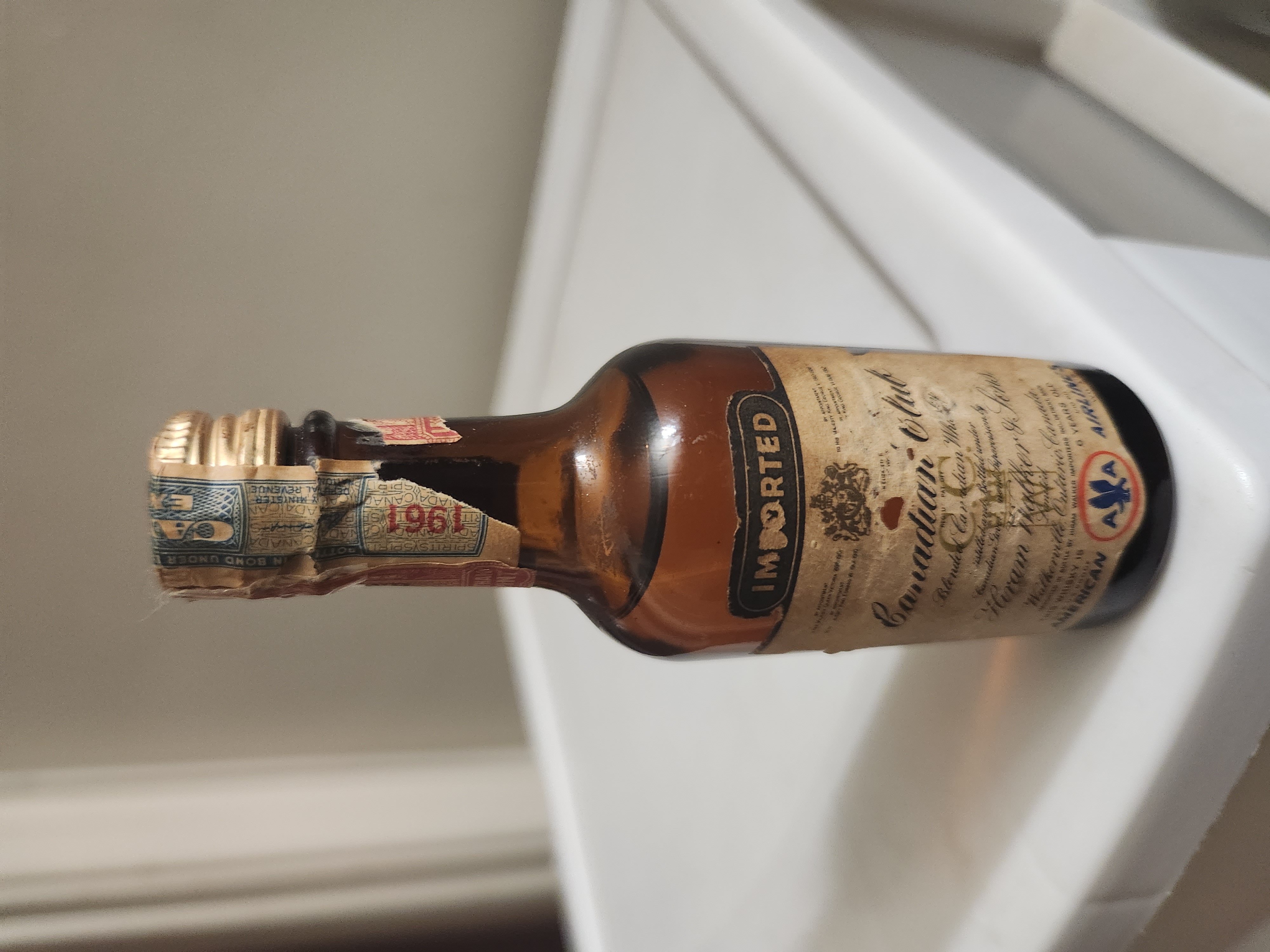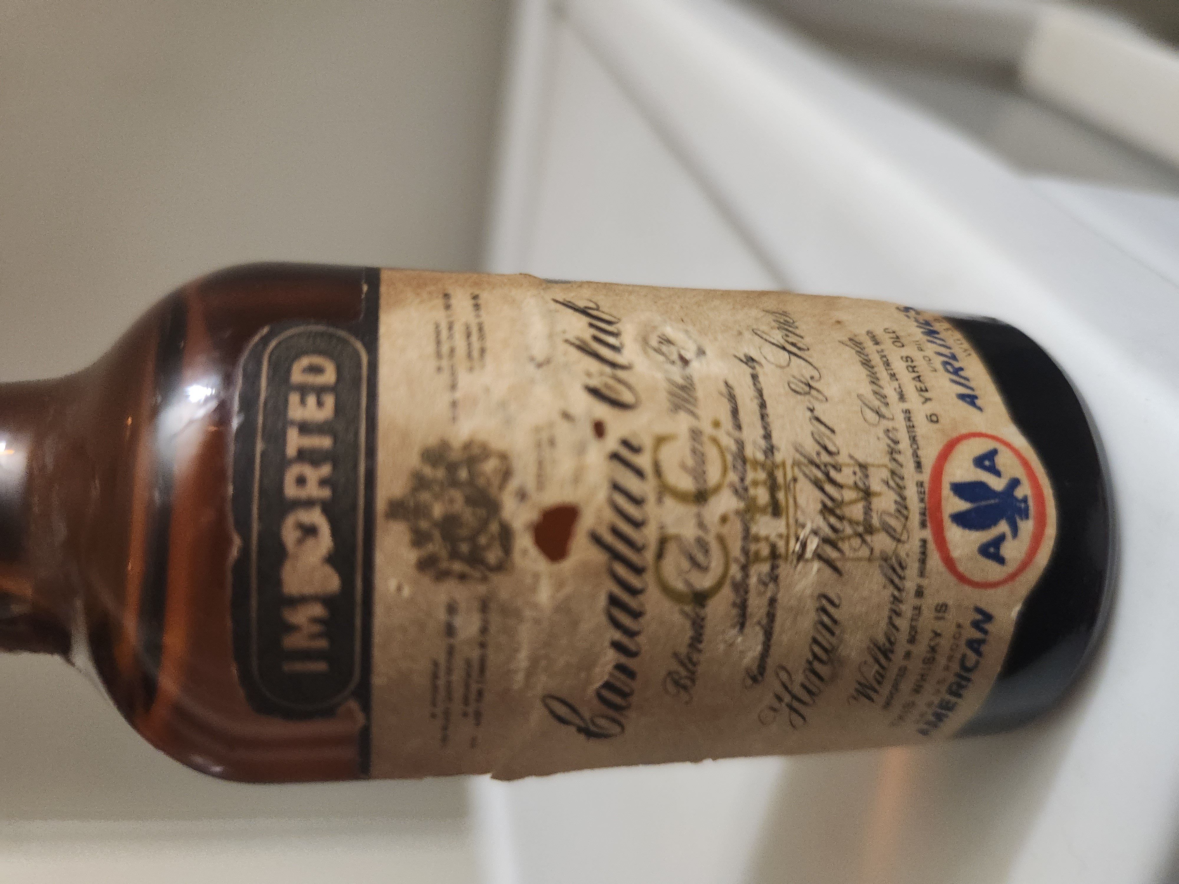 - By appointment her .majesty Queen Victoria 1890-1901 By appointment adjusty Kind Edward VII 1901-1910 By appointment to his majesty king George V 1910-1936 By appointment king George VI 1936-1962 Imported Canadian Club Blended Canadian Whiskey Distilled and bottled under Canadian ?????? And under supervision of Hiram Walker & Sons limited Walkerville Ontario Canada imported in bottle by Hiram Walker Importers inc. Detroit Mich This Whiskey is 6 years old 86.8 us proof 1/10 P11 American A perfect Logo Airlines WG319