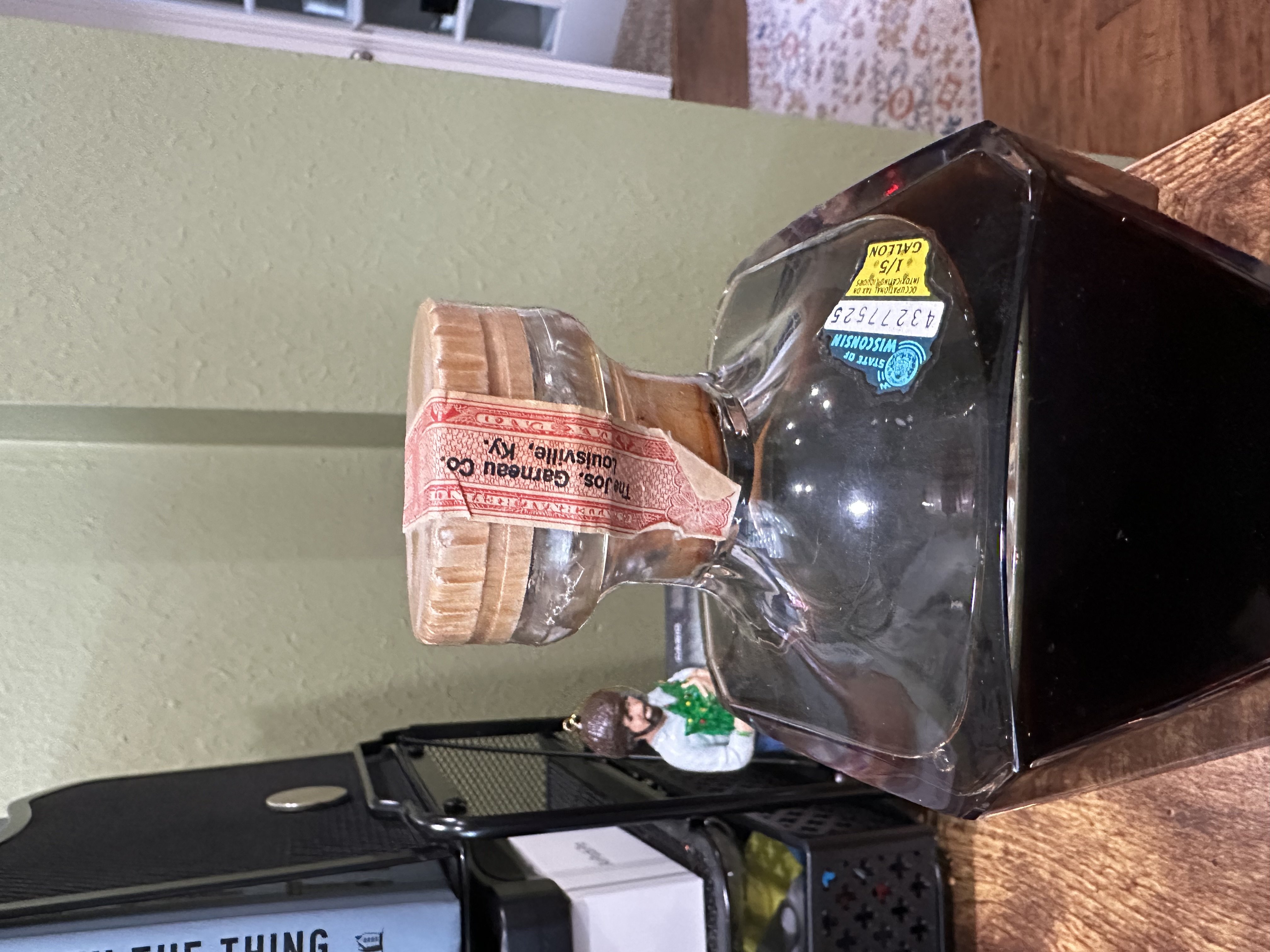- Basement of grandfather, used to work in the bars. Worn seal wear/tear at edge on bottle, it wasnt like this when first pulled out. I believed it happen when putting it back in box and taking back out for photos. Distilled year 1964 based on 4-year age statement on back label. Original holiday decanter with original box (box in good condition with minor shelf wear). Fill level :excellent - high fill just below neck: consistent with full/near-full condition for bottle of this age. No cracks or chips in decanter, Labels in excellent shape. Minor dust from long-term storage