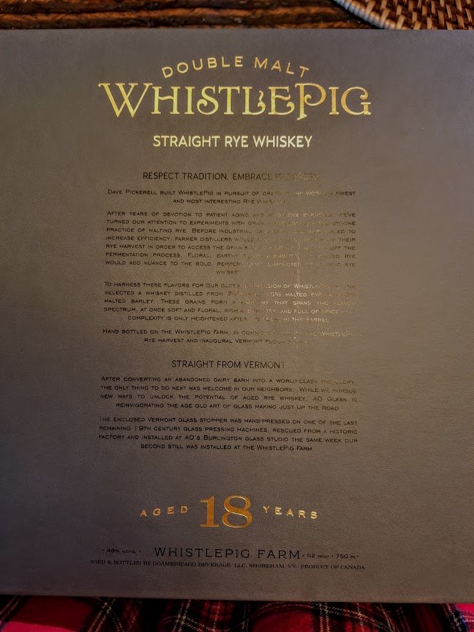 - Double Malt Whistlepig Patiently aged 18 mellow years, straight rye whiskey, mash bill: Rye 79, malted rye 15%, malted barley 6%, hand bottled, 750 ml, 92 proof
