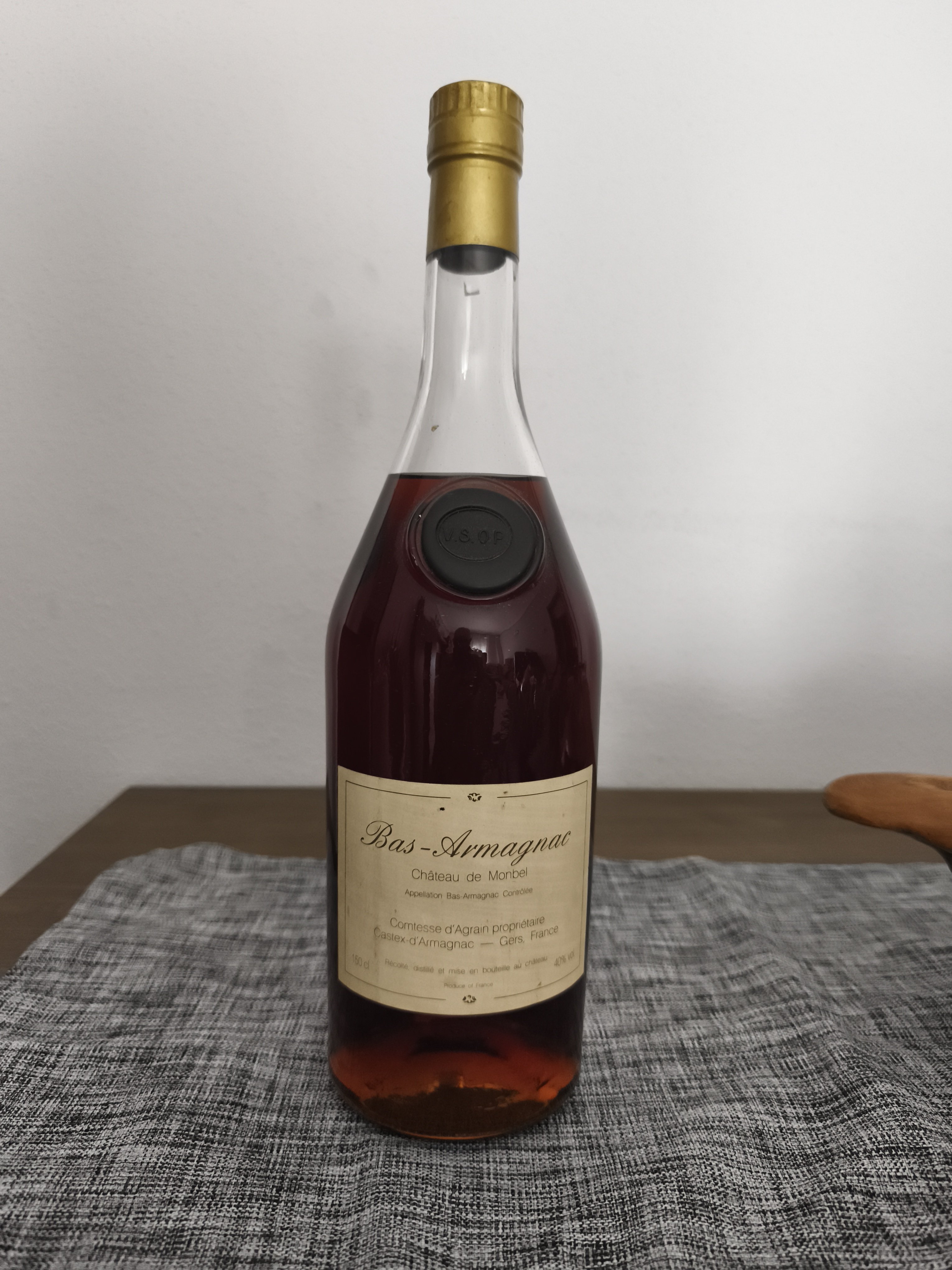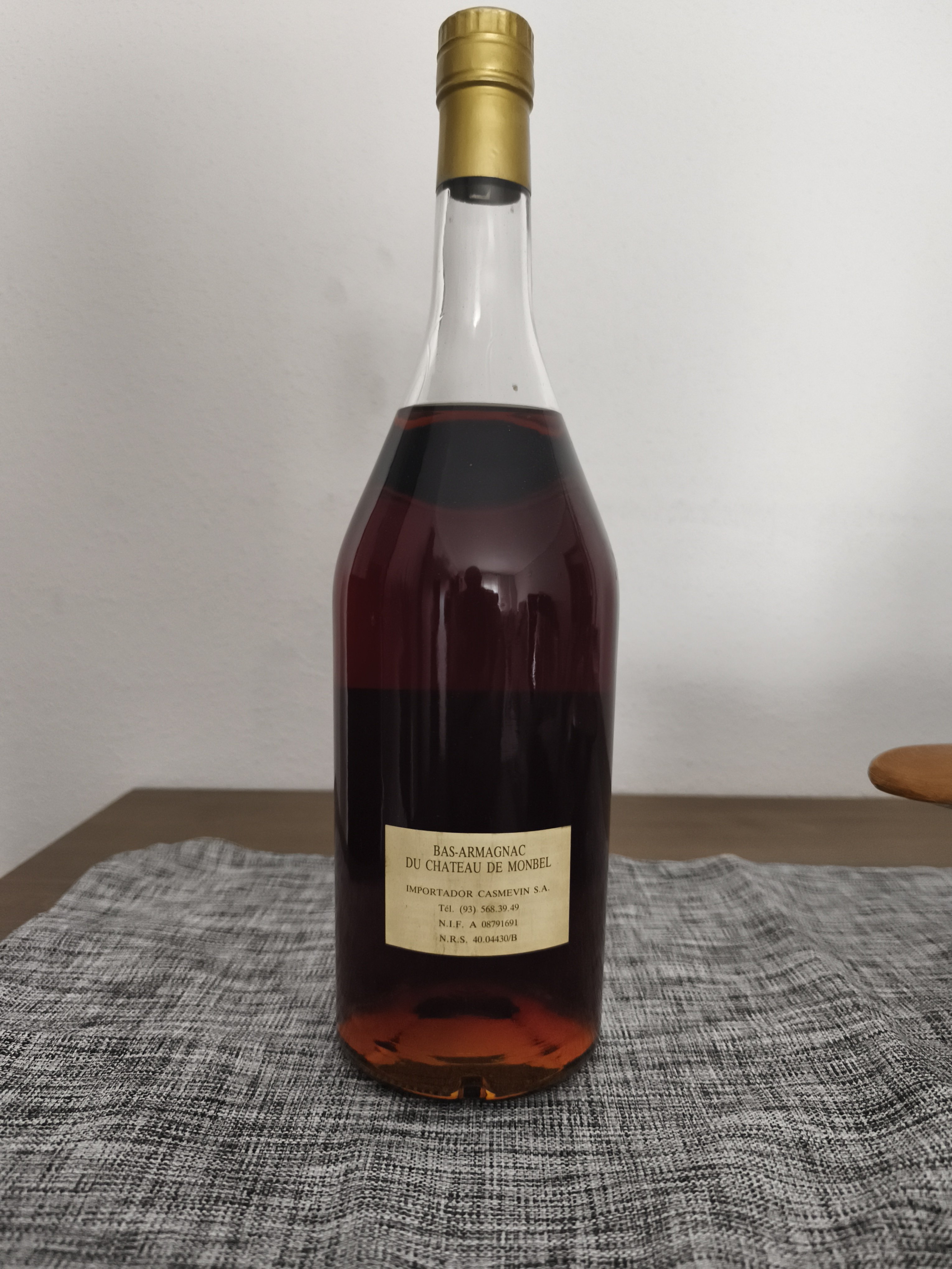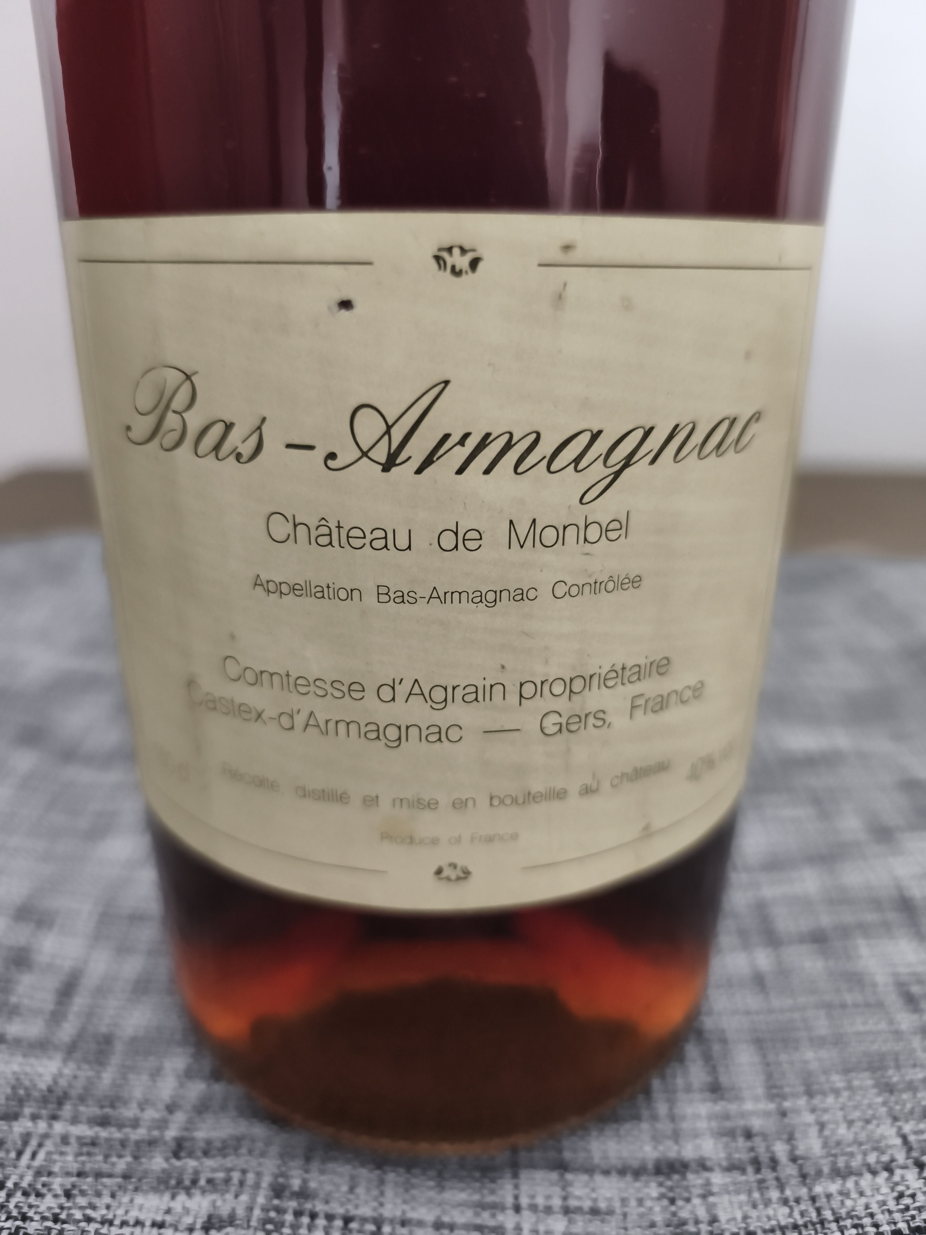 - Bas-Armagnac Chateau de monbel Apellation Bas-armagnac controlee Comtesse d'grain propietarie Castex-D'Armagnac - Gers. France Recolite, distille et mise en bouteille au chateau 150cl. Produce of France. 40% vol.