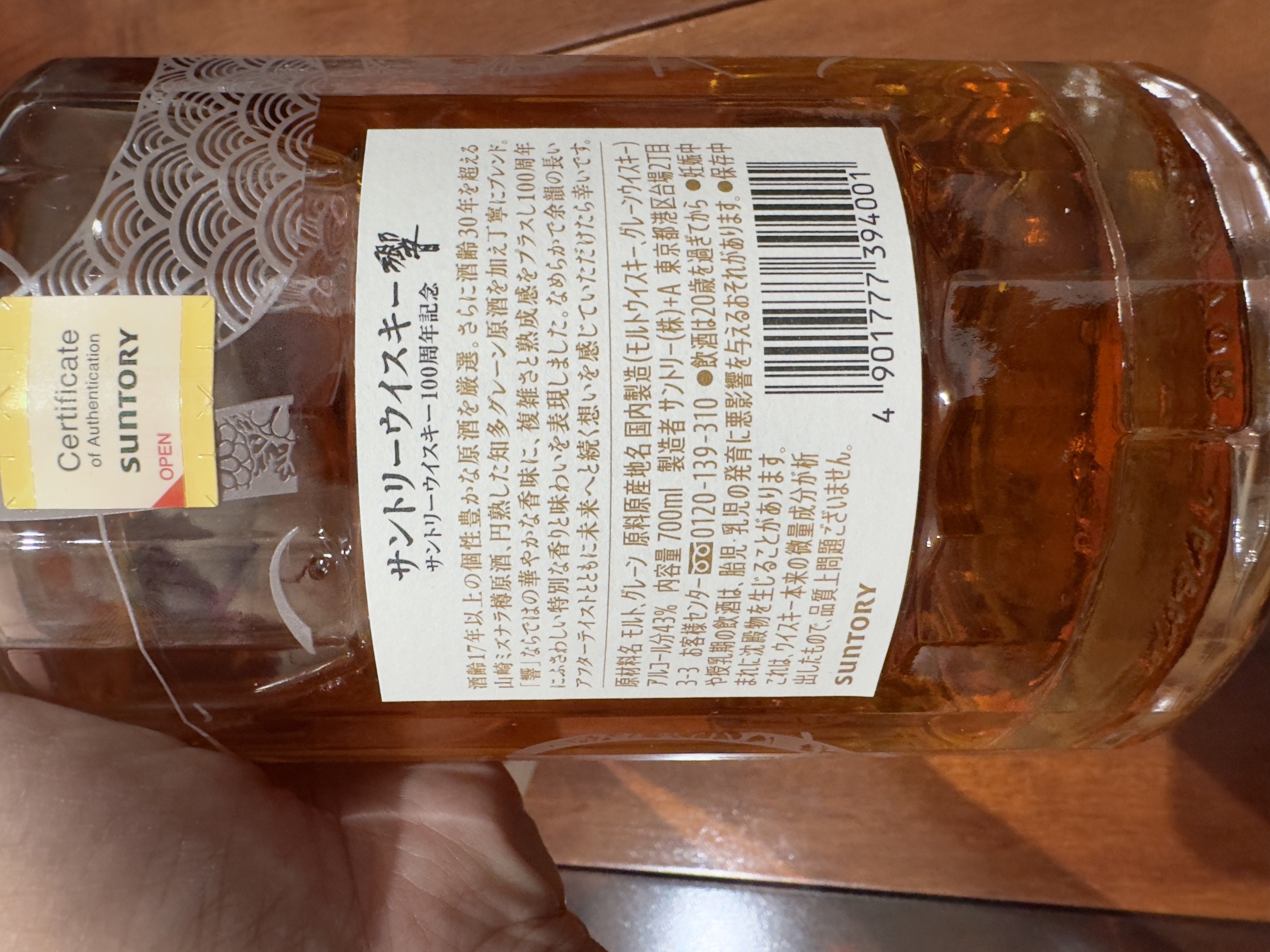 - HIBIKI SUNTORY WHISKY Anniversary Blend A special blend that bridges our 100 years history to a bright future 43% vol. 700 mL PRODUCT OF JAPAN Suntory Spirits Ltd. 2-3-3 Daiba, Minato-ku, Tokyo, Japan