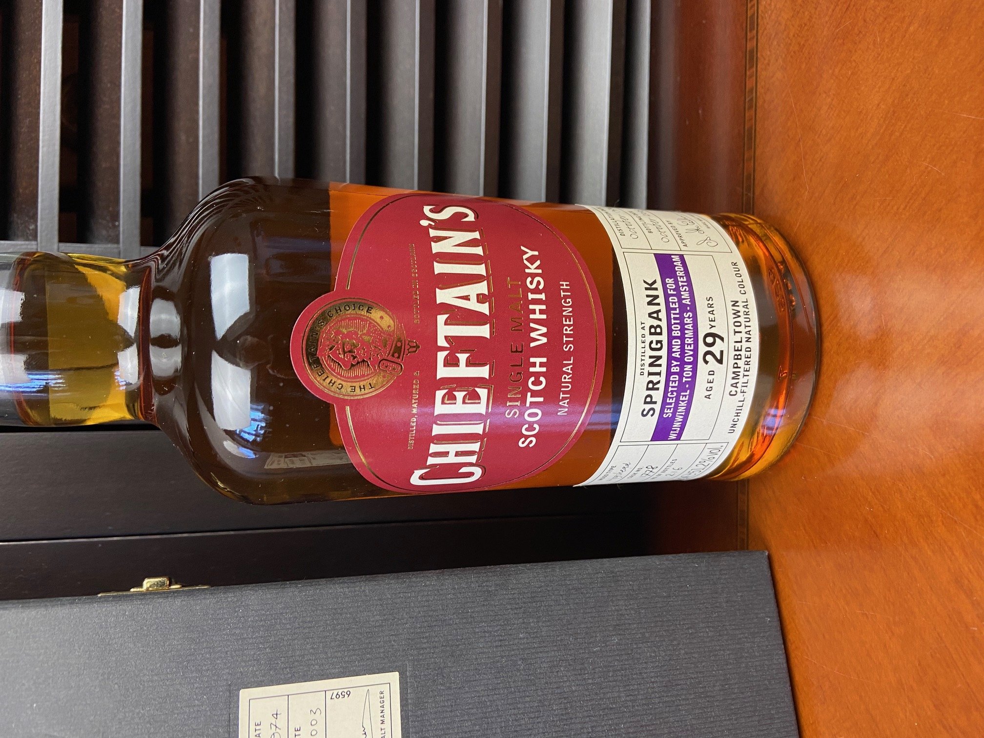 - Springbank Chieftain's Selected by and bottled for Ton Overmars, Amsterdam Cask No 1778 No of bottles: 216 Wood type: hogshead 70cl 51.2% Distillation date: October 1974 Bottling date: October 2003