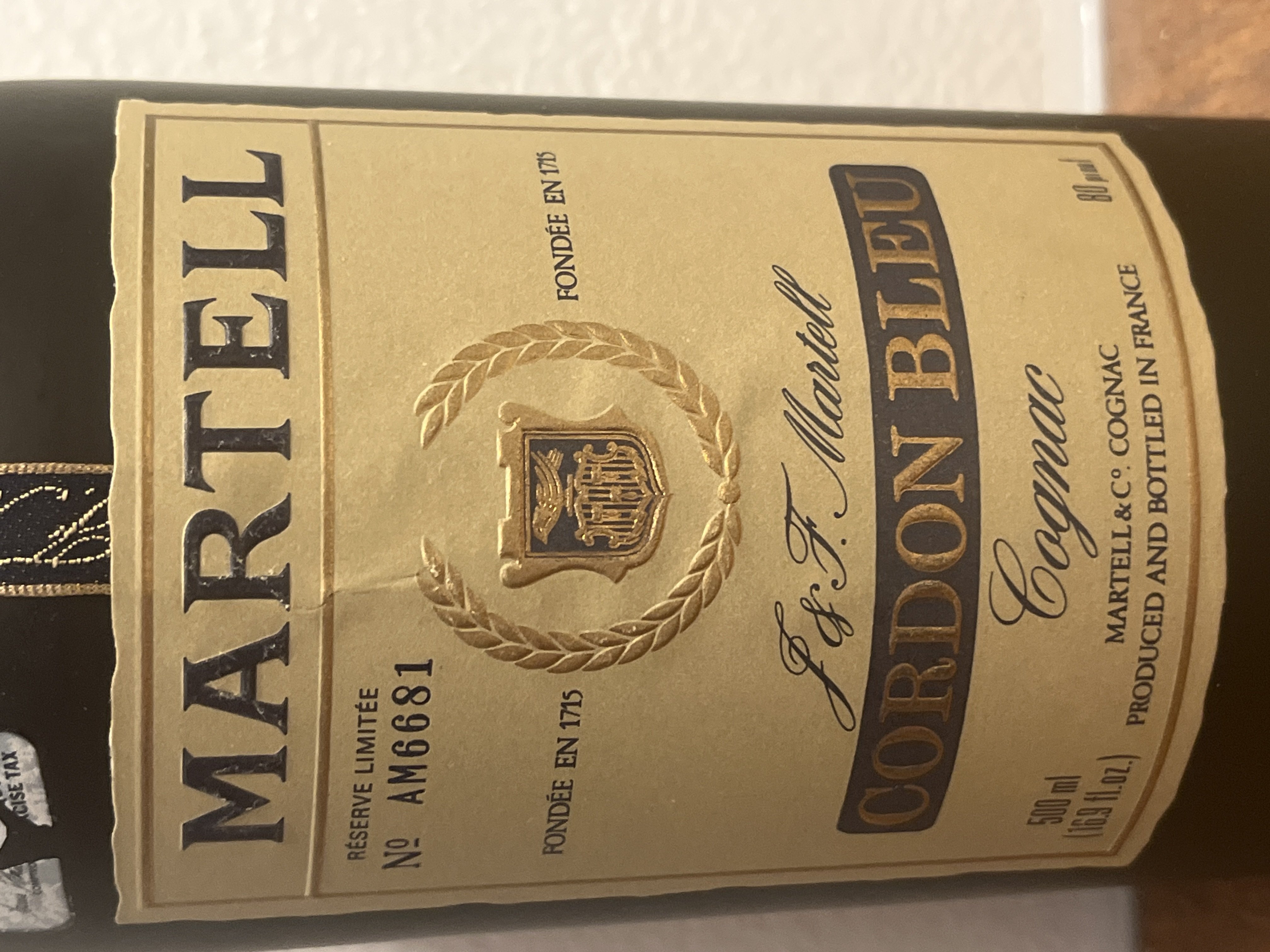 - Martell RÉSERVE LIMITÉE No AM6681 FONDÉE EN 1715 J&F. Martell CORDON BLEU Cognac 500 ml (16.9 fl.oz.) MARTELL&C°. COGNAC PRODUCED AND BOTTLED IN FRANCE 80 proof