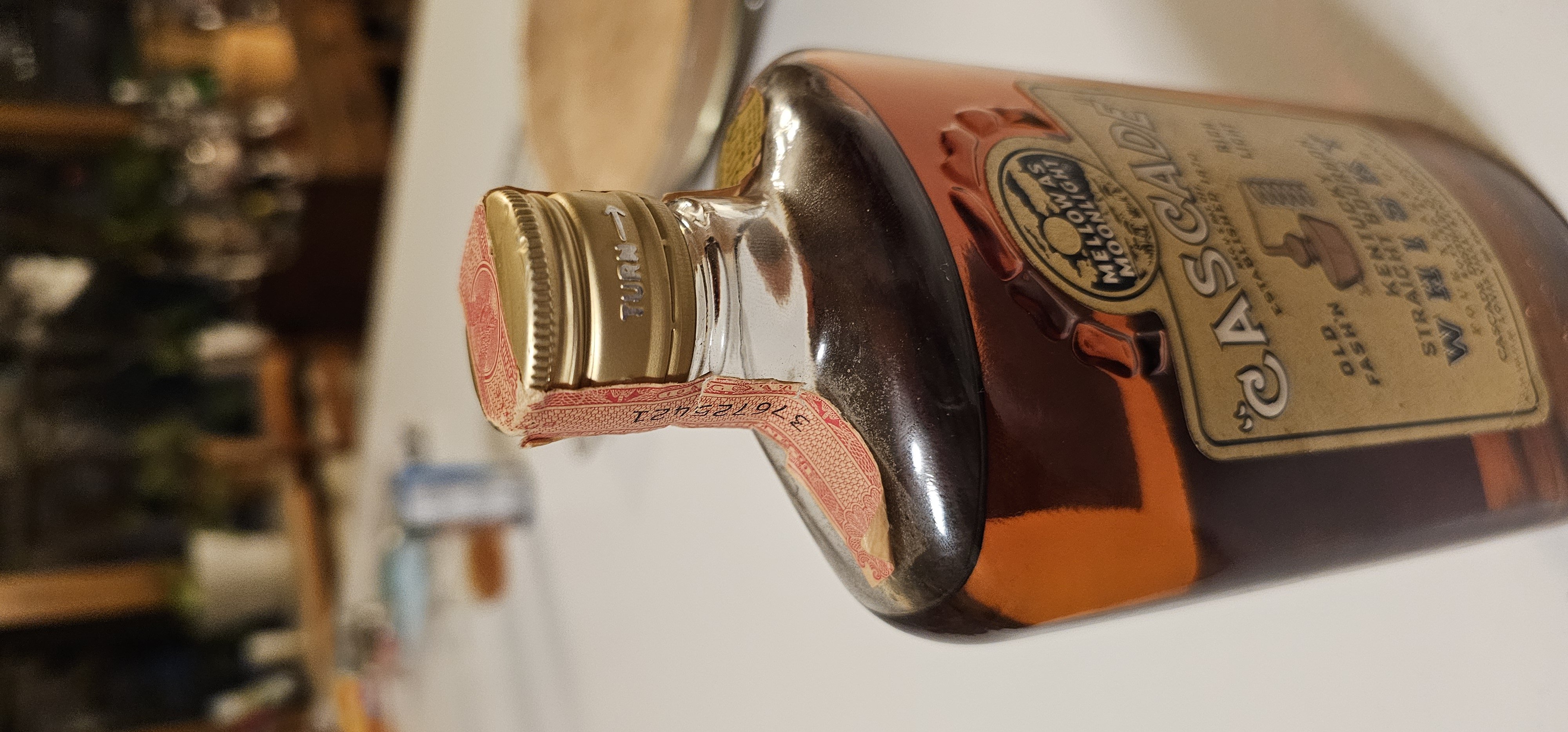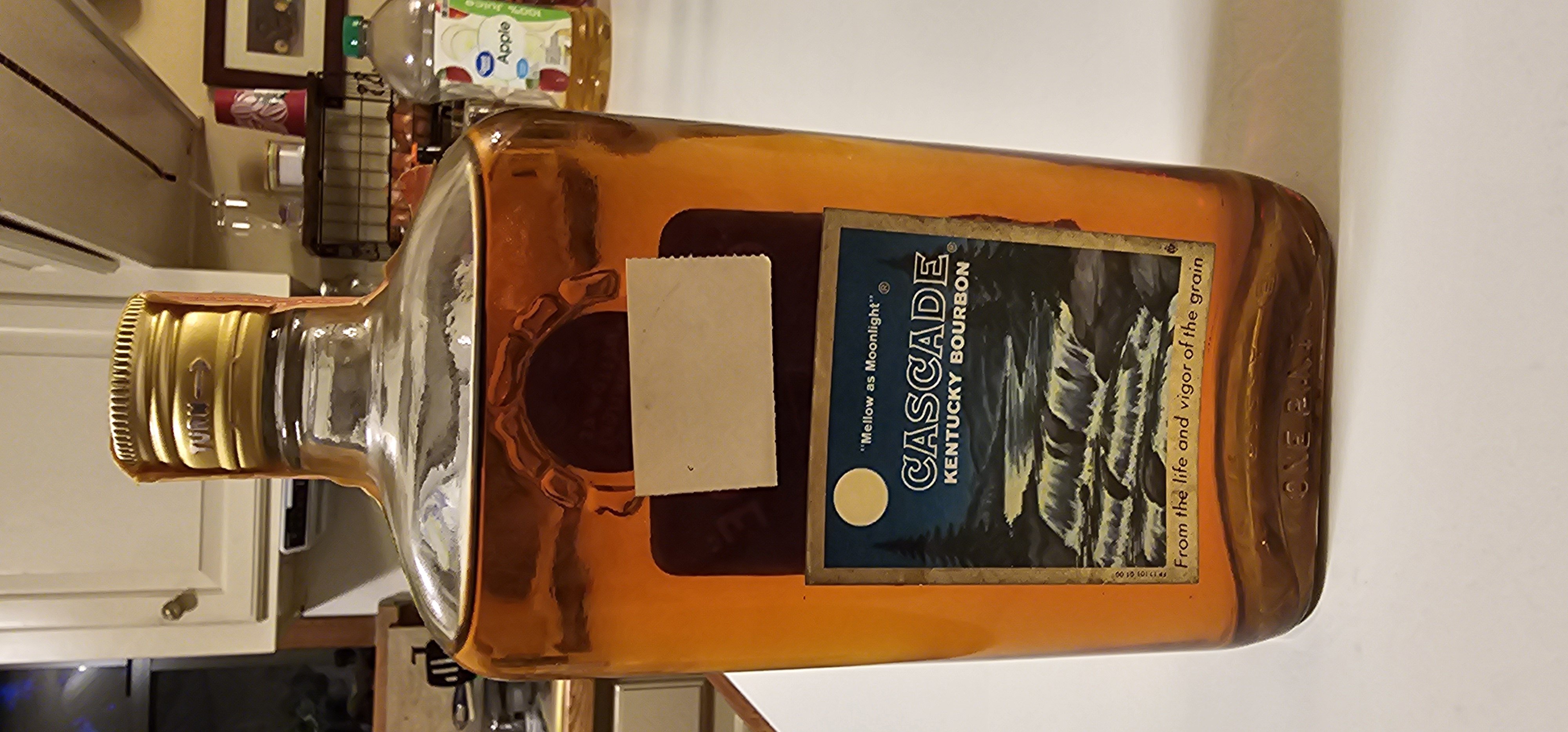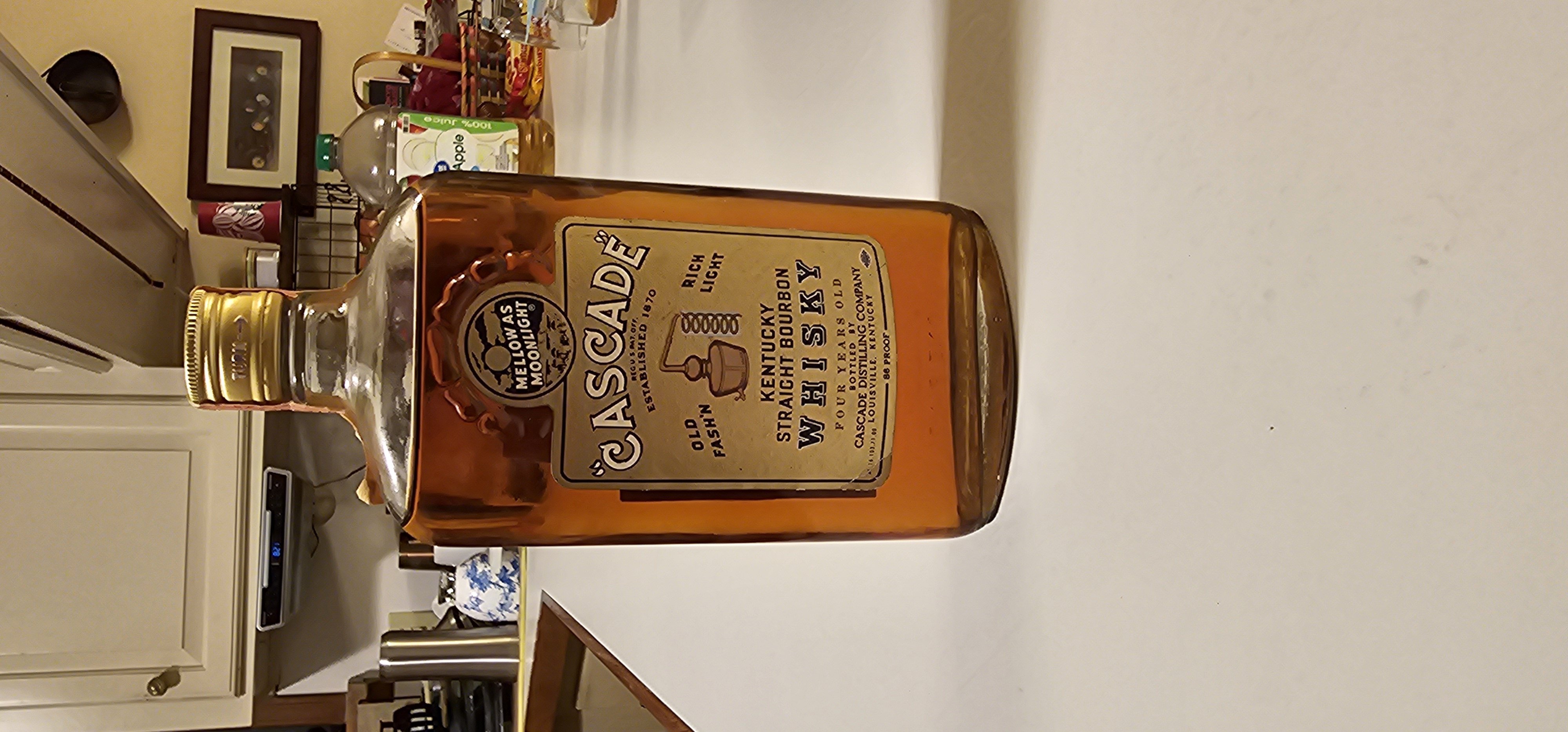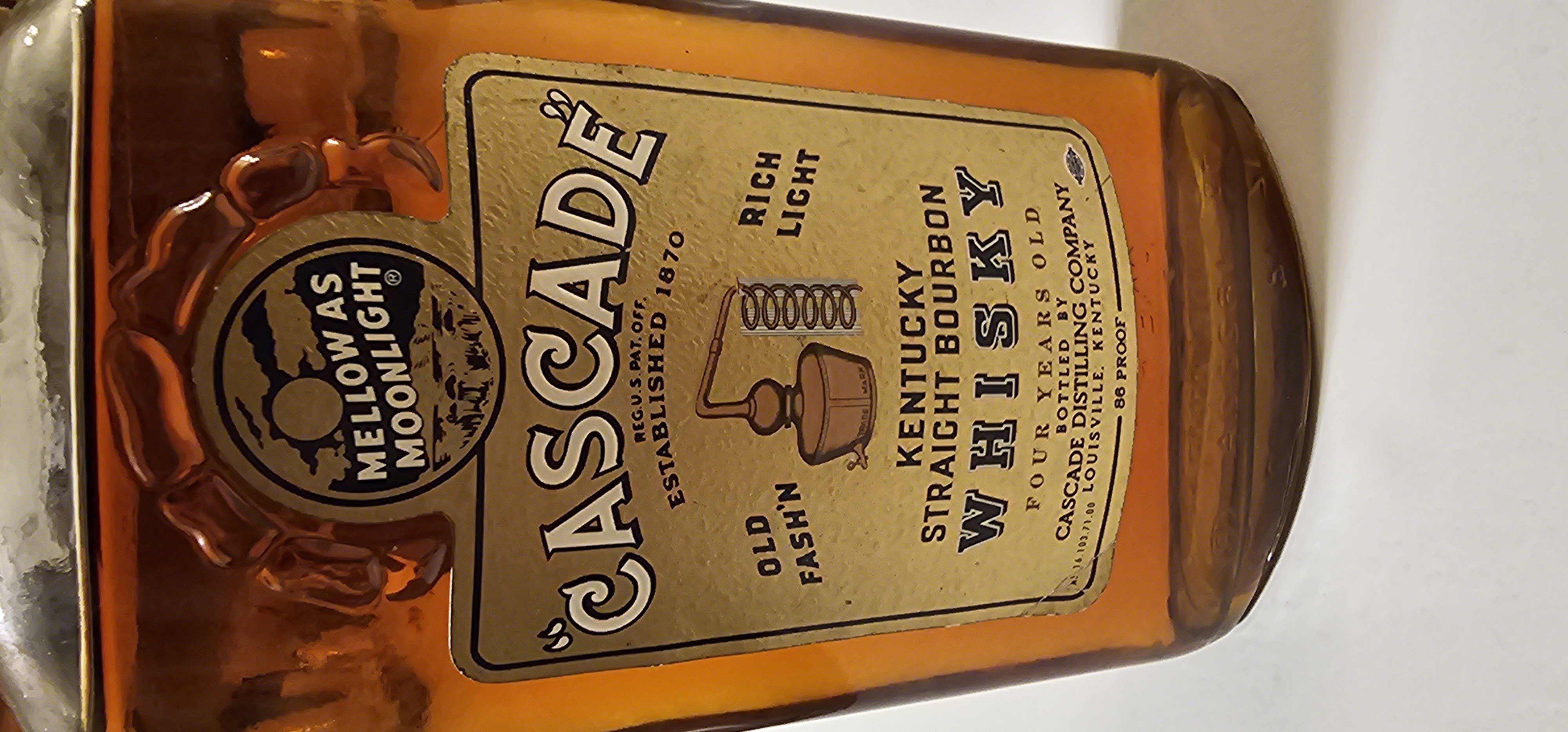 - Mellow as Moonlight "Cascade" Reg u.s. pat. Off. Old fash'n Rich light Kentucky Straight Bourbon Whisky Four years old Bottled by Cascade distilling company Louisville, Kentucky 86 proof