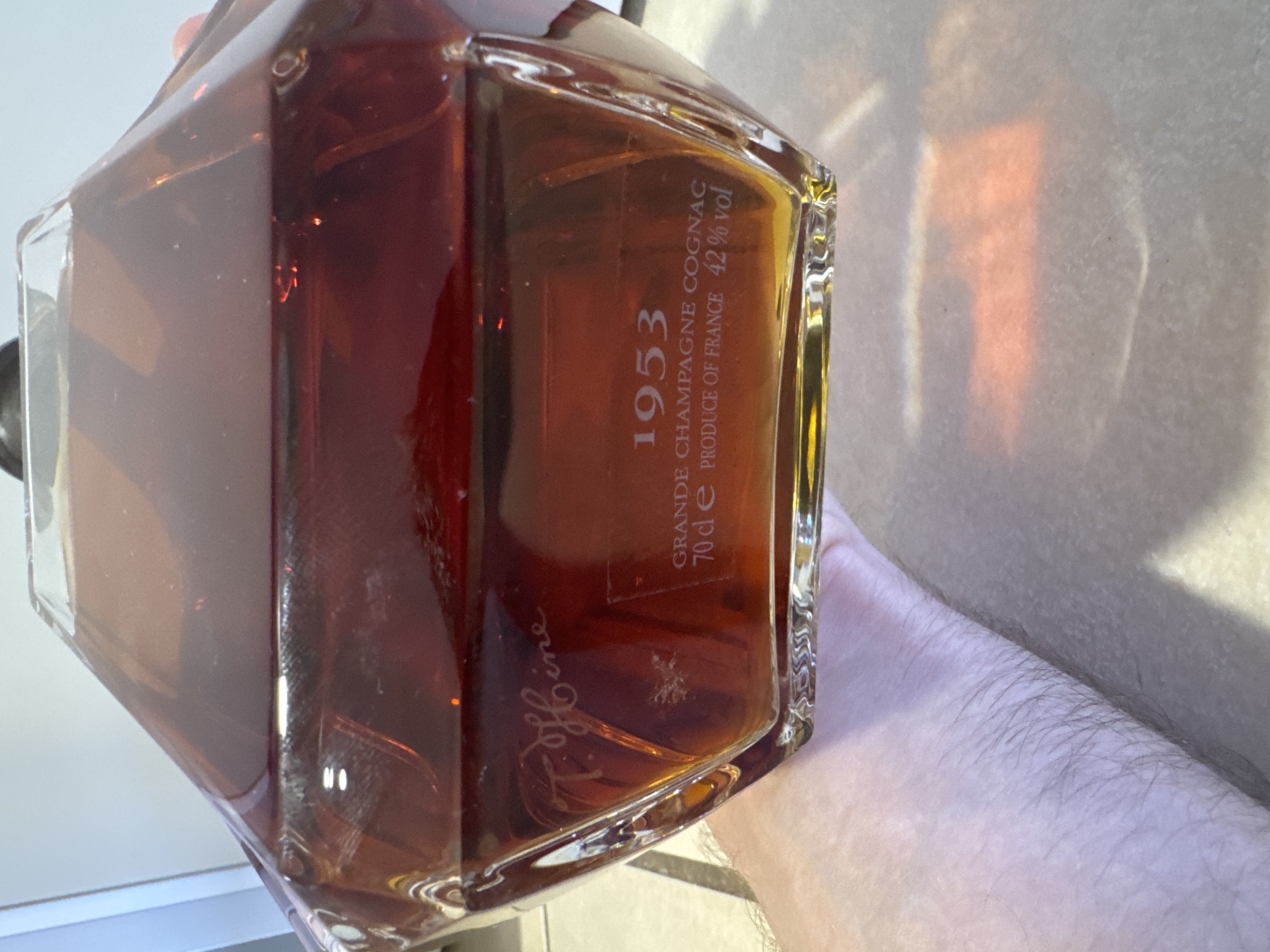 - There is only info on the bottom: Signature: “T.Hine” - 1953 Grand Champagne Cognac