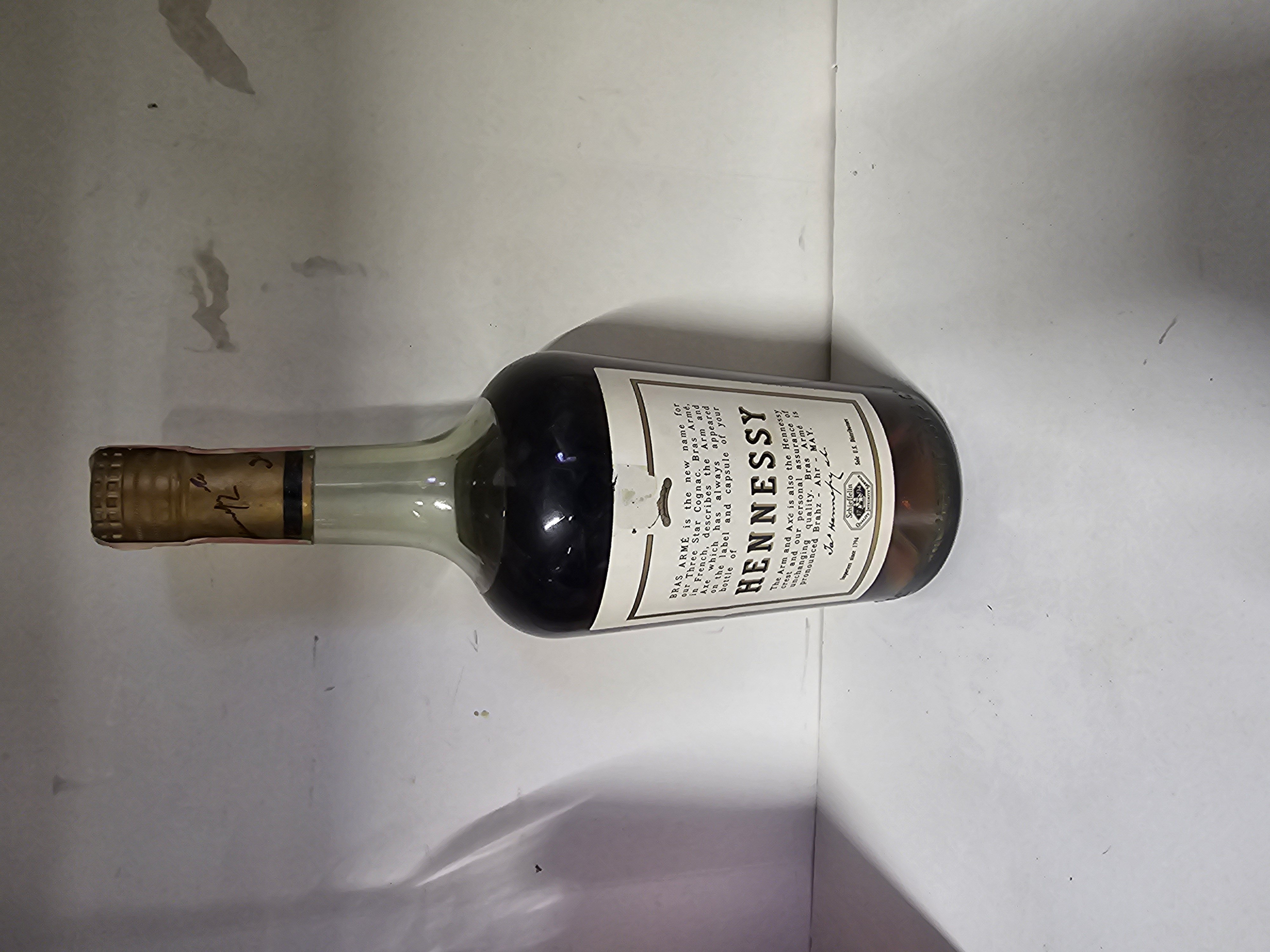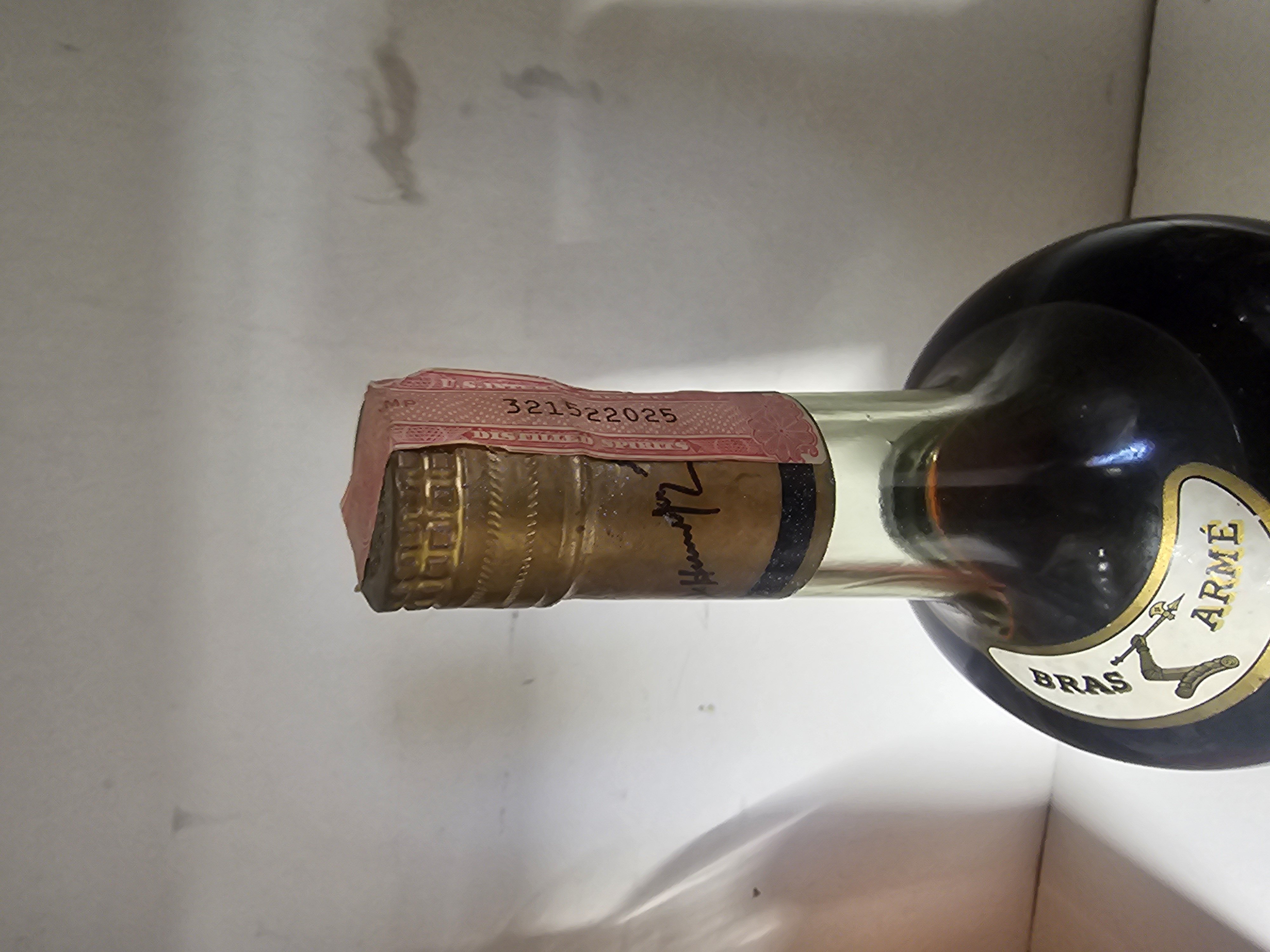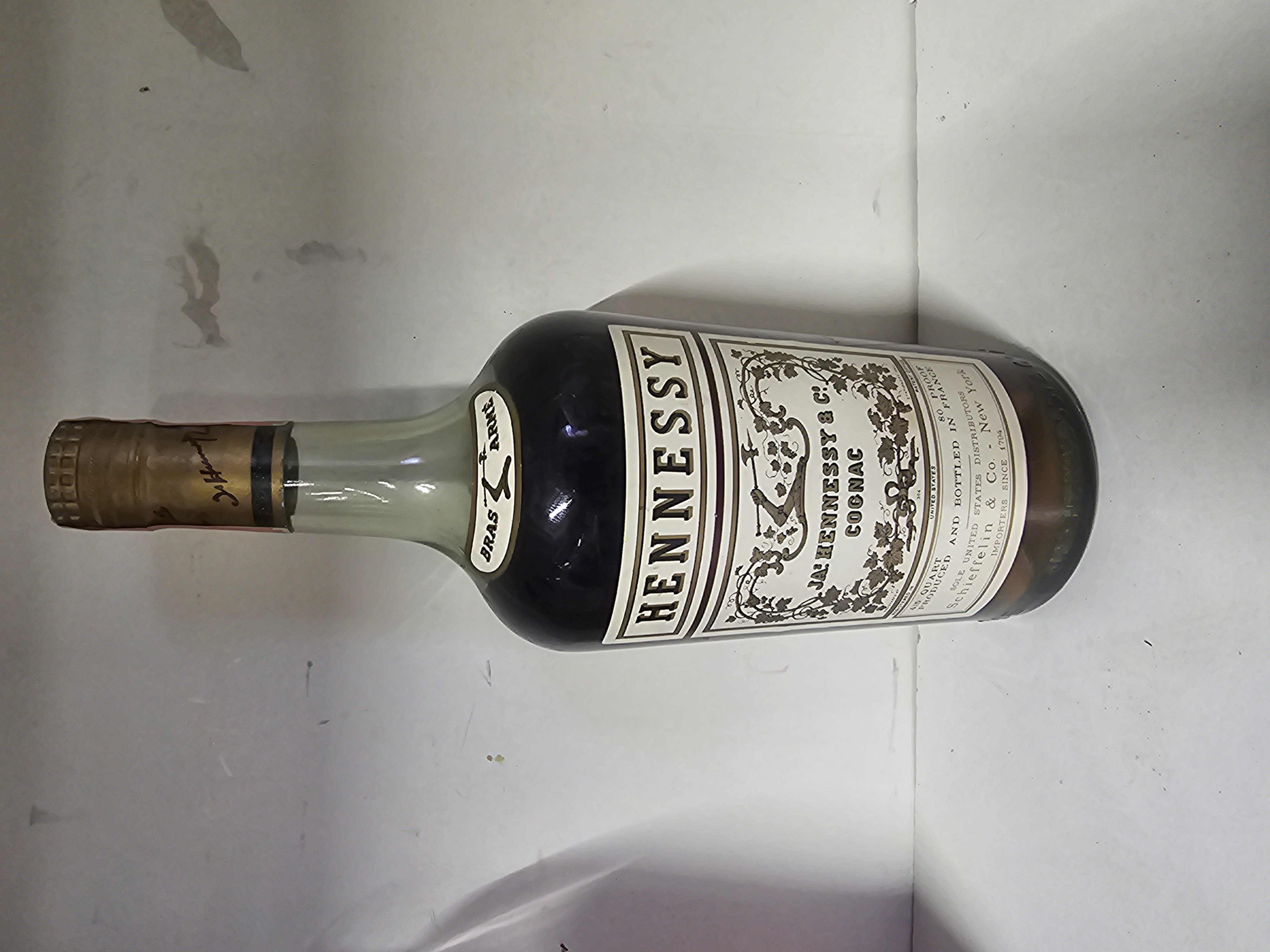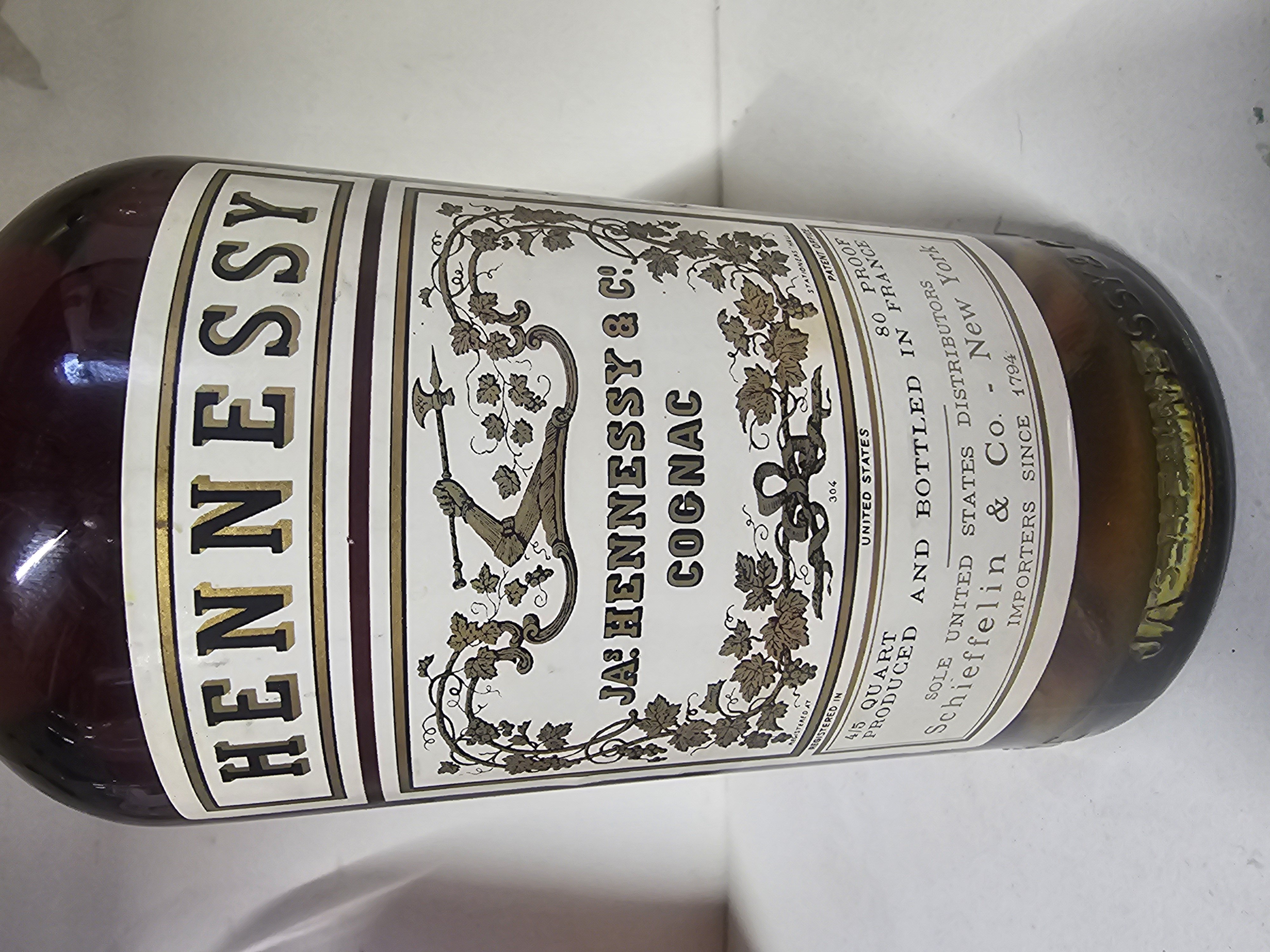 - Tax stamp Schieffelin & Co. New York, N.Y. Series 112 Tax number 321522025 Top label Bras Arme Bottom label Hennessy JA.s Hennessy & Co. Registered at 304 Stationers' Hall Registered in United States Patent Office 4/5 Quart 80 proof Produced and bottled in France Sole united states distributors Schieffelin & Co-New York Importers since 1794 Back Label BRAS ARME is the new name for our Three Star Cognac. BRAS ARME, in French, describes the Arm and Axe which has always appeared on the label and capsule of your bottle of HENNESSY The Arm and Axe is also the Hennessy crest and our personal assurance of unchanging quality. BRAS Arme is pronounced Brahz-Ahr-MAY. Signature Ja.Hennessy Importers since 1794 schieffelin 1794 Quality Integrity Service sole U.S. Distributors Bottom rim of bottle JAs Hennessy & Co France