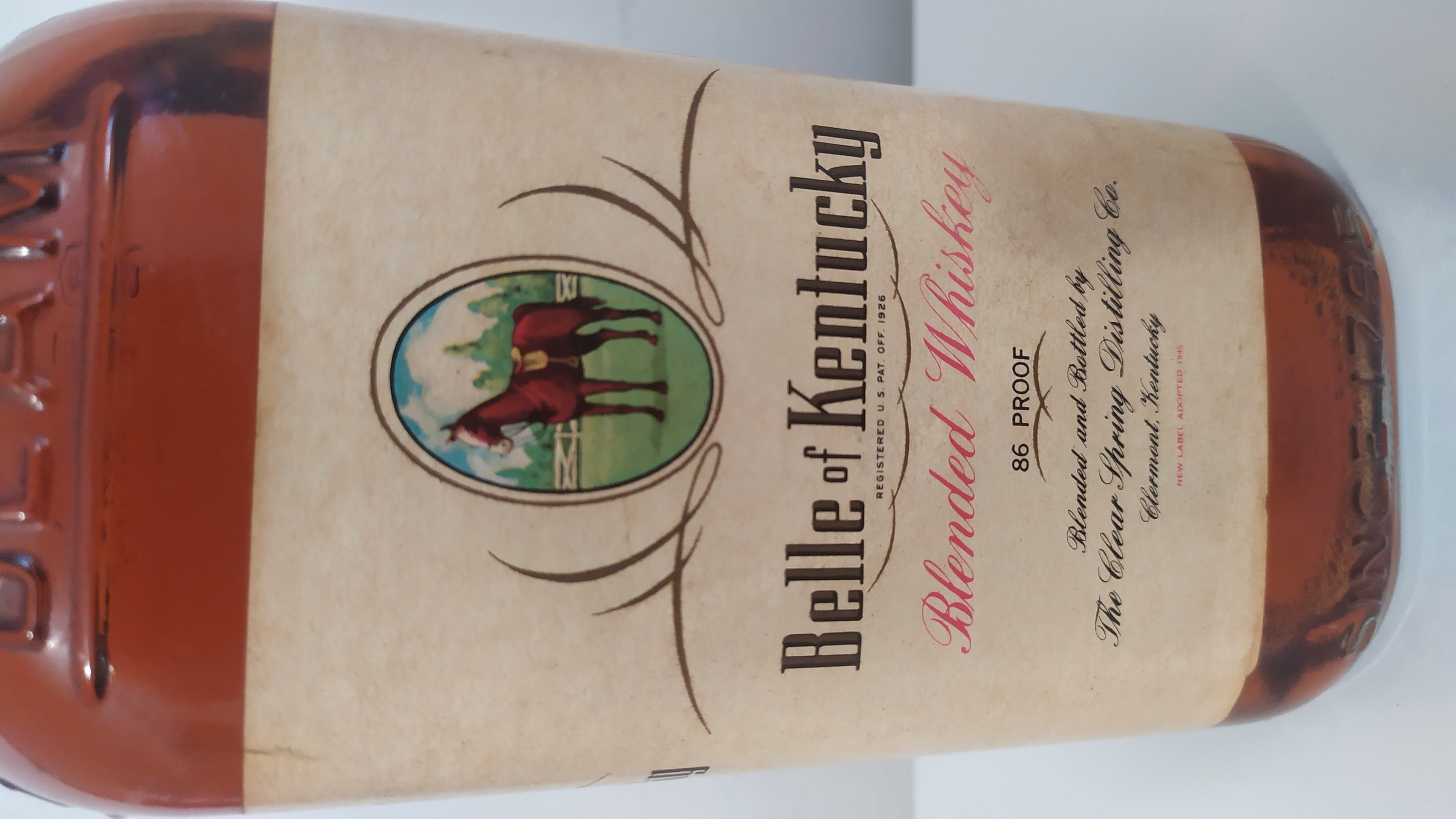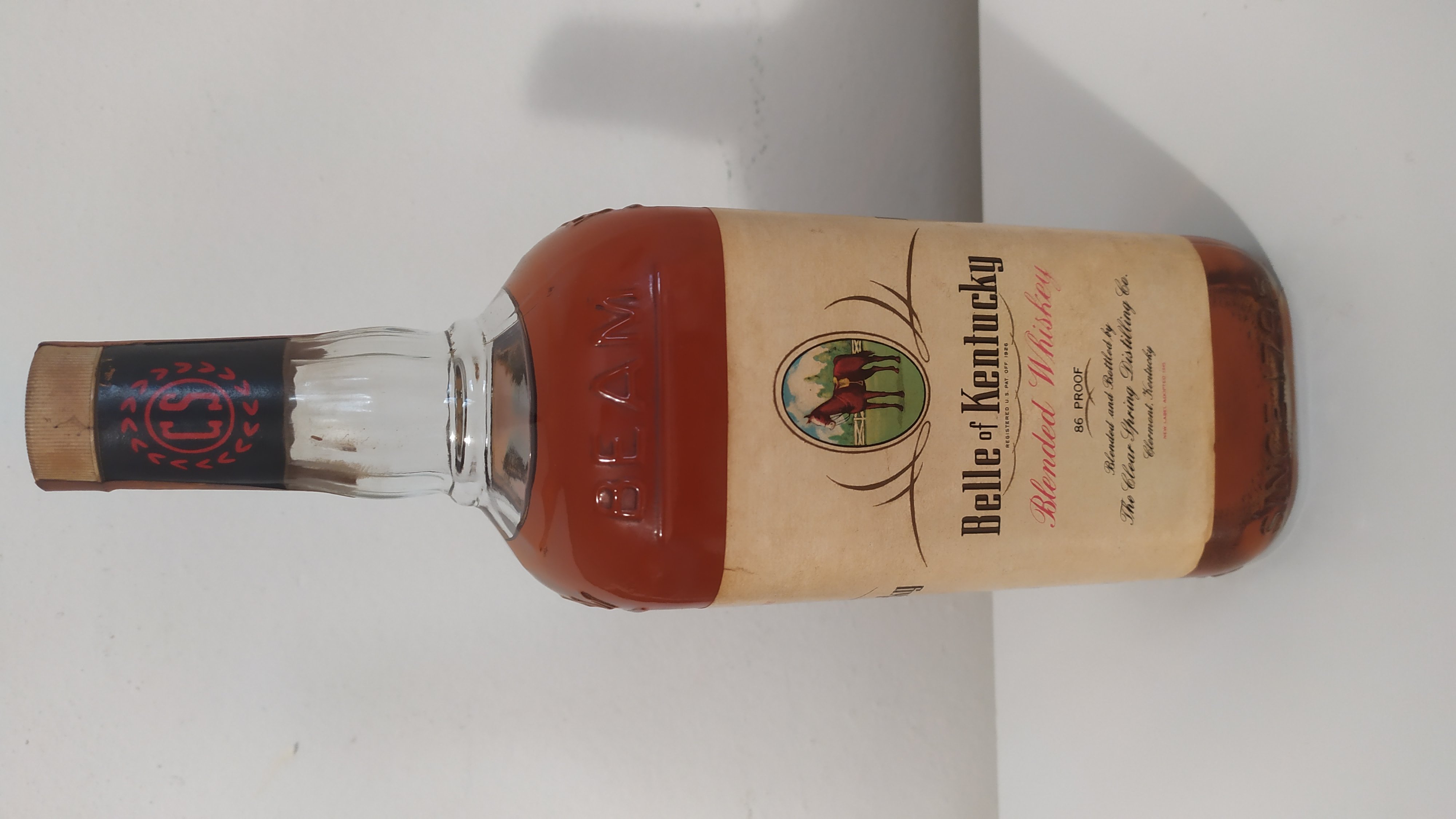 - Belle of kentucky Blended whisky 86 prof,blended and Bottled by The Clear Spring Distilling Co Clermont kentucky