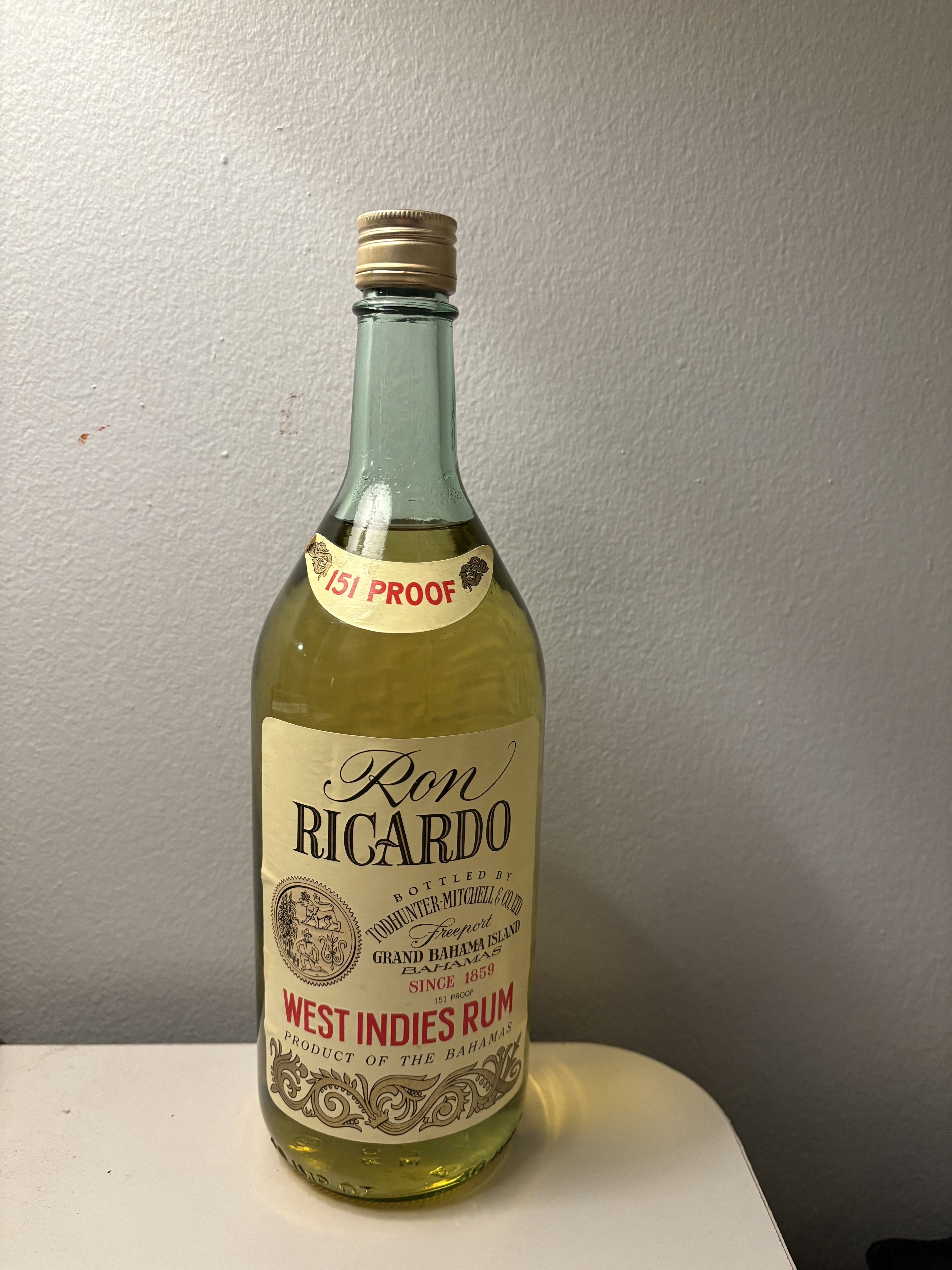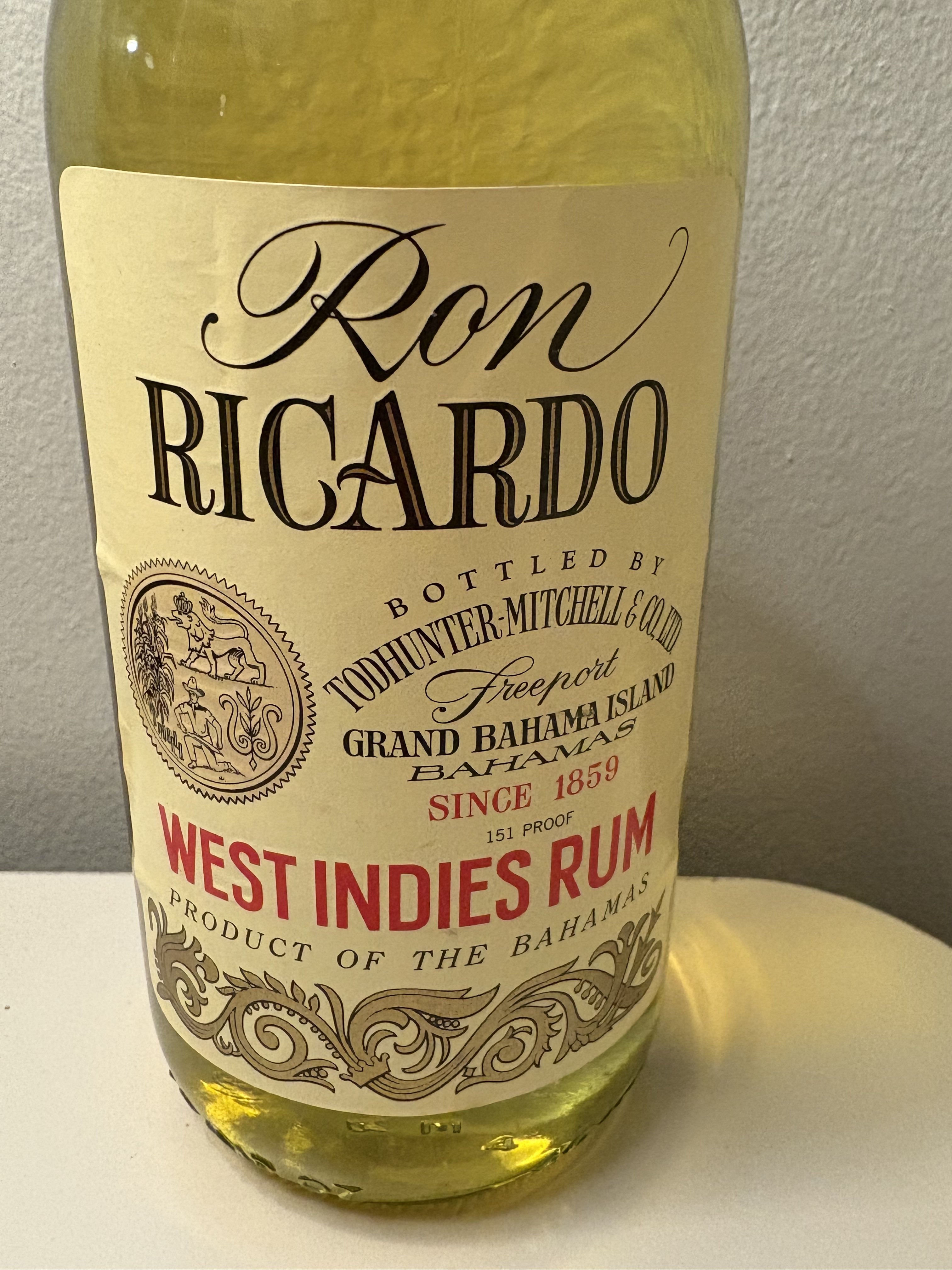 - 151 Proof Ron Ricardo Bottled by Todhunter Mitchell and CO. LTD. Grand Bahama Island Bahamas since 1859 West Indies Rum Product of the Bahamas
