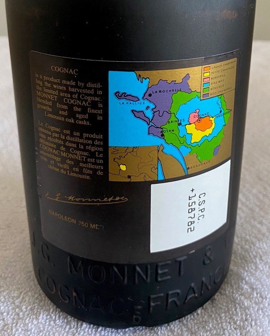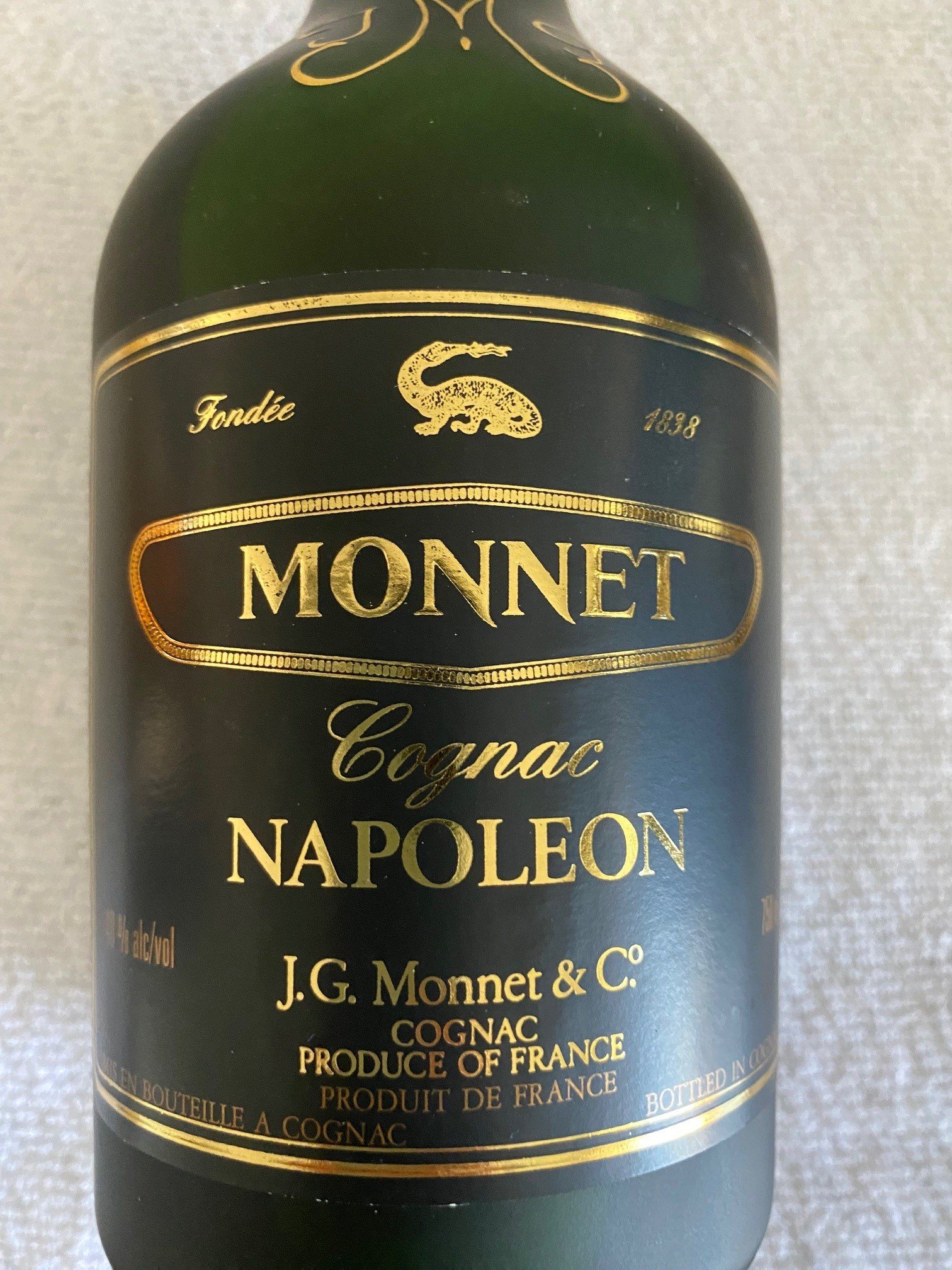 - Fondée 1838 MONNET Cognac NAPOLEON 40% alc/vol 750 ml J.G. Monnet & Cº COGNAC PRODUCT OF FRANCE MIS EN BOUTEILLE A COGNAC BOTTLED IN COGNAC