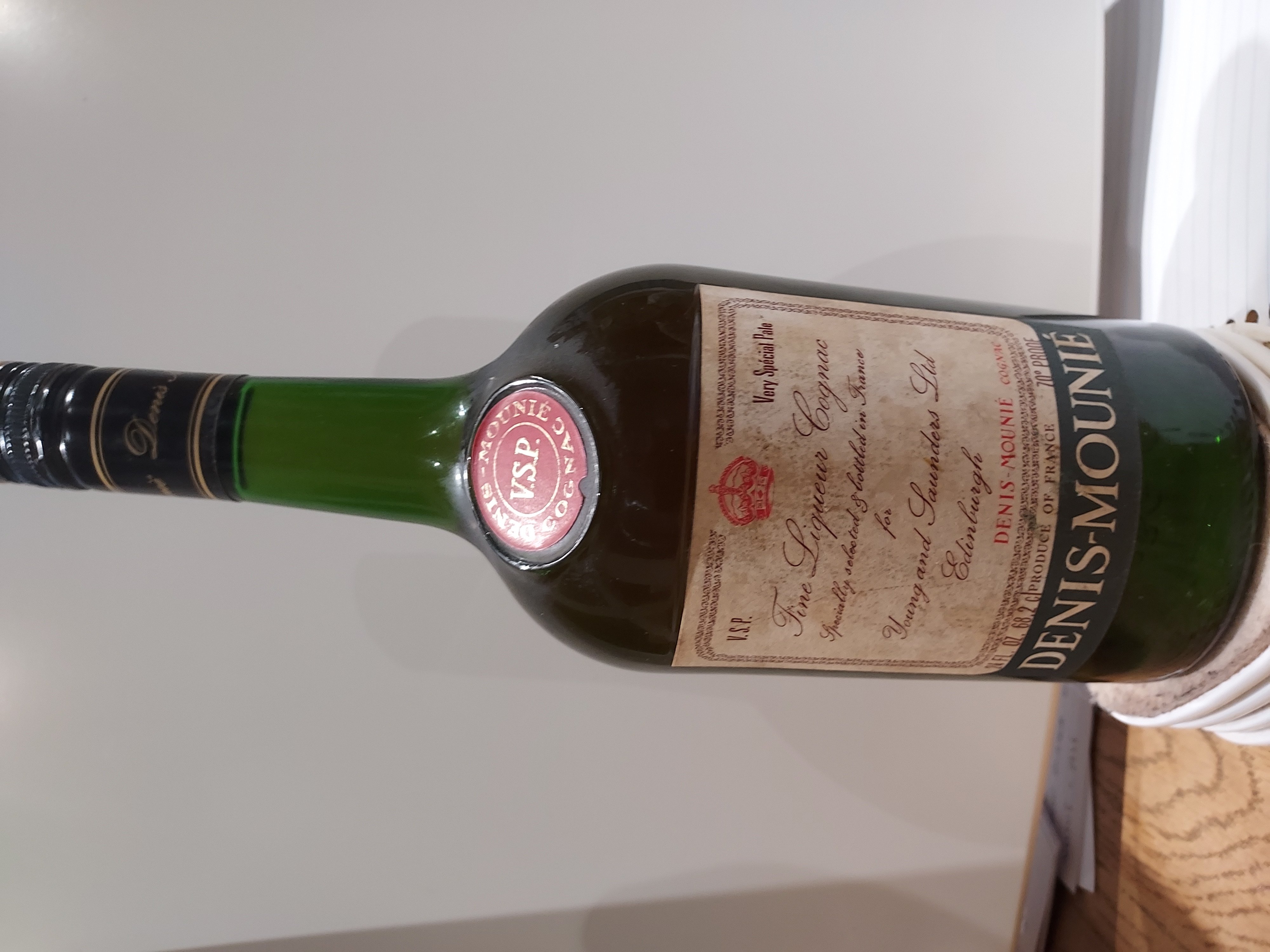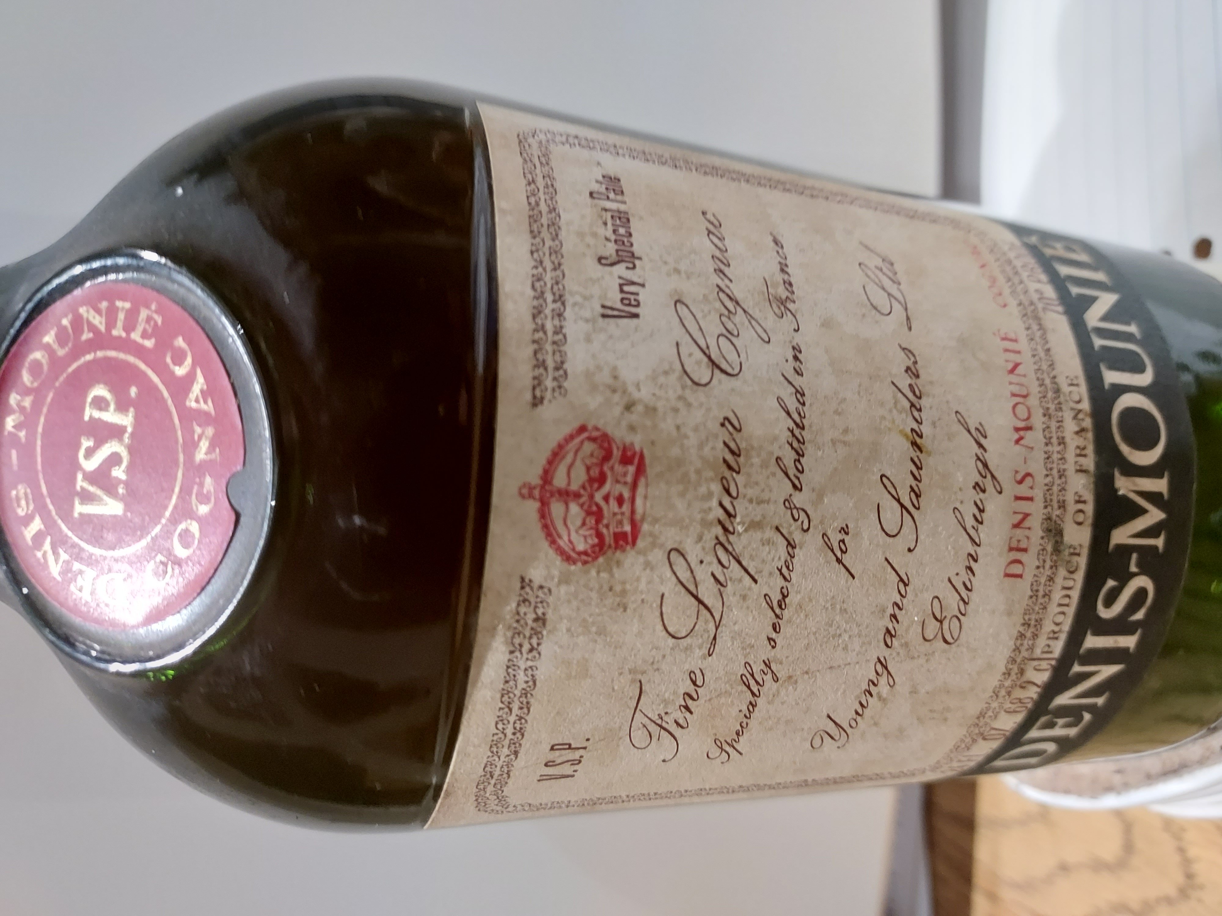 - VSP ( Red Crown image) Very Special Pale Fine Liquers Cognac Specially selected & bottled in France for Young & Saunders Ltd. Edinburgh DENIS - MOUNIE COGNAC 24FL OZ 68.2cl 70% Proof .. Metal cap - states Denis Mounie Est 1838