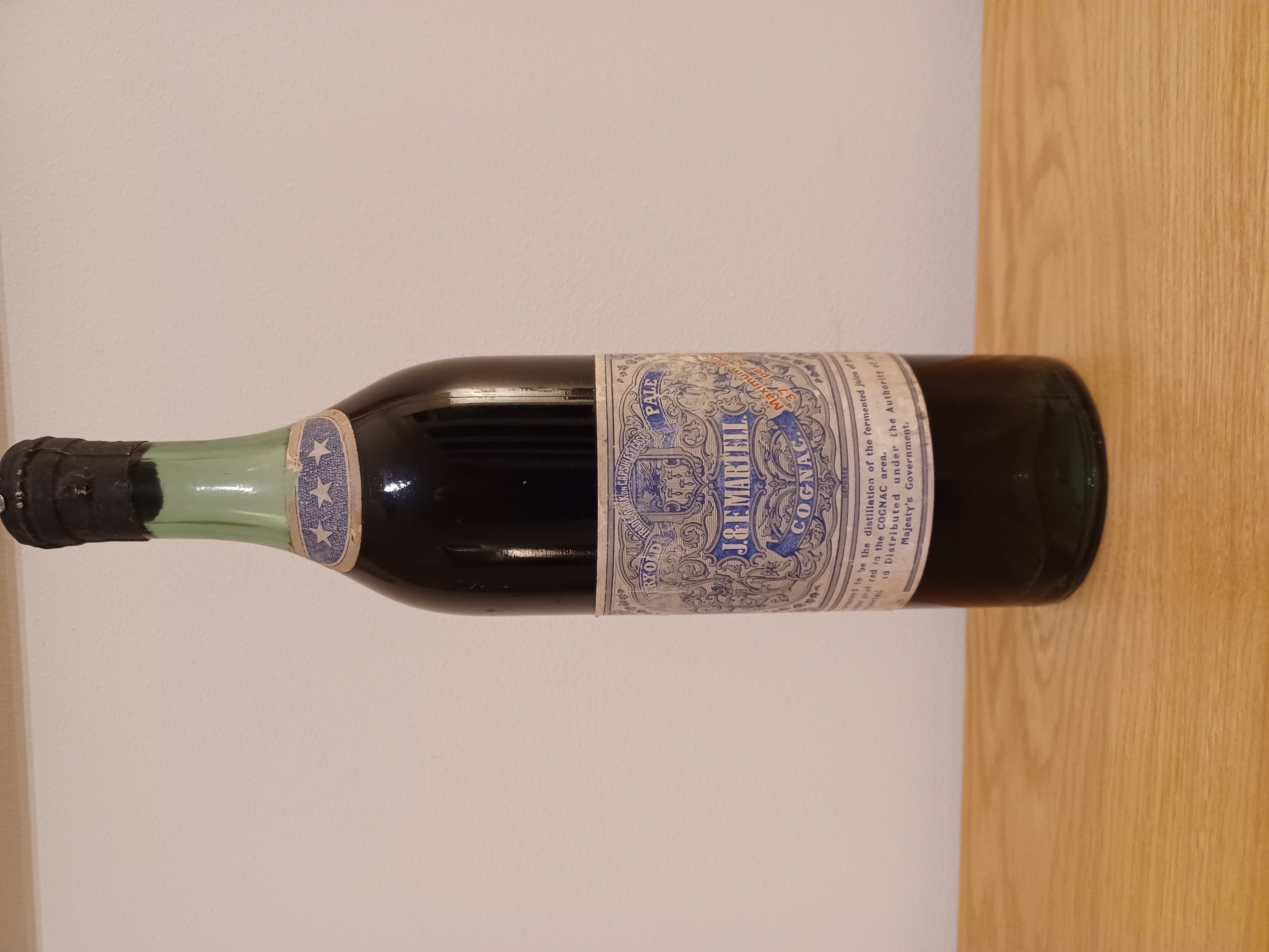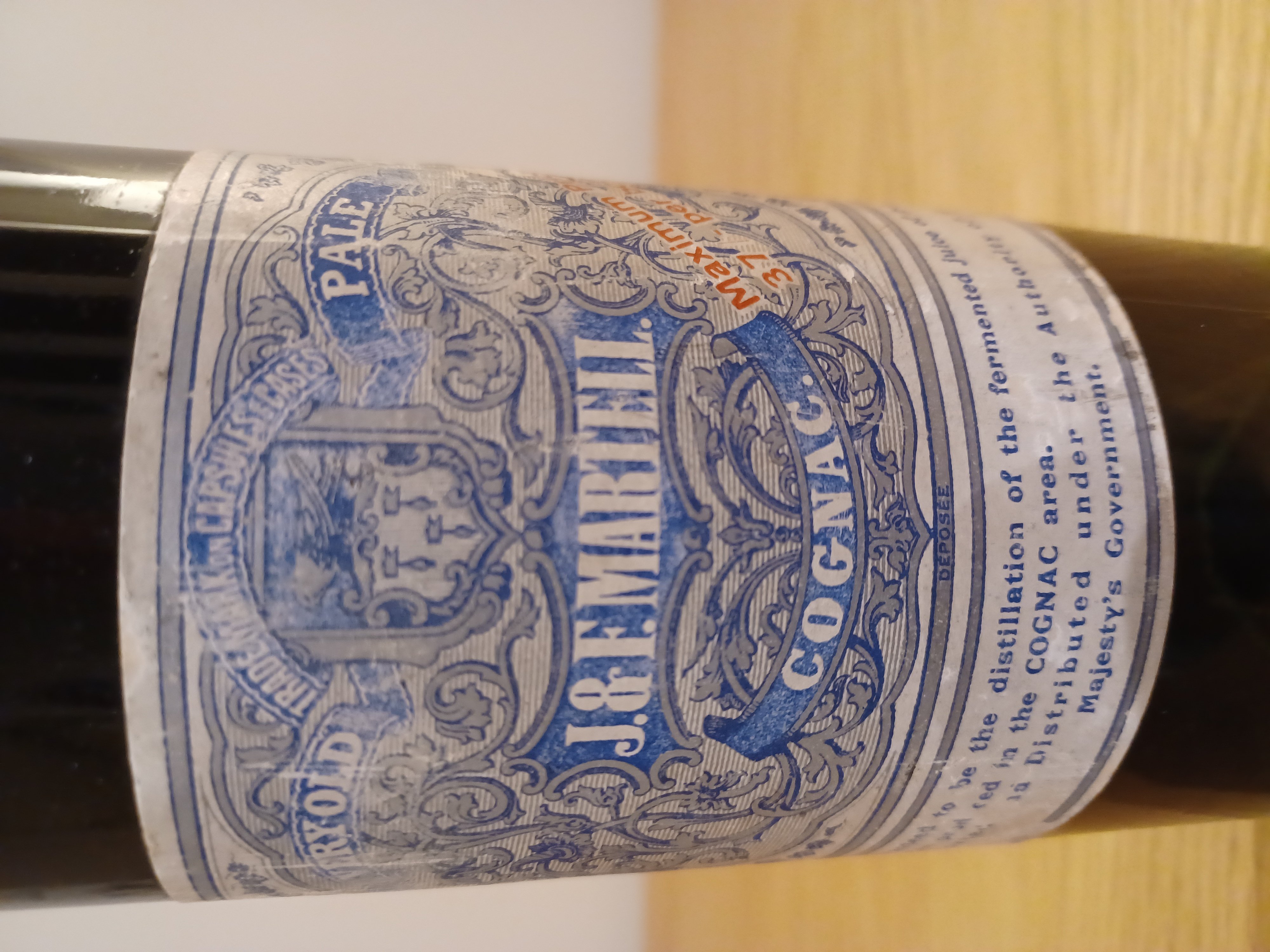 - Three stars. Very old Pale Cognac , J&F Martell (Trademark on Capsules& Cases). Maximumprice 37/- per bottle. Guaranteed to be the distillation the fermented juice of fresh grapes produced in the COGNAC area.Imported and Distributed under the A uthority of His Majsety's Government.