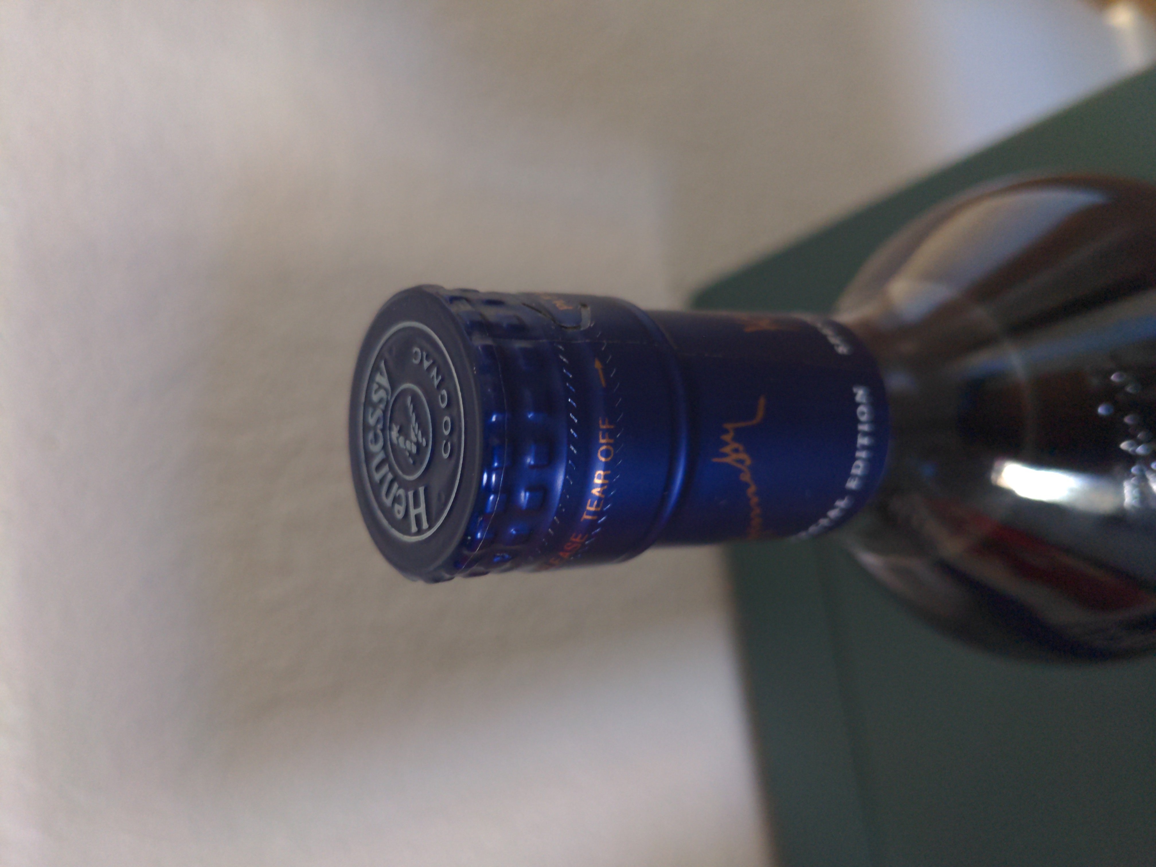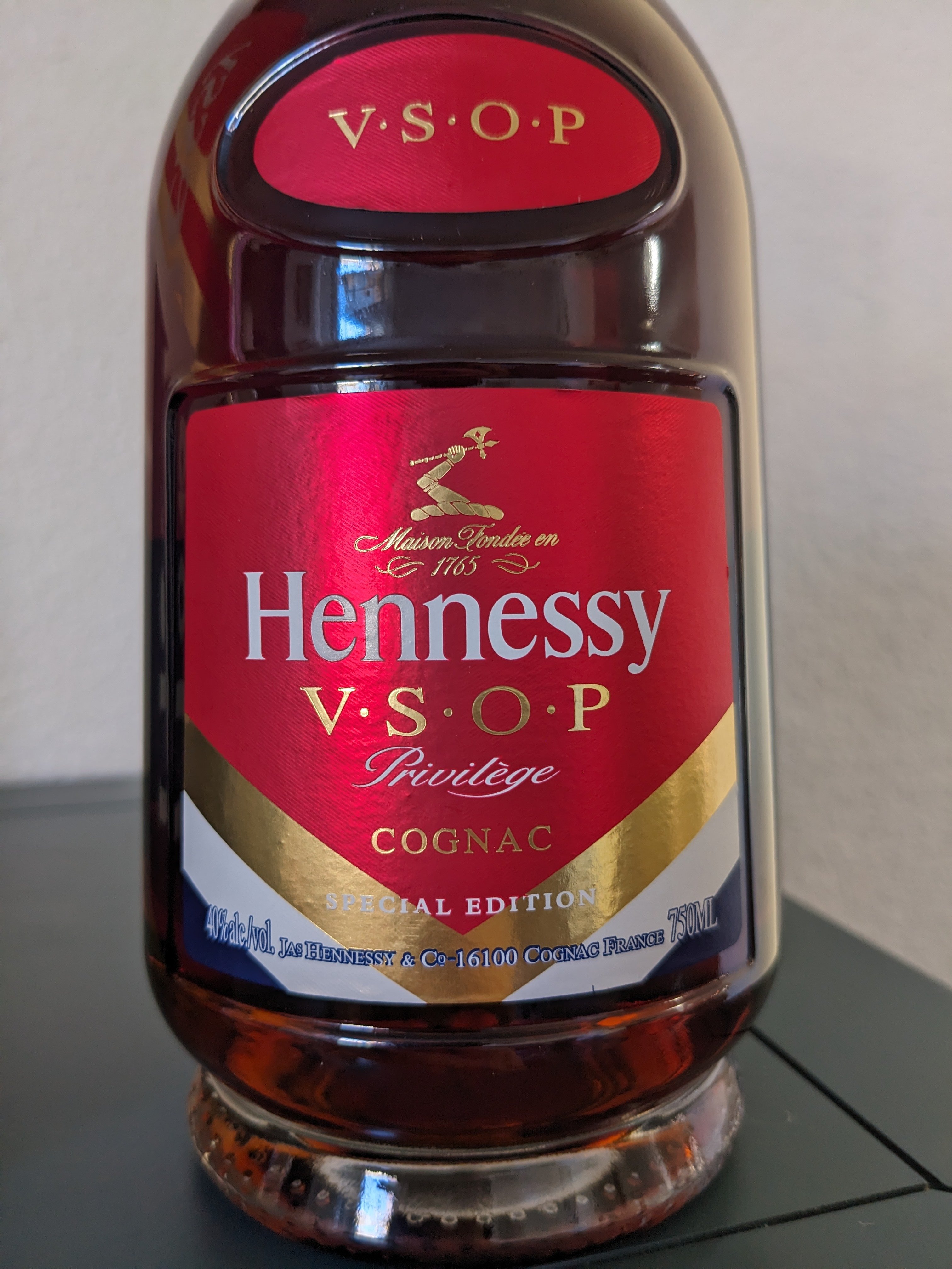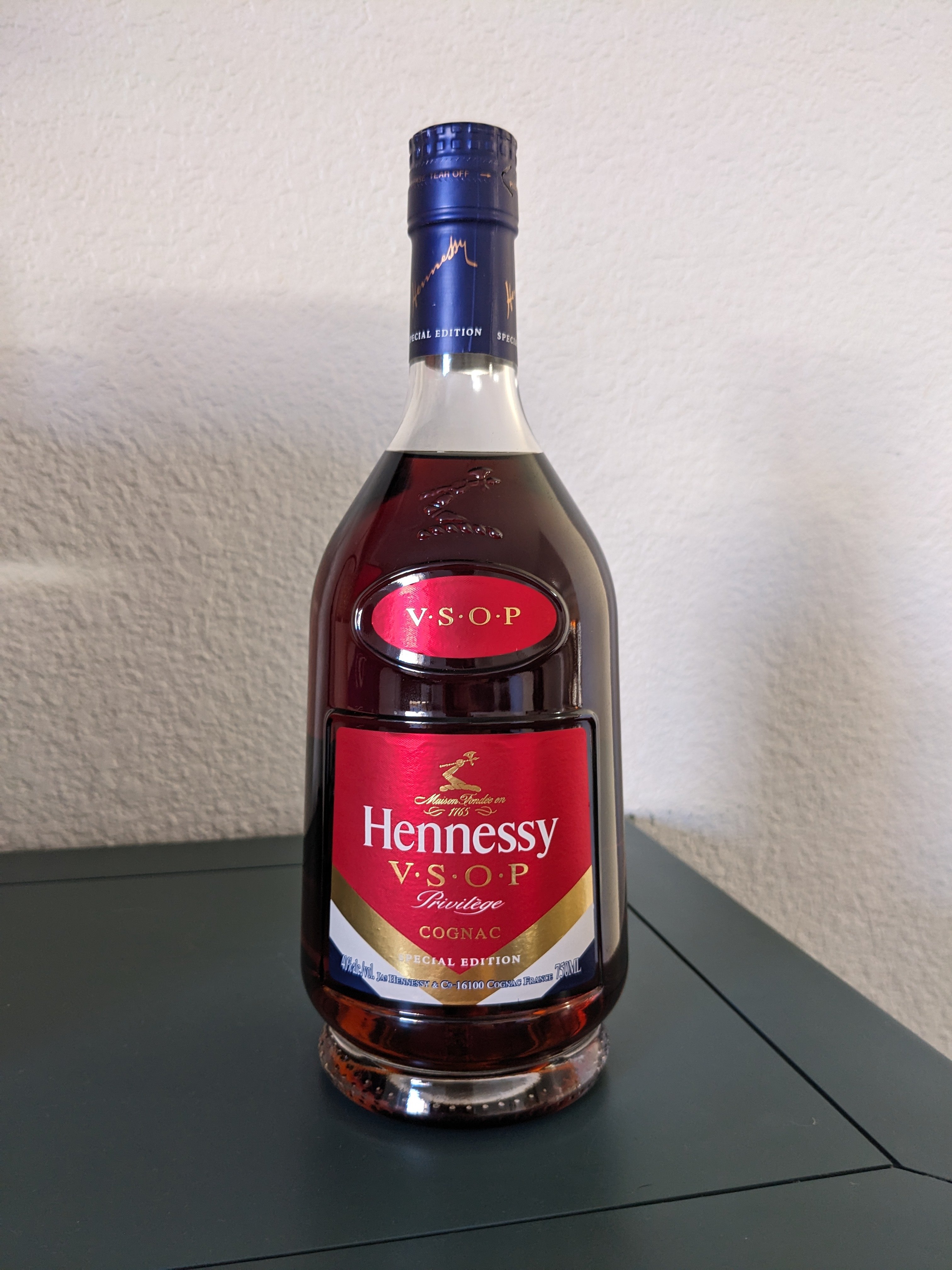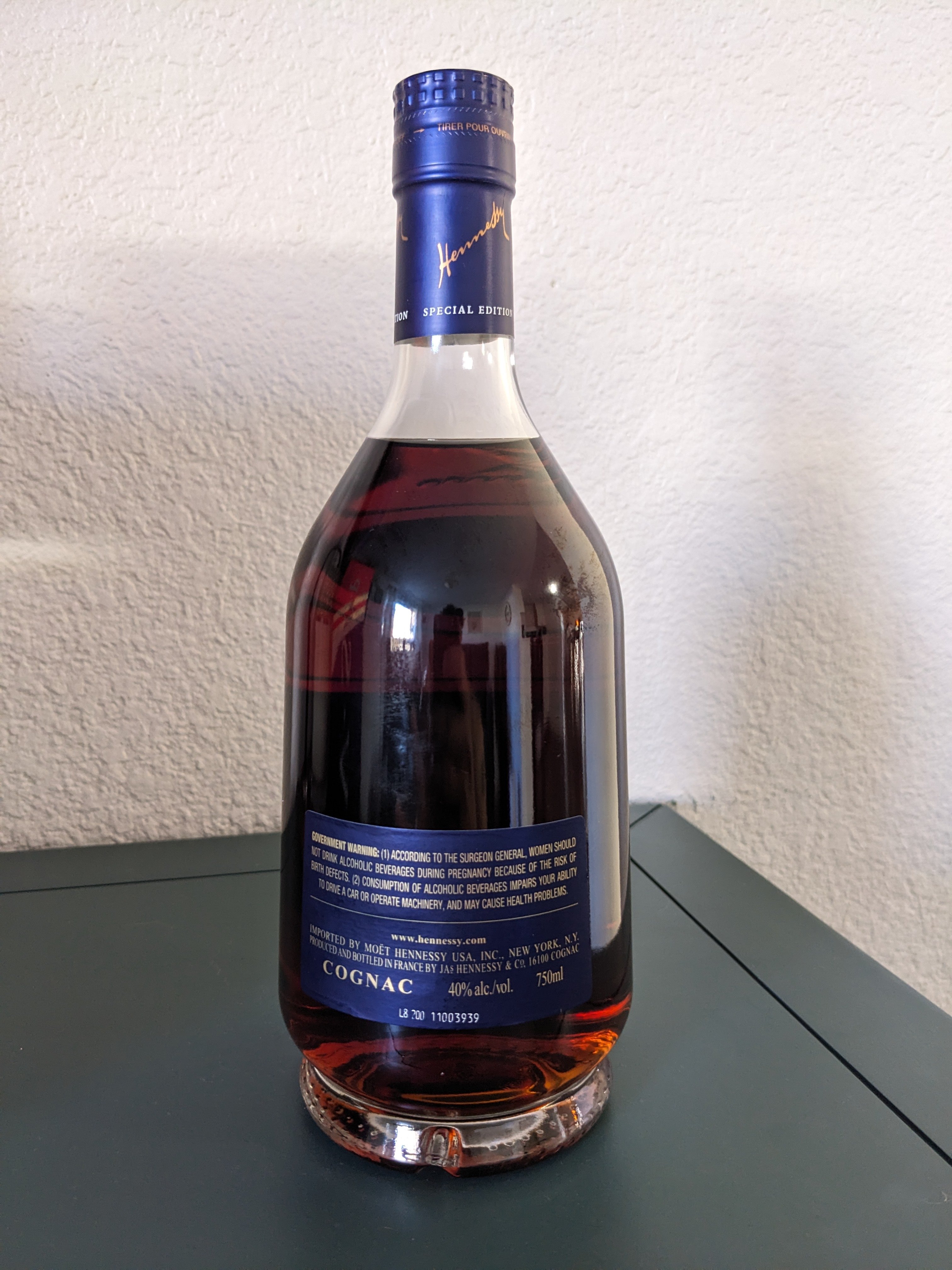 - 1) Text on label: V·S·O·P Maison Fondée en 1765 Hennessy V·S·O·P Privilège COGNAC SPECIAL EDITION 40% alc./vol. Jas. HENNESSY & Co - 16100 COGNAC FRANCE 750mL GOVERNMENT WARNING: (1) ACCORDING TO THE SURGEON GENERAL, WOMEN SHOULD NOT DRINK ALCOHOLIC BEVERAGES DURING PREGNANCY BECAUSE OF THE RISK OF BIRTH DEFECTS. (2) CONSUMPTION OF ALCOHOLIC BEVERAGES IMPAIRS YOUR ABILITY TO DRIVE A CAR OR OPERATE MACHINERY, AND MAY CAUSE HEALTH PROBLEMS. www.hennessy.com IMPORTED BY MOËT HENNESSY USA, INC., NEW YORK, N.Y. PRODUCT OF FRANCE BOTTLED IN FRANCE BY HENNESSY & Co. 16100 COGNAC FRANCE COGNAC 40% alc./vol. L8 320 11003939 750ml SPECIAL EDITION PLEASE TEAR OFF Hennessy COGNAC HONORING – ALL WHO SERVED JAS HENNESSY & Co • COGNAC FRANCE 2) Visual elements: Neck/capsule: Blue metallic foil with "Hennessy" in a gold script font and "SPECIAL EDITION" in gold sans-serif block letters. Cap top: Embossed circular emblem featuring "Hennessy" in script with a grape cluster graphic, and "COGNAC" in block sans-serif below it. Upper front label (oval): Red background with "V·S·O·P" in gold sans-serif bold font. Mid front label (main label): Red background. A golden "Bras Armé" (arm holding an axe) emblem appears above "Maison Fondée en 1765". The "Hennessy" logo is in a script font, "V·S·O·P" in bold sans-serif, and "Privilège" in an elegant cursive/script font. "COGNAC" and "SPECIAL EDITION" are in sans-serif block font. The lower section of this label features gold and white diagonal stripes over the red background. Back label: Blue background with all text in a simple sans-serif block font. Box (visible portion): A blue square with a golden grape cluster emblem at the top. The main face is red, mirroring the bottle's main label with the "Bras Armé", "Hennessy" script, and other textual elements. The lower section of the box features prominent gold, red, and white diagonal stripes that transition into a solid blue base. "HONORING – ALL WHO SERVED" is printed in white sans-serif font on the blue base. 3) Fill level estimate: well above shoulder into neck: great