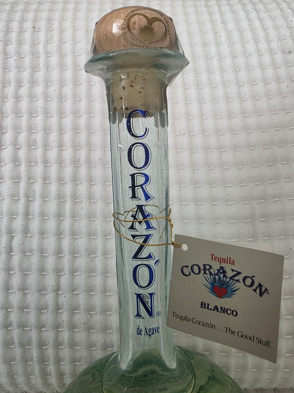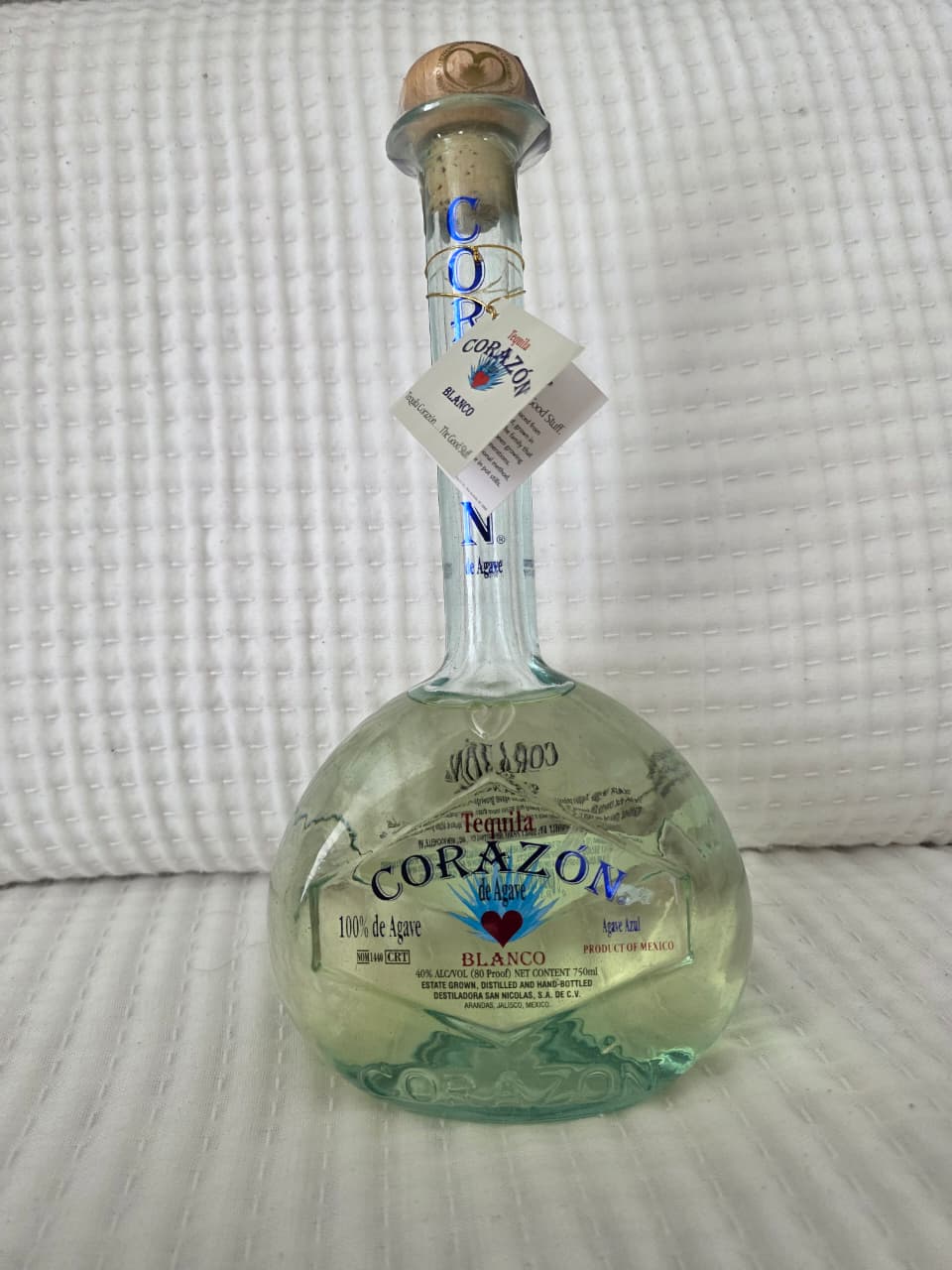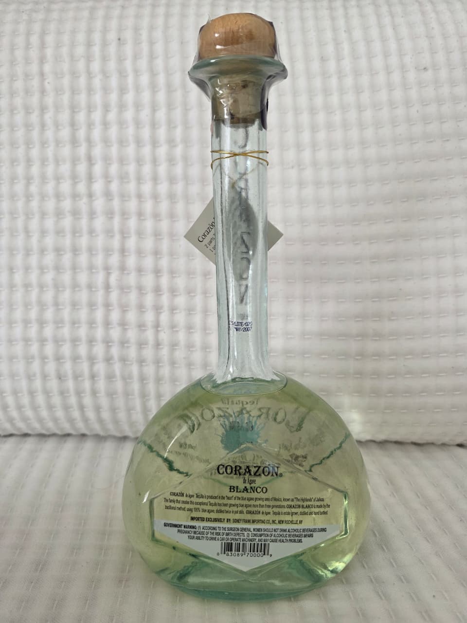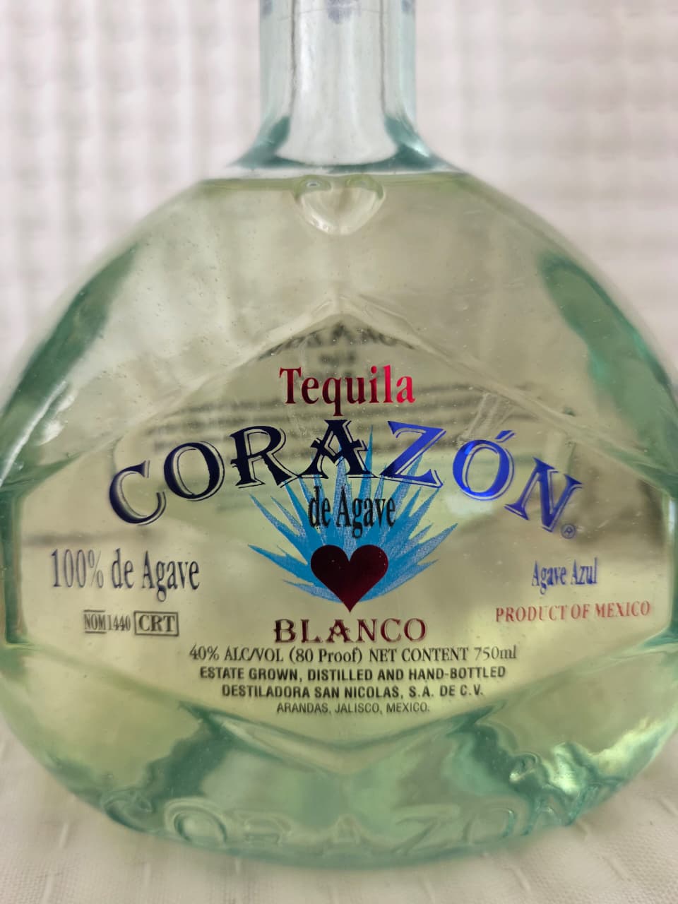 - 1) Text on label: Front Label: Tequila CORAZÓN de Agave 100% de Agave NOM 1440 CRT BLANCO 40% ALC/VOL. (80 Proof) NET CONTENT 750ml ESTATE GROWN, DISTILLED AND HAND-BOTTLED DESTILADORA SAN NICOLAS, S.A. DE C.V. ARANDAS, JALISCO, MEXICO. Agave Azul PRODUCT OF MEXICO Back Label: CORAZÓN de Agave Tequila is produced in the “heart” of the blue agave growing areas of Mexico, known as “The Highlands” of Jalisco. The family that owns our distillery has been growing and harvesting agave for 4 generations, perfecting their craft. We are guided by the traditional method using 100% blue agave, distilled twice in pot stills. CORAZÓN de Agave Tequila is estate grown, distilled and hand-bottled. IMPORTED AND EXCLUSIVELY BY: SIDNEY FRANK IMPORTING CO., INC., NEW ROCHELLE, NY GOVERNMENT WARNING: (1) ACCORDING TO THE SURGEON GENERAL, WOMEN SHOULD NOT DRINK ALCOHOLIC BEVERAGES DURING PREGNANCY BECAUSE OF THE RISK OF BIRTH DEFECTS. (2) CONSUMPTION OF ALCOHOLIC BEVERAGES IMPAIRS YOUR ABILITY TO DRIVE A CAR OR OPERATE MACHINERY, AND MAY CAUSE HEALTH PROBLEMS. 9 985393700008 Neck (embossed on glass): CORAZÓN de Agave Cork Stopper (embossed on wood): DENOMINACIÓN DE ORIGEN Hang Tag: Tequila CORAZÓN BLANCO Tequila Corazón... The Good Stuff. 2) Visual elements: Emblem/Logo: A stylized blue agave plant with a prominent red heart at its center appears on the mid-front label, hang tag, and is engraved on the wooden box. A smaller red heart is on a black strip around the cork. The same agave heart logo is printed on the accompanying shot glasses. Embossing: "CORAZÓN de Agave" is embossed vertically along the length of the neck. "DENOMINACIÓN DE ORIGEN" is embossed in a circular pattern on the top of the wooden cork stopper. Strip label: A narrow black strip with a red heart emblem is visible around the cork. Bottle Shape: The bottle features a distinctive flattened, circular body tapering into a long, slender neck. Packaging: A light-colored wooden box with "Tequila CORAZÓN de Agave BLANCO 100% BLUE AGAVE" engraved on the lid. The interior is lined with red velvet, custom-fitted for the bottle and four shot glasses. Apparent font style(s): Main brand "CORAZÓN": A distinctive, decorative sans-serif font, often in blue, with an accent mark. "Tequila" (front label): A bold serif font in red. "de Agave": A clear, smaller sans-serif font. Descriptive text (e.g., "100% de Agave", "BLANCO", ABV, back label text): Primarily legible sans-serif fonts in various weights. Hang tag slogan "The Good Stuff": A flowing cursive/script font. 3) Fill level estimate: above shoulder: good Reason: The liquid level is visible at the very top of the bottle's wide body, just where it begins to narrow into the neck.