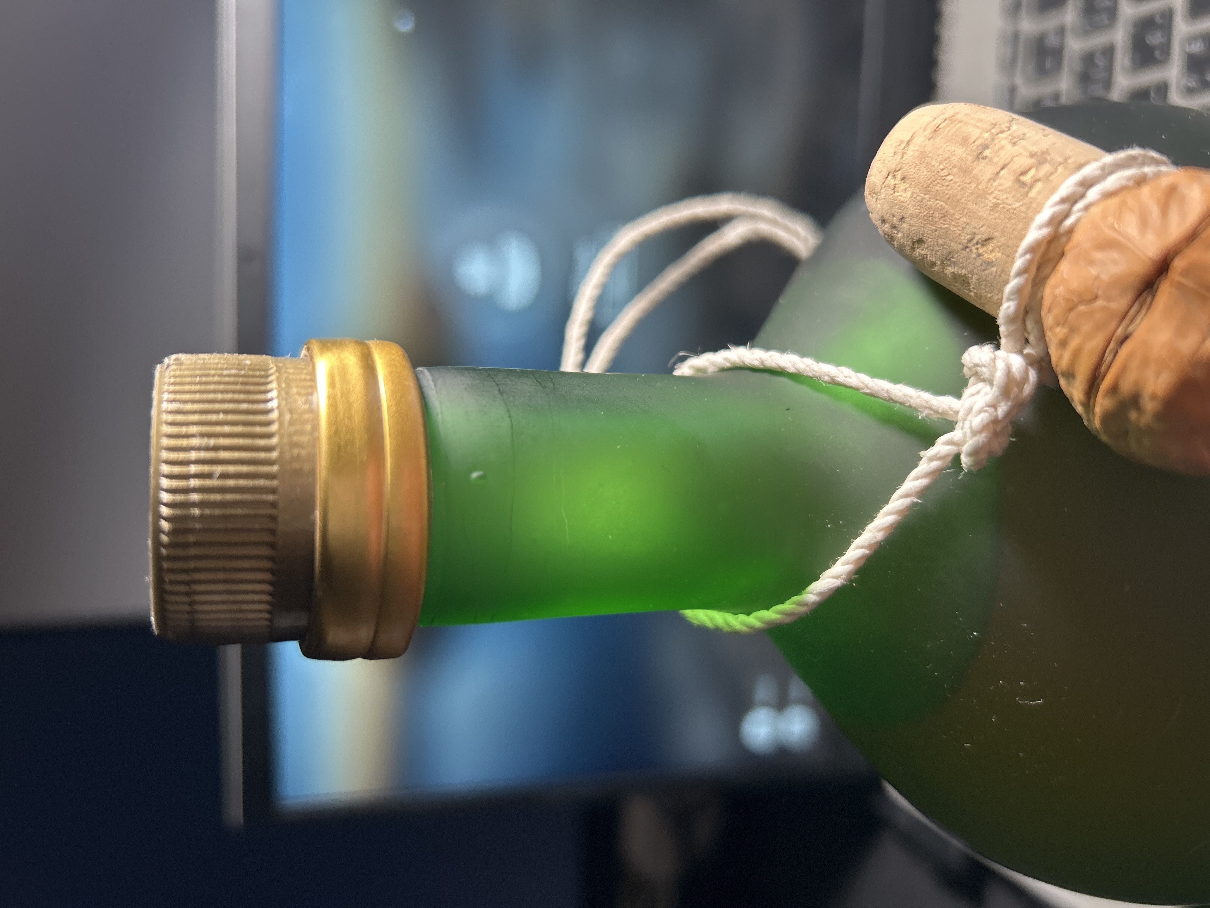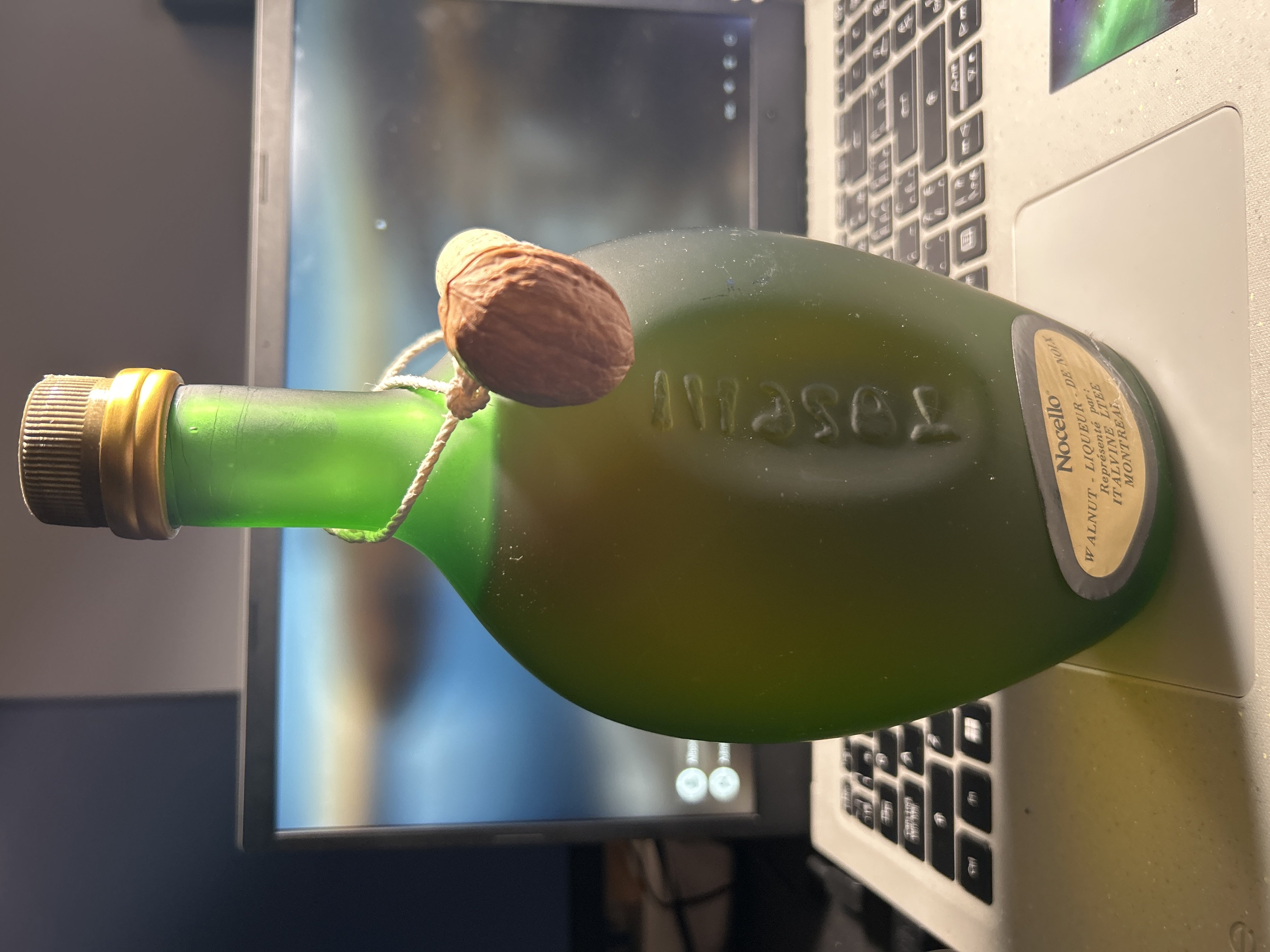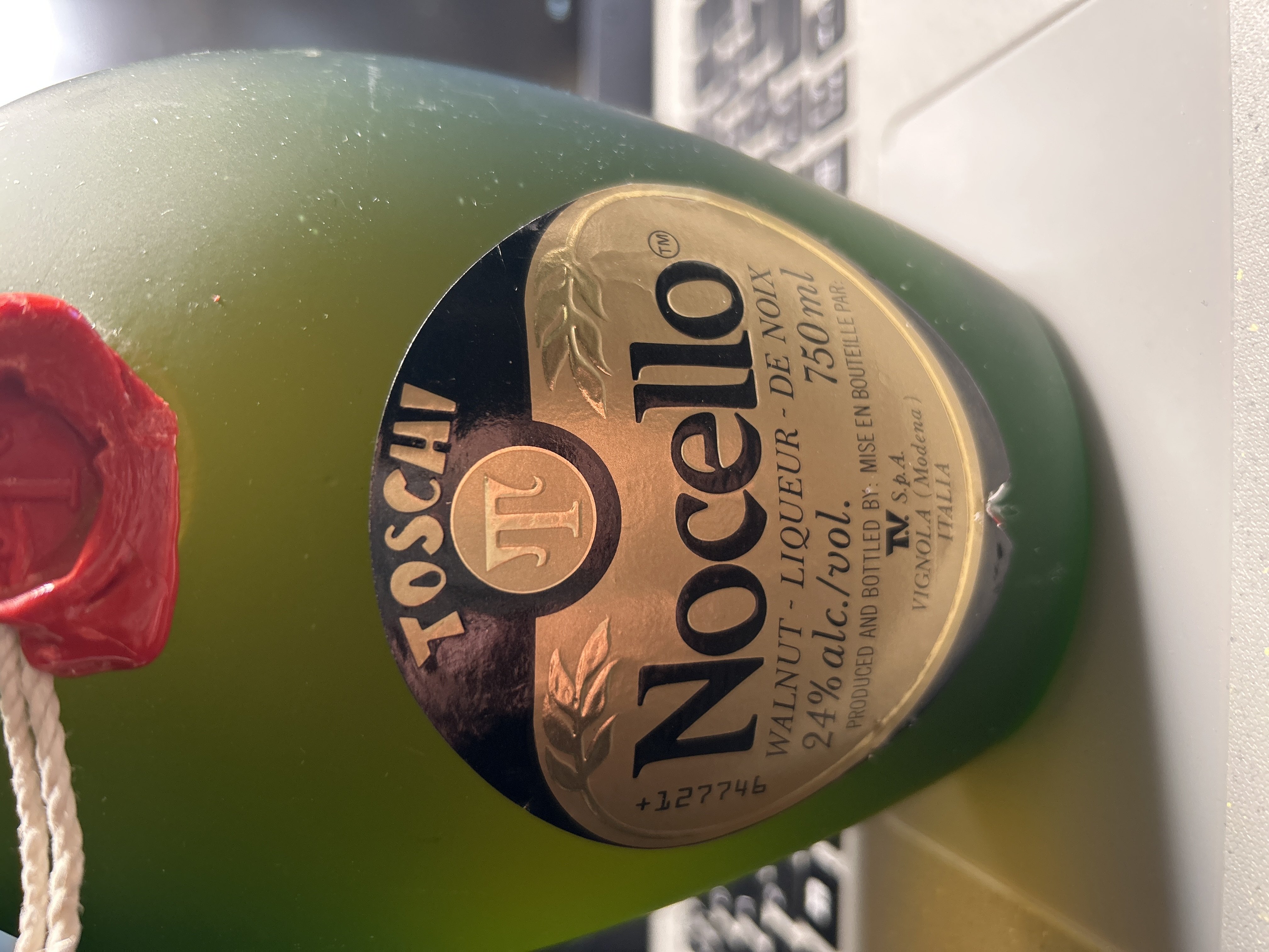 - 1) Text on label: Main Label: TOSCHI Nocello™ +L27746 WALNUT - LIQUEUR - DE NOIX 24% alc./vol. 750ml PRODUCED AND BOTTLED BY: MISE EN BOUTEILLE PAR TV S.p.A. VIGNOLA (Modena) ITALIA Back Label: Nocello WALNUT - LIQUEUR - DE NOIX Représenté par: ITALVINE LTEE MONTREAL Embossed on Bottle Side: TOSCHI 2) Visual elements: Here is the analysis of the image: 1) Text on label: Main Label: TOSCHI Nocello™ +L27746 WALNUT - LIQUEUR - DE NOIX 24% alc./vol. 750ml PRODUCED AND BOTTLED BY: MISE EN BOUTEILLE PAR TV S.p.A. VIGNOLA (Modena) ITALIA Back Label: Nocello WALNUT - LIQUEUR - DE NOIX Représenté par: ITALVINE LTEE MONTREAL Embossed on Bottle Side: TOSCHI 2) Visual elements (concise): Cap/Capsule: Gold, ribbed screw cap featuring a circular emblem with a stylized "T" monogram. Neck: A golden band is present below the screw cap. A white braided rope is tied around the neck, adorned with a red wax seal featuring an embossed "T" and a real walnut tied to it. Upper/Mid Label (Main Label): An oval-shaped, dark blue/black label with gold text and graphics. It features a prominent circular gold emblem with a stylized "T" monogram in the center, flanked by two stylized gold wheat or nut leaf branches. Font styles: "TOSCHI" in a bold sans-serif; "Nocello" in a large, elegant script/cursive style; other text (e.g., "WALNUT - LIQUEUR - DE NOIX", percentages, volume, production details) in a serif font. Back Label: A gold, oval-shaped label with black text. Font styles: "Nocello" in a serif font; "WALNUT - LIQUEUR - DE NOIX" and importer details in a sans-serif font. Bottle Embossing: The word "TOSCHI" is embossed vertically on the side of the bottle in a sans-serif style. 3) Fill level estimate: well above shoulder (very good) - The liquid extends high into the tapered neck section. 3) Fill level estimate: well above shoulder into neck: great