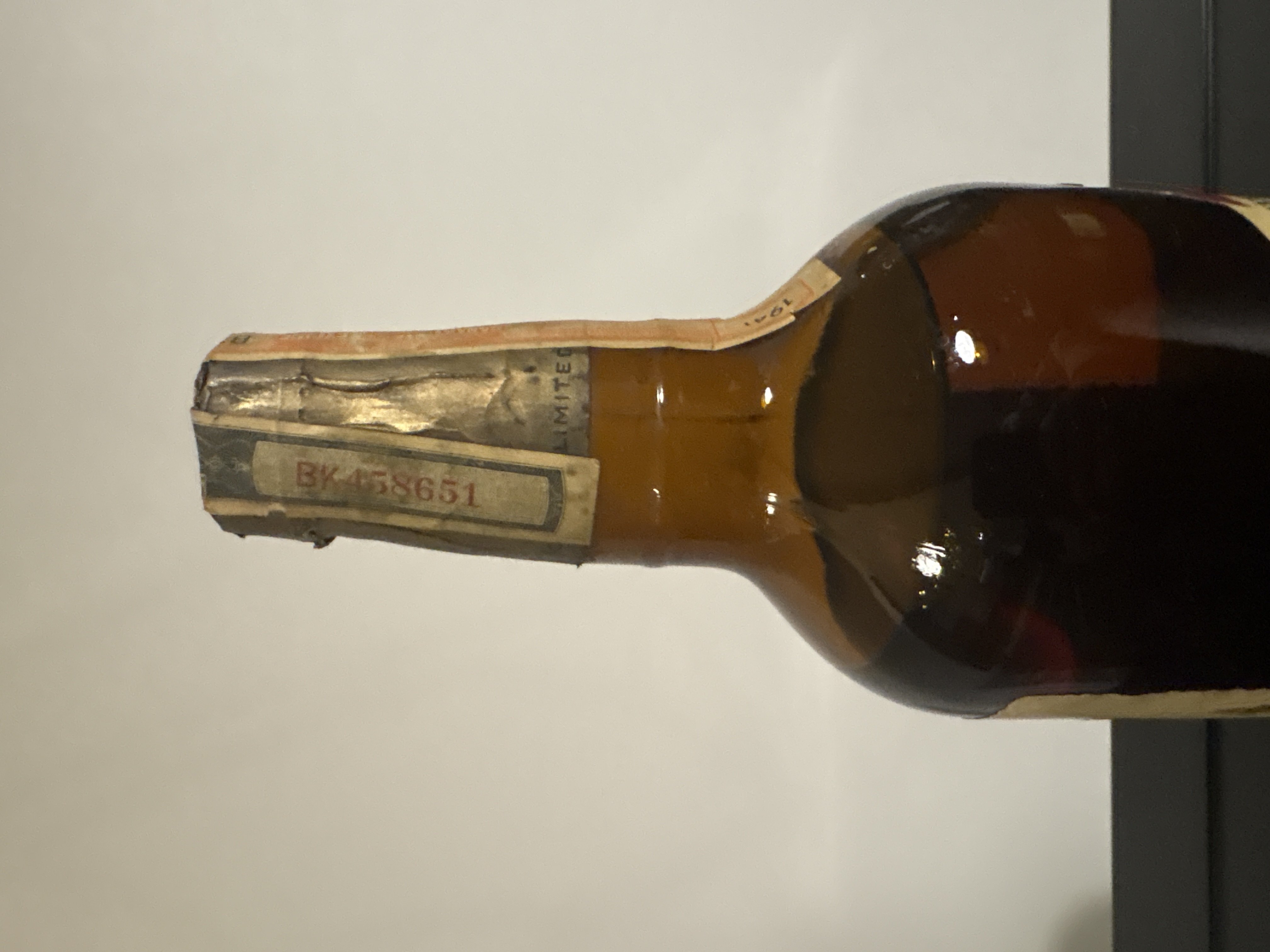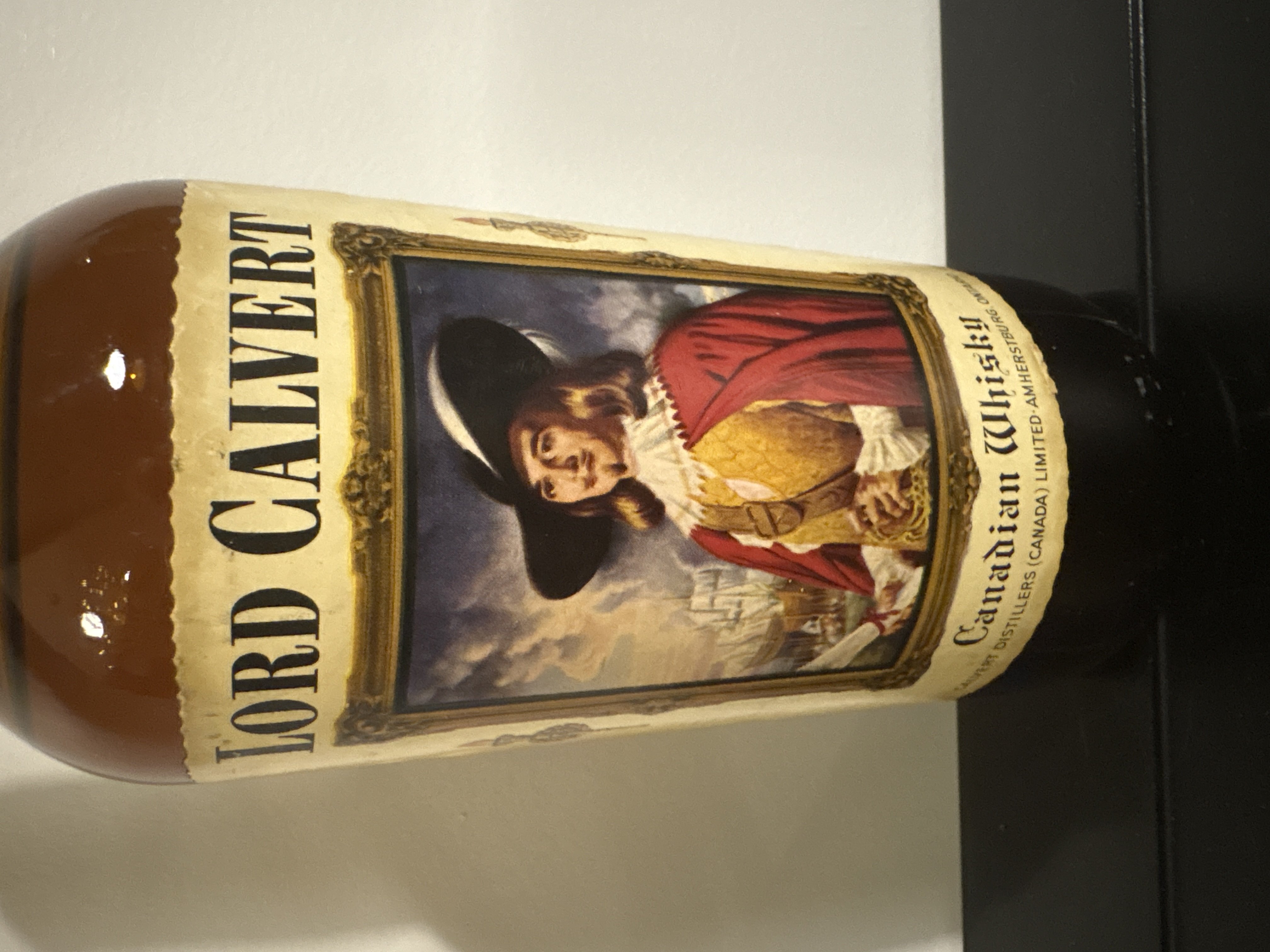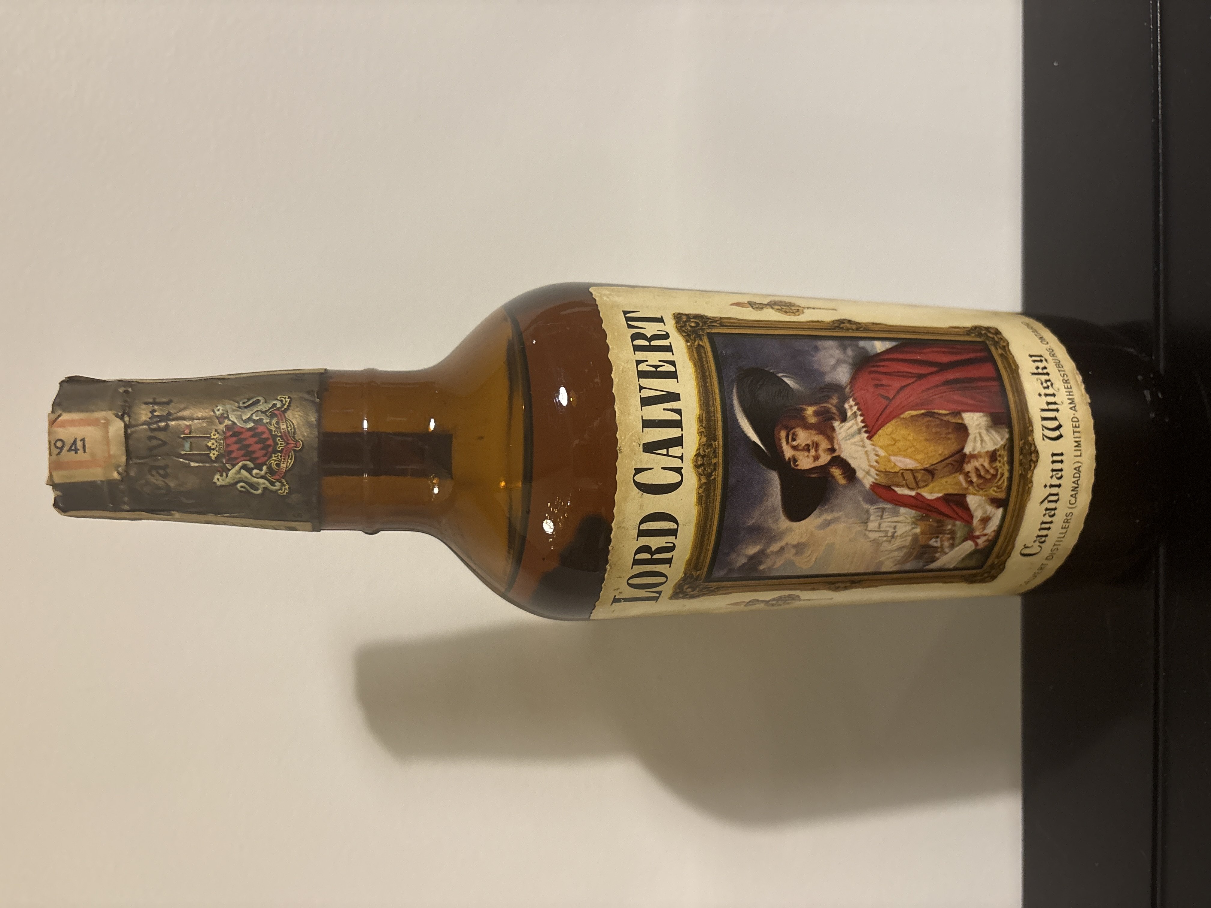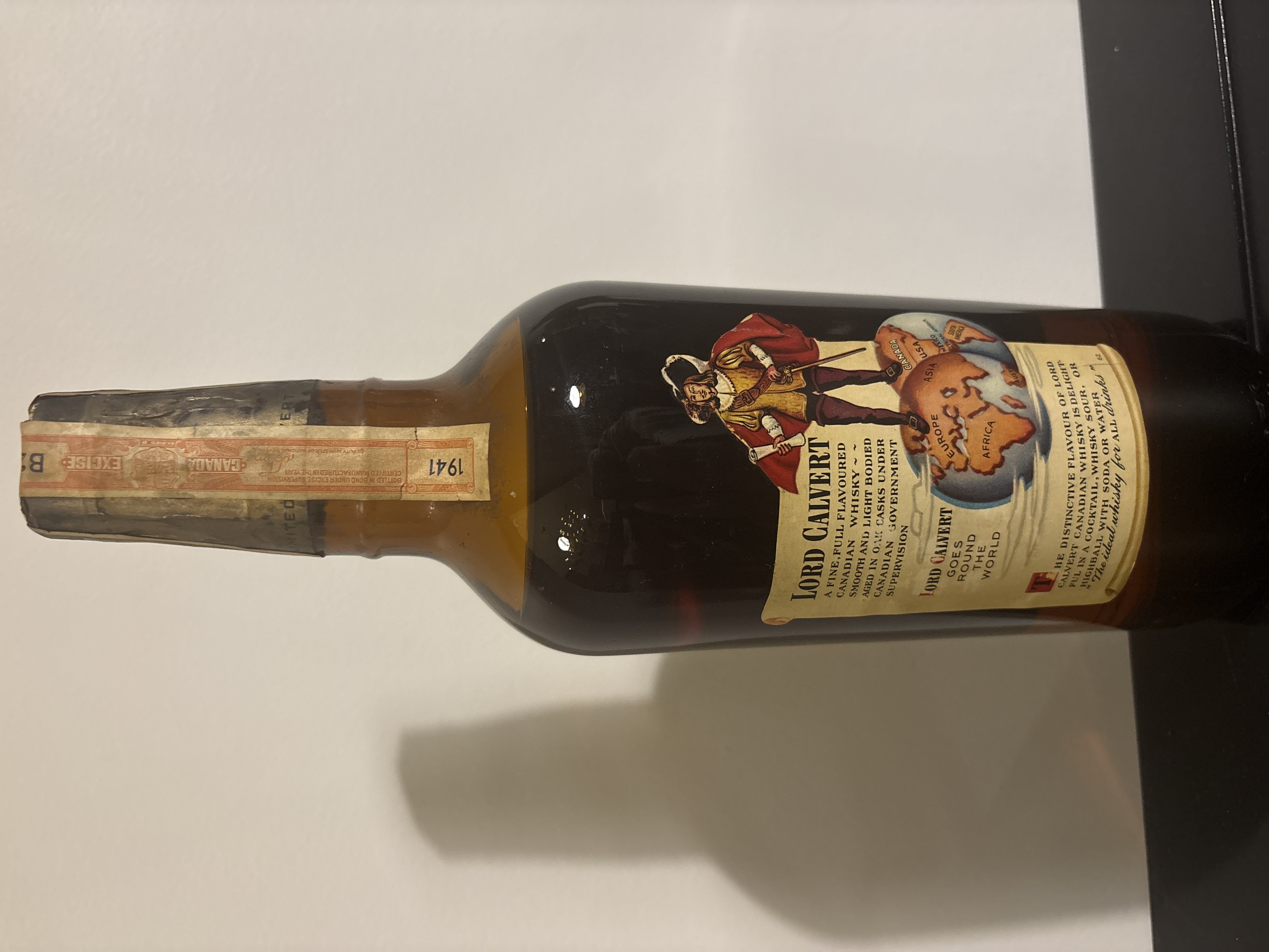 - 1) Text on label: Front Label: LORD CALVERT Canadian Whisky CALVERT DISTILLERS (CANADA) LIMITED AMHERSTBURG, ONTARIO Back Label: LORD CALVERT A FINE-FULL-FLAVOURED CANADIAN WHISKY, SMOOTH AND MELLOW AGED IN OAK CASKS UNDER CANADIAN GOVERNMENT SUPERVISION LORD CALVERT GOES ROUND THE WORLD THE DISTINCTIVE FLAVOUR OF LORD CALVERT ADDS NEW ZEST TO EVERY DRINK. IN A COCKTAIL, WHISKY SOUR OR HIGHBALL - IT IS ALWAYS THE SAME - The ideal whisky for all drinks. Neck/Foil: calvert Tax/Seal Band (across cork and neck): 1941 B28 LIMITED CANADA BK-458651 ONTARIO BOARD ONTARIO GOVERNMENT 2) Visual elements: Neck/Foil: A heraldic crest featuring a shield supported by two animals (likely lions rampant), surmounted by a crown, with foliage details. Front Label: A large central color illustration of a man in 17th-century attire (plumed hat, ruffled collar, red cape, gold tunic, sword), with sailing ships in the background, framed by an ornate gold decorative border. Back Label: A smaller color illustration of the same man standing on a globe with continents (Europe, Asia, Africa, America labeled). Neck/Capsule: Two overlapping tax/seal bands: one orange/red strip with "1941", "B28", "LIMITED CANADA" and one green/gold strip with "BK-458651", "ONTARIO", and "BOARD ONTARIO GOVERNMENT". Font styles: Dominant bold serif for "LORD CALVERT", script/cursive for "Canadian Whisky" and "The ideal whisky for all drinks.", standard serif for descriptive text, and sans-serif/block for the text on the tax bands. 3) Fill level estimate: well above shoulder into neck: great