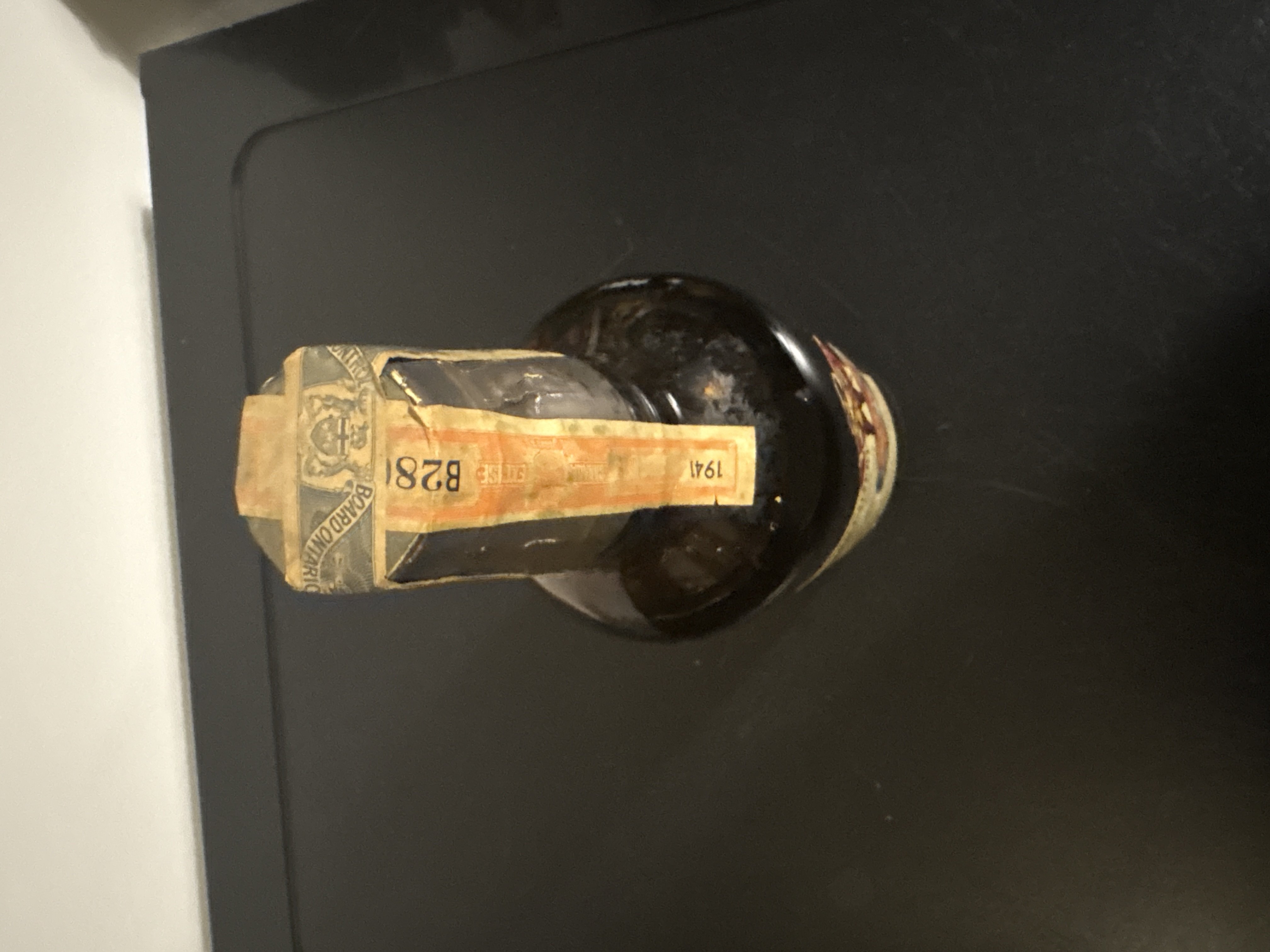 - 1) Text on label: Neck/Capsule: OLD FITZGERALD ESTD. 1849 Neck Band (Green): This Whiskey is 8 Years Old Bottled in Bond Aged in wood 8 Years Main Front Label (Cream): BOTTLED IN 1957 Very Old FITZGERALD FOUNDED EIGHT YEARS OLD We believe this whiskey to be the Highest Grade Bourbon in America, which has for thru centuries of time, been a treasured part of our tradition. Many years ago this brand produced according to a cherished formula was carefully distilled and improved by heavy oak... traditional methods of aging it. Noble oak in unique barrels has mellowed and given it a rich bouquet. Even to the most critical connoisseur, it is a classic. BOTTLED EXPRESSLY FOR Connoisseurs of Fine Bourbon Main Back Label (Cream): ORIGINAL SOUR MASH KENTUCKY BONDED BOURBON DISTILLED & BOTTLED BY Stitzel-Weller DISTILLERY ESTAB. 1849 REGISTERED DISTILLERY No. 16, LOUISVILLE, KENTUCKY. BOTTLED AT DSP-KY-16 NOTICE: This package has been filled and tax-paid under the provisions of the Internal Revenue Laws of the United States. It was made on the _____ days of _____ and _____ during the _____ period. The proprietors of the distilling and bottling establishment have carefully examined the stamp on this bottle as required by law and are satisfied that it has not been used before. Nothing except water has been added to this distilled spirits. No alcohol has been removed. KENTUCKY STRAIGHT BOURBON WHISKEY 100 PROOF 4/5 QUART Tax Strip (Vertical on Capsule): U.S. INTERNAL REVENUE BOTTLED IN BOND Made Bottled CONTENTS 4/5 QUART PROOF 100 2) Visual elements: Capsule: Gold foil, heavily creased and worn. A vertical green and gold tax strip is affixed over the capsule, featuring a green shield containing "PROOF 100". Neck: A green paper band below the capsule has small gold stars. Upper Label: A small, red shield-shaped emblem with an ornate, stylized "W" or initial is visible on the upper shoulder of the bottle. Mid Label: The main labels (front and back) are cream-colored with some aging and wear. Font Styles: Predominantly elegant cursive/script for brand names like "Very Old Fitzgerald" and "Stitzel-Weller", and phrases like "Connoisseurs of Fine Bourbon" (in red). Serif fonts are used for most descriptive text blocks, while sans-serif is visible on the green neck band and tax strip. Block capital letters are used for "FOUNDED EIGHT YEARS OLD". 3) Fill level estimate: well above shoulder into neck: great