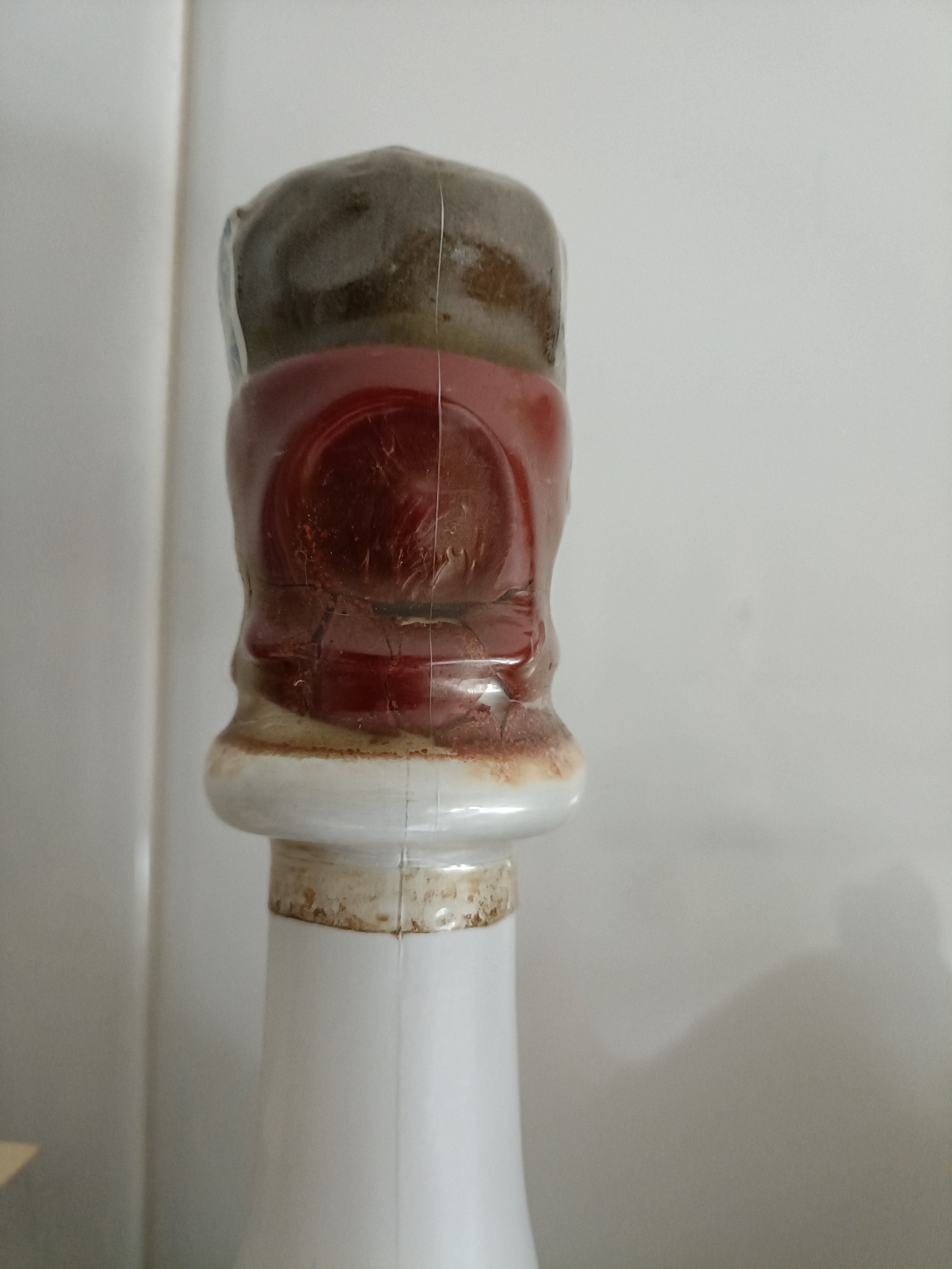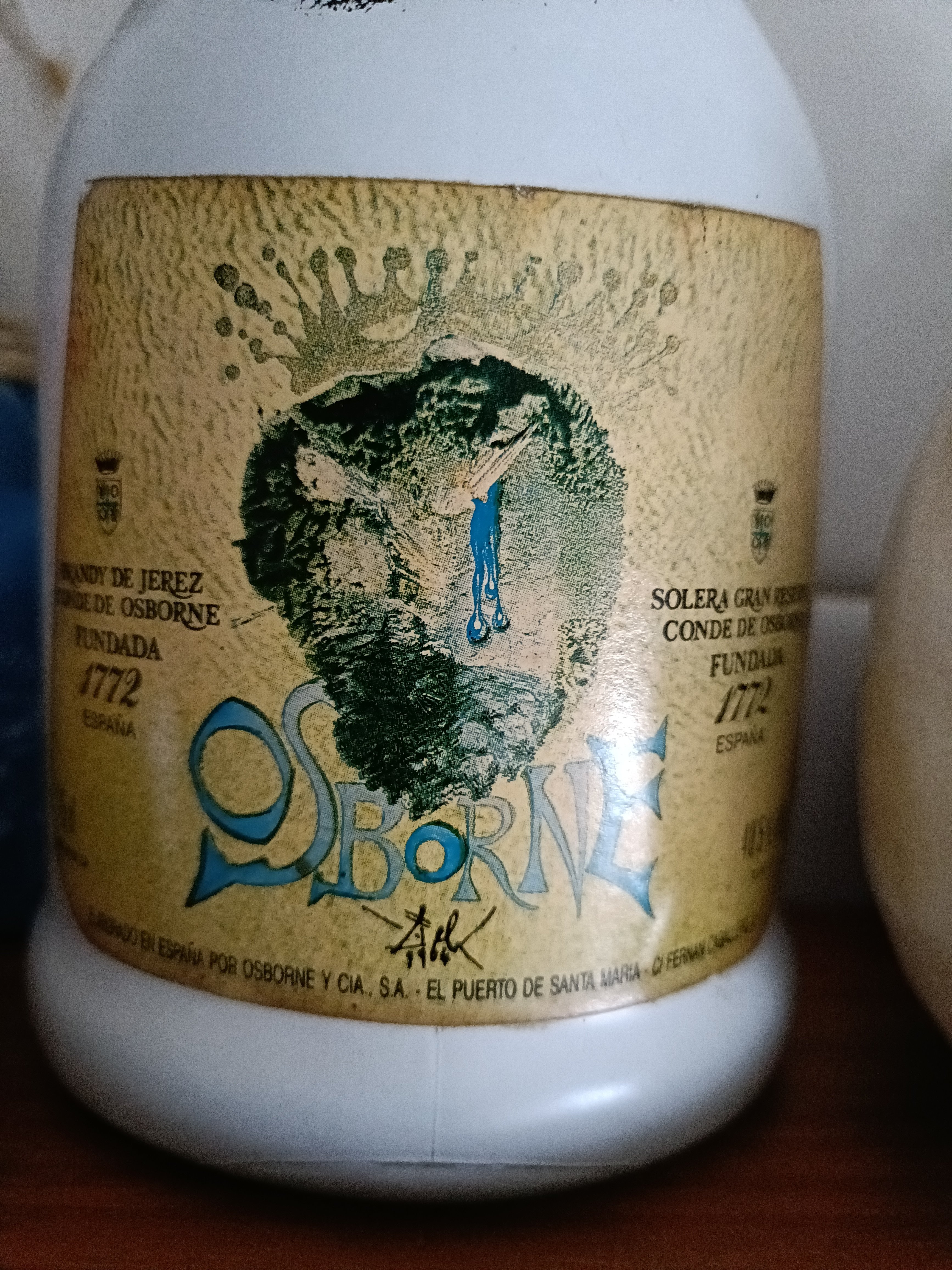 - 1) Text on label: BRANDY DE JEREZ CONDE DE OSBORNE FUNDADA 1772 ESPAÑA SOLERA GRAN RESERVA CONDE DE OSBORNE FUNDADA 1772 ESPAÑA OSBORNE A Dalí (stylized signature) ELABORADO EN ESPAÑA POR OSBORNE Y CÍA., S.A. . EL PUERTO DE SANTA MARÍA - C/ FERNAN CABALLERO 3 40,5% VOL. 70 cl e Note: Text on the tax band on the capsule is illegible due to damage and blurriness. 2) Visual elements: Neck/Capsule: A reddish, wax-like seal impression is visible on the front of the capsule, which is covered by a clear plastic shrink-wrap. A partially torn tax band (white with blue/red elements) wraps around the upper part of the capsule. Upper label: Two small, crowned heraldic shield emblems appear, one on the left and one on the right side of the upper label text. Mid label: A large, stylized illustration of a bull's head is depicted in shades of dark green/blue, with a single blue tear, surrounded by a crown-like splash effect. Below this, the brand name "OSBORNE" is prominently displayed, followed by a stylized signature ("A Dalí"). Bottle body (side): An irregularly shaped black blotch appears, adjacent to which is a distinct cursive signature "Dalí". Apparent font style(s): Serif for most informational text; ornate/decorative script with heavy serifs for the main "OSBORNE" brand name; sans-serif for the very small print at the bottom edge; cursive/script for the signatures. 3) Fill level estimate: well above shoulder into neck: great Reason: The liquid is clearly visible through the black transparent window on the bottle, reaching the very top edge of the window, indicating a high fill level within the bottle's unique wide shoulder/body area.