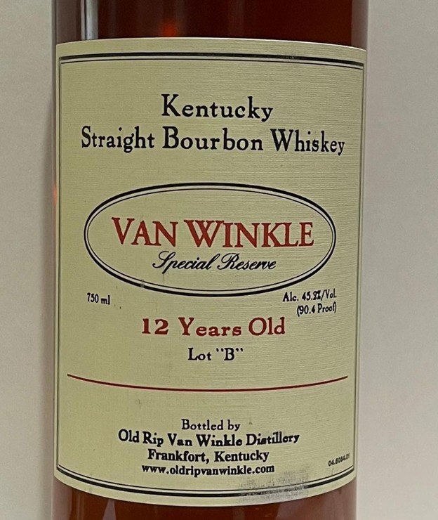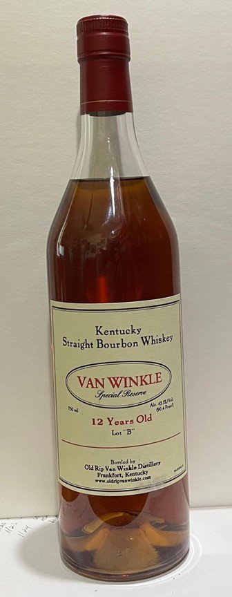 - 1) Text on label: Front Label: Kentucky Straight Bourbon Whiskey VAN WINKLE Special Reserve 750 ml Alc. 45.2% / Vol. (90.4 Proof) 12 Years Old Lot "B" Bottled by Old Rip Van Winkle Distillery Frankfort, Kentucky www.oldripvanwinkle.com 04.080A2000 Back Label: GOVERNMENT WARNING: (1) ACCORDING TO THE SUR- GEON GENERAL, WOMEN SHOULD NOT DRINK ALCO- HOLIC BEVERAGES DURING PREGNANCY BECAUSE OF THE RISK OF BIRTH DEFECTS. (2) CONSUMPTION OF ALCOHOLIC BEV- ERAGES IMPAIRS YOUR ABILITY TO DRIVE A CAR OR OPER- ATE MACHINERY, AND MAY CAUSE HEALTH PROBLEMS. 0 89319 12373 5 BATCH #R14 2) Visual elements: Graphics: A cream-colored rectangular main label with a thin red border. The "VAN WINKLE" text is prominently displayed within an oval-shaped graphic, also outlined in red. The capsule is a matte red screw cap with a corrugated grip, featuring a subtle gold stripe at its base. A barcode appears on the back label. Location: The main label is on the mid-body. The red capsule covers the neck and cap. The government warning and barcode are on the back label. Apparent font style(s): The main text ("Kentucky Straight Bourbon Whiskey", "Bottled by...") uses a serif font. "VAN WINKLE" is in a decorative serif font, and "Special Reserve" is in a cursive/script font. Other details (e.g., "750 ml", "Alc.", "12 Years Old", "Lot B") are in various sans-serif styles. The back label warning is in a blocky sans-serif font. 3) Fill level estimate: well above shoulder into neck: great Reason: The liquid level is at the very base of the neck, with no visible air gap.