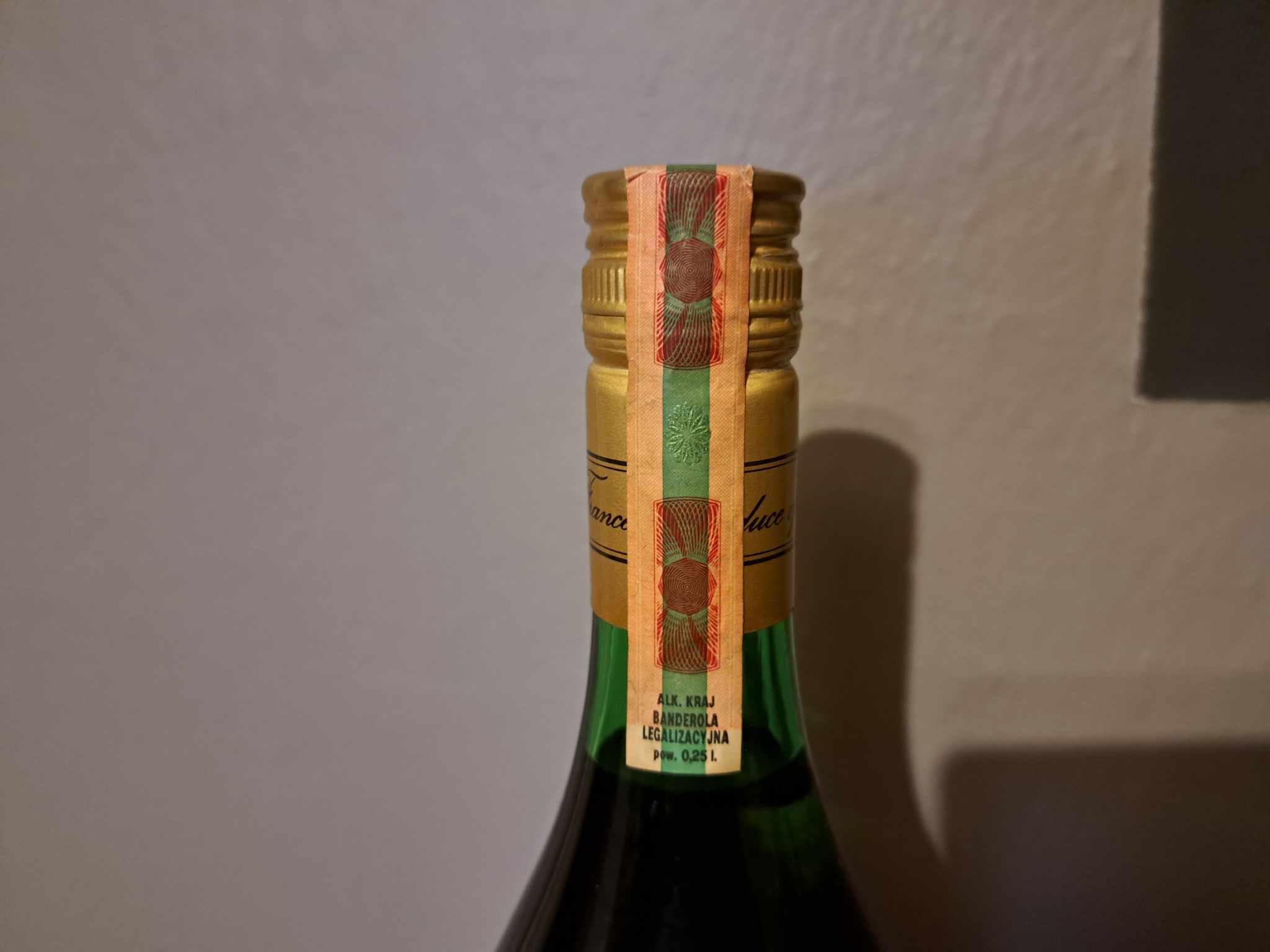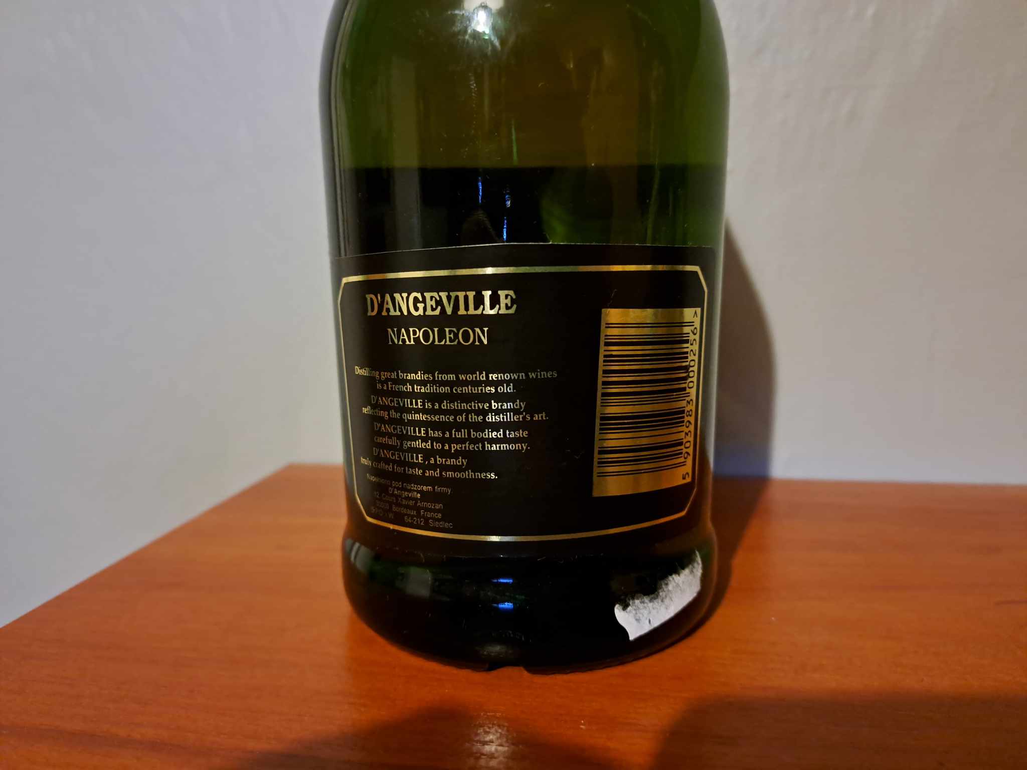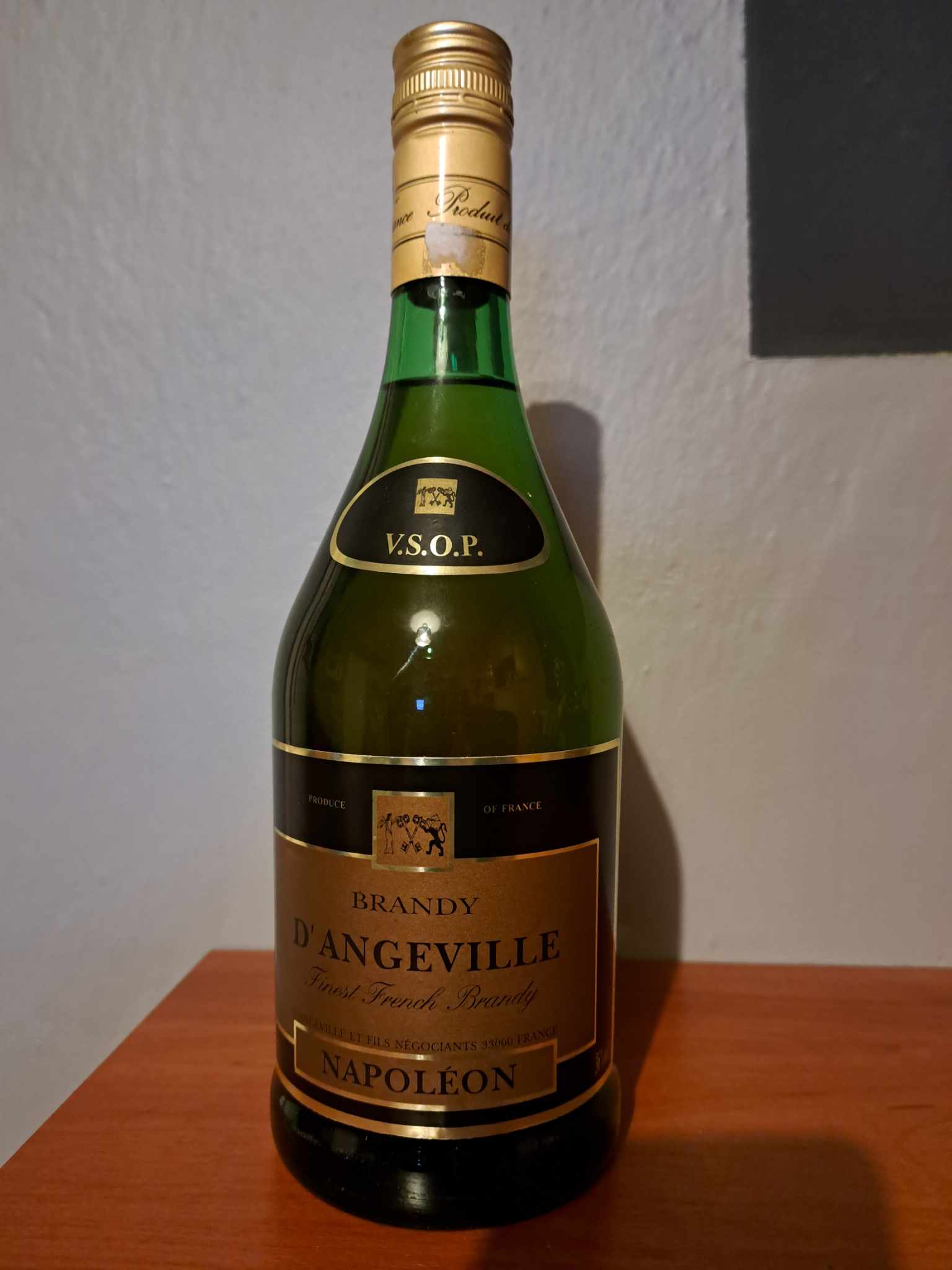 - (front) V.S.O.P. Brandy D'Angeville Finest French Brandy D'Angeville et fils negociants 33000 France (back) D'Angeville Napoleon Distilling great brandies from world renown wines is a French tradition centuries old D'Angeville is a distinctive brandy reflecting the quintessence of the distiller's art D'Angeville has a full bodied taste carefully gentled to a perfect harmony D'Angeville, a brandy truly crafted for taste and smoothness Napełniono pod nadzorem firmy: D'Angeville 12 Cours Xavier Amozan 33000 Bordeaux France S.P.O i W. 64-212 Siedlec