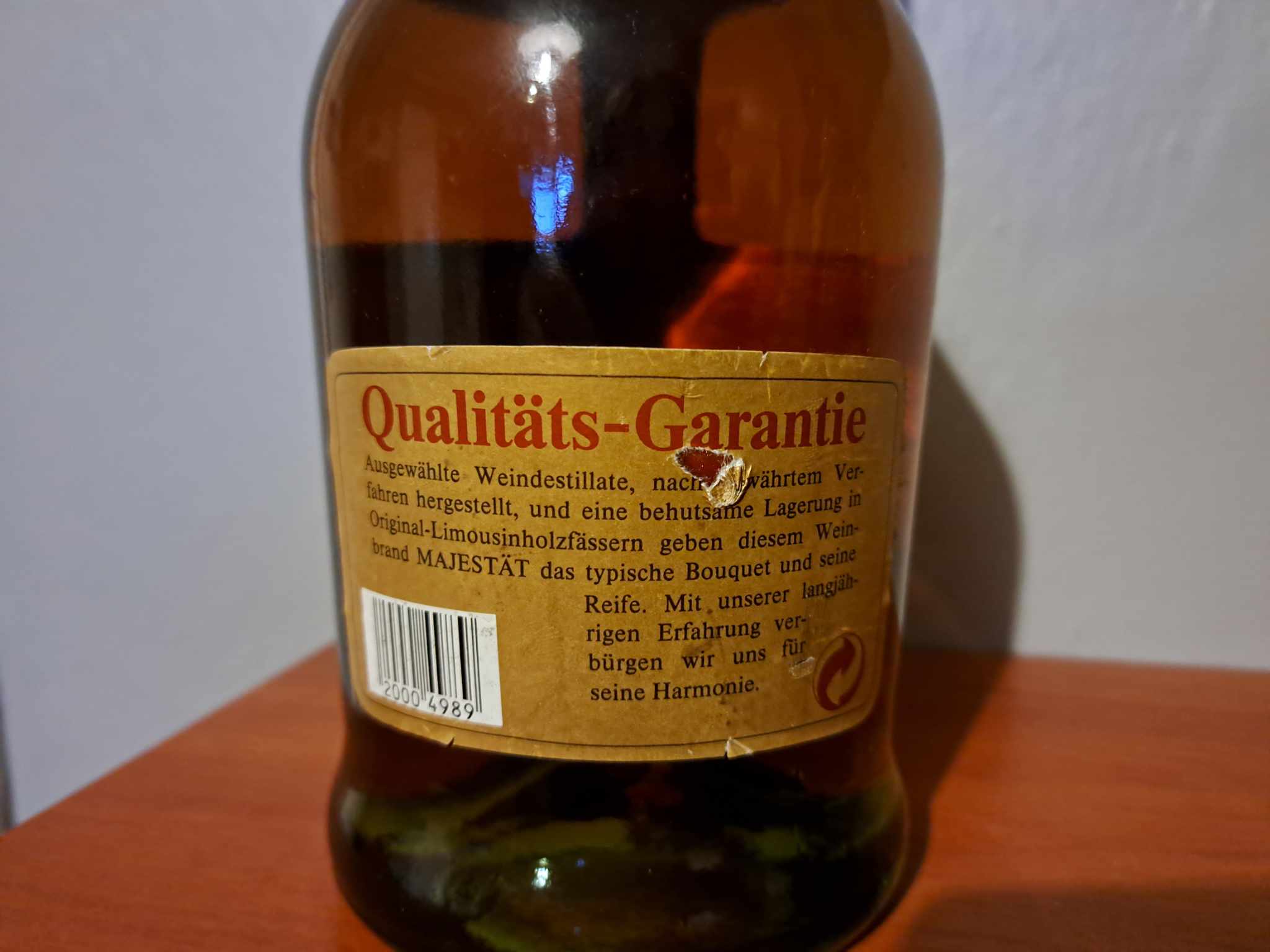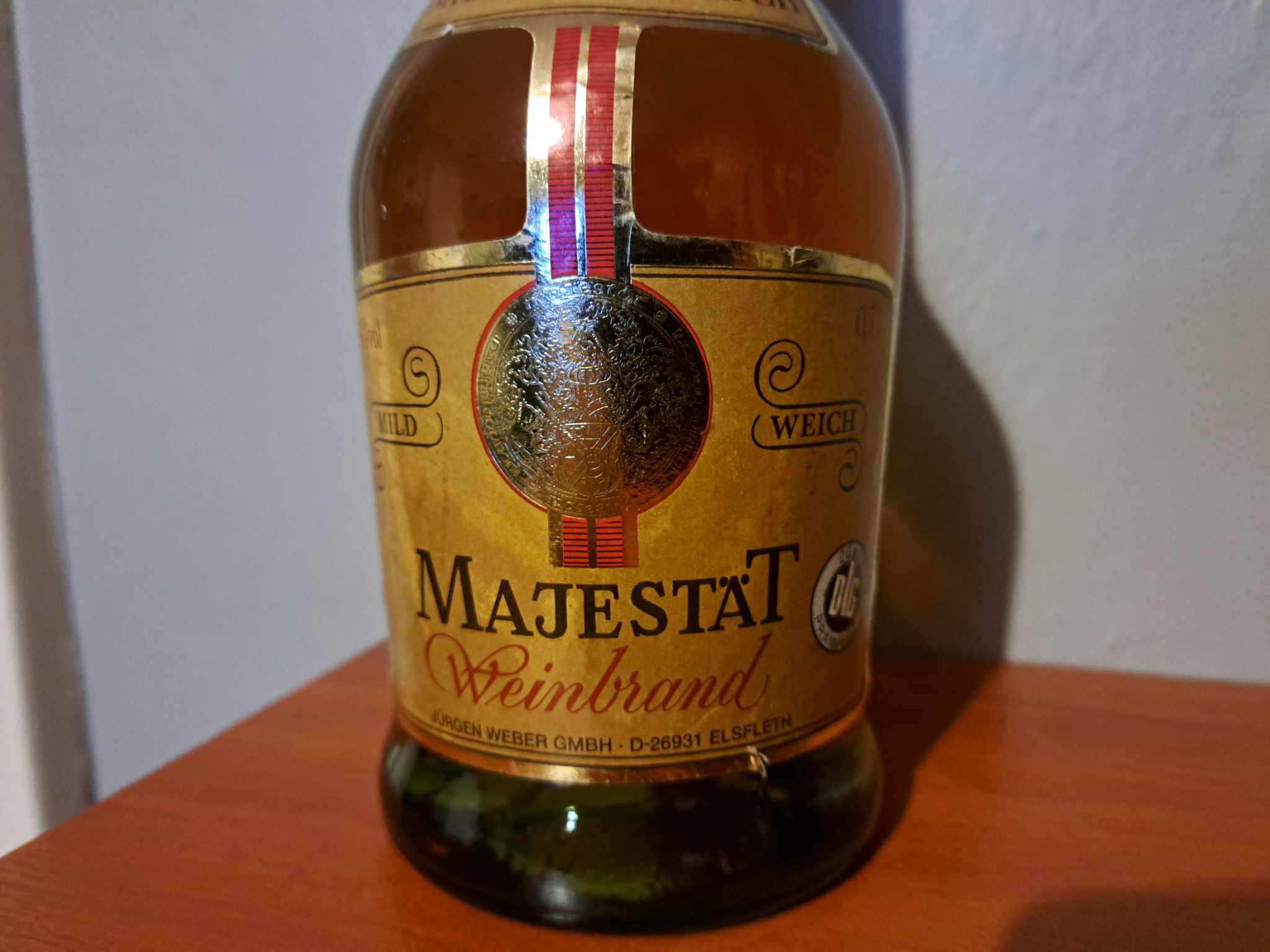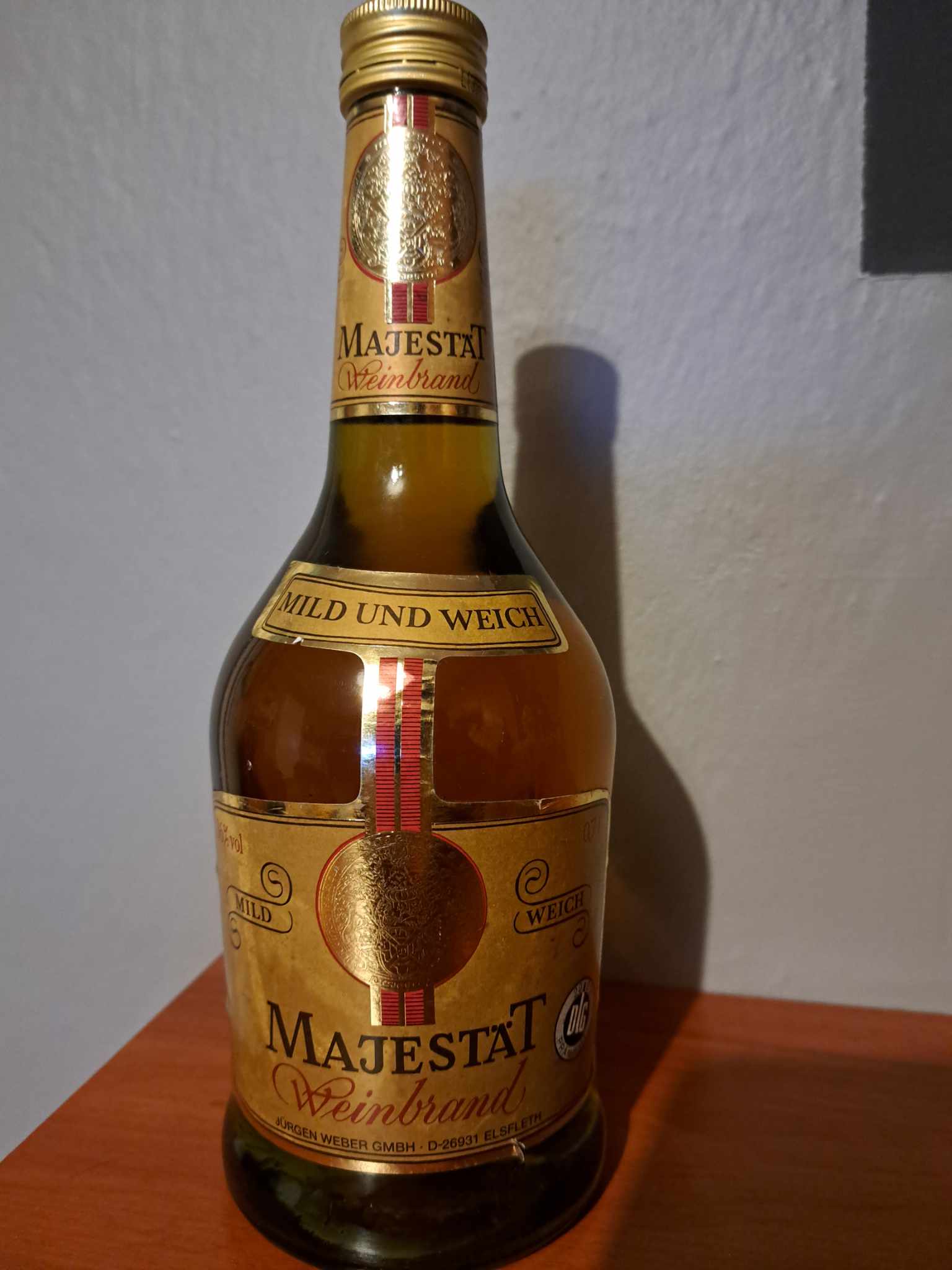 - (front) Mild und weich MILD WEICH Majestät Weinbrand Jürgen Weber GMBH 0 D-26931 ELSFLETH (back) Qualitäts-Garantie Ausgewählte Weindestillate, (incomprehensible) Verfahren hergestellt, ind eine behutsame Lagerung in Original-Limousinholzfässern geben siedem Weinbrand MAJESTÄT das typische Bouquet und seine Reife. Mit unserer langjährigen Erfahrung verbürgen wir uns für seine Harmonie.
