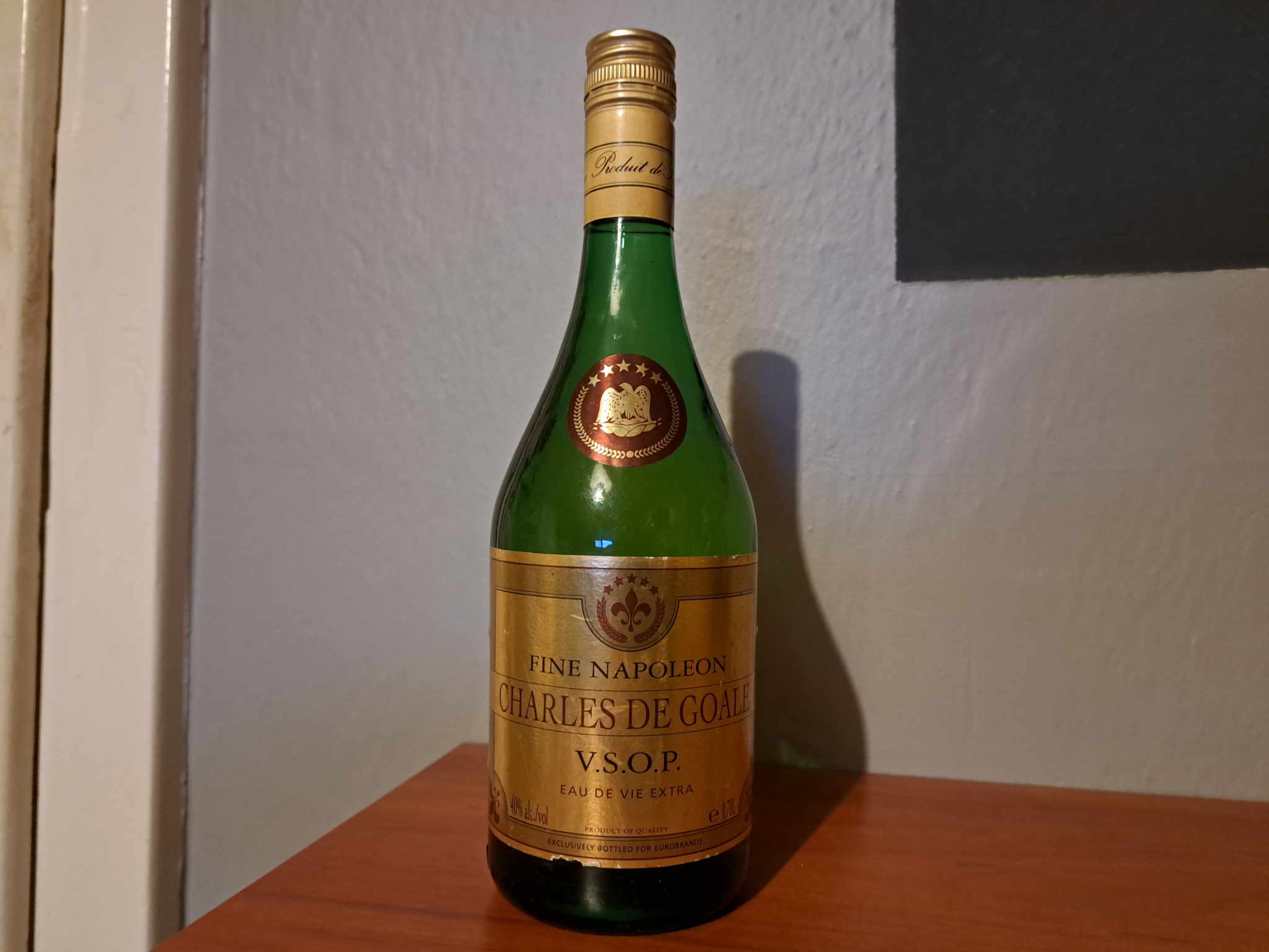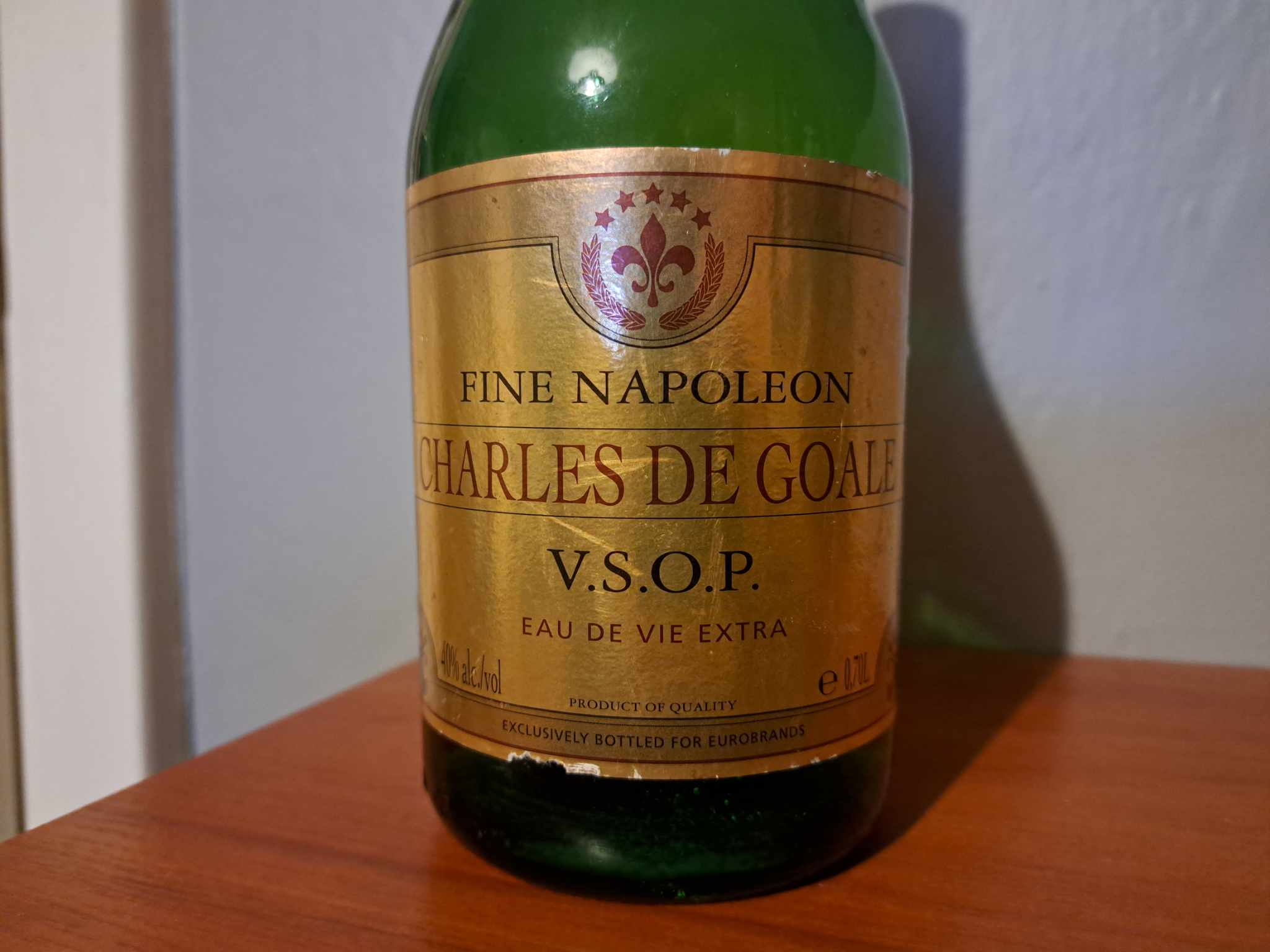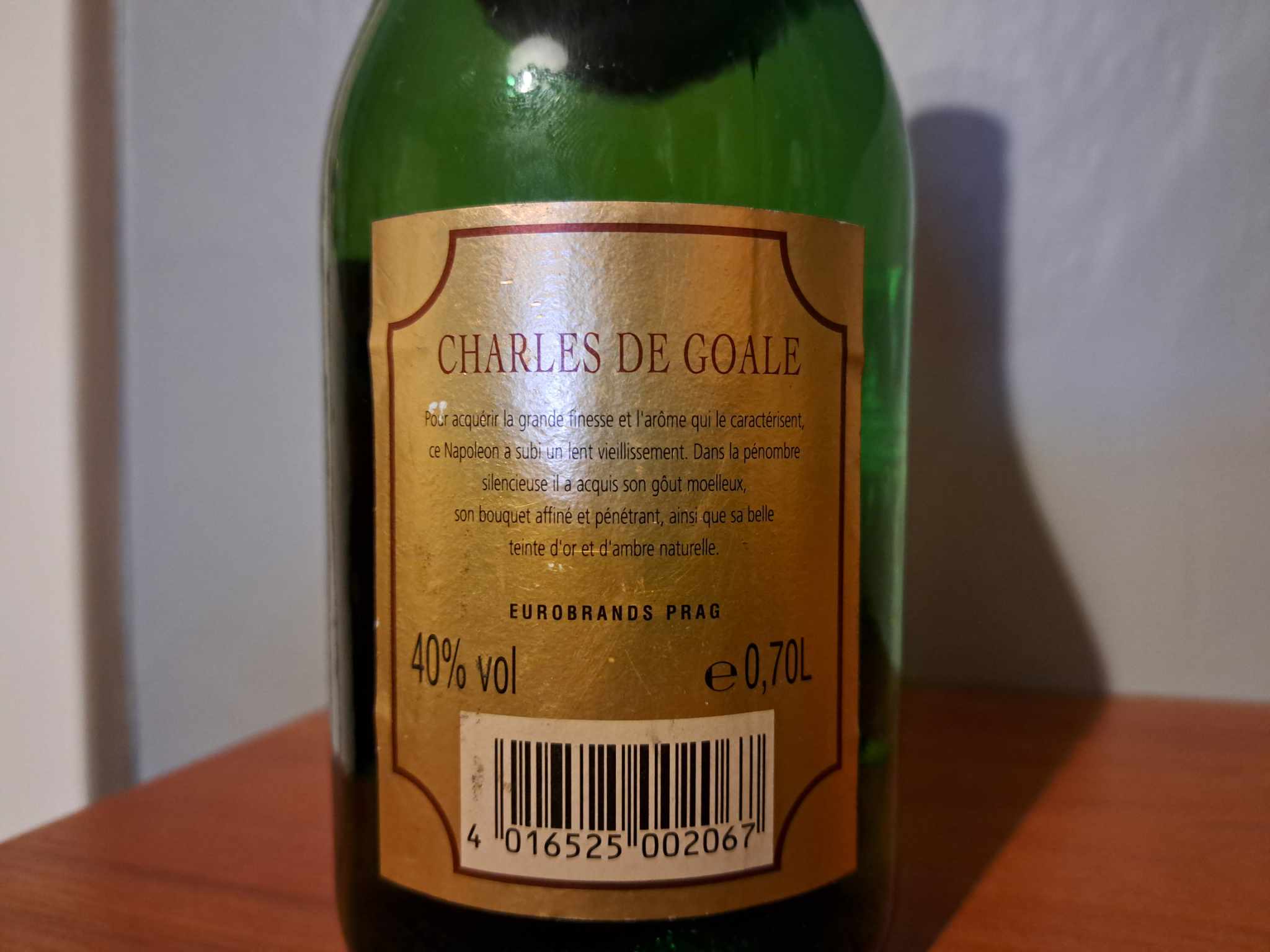 - (front, it has 5 stars with an eagle emblem and on a cork it says Produit de France and Product of France) Fine Napoleon Charles de Goale V.S.O.P. eau de vie extra product of quality exclusively bottled for eurobrands (back) CHARLES DE GOALE Pour acquérir la grande finesse et l'arôme qui łe caractérisent, ce Napoleon a subi un Leny vieilliesment. Dans la pénombre silencieuse il a acquis son gôut moelleux, son boquet affiné et pénétrant, ainsi que sa belle teinte d'or et d'anbre naturelle EUROBRANDS PRAG